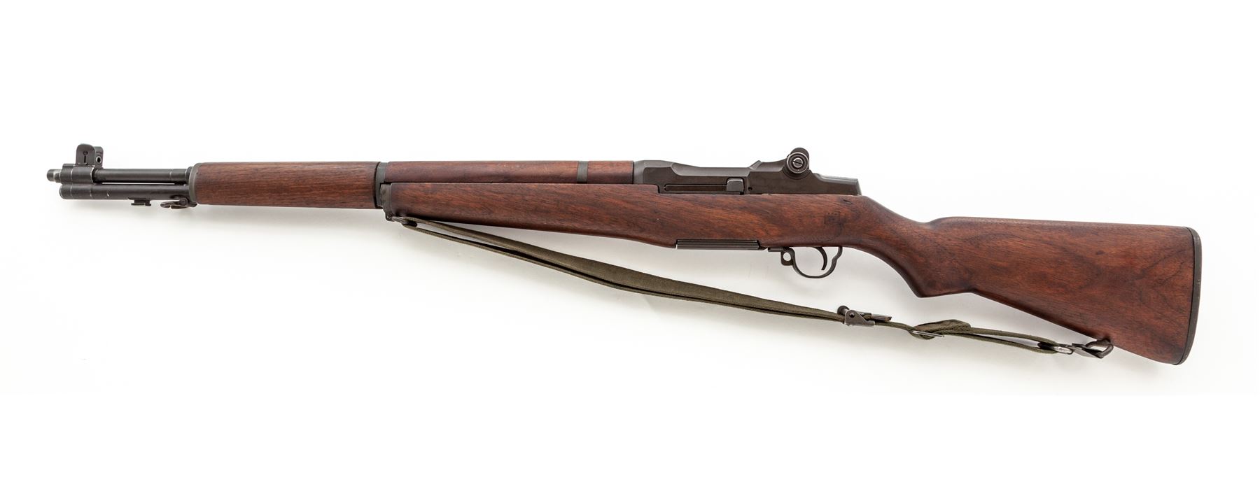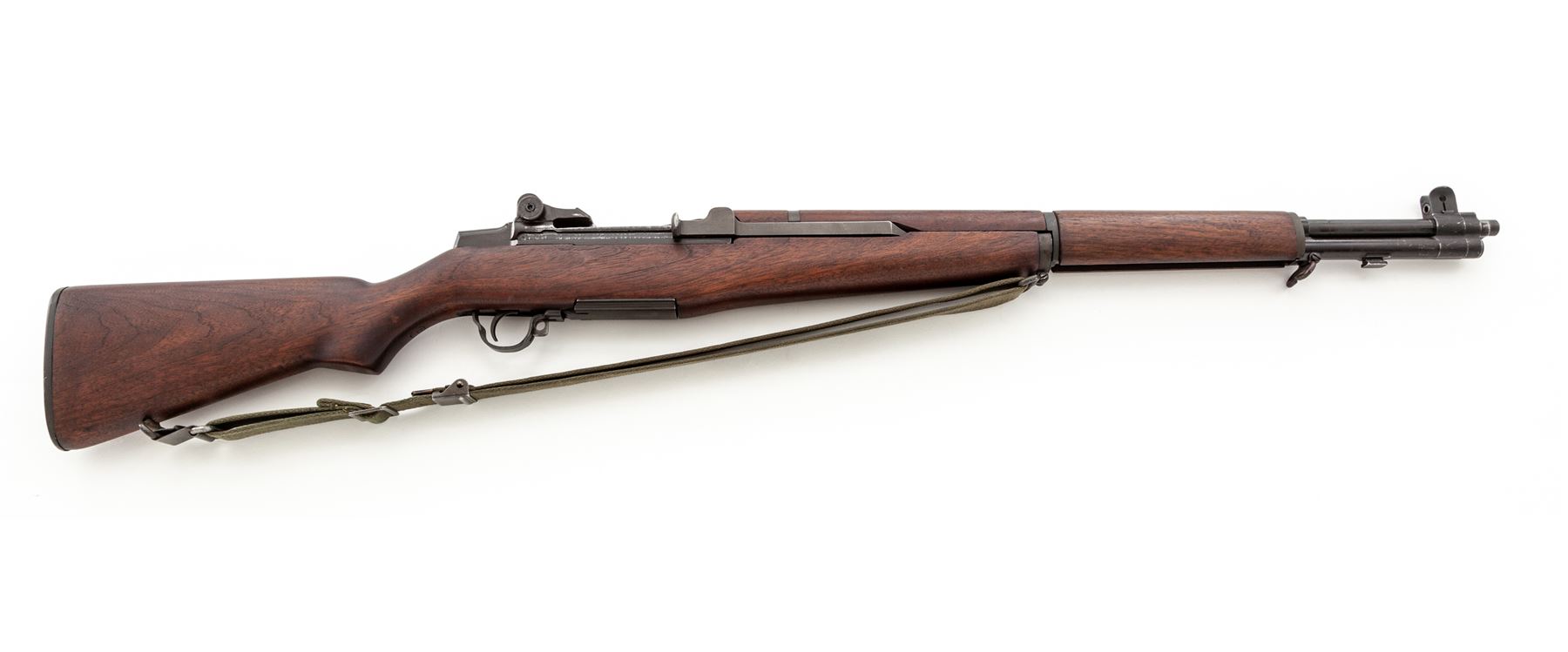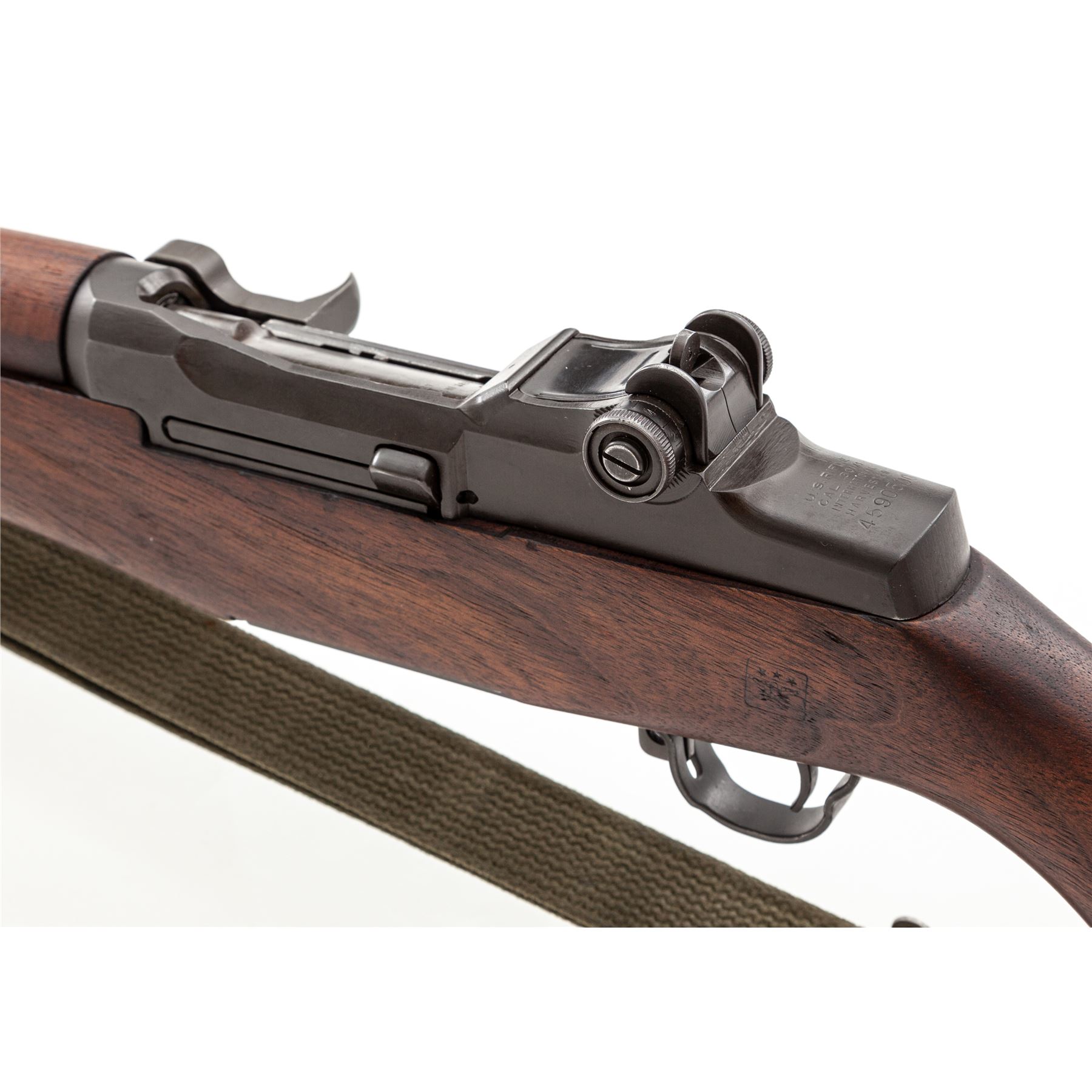International Harvester M1 Garand Semi-Automatic Rifle, #4590500, .30-06 cal., 24'' barrel, parkerized finish, walnut stock, blade front sight with protecting ears and adjustable aperture rear sight. Marked on receiver tang ''U.S.RIFLE CAL. .30 M1 INTERNATIONAL HARVESTER''. Bolt, operating rod, trigger housing, and hammer marked ''IHC''. Barrel stamped ''LMR 1-54''. Defense Dept. stamp on left side of stock and ''Circle P'' firing proof on underside of wrist. There are four numbers in the barrel channel (3052). Condition overall is excellent with over 95% of the refinish remaining on the metal. Rear handguard has a large scratch on the right side, otherwise wood is excellent with just a couple of light handling marks. Action is smooth, bright bore is excellent with strong rifling. Includes a U.S.G.I. green cotton sling in very good condition. Est.: $1,000-$1,500. (C& R)