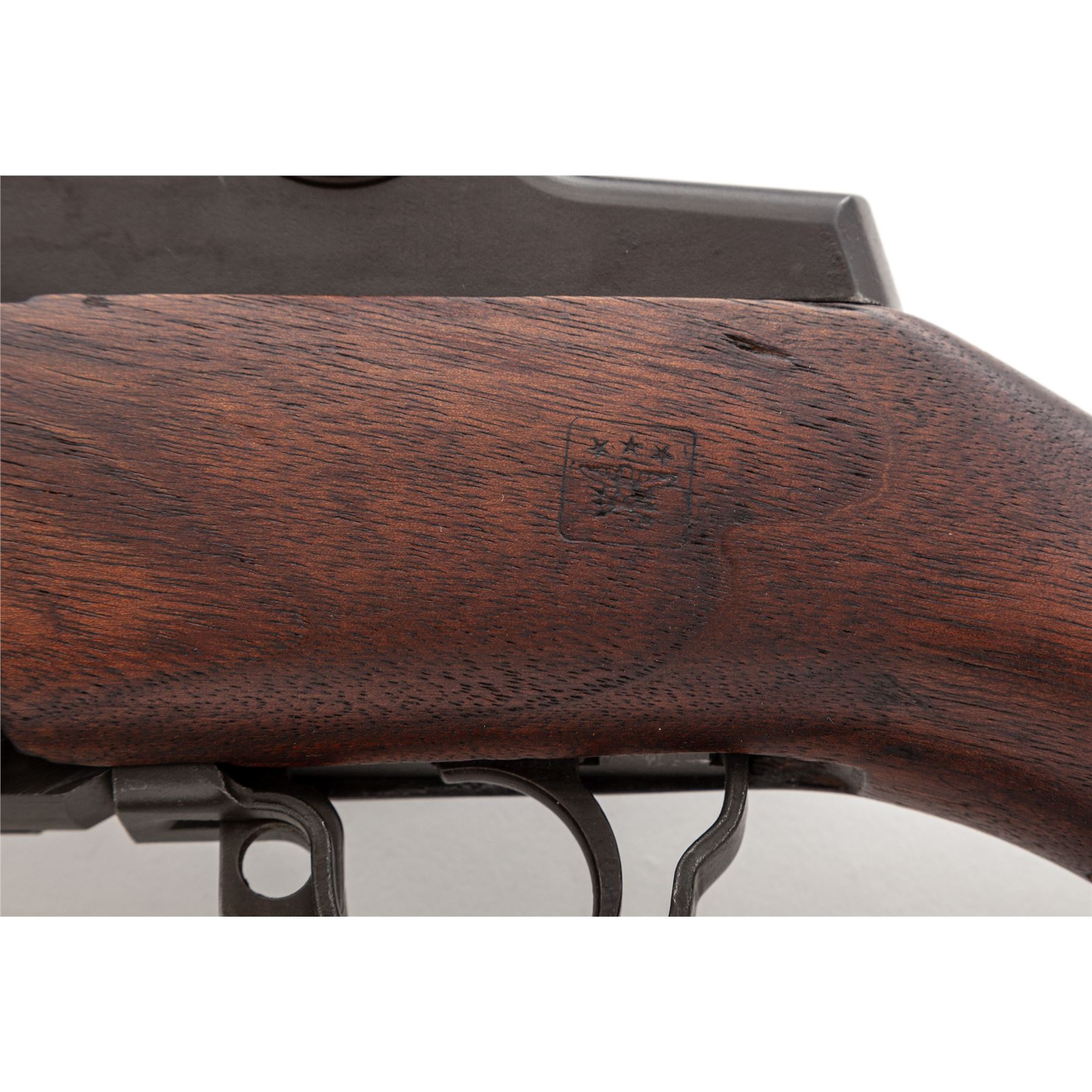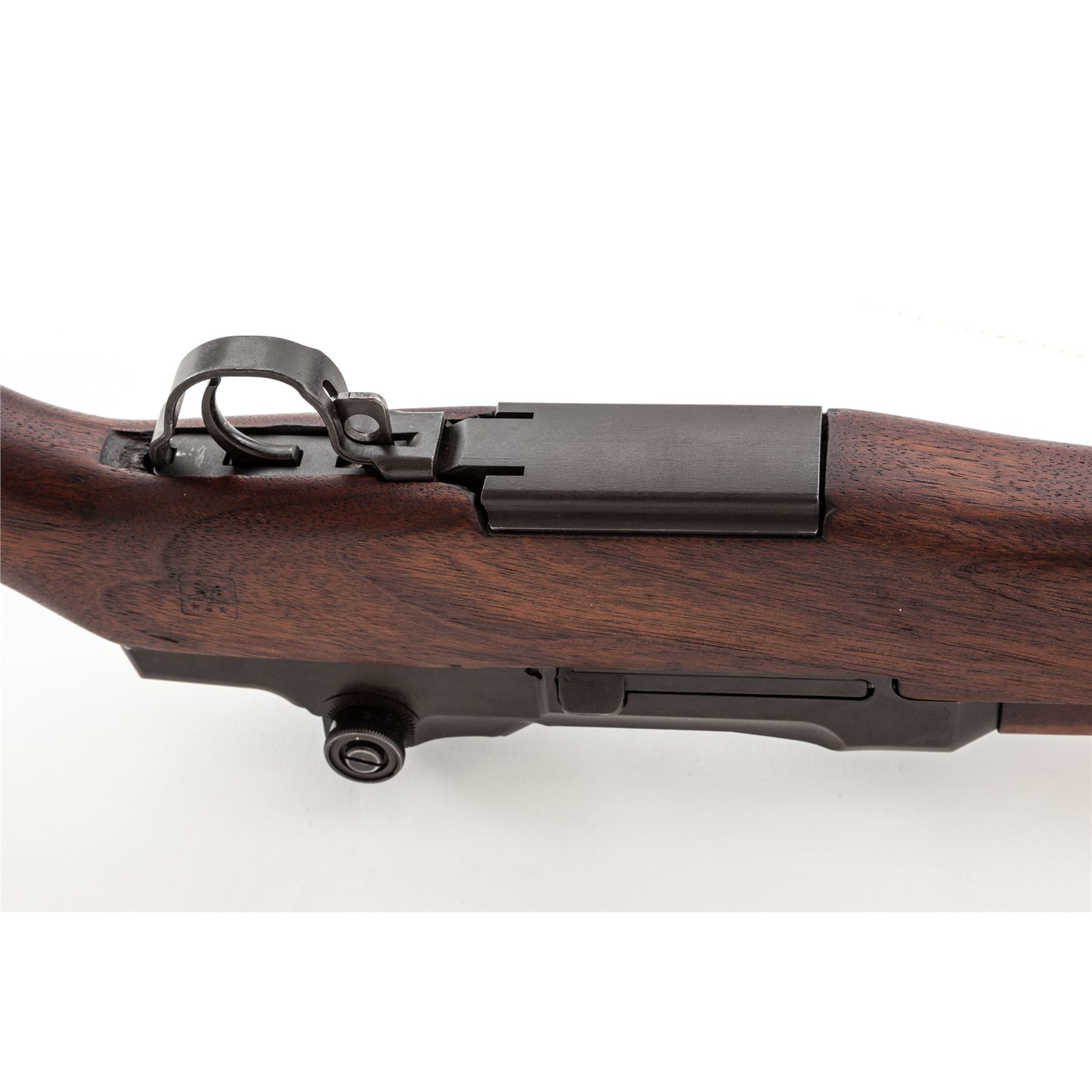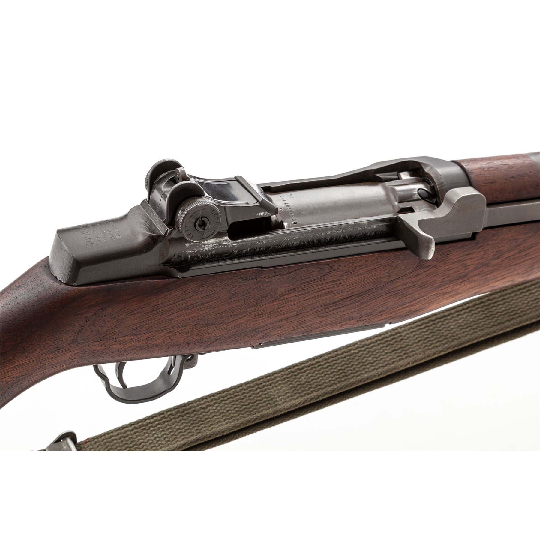 International Harvester M1 Garand Semi-Automatic Rifle, #4590500, .30-06 cal., 24'' barrel, parkerized finish, walnut stock, blade front sight with protecting ears and adjustable aperture rear sight. Marked on receiver tang ''U.S.RIFLE CAL. .30 M1 INTERNATIONAL HARVESTER''. Bolt, operating rod, trigger housing, and hammer marked ''IHC''. Barrel stamped ''LMR 1-54''. Defense Dept. stamp on left side of stock and ''Circle P'' firing proof on underside of wrist. There are four numbers in the barrel channel (3052). Condition overall is excellent with over 95% of the refinish remaining on the metal. Rear handguard has a large scratch on the right side, otherwise wood is excellent with just a couple of light handling marks. Action is smooth, bright bore is excellent with strong rifling. Includes a U.S.G.I. green cotton sling in very good condition. Est.: $1,000-$1,500. (C& R)