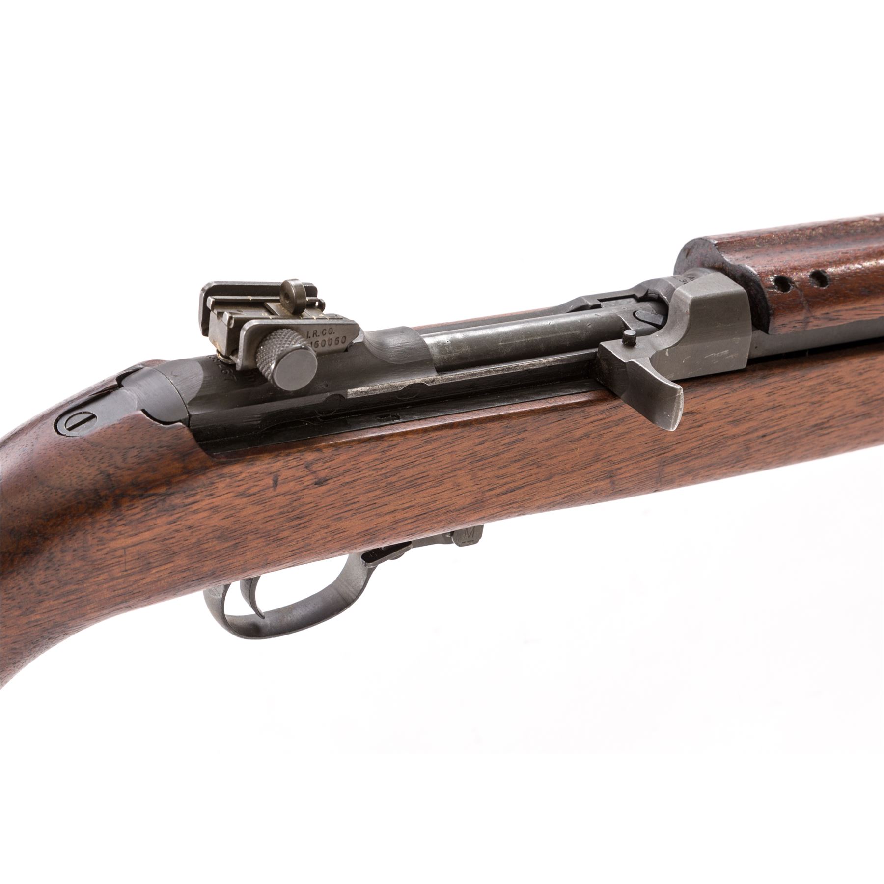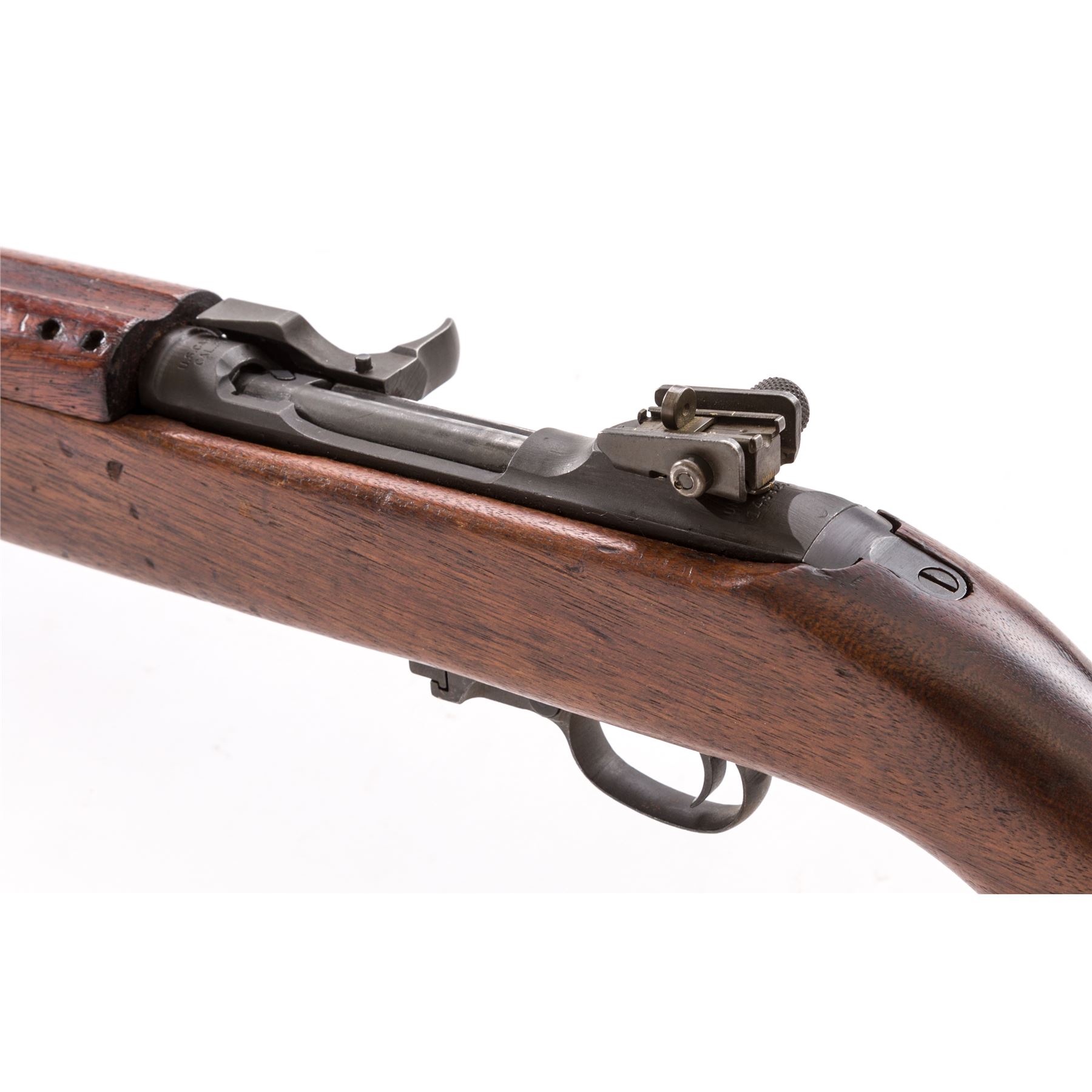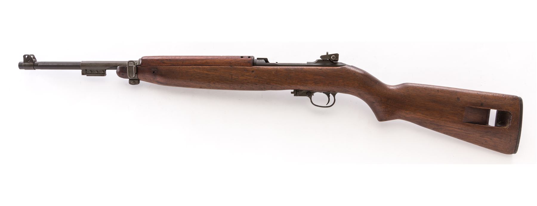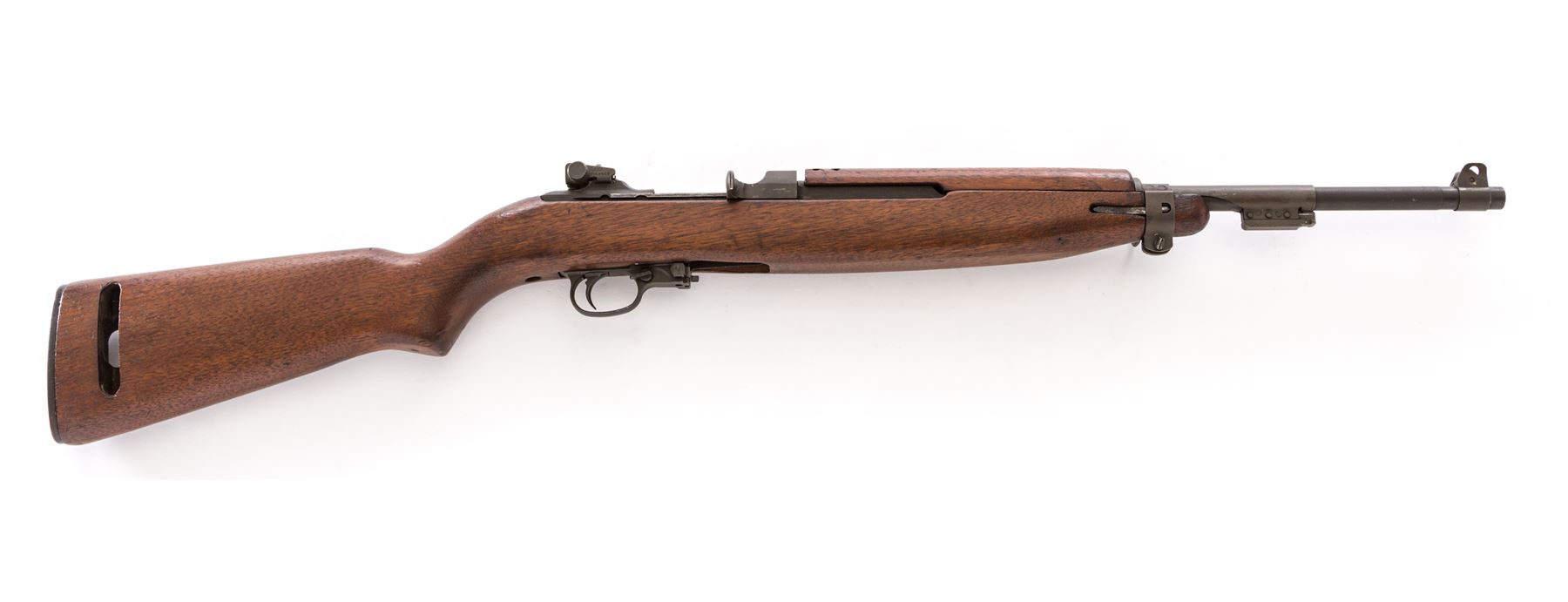 U.S. M1 Carbine Semi-Automatic Rifle, by Underwood, #1439267, .30 Carb. cal., 18'' IBM barrel, round bolt, Type 3 stamped rear sight, flip safety, oval cut low wood, unmarked walnut M2 stock, with late type four-rivet handguard and bayonet lug. Includes one 5-round aftermarket magazine. Condition is fine as overhauled, retaining approx. 94% parkerized finish. Stock with light general bruising. Good action, bright bore. Est.: $500-$750. (C&R)