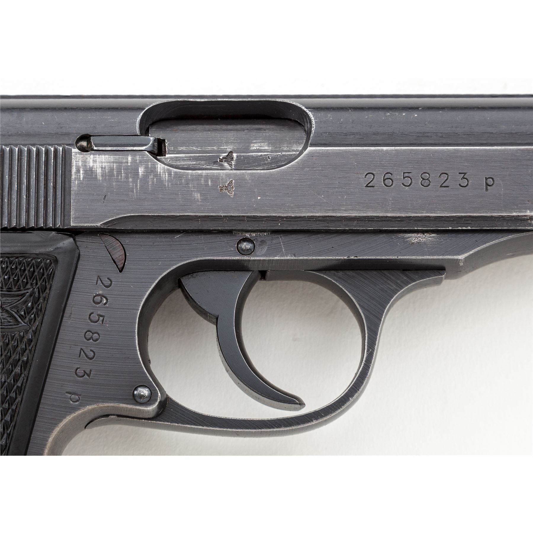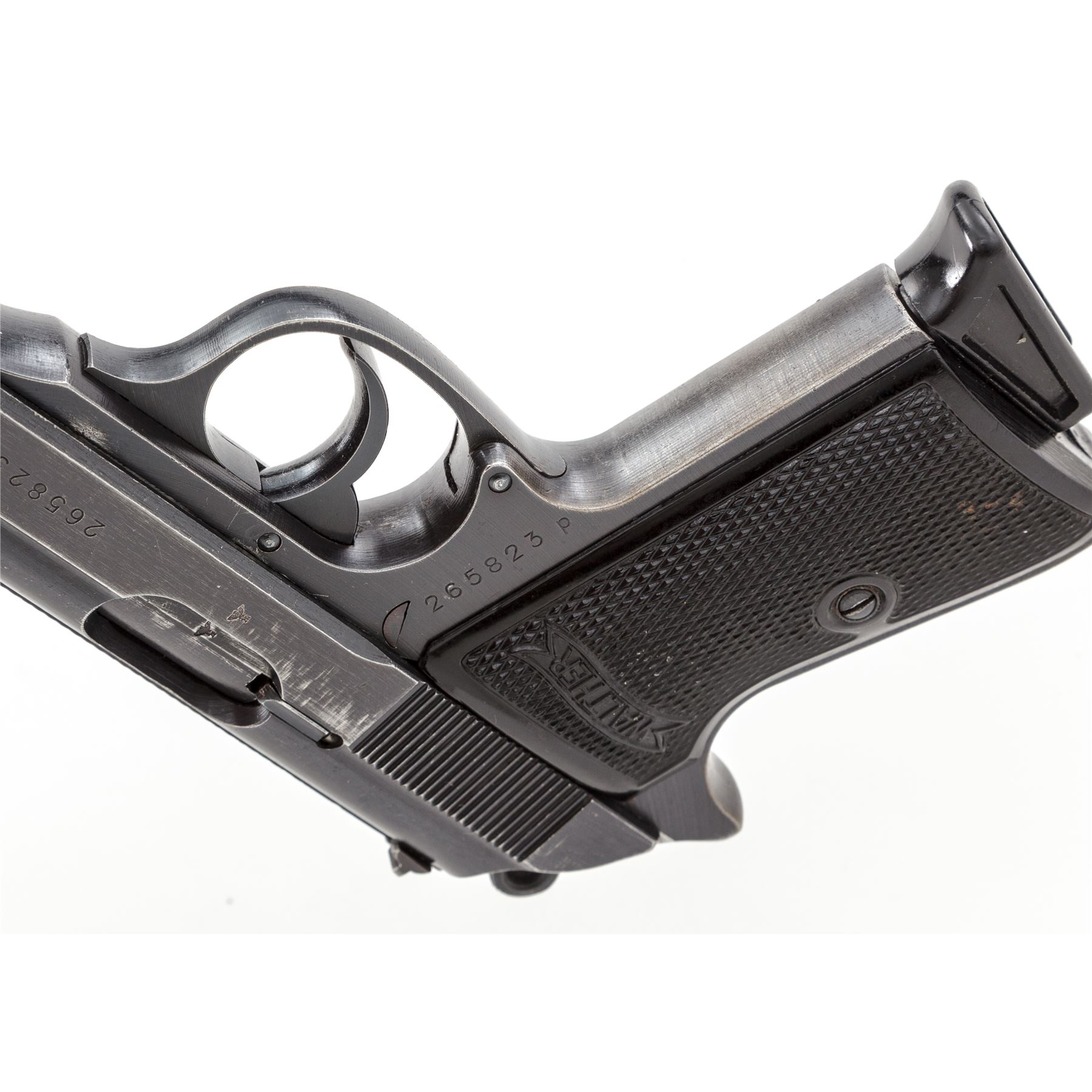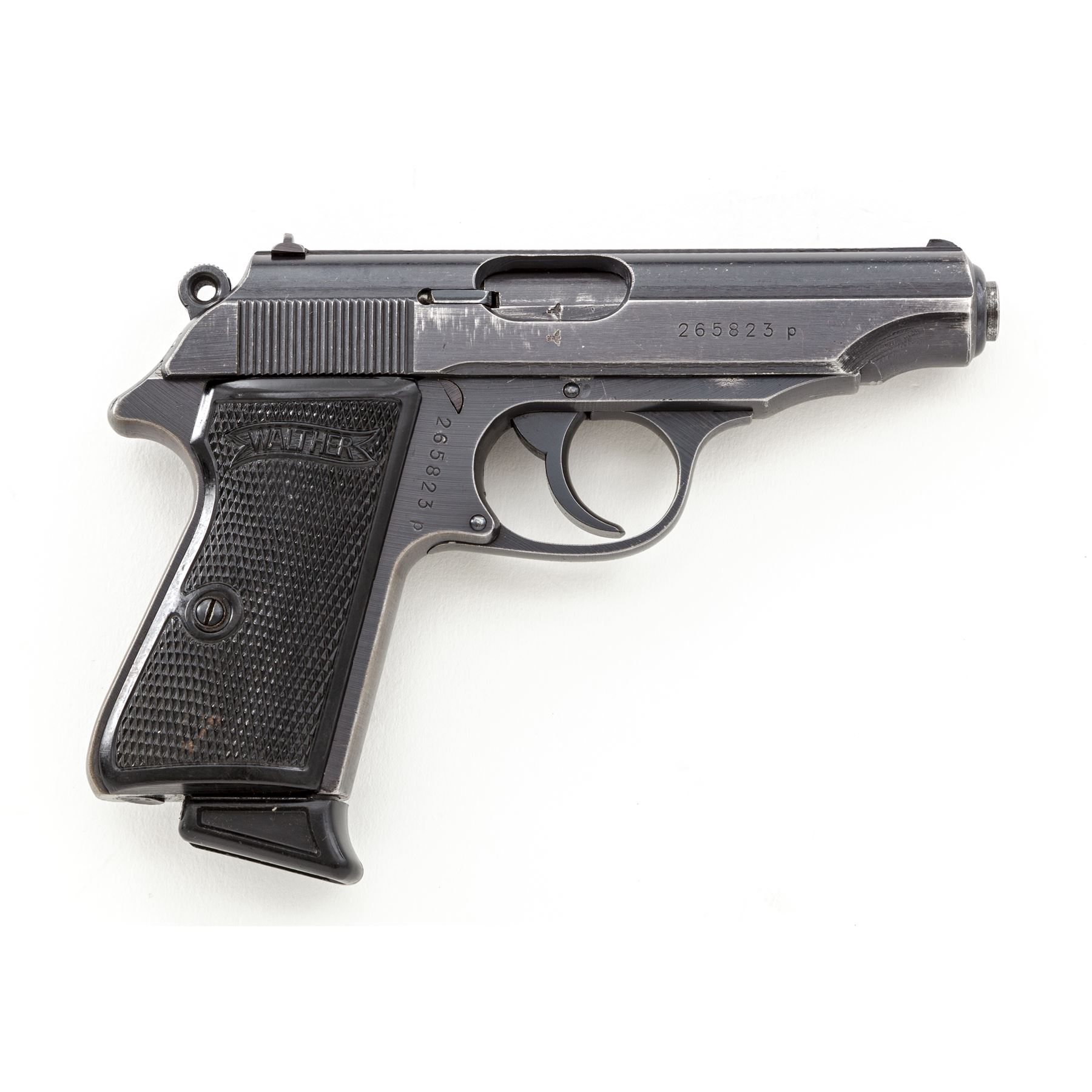 Mid- to Late-War Commercial Walther PP Semi-Automatic Pistol, #265823p, .32 ACP cal., 3.75'' barrel, blue finish, black checkered grips with Walther banner, with one flat-bottom and one finger-rest magazine, in early post-war black leather holster. ''(Eagle)/N'' proofmarks to slide and barrel. Condition is fine retaining approx. 92% thinning blue, with light flaking to right side of slide. Grips remain crisp with bright red dot in safety area. Finger-rest magazine appears to be post-war; flat-bottom magazine of WWII mfg. having the number 71112 both stamped and electro-penciled to left side of magazine body. Post-war holster is good with light general scuffing to black finish. Good action, bright bore. Est.: $500-$750. (C&R/PPT)