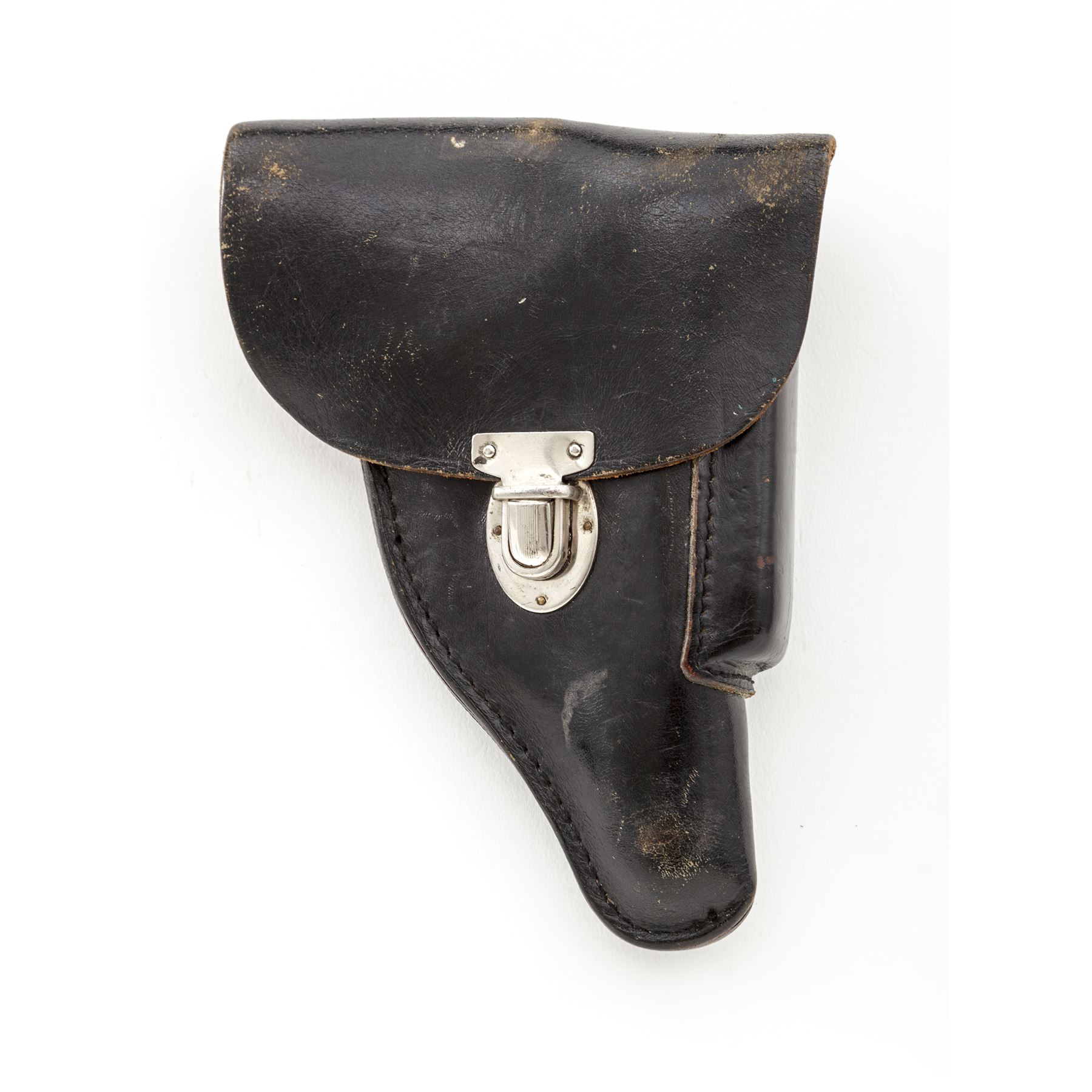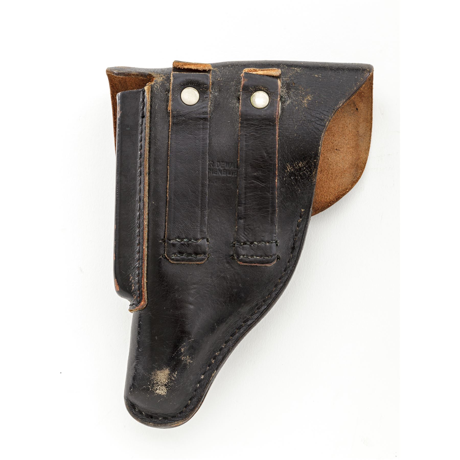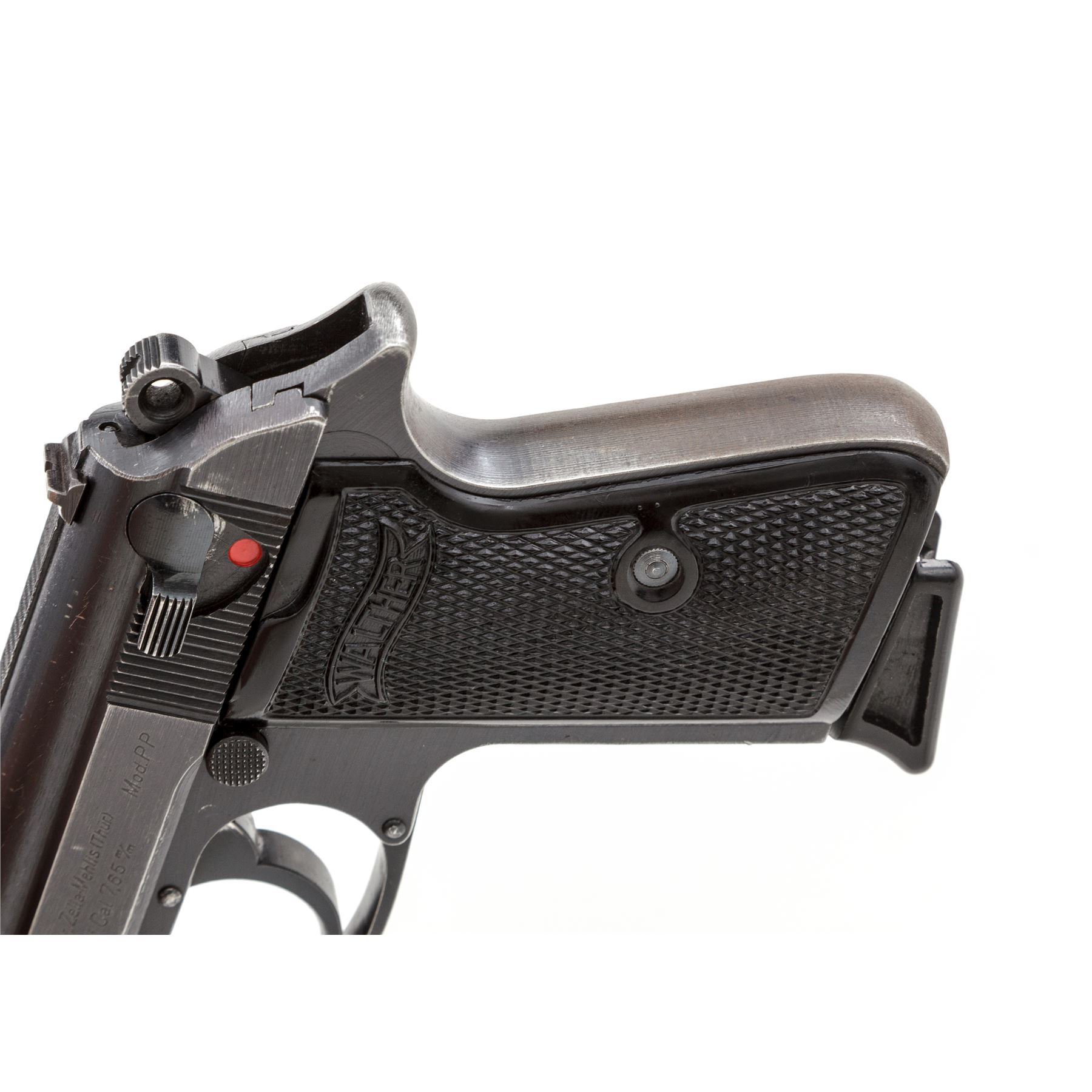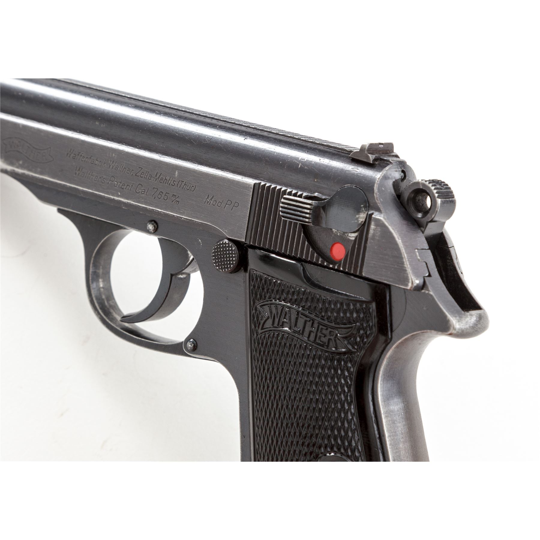 Mid- to Late-War Commercial Walther PP Semi-Automatic Pistol, #265823p, .32 ACP cal., 3.75'' barrel, blue finish, black checkered grips with Walther banner, with one flat-bottom and one finger-rest magazine, in early post-war black leather holster. ''(Eagle)/N'' proofmarks to slide and barrel. Condition is fine retaining approx. 92% thinning blue, with light flaking to right side of slide. Grips remain crisp with bright red dot in safety area. Finger-rest magazine appears to be post-war; flat-bottom magazine of WWII mfg. having the number 71112 both stamped and electro-penciled to left side of magazine body. Post-war holster is good with light general scuffing to black finish. Good action, bright bore. Est.: $500-$750. (C&R/PPT)