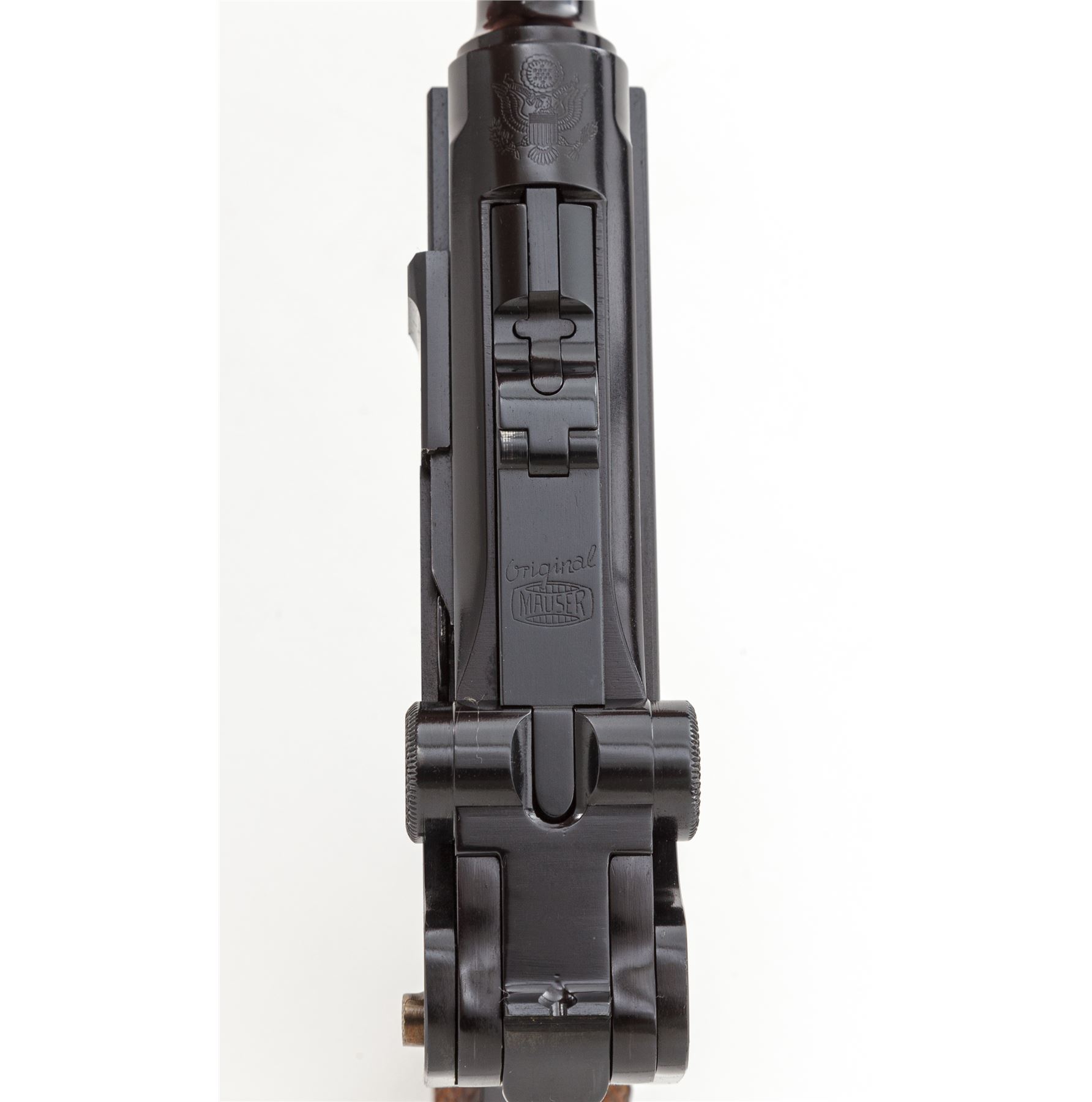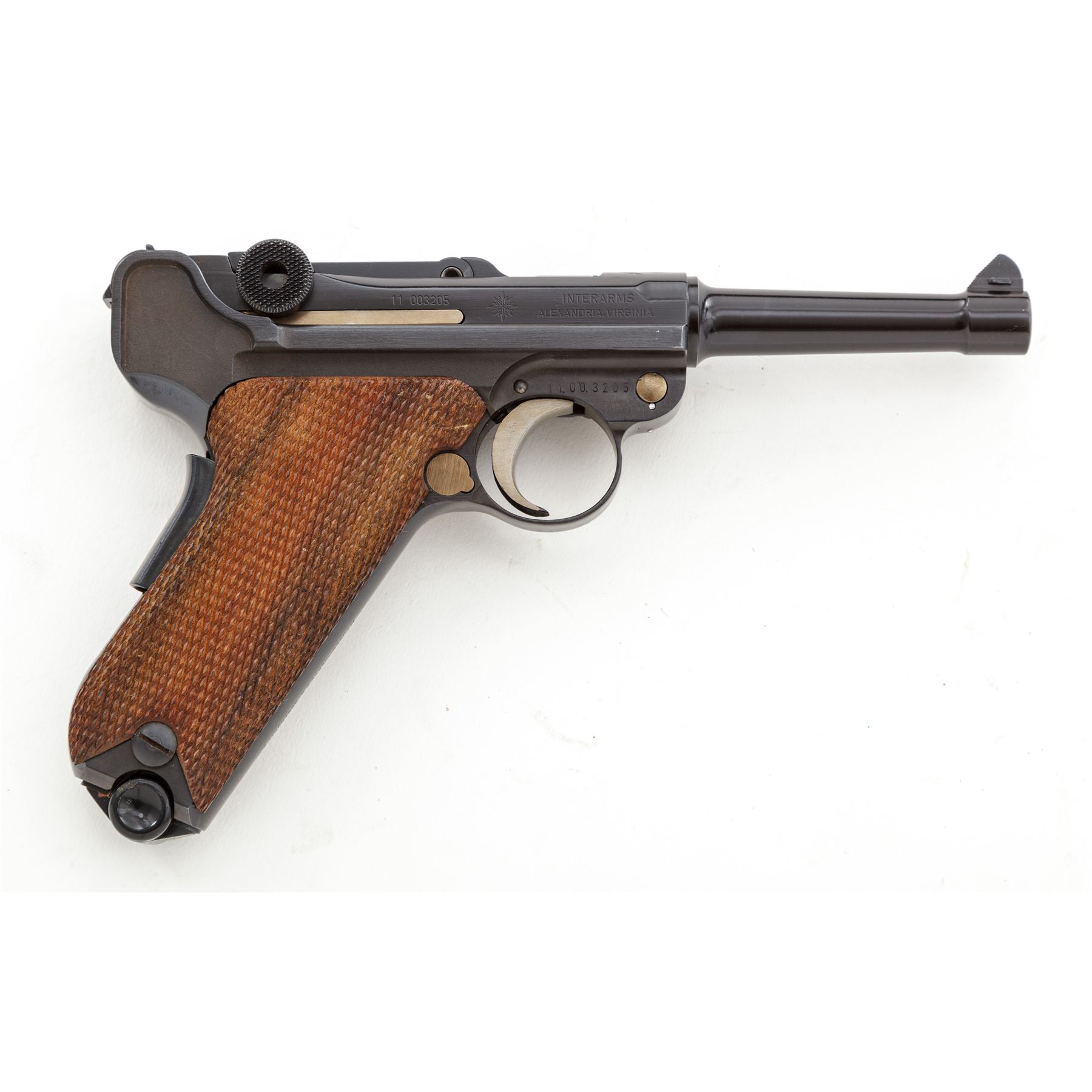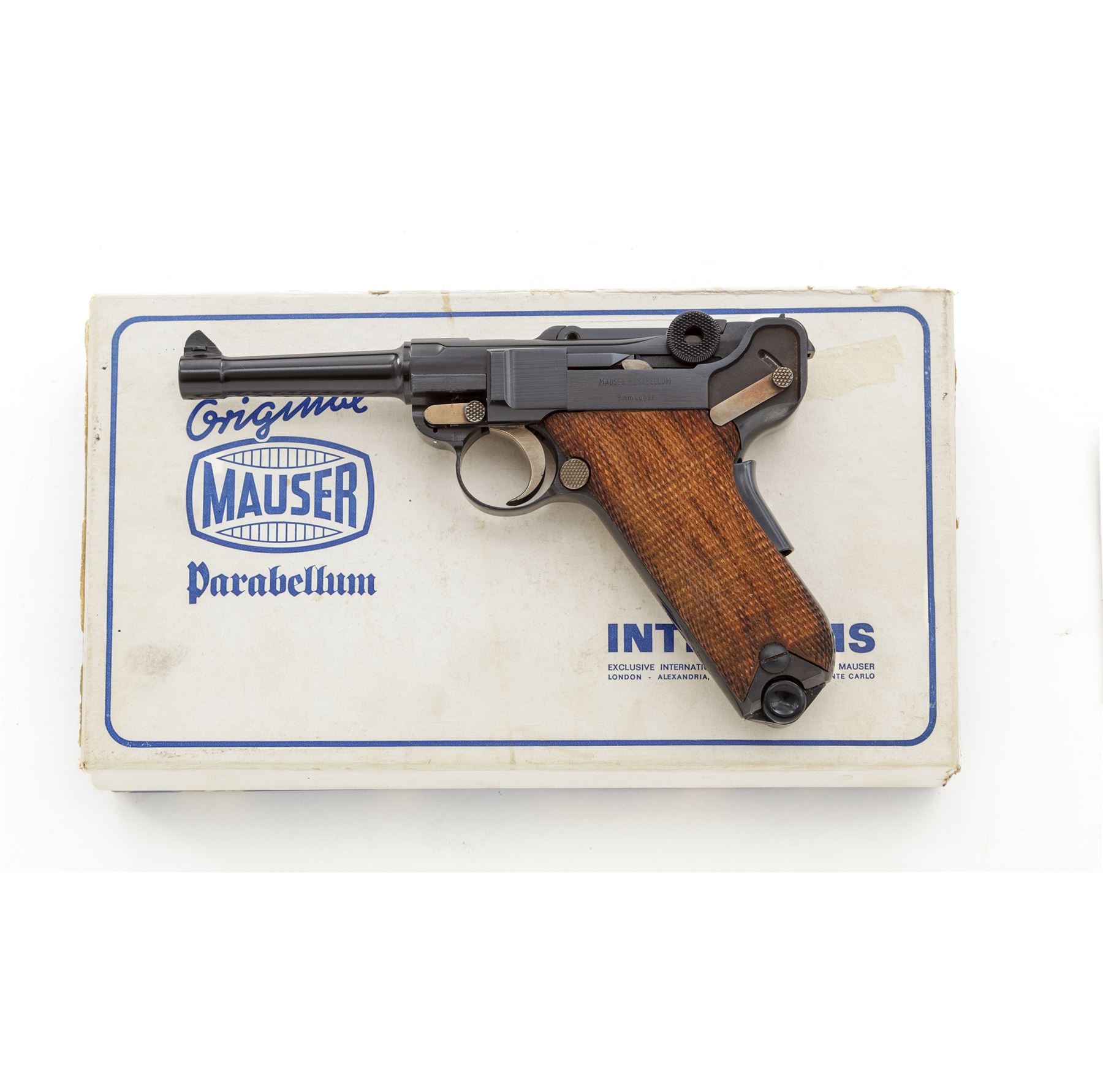 Like New Boxed Original Mauser/Interarms American Eagle Luger, #11.003205, 9mm Luger cal., 4'' barrel, high polish blue finish, straw-colored small parts, checkered wood grips, standard fixed sights, with two (2) factory magazines. In original box with cleaning brush, original test target and owner's manual. Top of frame is marked with an American Eagle; front gripstrap marked ''Mauser-Werke A.G. Oberndorf a.N.'' Toggle marked ''Original/(Mauser Banner)''; right side marked ''Interarms, Alexandria, Virginia''; left side ''Mauser Parabellum/9mm Luger''; back marked ''Made in Germany''. Condition overall is excellent, appearing as new, with only a few slight handling marks. Grips with clean, sharp checkering. All factory marks are clear and defined. Action is tight, bore is mirror bright. Pistol appears to be most likely unfired since leaving the factory. Box with flaking and wear to the blue and white finish as well as part of the end label; lid is separated at corners but intact; interior and all accessories are very good. Est.: $1,000-$1,500. (C&R/PPT)