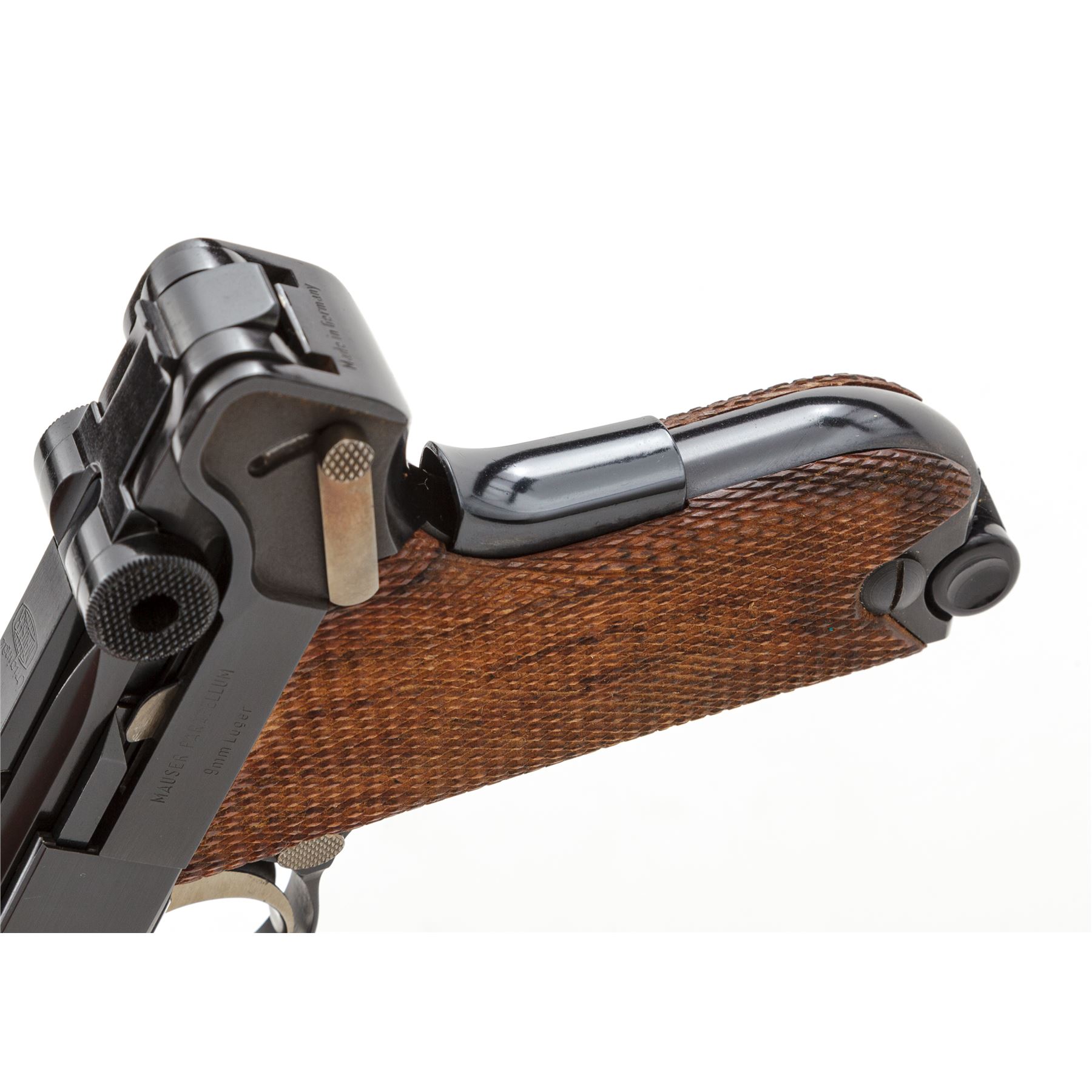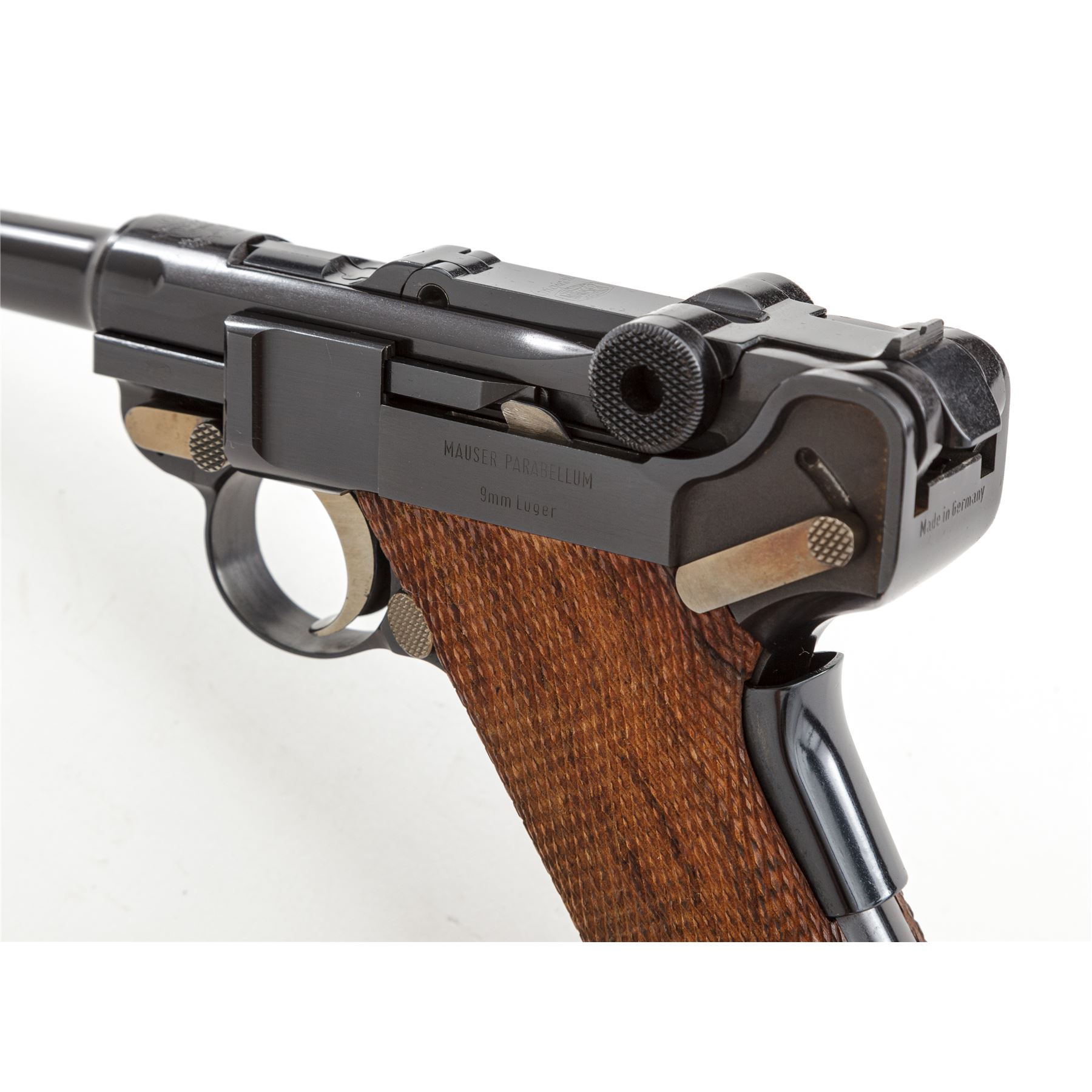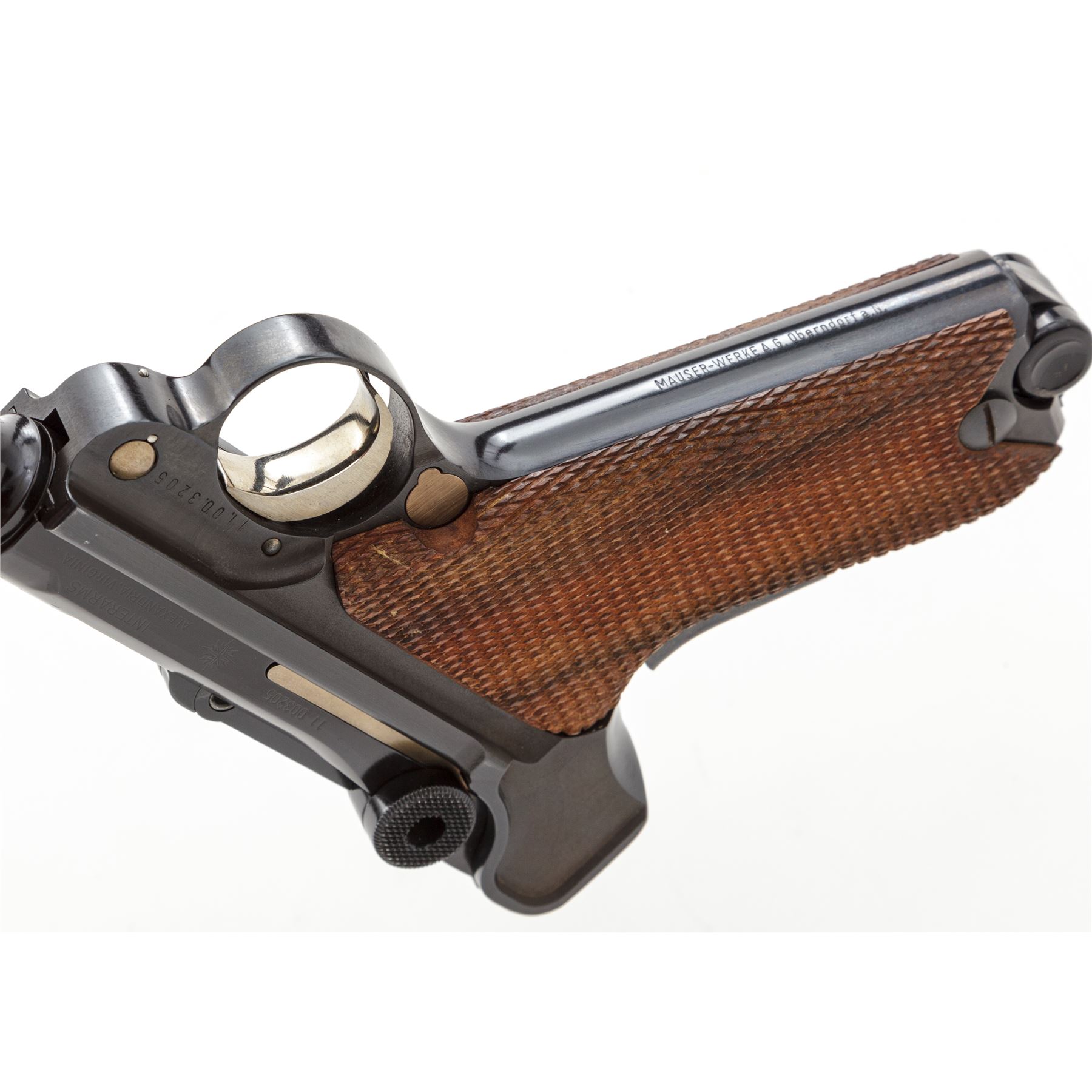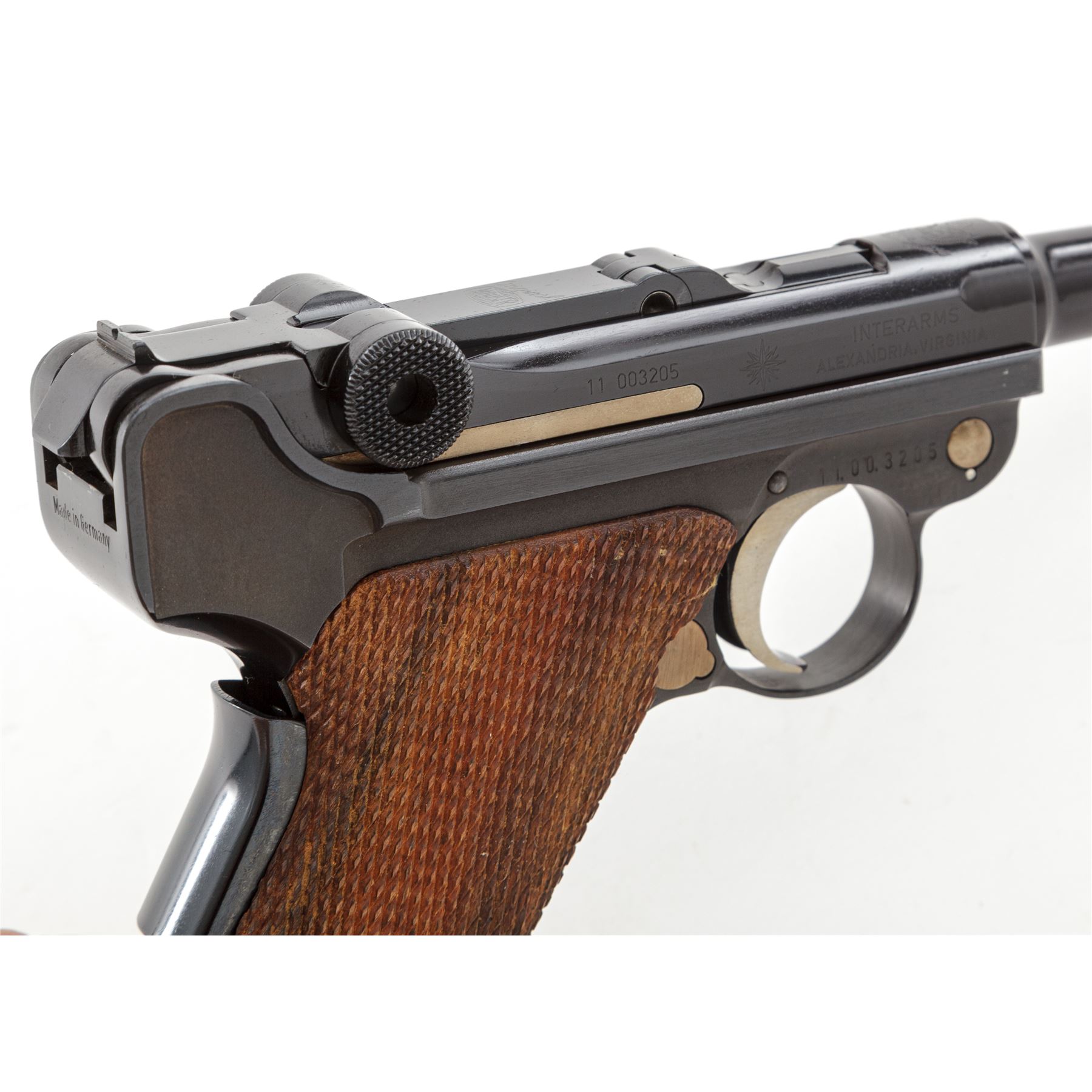 Like New Boxed Original Mauser/Interarms American Eagle Luger, #11.003205, 9mm Luger cal., 4'' barrel, high polish blue finish, straw-colored small parts, checkered wood grips, standard fixed sights, with two (2) factory magazines. In original box with cleaning brush, original test target and owner's manual. Top of frame is marked with an American Eagle; front gripstrap marked ''Mauser-Werke A.G. Oberndorf a.N.'' Toggle marked ''Original/(Mauser Banner)''; right side marked ''Interarms, Alexandria, Virginia''; left side ''Mauser Parabellum/9mm Luger''; back marked ''Made in Germany''. Condition overall is excellent, appearing as new, with only a few slight handling marks. Grips with clean, sharp checkering. All factory marks are clear and defined. Action is tight, bore is mirror bright. Pistol appears to be most likely unfired since leaving the factory. Box with flaking and wear to the blue and white finish as well as part of the end label; lid is separated at corners but intact; interior and all accessories are very good. Est.: $1,000-$1,500. (C&R/PPT)