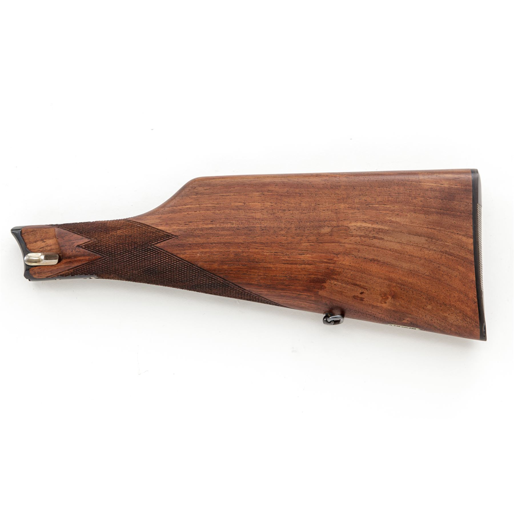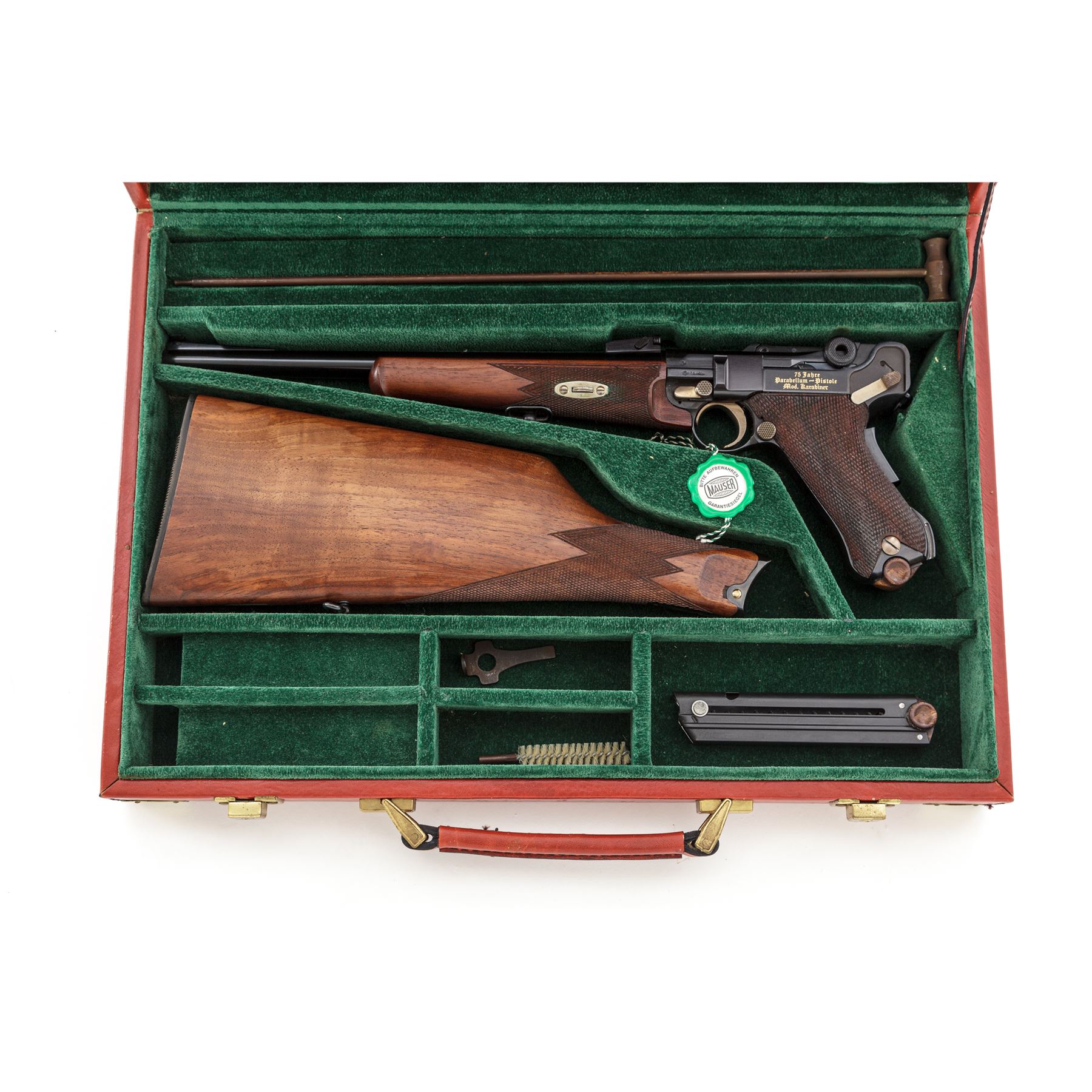 Original Mauser 75th Year Commemorative Luger Carbine, #K236von250, 9mm, 11.5'' barrel, royal blue finish with straw small parts, checkered walnut grips, two (2) modern magazines with walnut bases and matching numbered shoulder stock, cleaning rod, combination tool, keys and brush, in factory fitted luggage-type case. Mfg'd in 1979 by Mauser to commemorate the 75th Anniversary of the Luger Carbine. Complete with three-position Carbine rear sight and ramped blue bead front sight, grip and thumb safety, gold DWM logo on central toggle link, as well as ''75 Jahre/Parabellum-Pistole/Mod. karabiner'' in gold to left side of lower frame. Condition is excellent, appearing as new and unfired, with the exception of three chips to the stock buttplate; hang tag still in place. Exterior of case with just minor soiling and scuffing; interior shows only the lightest impressions from pistol. Est.: $6,000-$8,000. (C& R/PPT)