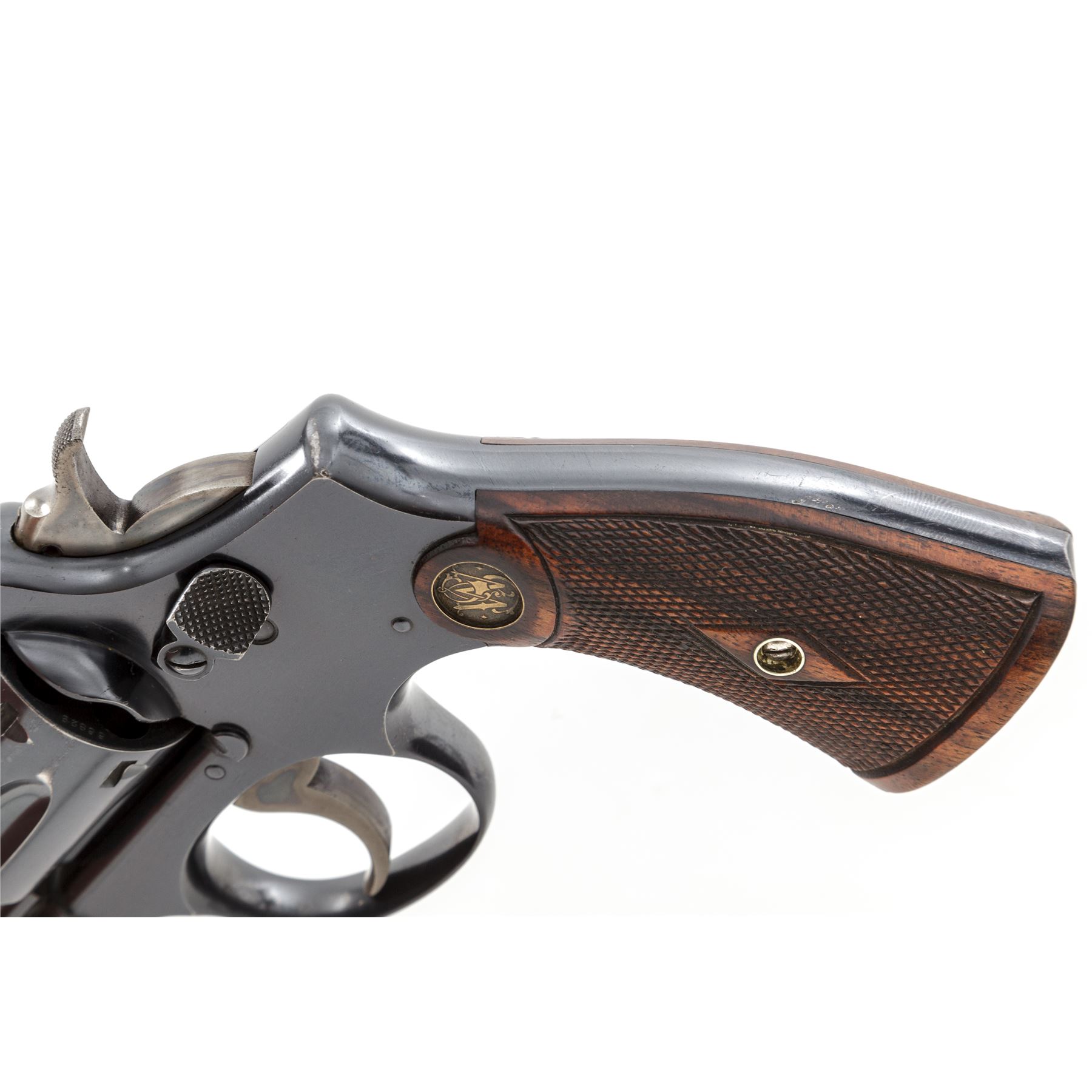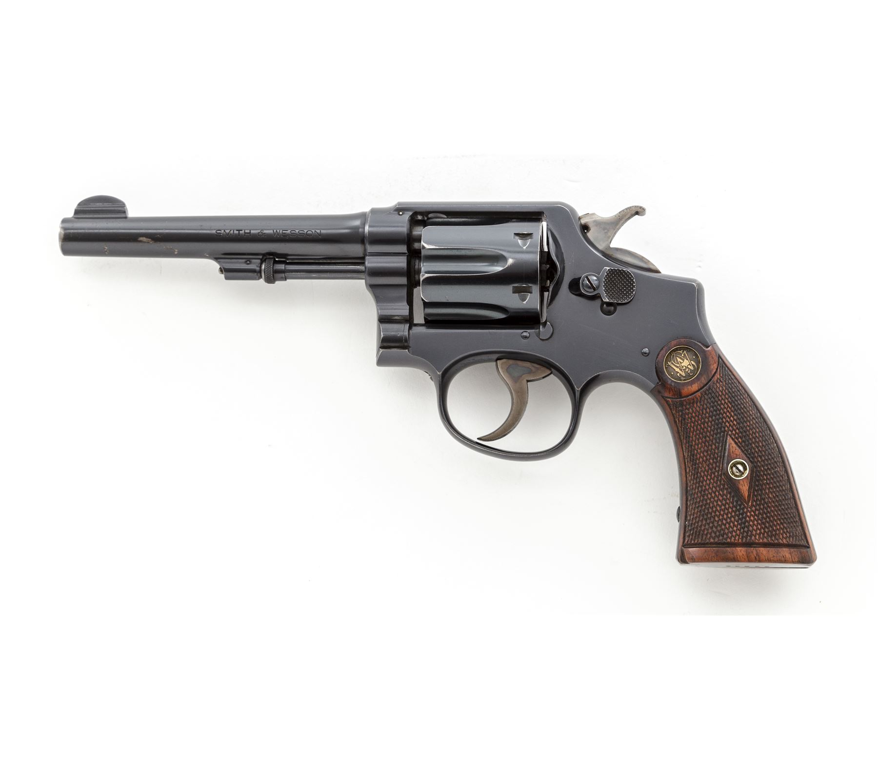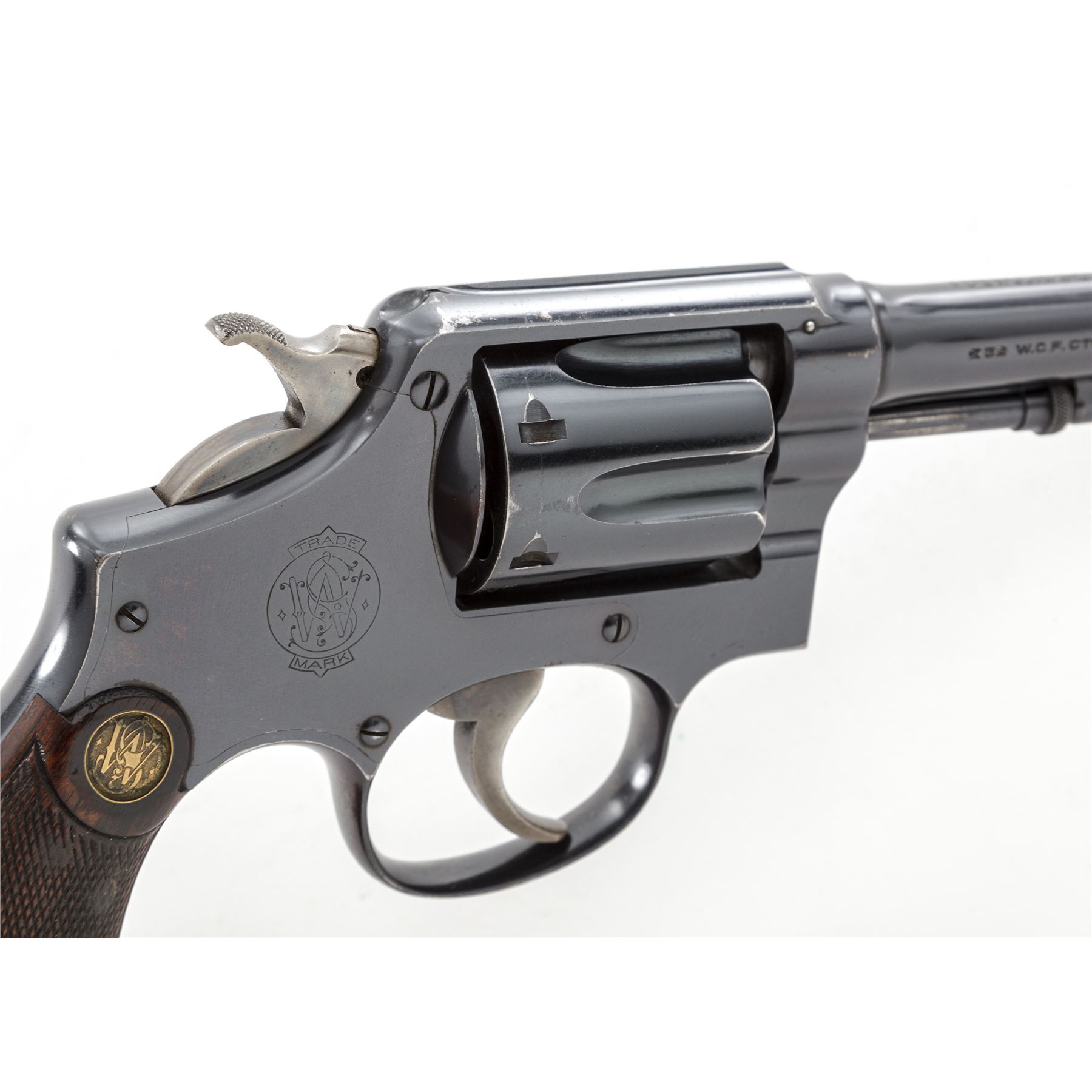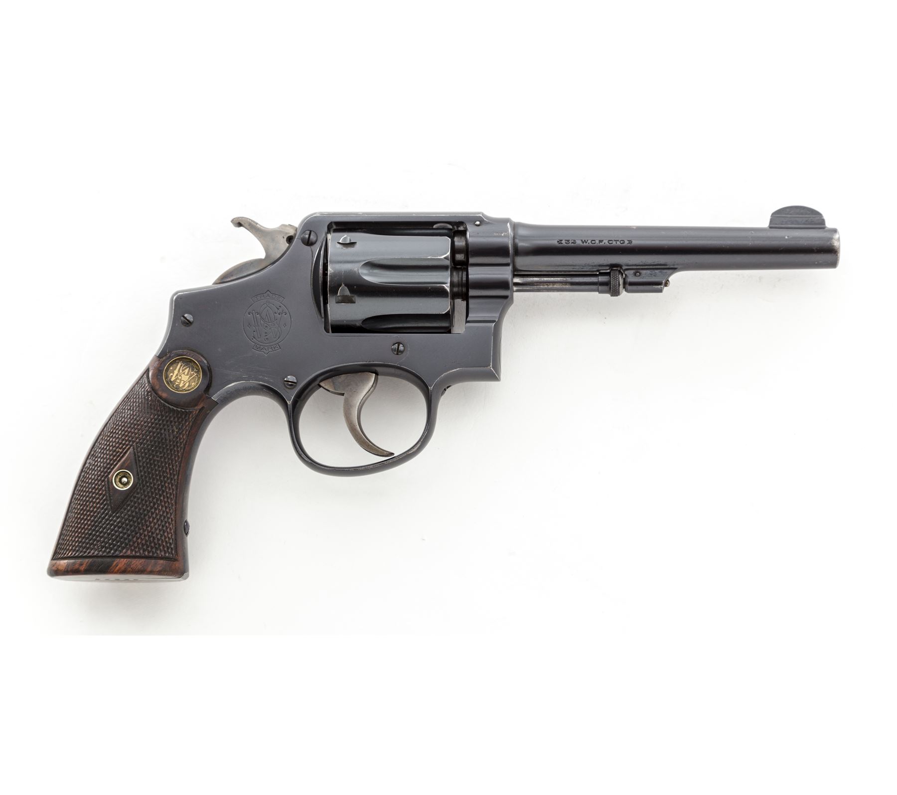 Smith & Wesson Model 1905 4th Change Double Action Revolver, #66829, .32-20 cal., 5'' barrel, blue finish, matching numbered factory checkered walnut grips with S&W medallions. Mfg'd ca. 1915-1920. Condition is excellent retaining approx. 94% factory blue. Grips are excellent with only one small blemish to right side panel. Good action, bright bore, in a desirable caliber. Est.: $1,000-$1,500. (C&R/PPT)