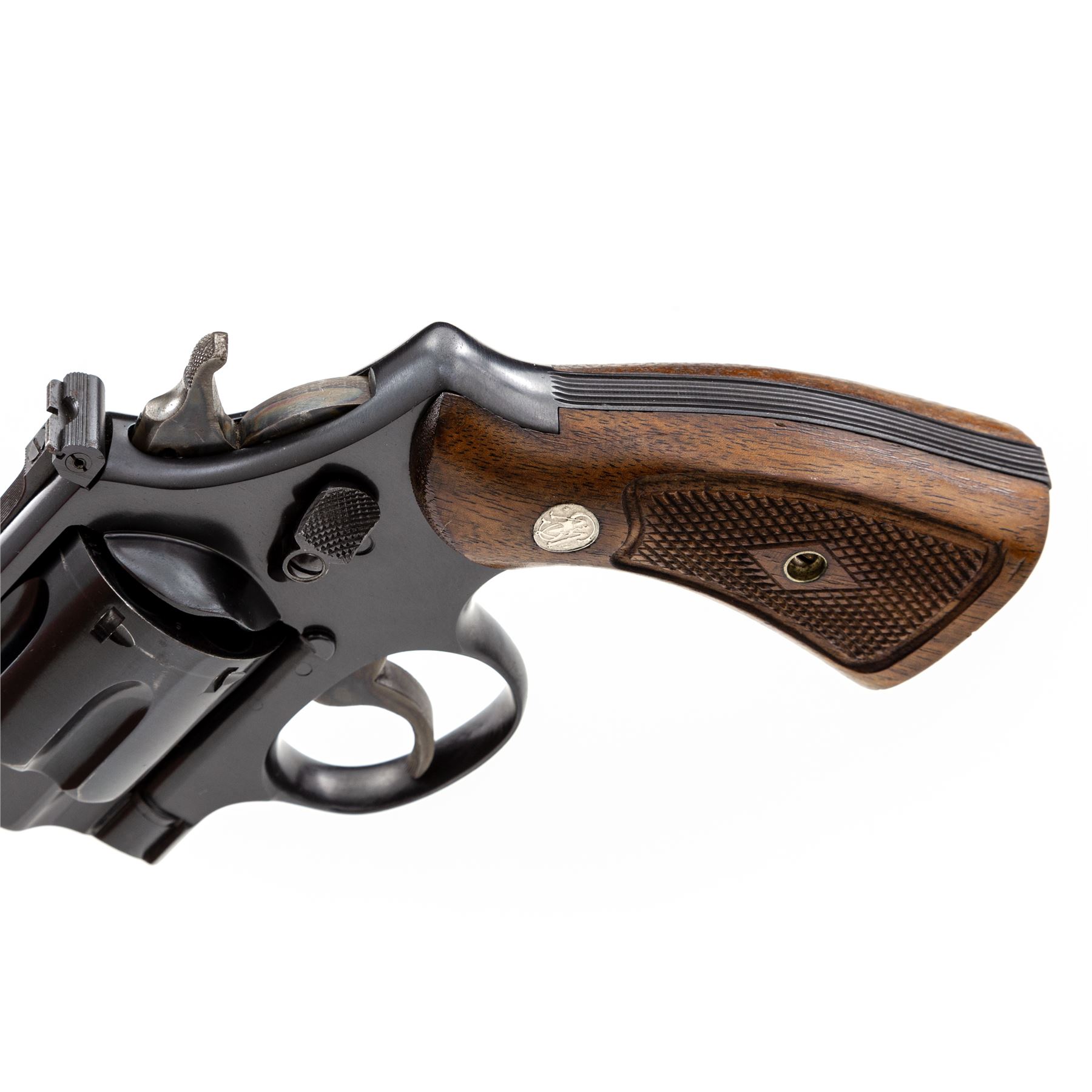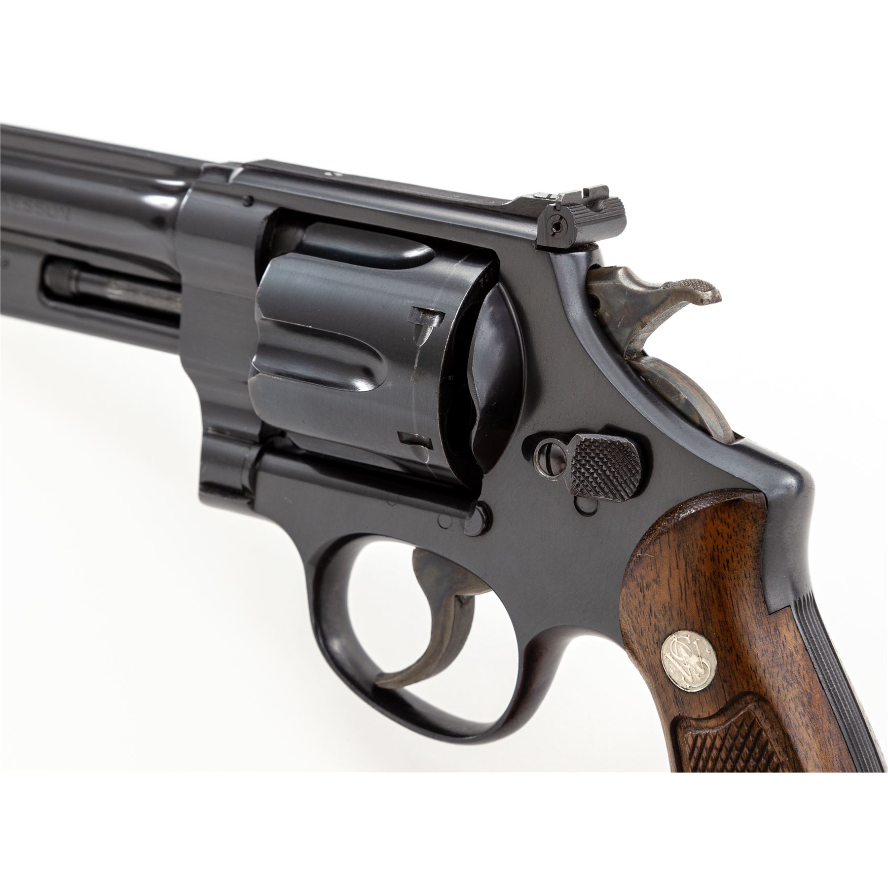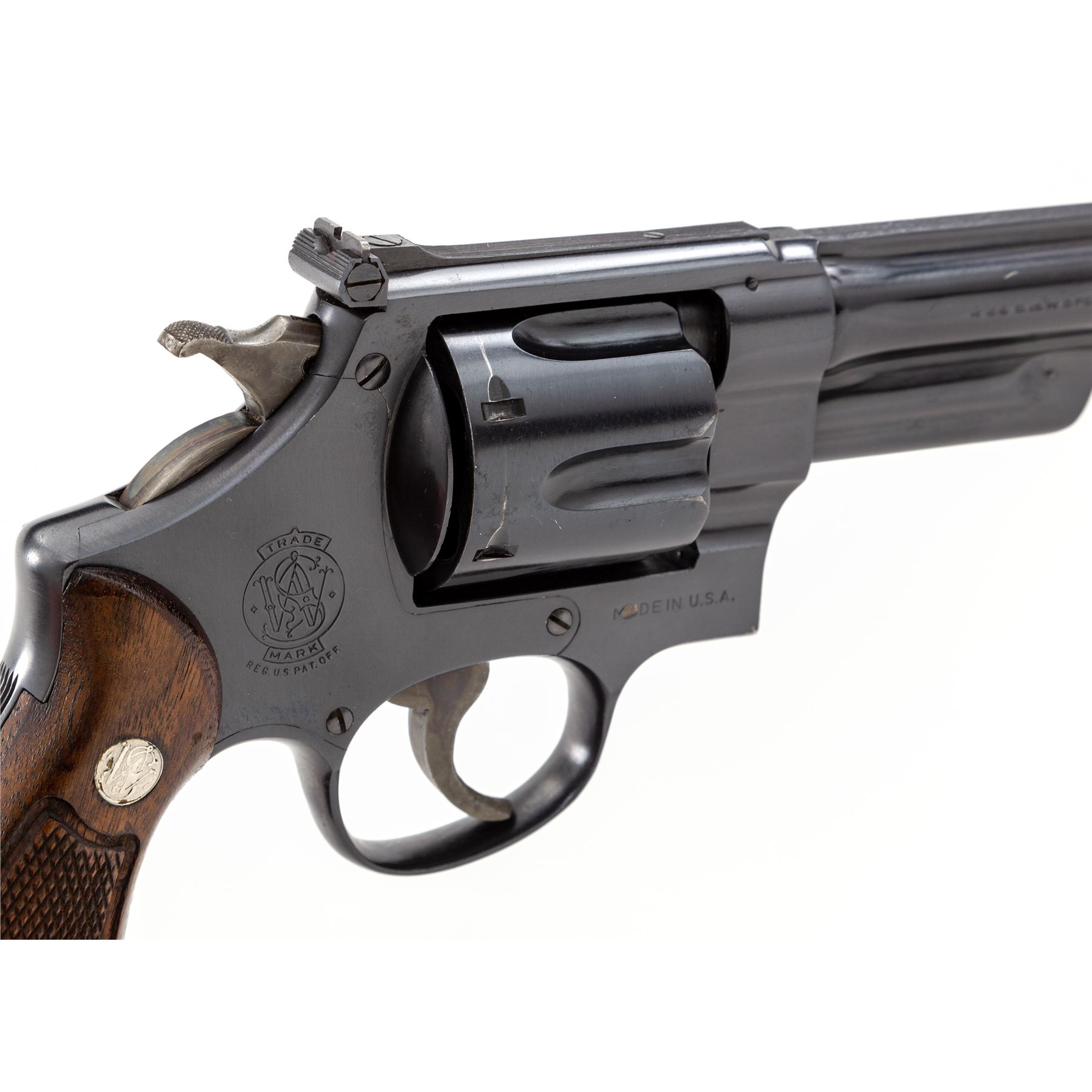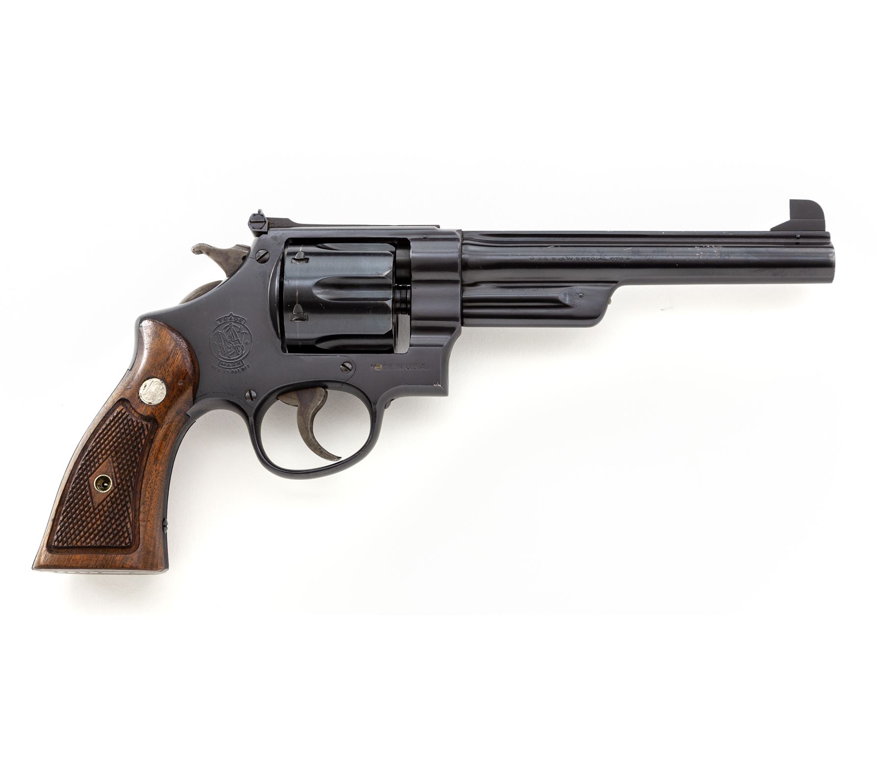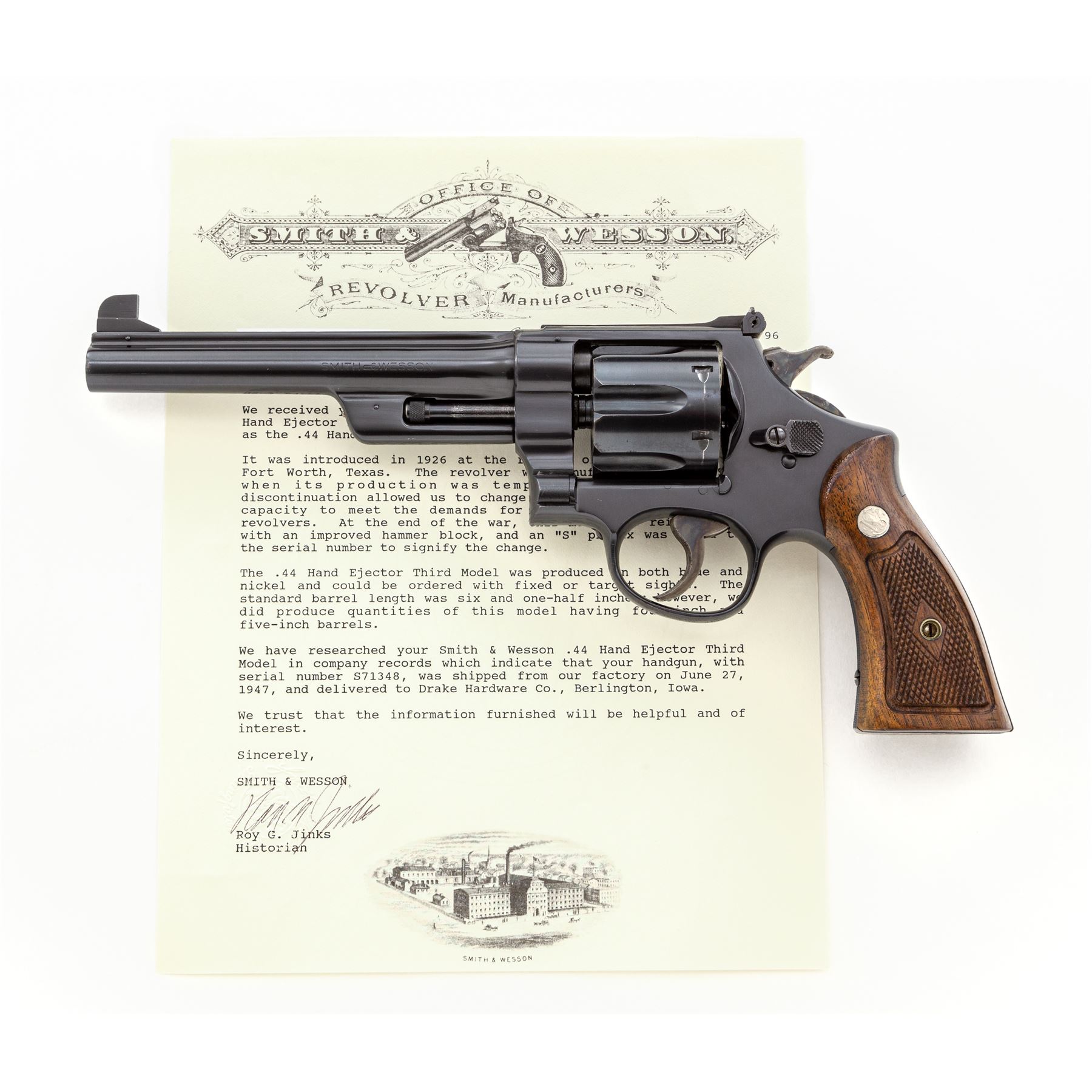 Smith & Wesson Third Model Hand Ejector (Model of 1926) Double Action Revolver, #S71348, .44 S&W Spec. cal., 6.5'' barrel, blue satin finish, factory checkered walnut grips with bright medallions, high Patridge front and adjustable rear sight. Shipped June 27, 1947, to Drake Hardware Co., Berlington, IA, with factory letter signed by S&W Historian Roy G. Jinks. Condition is excellent retaining approx. 98% original factory blue, with light scuffs to right side of barrel, as well as a very small ding to right side of frame lug just forward the trigger. Very light index mark to cylinder. Grips with minor flattening. Good action, bright bore. Est.: $1,000-$1,500 (C&R/PPT)