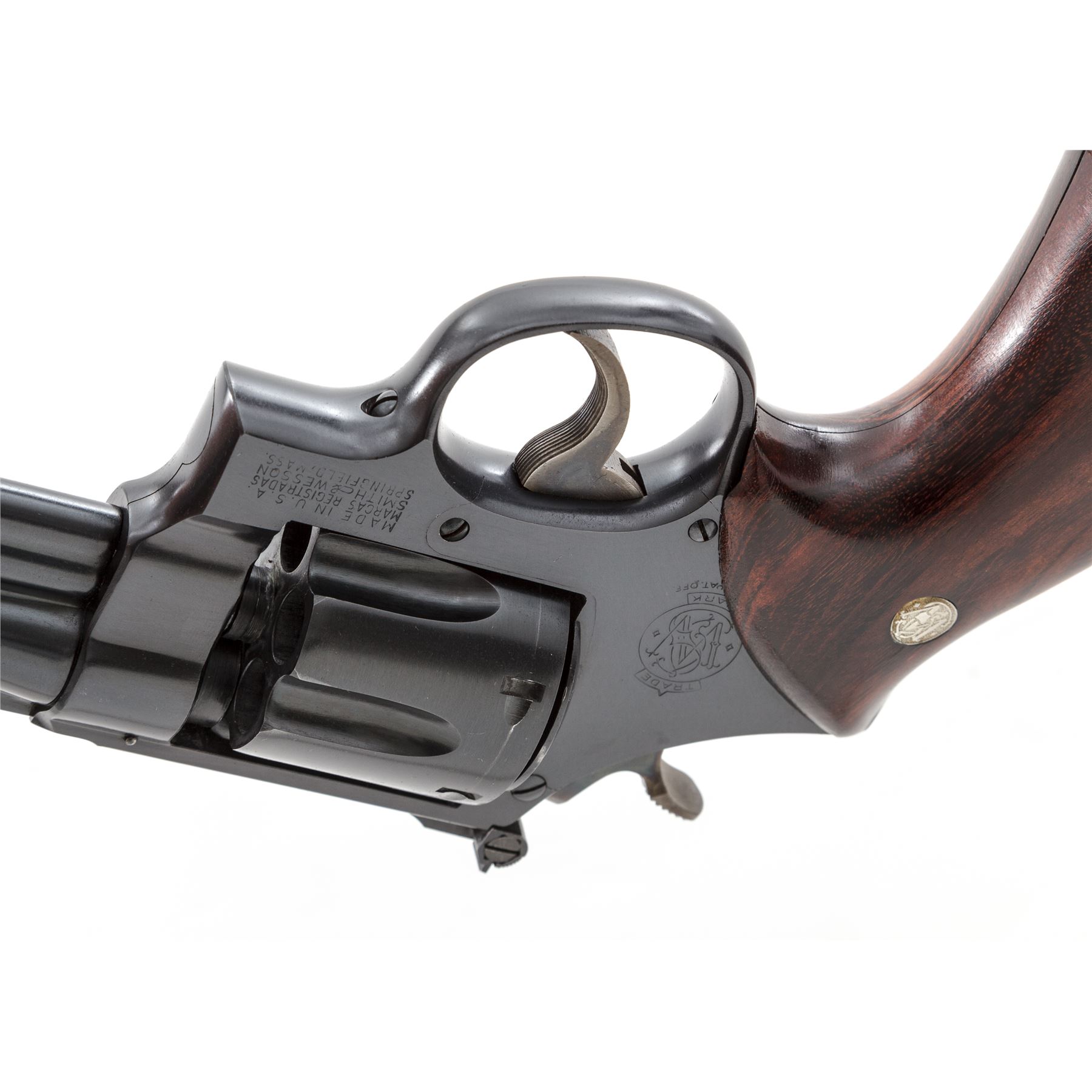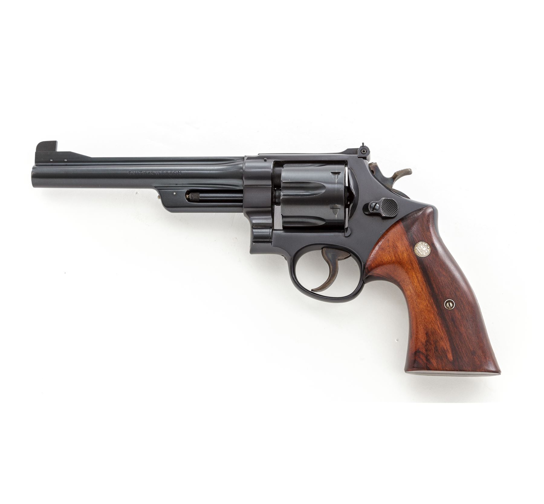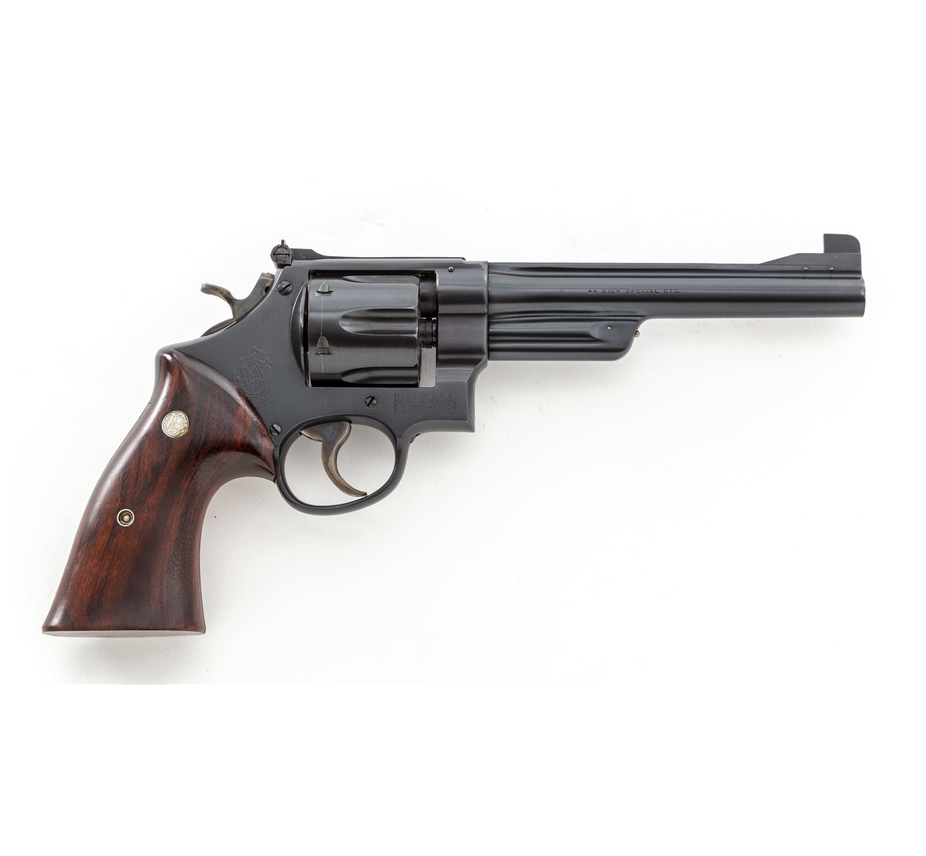 Smith & Wesson 1950 Target Double Action Revolver, #S98818, .44 S&W Spec. cal., 6.5'' pinned barrel, blue finish, smooth Goncalo Alves grips with S&W medallions, and high Patridge ramped front and standard adjustable S&W rear sight. Dating from the late 1950s. Condition is excellent retaining approx. 98%+ original factory blue. Grips and action are excellent, bore is mirror bright. Est.: $1,200- $1,800. (C&R/PPT)