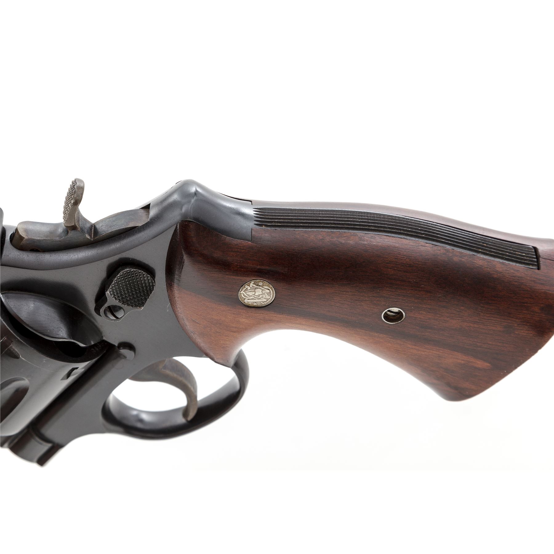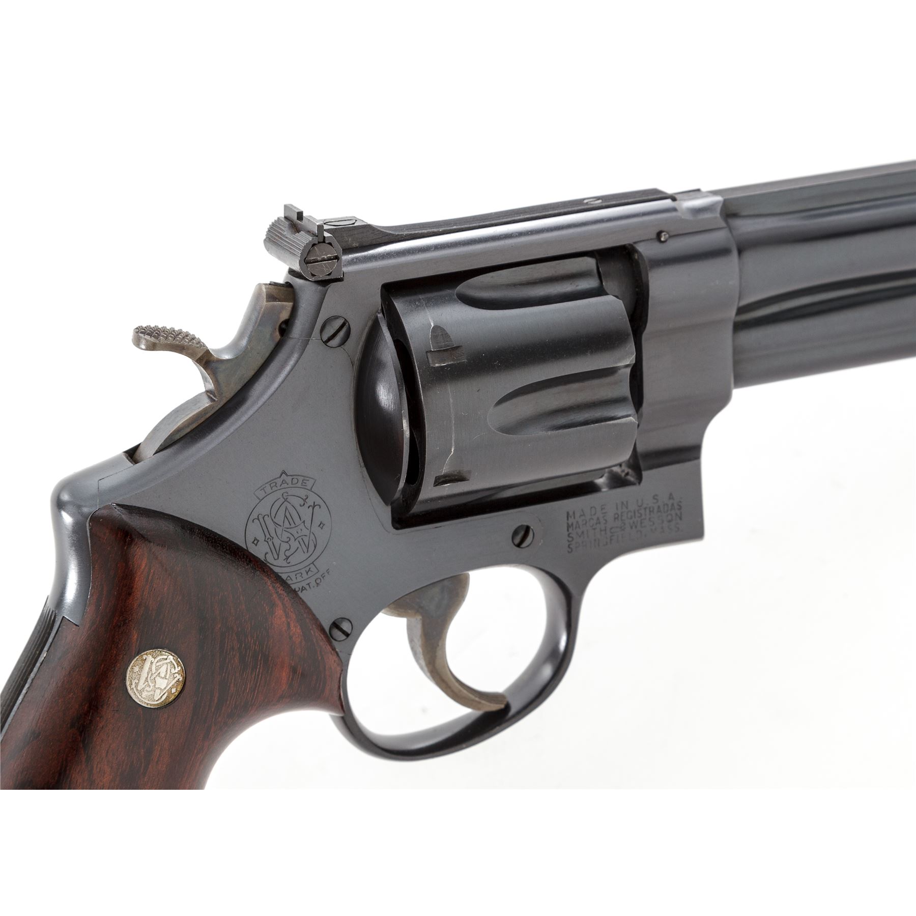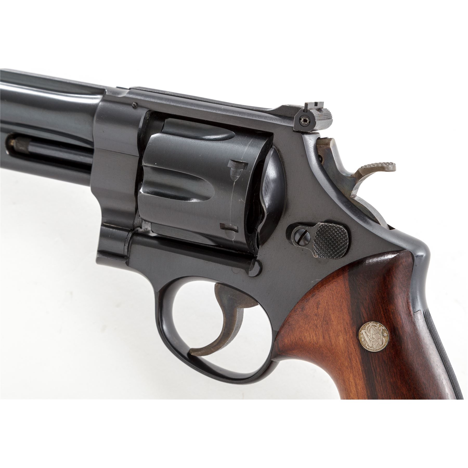 Smith & Wesson 1950 Target Double Action Revolver, #S98818, .44 S&W Spec. cal., 6.5'' pinned barrel, blue finish, smooth Goncalo Alves grips with S&W medallions, and high Patridge ramped front and standard adjustable S&W rear sight. Dating from the late 1950s. Condition is excellent retaining approx. 98%+ original factory blue. Grips and action are excellent, bore is mirror bright. Est.: $1,200- $1,800. (C&R/PPT)