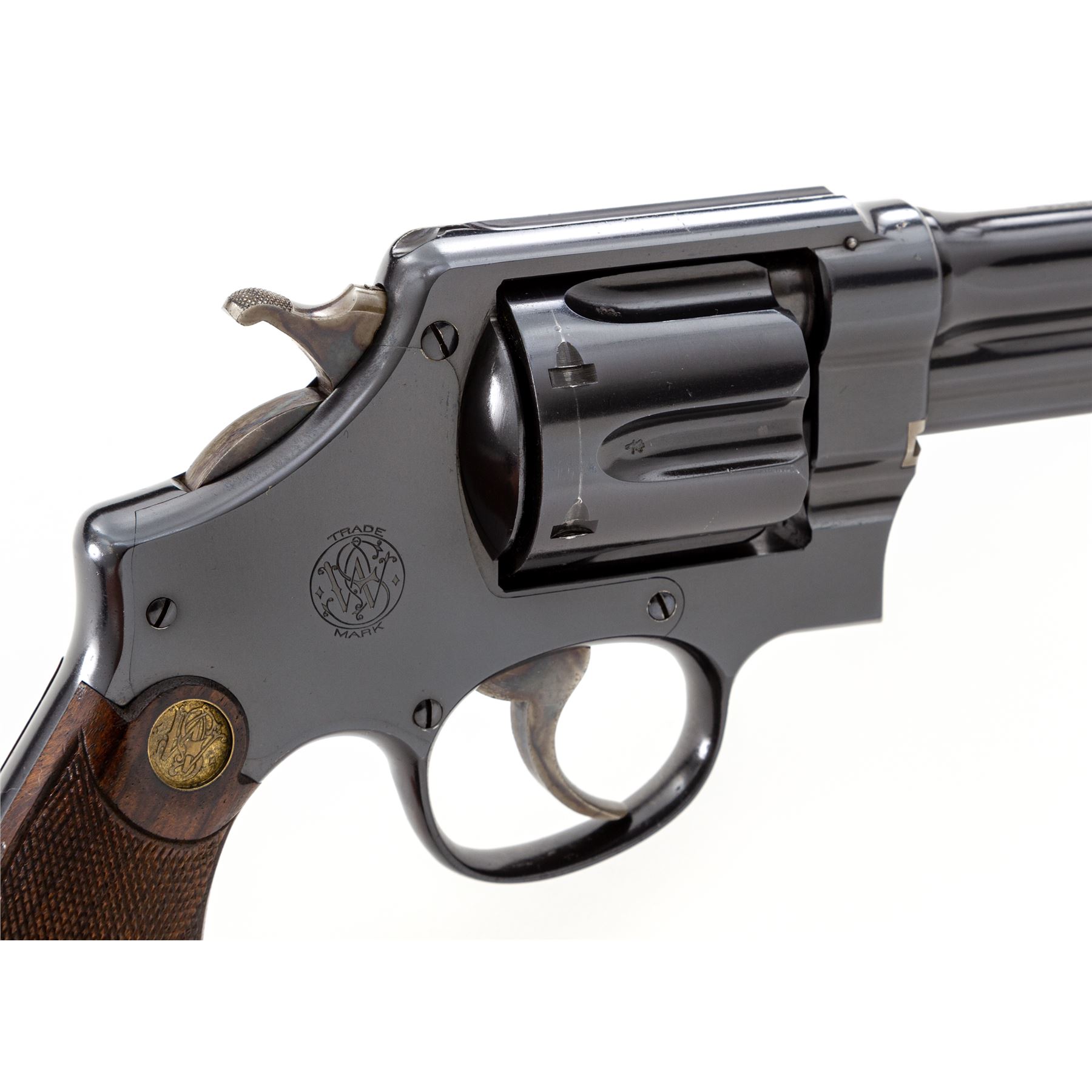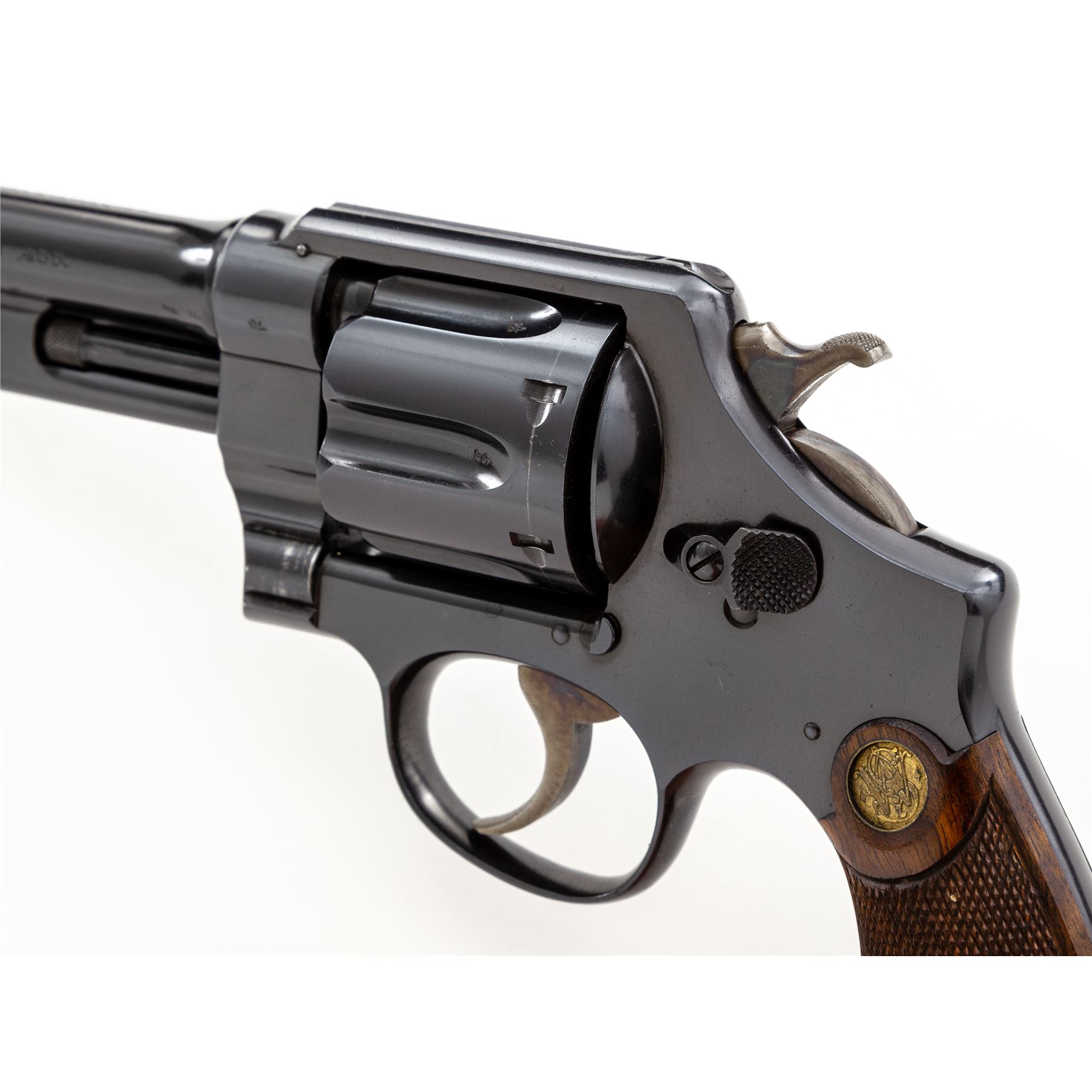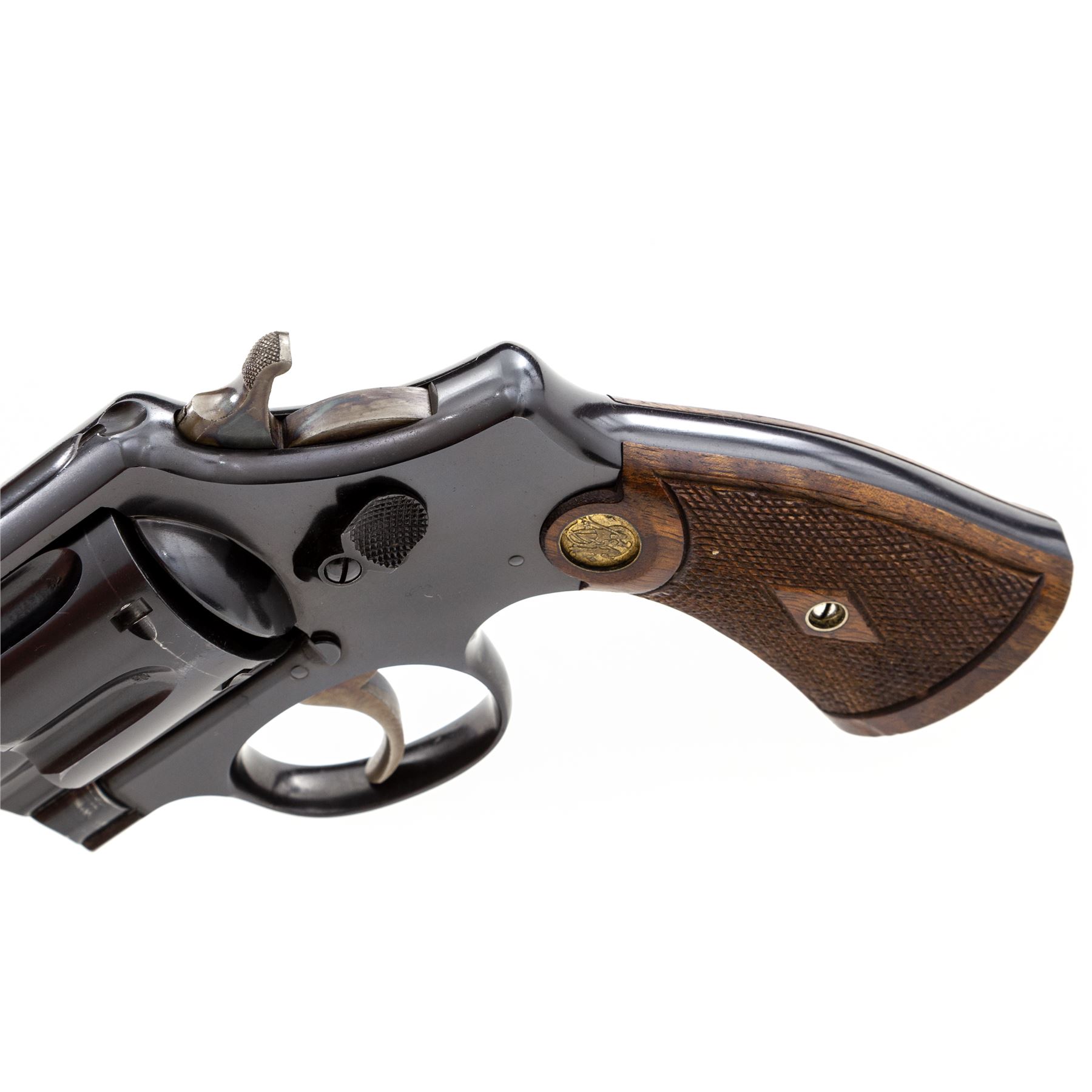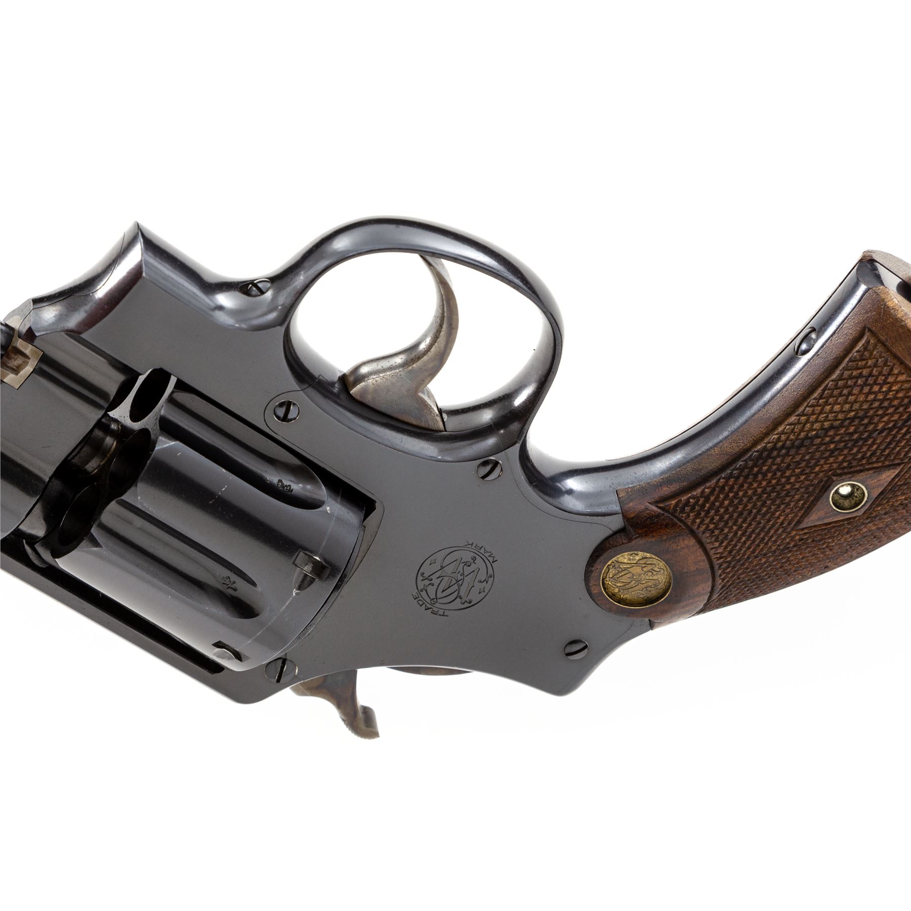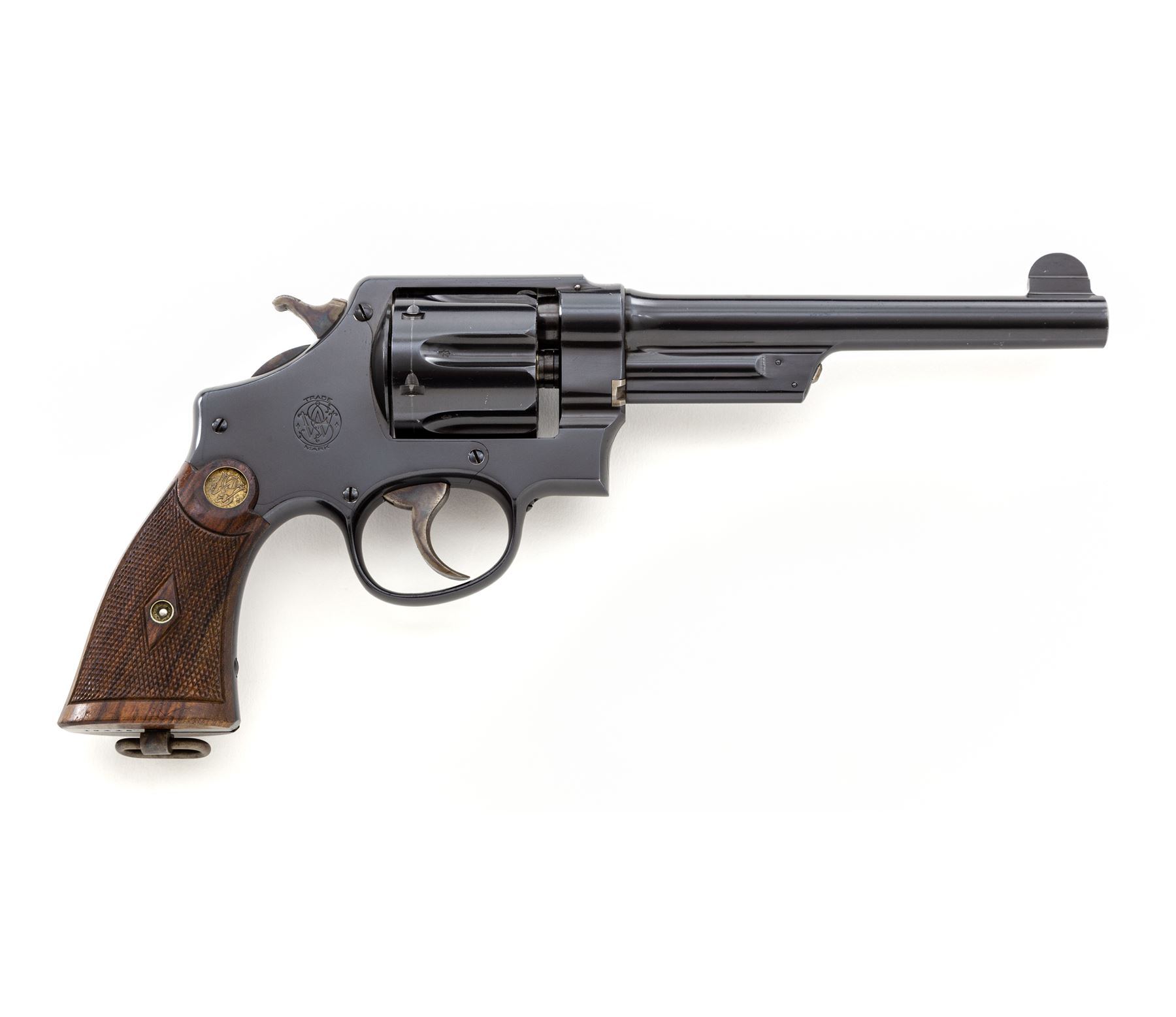 Smith & Wesson First Model Hand Ejector Triplelock Double Action Revolver, #12445, .455 MK II cal., 6.5'' barrel, blue finish, factory checkered walnut grips with S&W medallions that are pencil numbered to this revolver; standard sights. Shipped May 10, 1916, to Bigelow & Co., Birmingham, England, with factory letter signed by S&W Historian Roy G. Jinks. Condition is excellent retaining approx. 98%+ original factory blue, with minor thinning at muzzle, and light wear to cylinder showing thin dragline. All straps retain ample blue. Frame, barrel and cylinder with ''(crown)/V'' and ''CP'' proofmarks. Grips are excellent with only the lightest impressions near butt. Crisp action, mirror bright bore. A near new example of a 103-year-old S&W. Est.: $1,800-$2,400. (C&R/PPT)