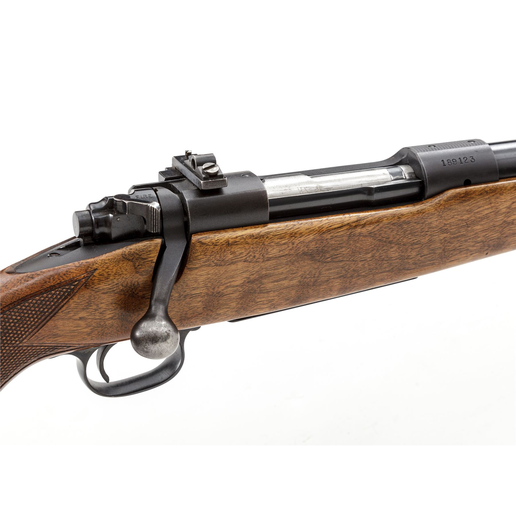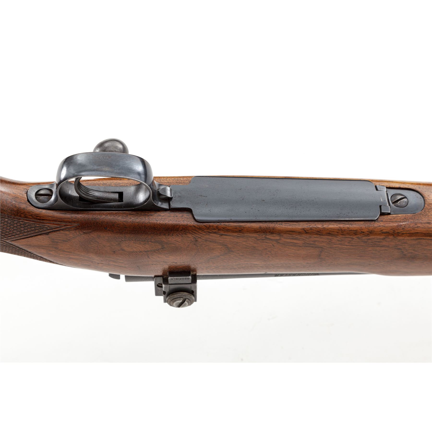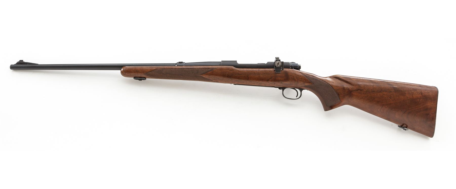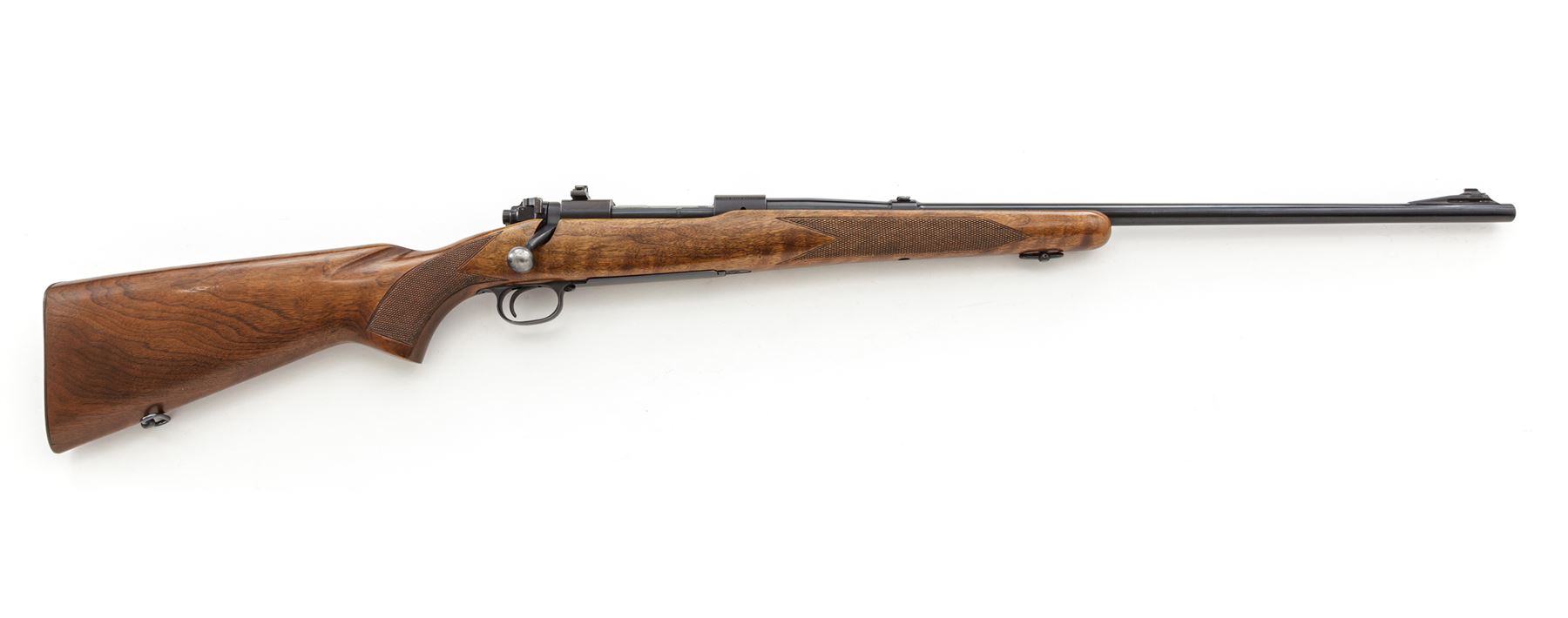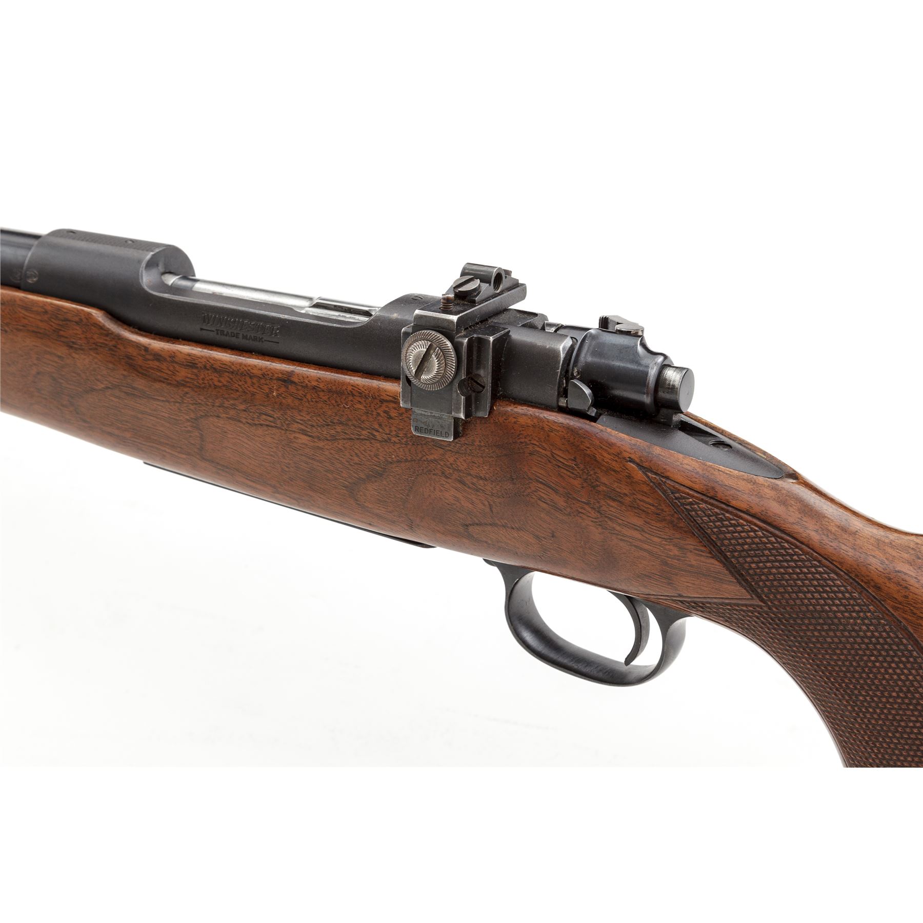 Pre-64 Winchester Model 70 Bolt Action Rifle, #189123, .30-06 cal., 24'' barrel, blue finish. One-piece checkered walnut stock with pistol-grip, checkered steel ''widows peak'' buttplate, and sling swivels. Sights include a silver beaded front sight on ramped base, rear sight has been removed and filled with a dovetailed blank, with Redfield receiver sight. Left side of barrel and receiver are both Winchester proofed. Mfg'd 1951. Metal is very good+ retaining approx. 92% original blue with most of the losses to bolt, edges and highpoints of triggerguard and floorplate; rear portion of barrel, receiver, and floorplate with some speckled oxidation. Factory lettering is clear and defined. Stock rates as fine and retains most of its original varnish, with intermittent small handling marks and a little larger, more noticeable impression on left side of comb; checkering is excellent. Smooth action; near excellent erosion free bore. Est.: $600-$900. (C&R)