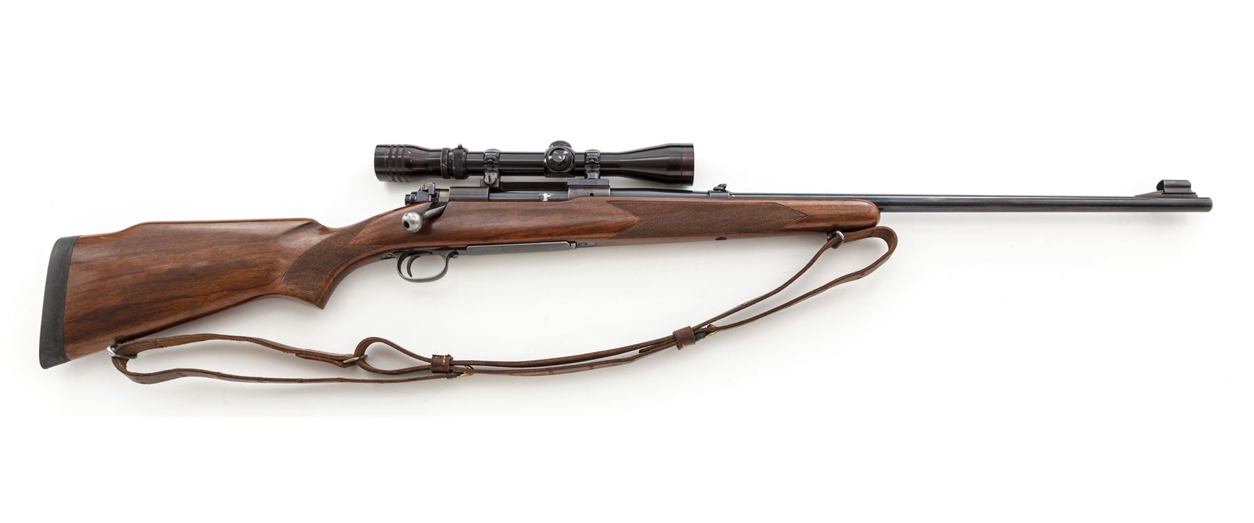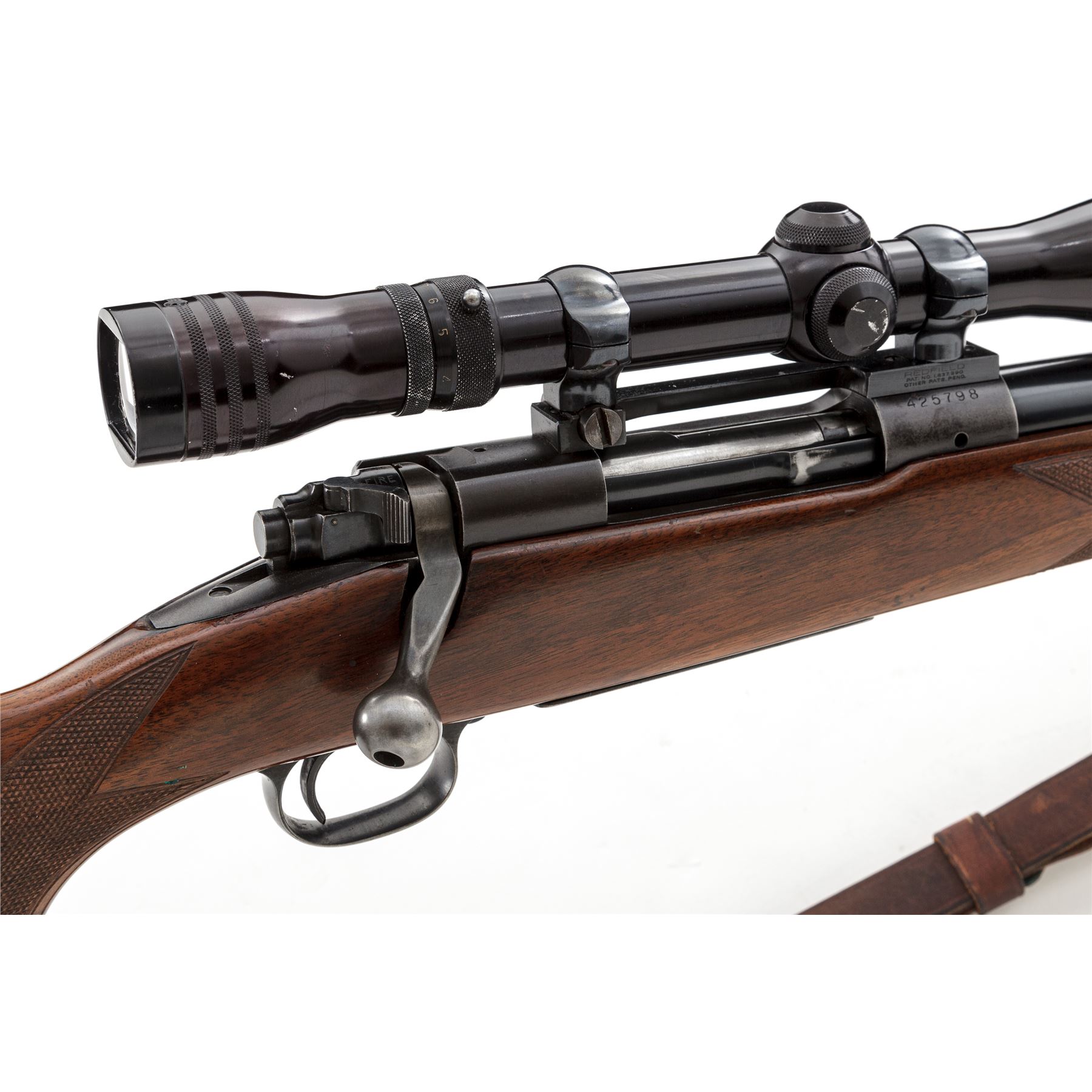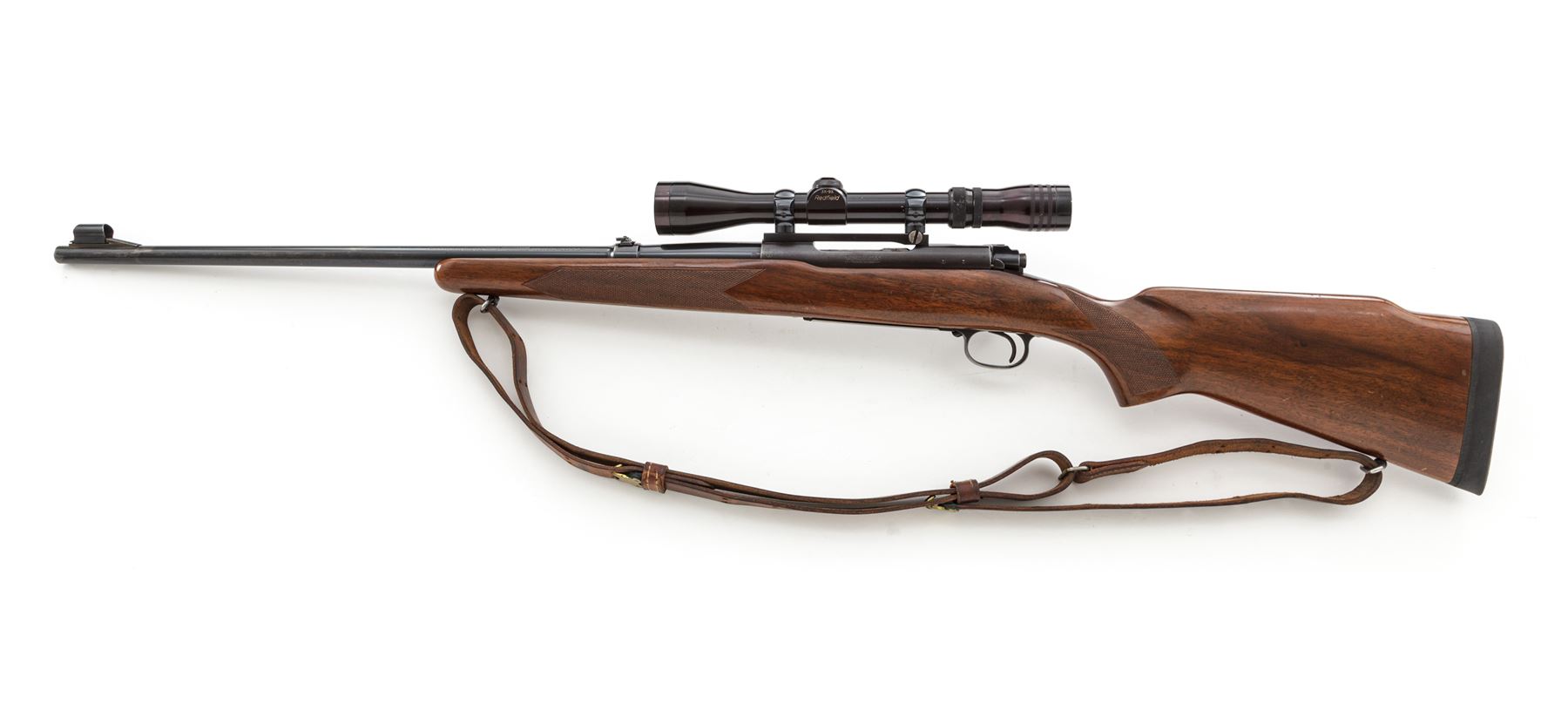 Pre-64 Winchester Model 70 Bolt Action Rifle, #425798, .243 cal., 24'' barrel, blue finish, one-piece checkered walnut stock with pistol-grip, Monte Carlo comb, black rubber Pachmayr ''Old English'' recoil pad, sling swivels, with 1'' leather sling; LOP over new pad is 13-5/8'', to end of wood 12-3/4''. Sights include a hooded silver bead front sight on ramped base and folding rear sight dovetailed into a integral barrel band. Topped with a Redfield Widefield 3-9x scope on Redfield mount; scope with duplex reticle and gloss black finish. Left side of barrel and receiver are both Winchester proofed. Mfg'd 1958. Metal is very good retaining approx. 80%-85% original thinning and toning blue; bolt handle has worn bright. Factory lettering is clear and defined. Stock rates as fine and retains approx. 90% of its varnish, wear to left side below the receiver accounts for most of the loss, with scattered small handling marks and other normal signs of field wear; checkering is crisp and excellent. Smooth action; clean bore with excellent rifling. Scope with minor handling marks to the exterior; optics are bright and clear. Est.: $600-$900. (C&R)