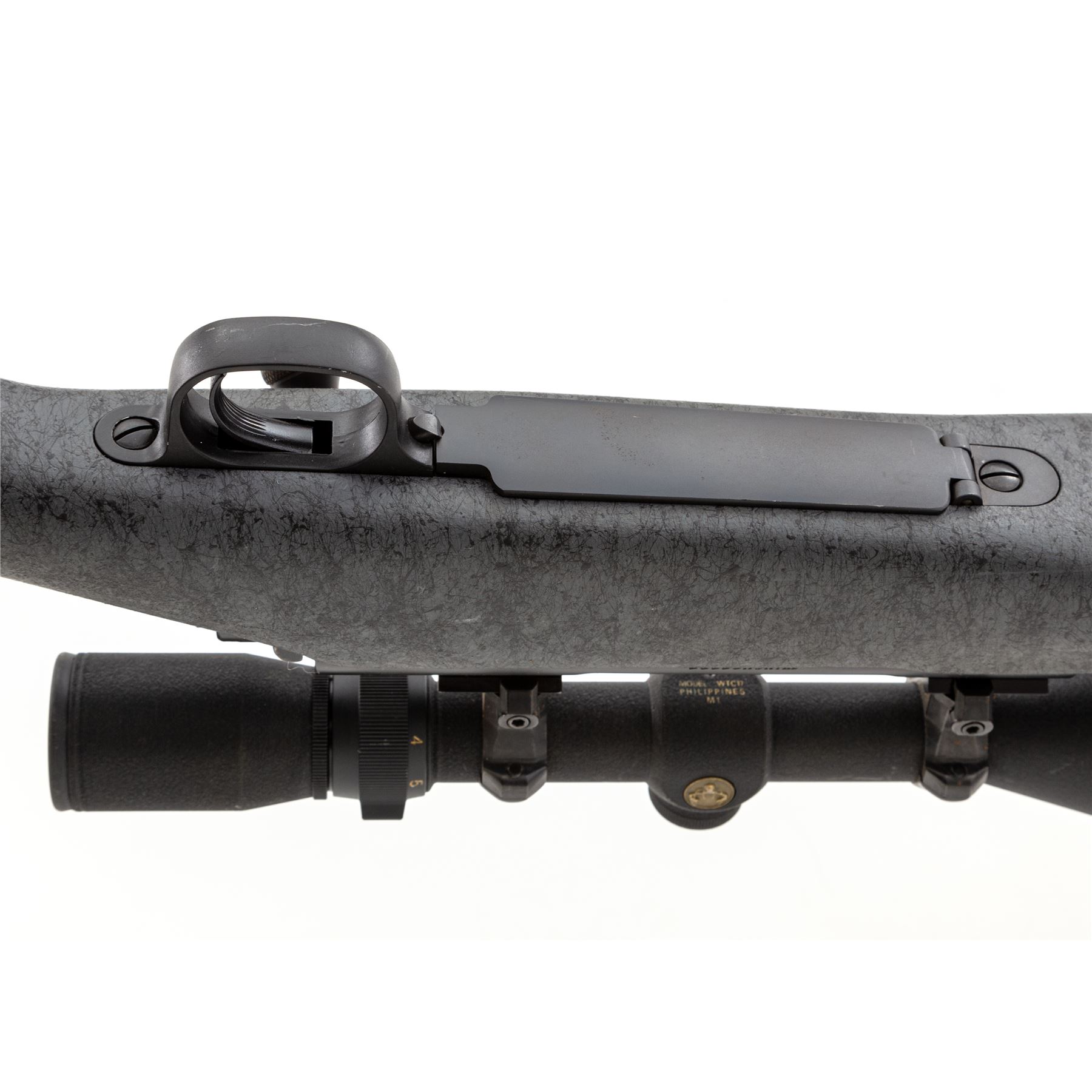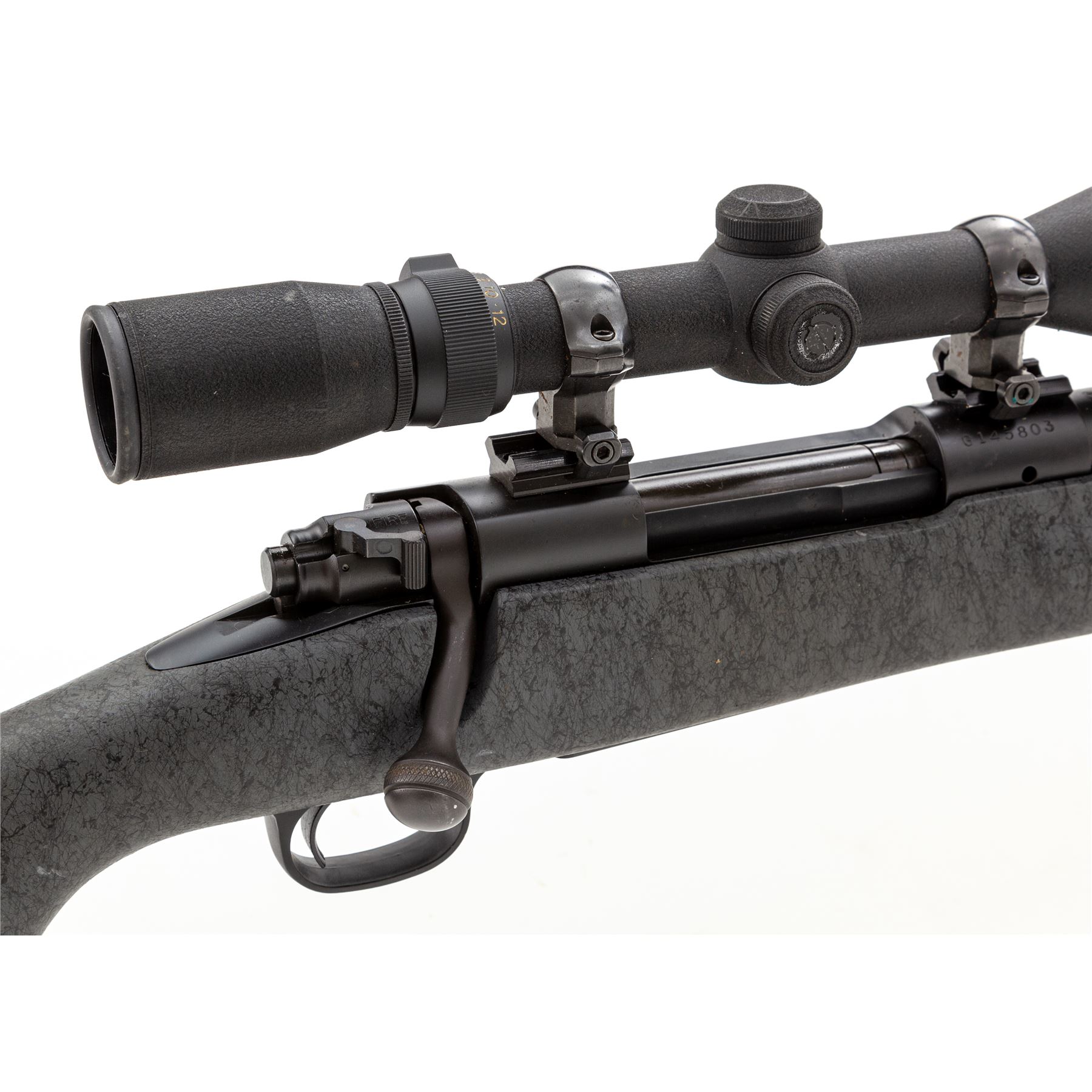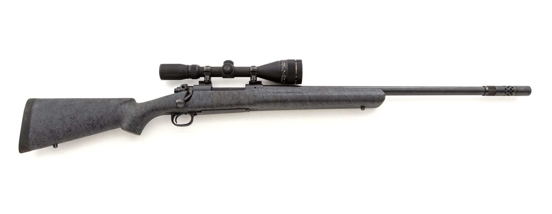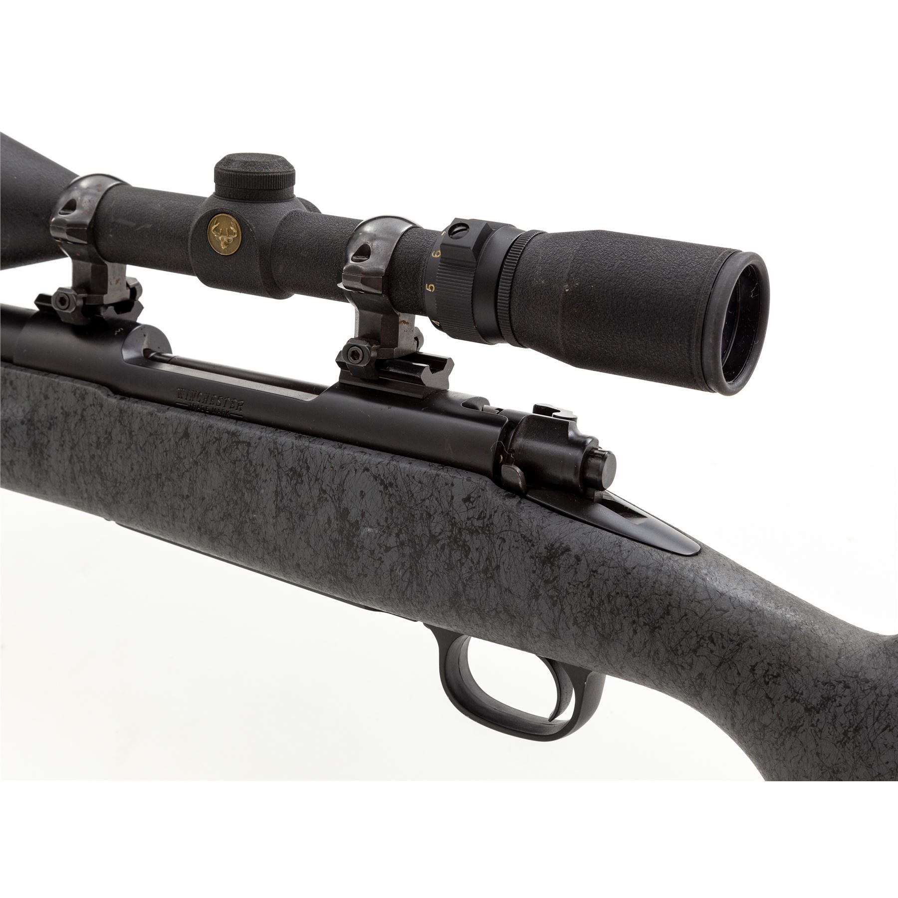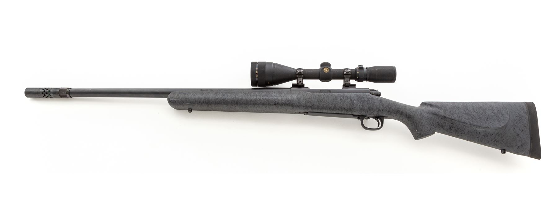 Winchester Model 70 Classic Laredo LRH Bolt Action Rifle, #G145803, .300 Win. mag. cal., 25.5'' overall barrel length with BOSS, matte finish; synthetic gray stock with black highlights, cheekpiece, straight comb, black rubber Winchester recoil pad, sling swivel studs. Mfg'd without sights, receiver is factory drilled and tapped for scope mount, with bolt-mounted safety. Topped with a Simmons Whitetail Classic 4-12x44mm scope; scope with duplex reticle, textured matte black finish. Rifle is in fine overall condition and retains approx. 97% original finish; barrel with light scuffs and scratches. Stock with a few moderate scuffs and small handling marks, mainly at the wrist and forend. Smooth action, bright bore with sharp rifling. Scope exterior with minor surface scuffs; optics are crystal clear. Est.: $600-$800. (Modern)