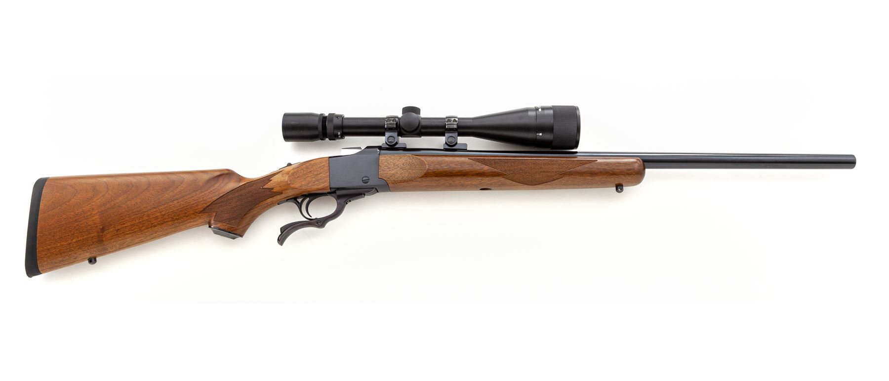 Ruger No. 1-V Varminter Single Shot Rifle, with Swift Scope, #133-85664, .22-250 cal., 24'' heavy barrel, blue finish, mfg'd without sights; barrel is factory drilled and tapped for scope bases, with checkered pistol-grip walnut stock and forend, factory black rubber Ruger pad with black spacer, Ruger grip cap, and sling swivel studs. Topped with a Swift 6-18x44mm scope; scope with fine crosshair reticle, satin black finish, and plastic lens covers. Rifle is in excellent as new overall condition, retaining approx. 99% factory blue finish with one quarter-inch long thin scratch on the left side of the barrel along the stock line. Wood with a few insignificant tiny handling marks, checkering is sharp and shows no visible wear. Crisp action, bright bore with excellent rifling, overall showing very little evidence of handling or use. Scope appears near new with a couple of slight handling marks to the exterior; optics are bright and clear. Est.: $700-$1,000. (Modern)