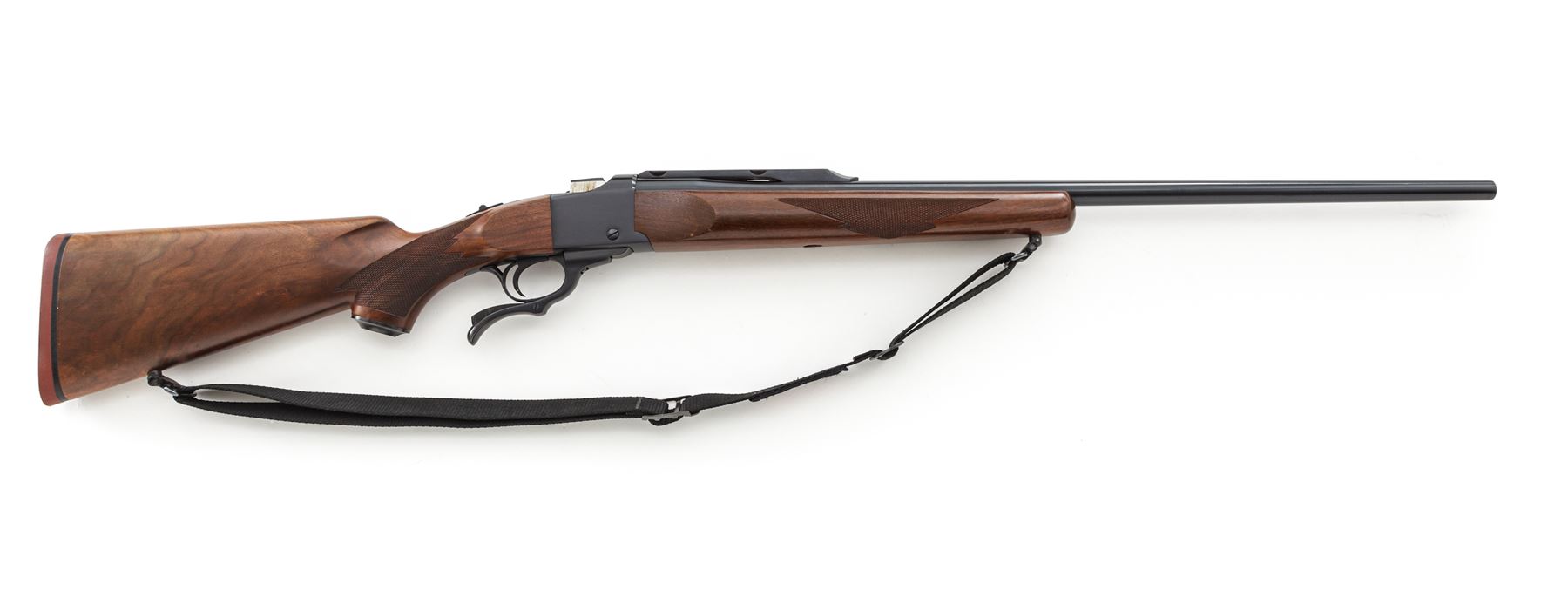 Ruger No. 1-B Single Shot Rifle, #132-66414, 6mm Rem. cal., 26'' barrel with quarter rib, blue finish; from the factory without sights. Checkered pistol-grip walnut stock with a semi-beavertail forend, factory red rubber pad with black spacer, Ruger grip cap, quick-release sling swivels, and 1'' black nylon Ruger sling. Mfg'd 1985. Metal surfaces are excellent, retaining approx. 98%+ original blue finish; lever and quarter rib with a few spots of minor edgewear; factory lettering is crisp and clear. Wood rates as fine, with a few scattered light handling and field marks, most notable being around the point of the comb. Grip checkering is excellent; forend checkering is mostly sharp with one dime-sized flat spot on the left side. Crisp action, bright bore with excellent rifling. Est.: $600-$800. (Modern)