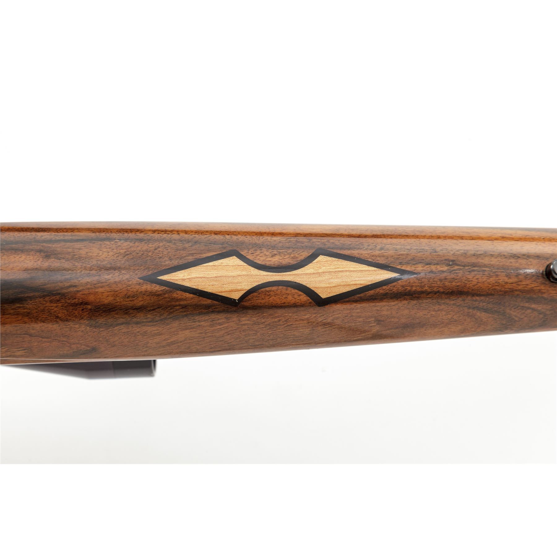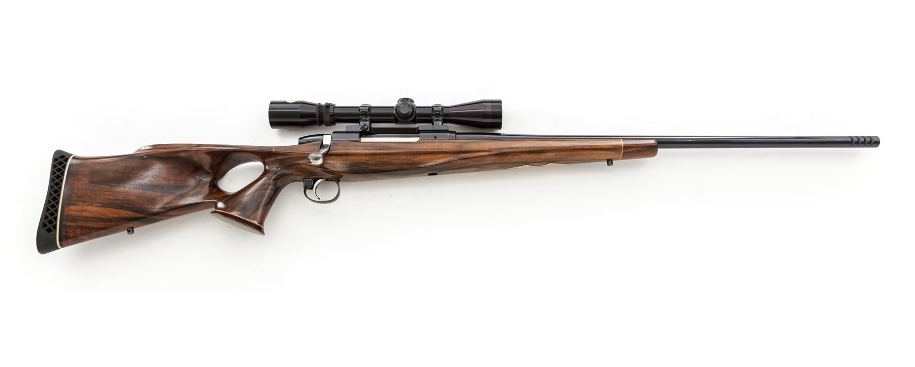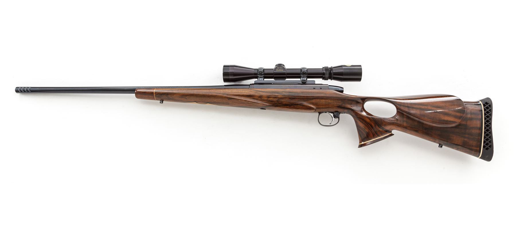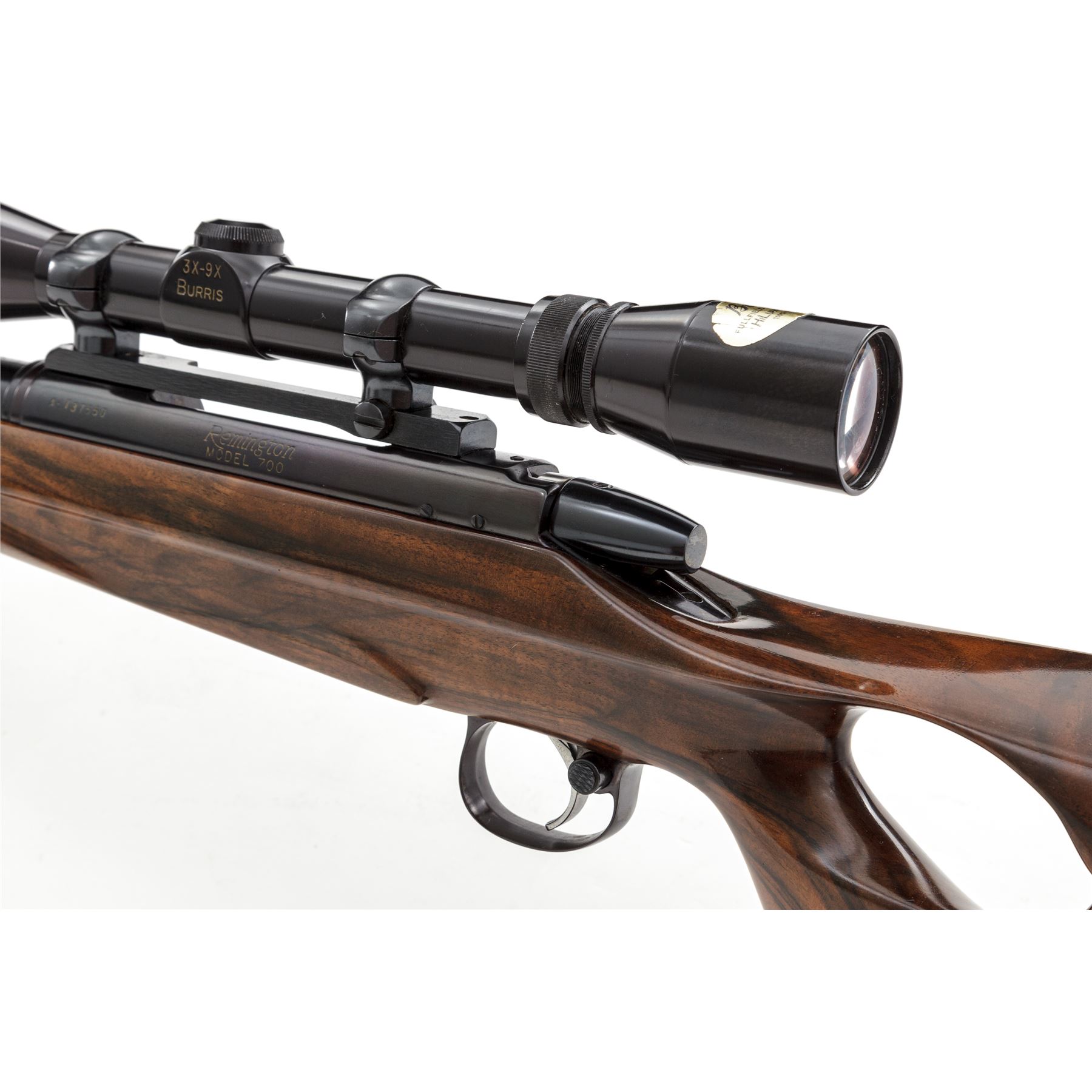 Custom Remington Model 700 Bolt Action Rifle, #A6737550, 7mm Rem. mag. cal., 24'' compensated barrel, blue finish, machine-turned bolt body, thumbhole pistol-grip cheekpiece English walnut stock, with rosewood forend and pistol-grip cap; black rubber butt pad. Topped with Redfield rings and mounts and Burris 3-9x40 scope. Custom triggerguard and button safety. Condition is excellent as modified, retaining approx. 98% of a later-accomplished high polish blue finish. Stock is excellent with only one minor impression at lower edge of thumbhole. Good light crisp action, mirror bright bore, clear scope optics. Est.: $750-$1,000. (Modern)