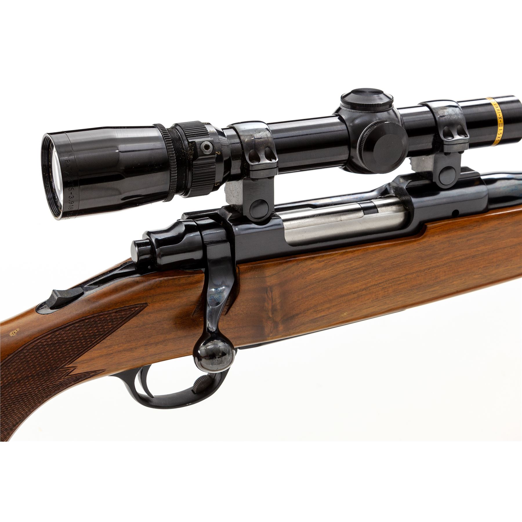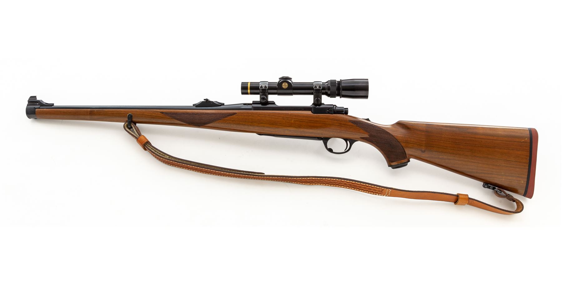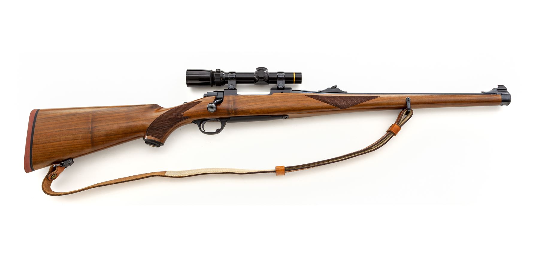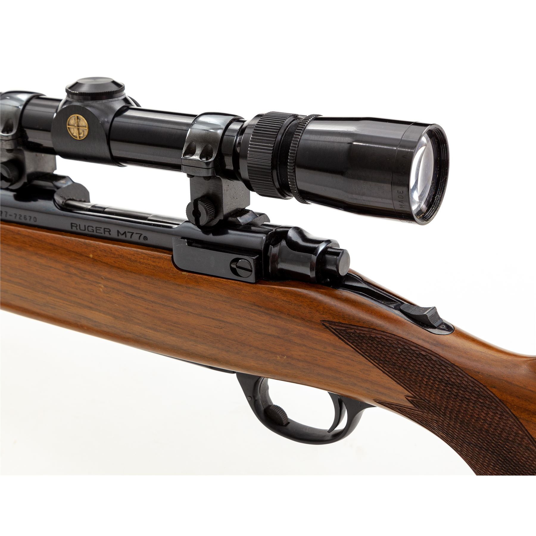 Ruger M77 RSI International Bolt Action Rifle, with Leupold Scope, #77-72670, .243 cal., 18.5'' barrel, blue finish, full-length walnut Mannlicher stock checkered at the wrist and forend, with Ruger grip cap, red rubber Ruger recoil pad with black spacer, sling swivels, and 1'' tooled leather Safariland sling. Open sights include a brass beaded blade front sight and folding rear sight, both mounted to fixed bases. Topped with a Leupold Vari-X III 1.5-5x scope on Ruger rings; scope with duplex reticle, 1'' tube, gloss black finish, and rubber lens covers. Mfg'd 1984. Approx. 98%+ factory blue finish remains. and metal surfaces are in excellent overall condition with only intermittent light handling marks. Stock is near excellent with few shallow scratches and signs of field wear, most noticeable being on the left side near the recoil pad and around the fluted comb; checkering is excellent showing little wear. Action is smooth, bright bore with sharp rifling. Sling appears as new. Scope with a few slight handling marks to the exterior; optics are clear. Est.: $500-$750. (Modern)