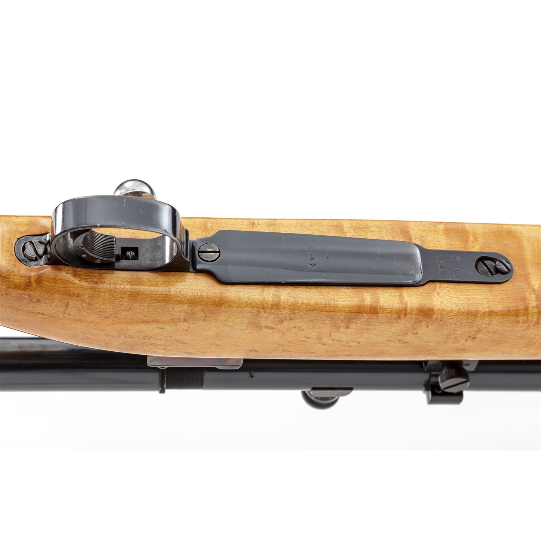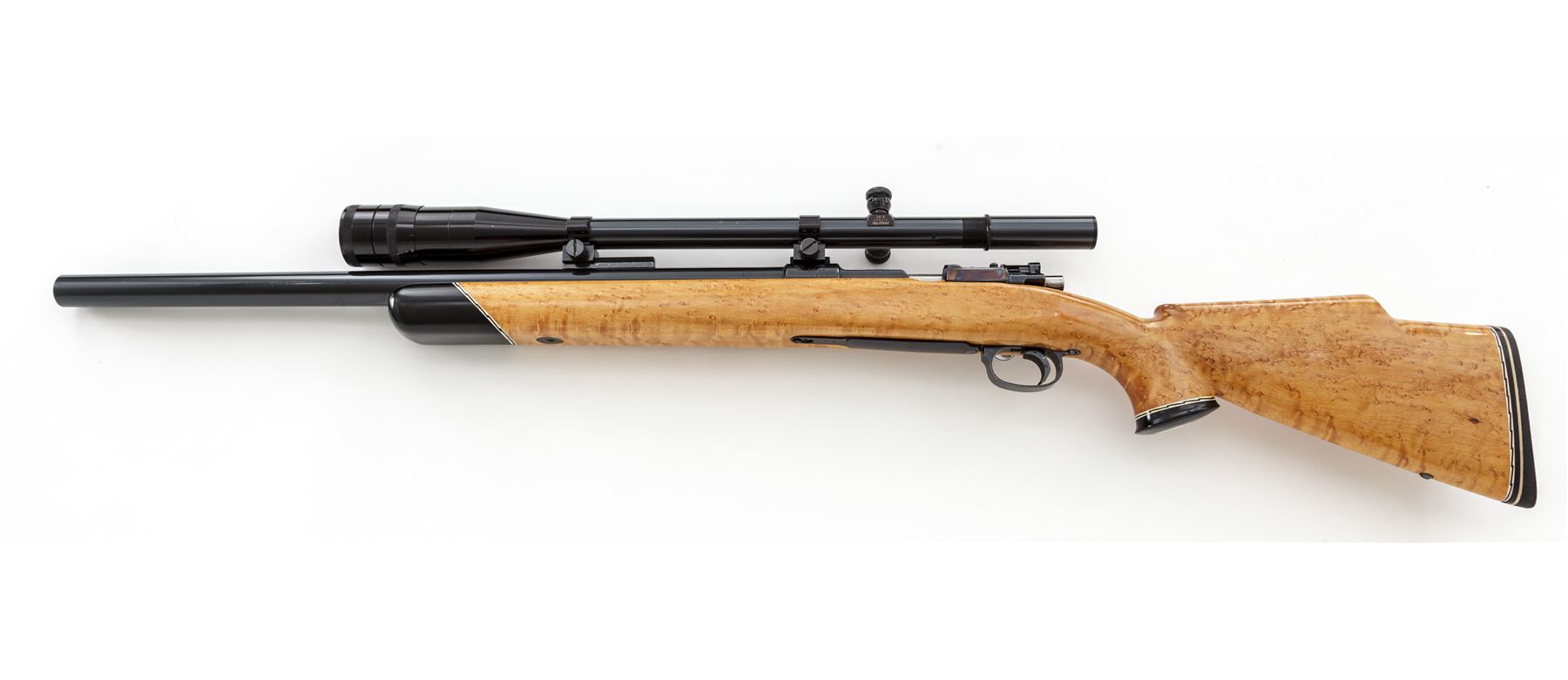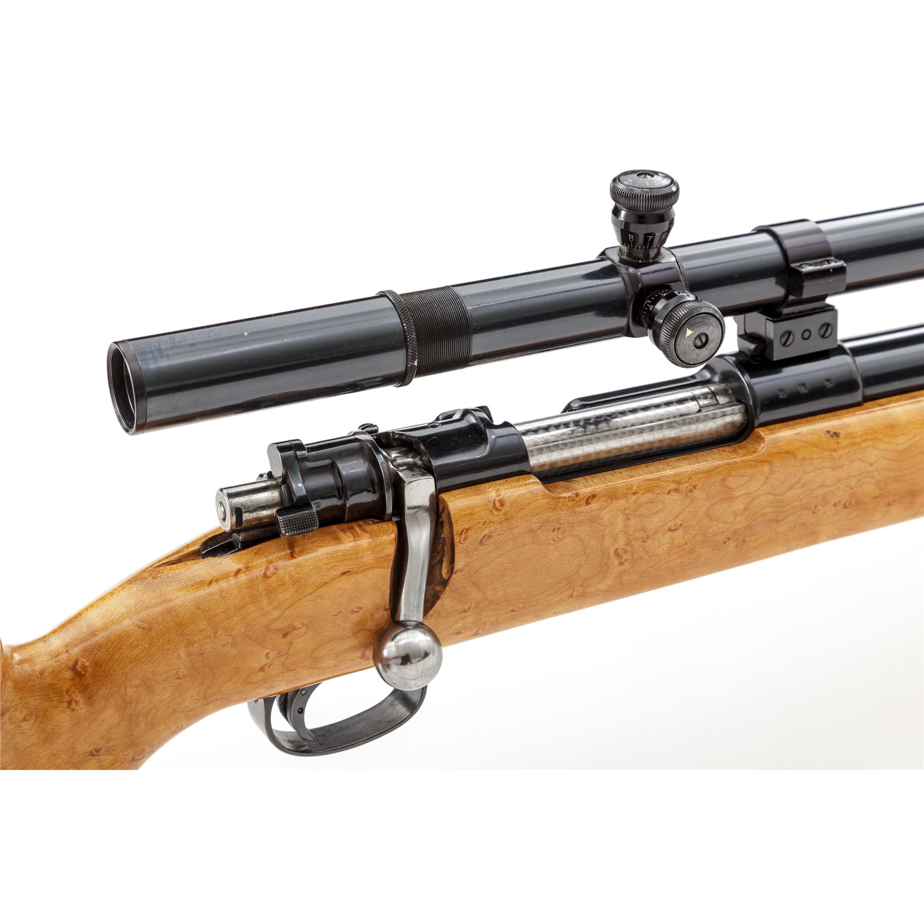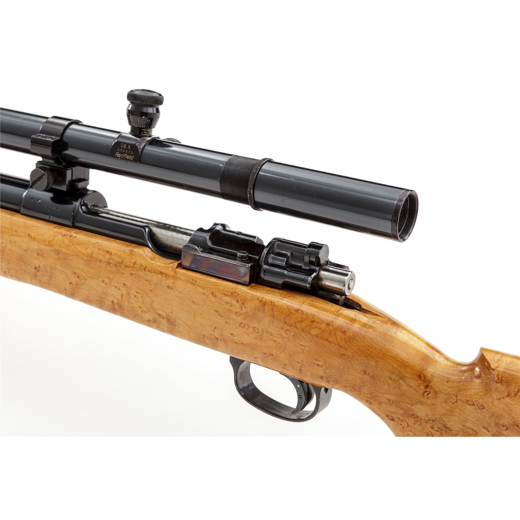 Custom Heavy Barrel Single Shot Bolt Action Target Rifle on Mauser 98 Action, #3548i, .22 Donaldson Wasp cal., 24'' heavy barrel that is only marked ''219 W''. Metal with a polished blue finish, bright bolt with jeweled body. Receiver with original military markings. Birdseye maple pistol-grip target stock with a Monte Carlo comb, cheekpiece, 2'' wide flat bottom forend, ebony forend and grip cap, with black rubber Pachmayr recoil pad; LOP is 13-3/8''. Current configuration is left hand cheekpiece with a right hand bolt. The original floorplate and triggerguard were used, some of the screws are replacements; trigger is adjustable. Redfield 16x40mm target scope is mounted to scope blocks on the receiver ring and rear potion of the barrel; scope measures 23.25'' overall with a fine crosshair with tiny target dot reticle, 1'' tube, and blue finish; black objective bell. This rifle is in excellent overall condition retaining approx. 97%-98% reblued finish; some of the original maker's marks, proofmarks, etc. are a little light. Nicely figured birdseye maple stock with only a few very minor handling marks. Smooth action, bright bore with excellent rifling. Scope retains most of its finish, exterior with scattered small scratches; optics are just a little cloudy around the edges and are otherwise clear, no visible chips or damage to the lens. Est.: $700-$900. (Modern)