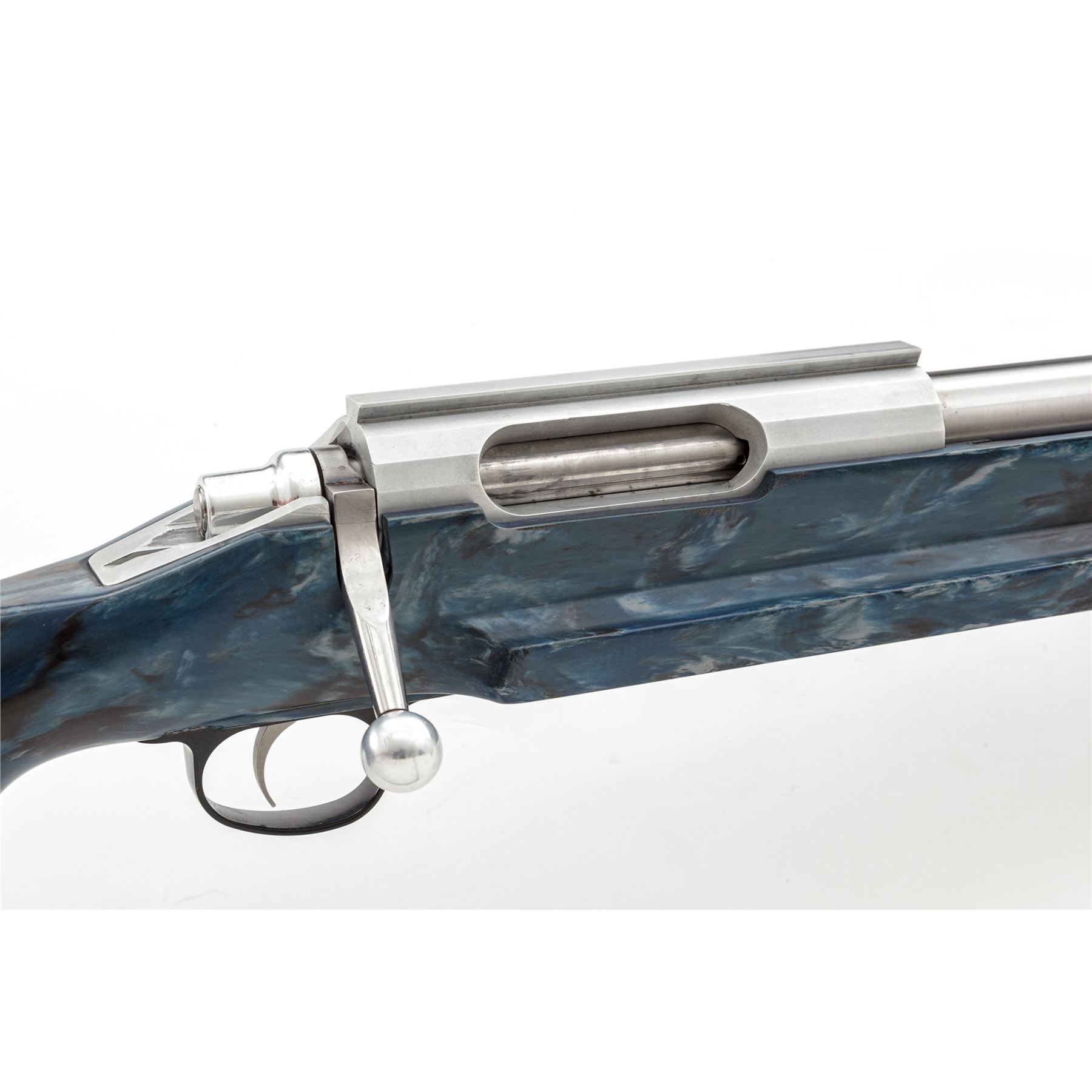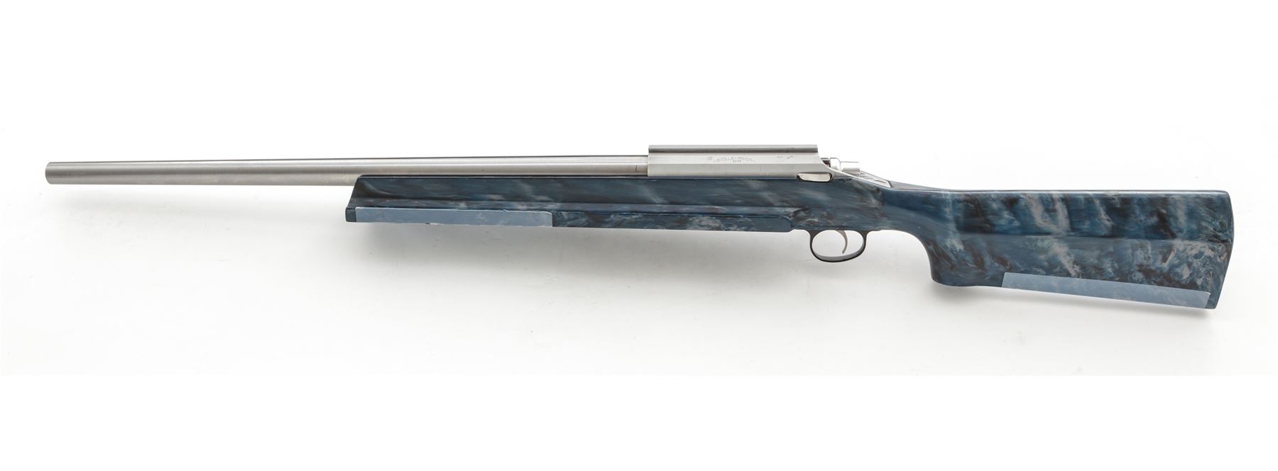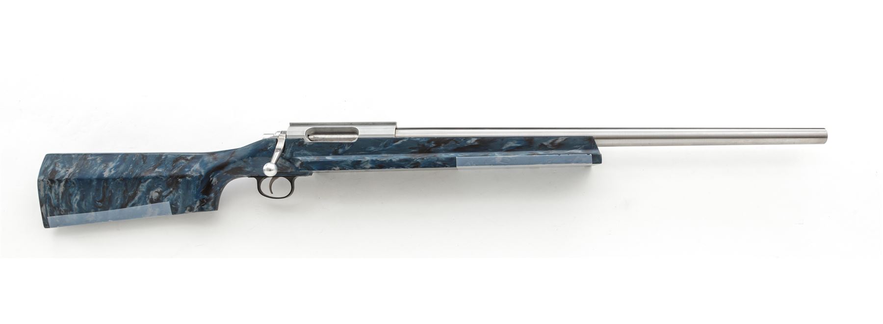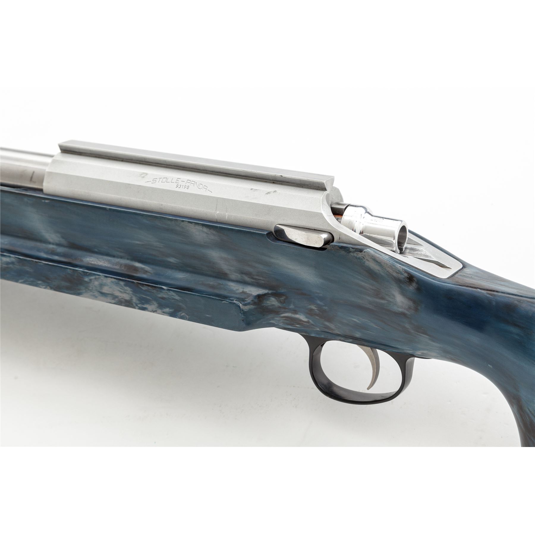 Custom Stolle Panda Action Single Shot Bolt Action Benchrest Rifle, #93198, 6mm PPC caliber. 24'' stainless heavy barrel marked on the left side near the receiver ''6 PPC .262 NK'', aluminum Stolle Right bolt, right port Panda action with integral dovetailed base measures 8.5'' overall; left side marked ''-STOLLE-PANDA-/93198''; no safety. Blue/white/black fiberglass benchrest stock with a 3'' wide flat forend; buttstock with an approx. half-inch hollow cavity that is filled with a threaded brass plug, with adjustable trigger. Other than the barrel, everything on this rifle is built light including the aluminum bolt shroud, stock hardware, and black composite triggerguard. In fine overall condition, this rifle shows typical evidence of moderate range use. Metal surfaces with intermittent light scuffs and handling marks, factory lettering is clear. Stock with a semi-transparent protective film on the lower edge of the forend and buttstock; stock also shows signs of normal range marks with a few more noticeable but still small dents to the right of the triggerguard. Rear triggerguard screw is missing. Action functions properly with a smooth and light trigger pull; bore is clean with excellent rifling. Est.: $1,000-$1,500. (Modern)