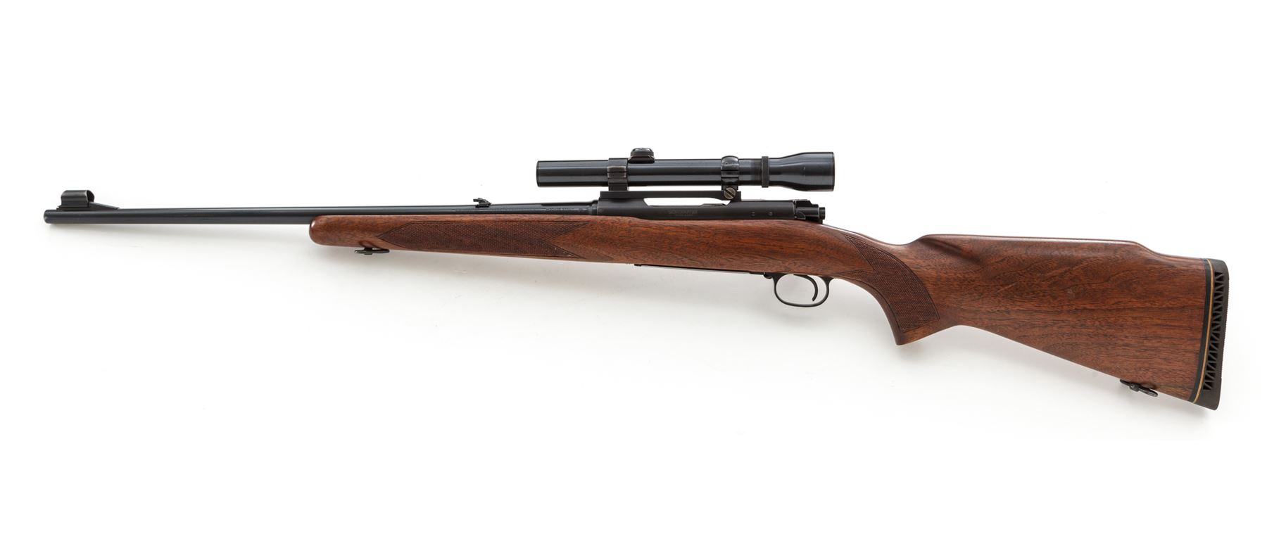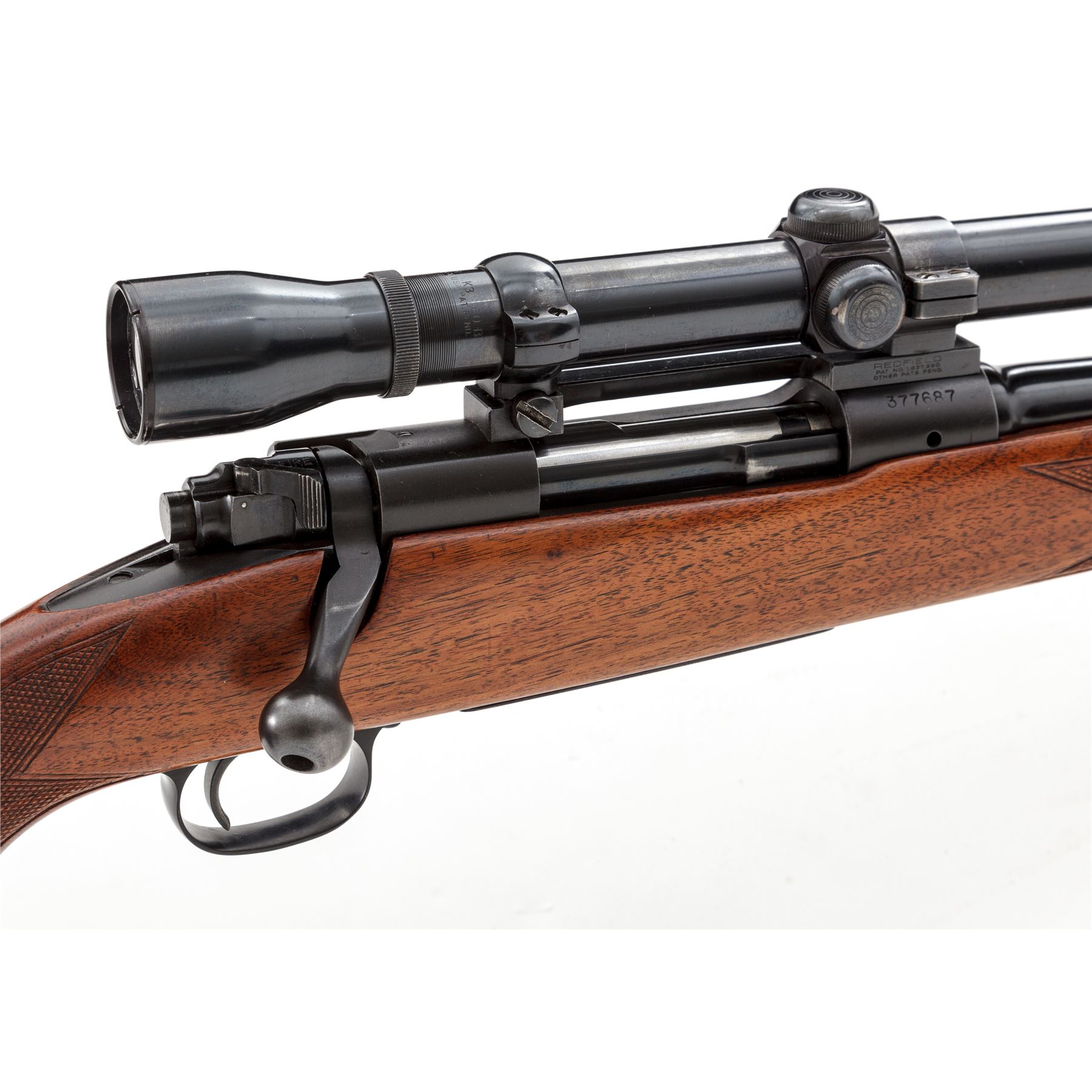 Pre-64 Winchester Model 70 Featherweight Bolt Action Rifle, #377687, .30-06 cal., 22'' barrel, blue finish, hollow bolt handle, aluminum floorplate and triggerguard, one-piece checkered walnut stock with Monte Carlo comb, pistol-grip, and sling swivels; LOP over vented black rubber Pachmayr recoil pad is 13-1/2''; end of wood 12-3/4''. Sights include a hooded silver bead front sight on ramped base and folding rear sight. Topped with a Weaver K3 scope on Redfield mount; scope with fine crosshair reticle and blue finish. Left side of barrel and receiver are both Winchester proofed. Mfg'd 1956. Condition is fine retaining approx. 95% original blue, with most of the losses to bolt handle, muzzle, extractor; aluminum floorplate shows thinning and toning. Factory lettering is clear and defined. Stock retains 90%+ of its original varnish, with scattered scuffs and scratches, checkering with some light wear. Smooth action; bright, clean bore with excellent rifling. Scope with some small scratches to the exterior; optics are clear. Est.: $600-$900. (C&R)