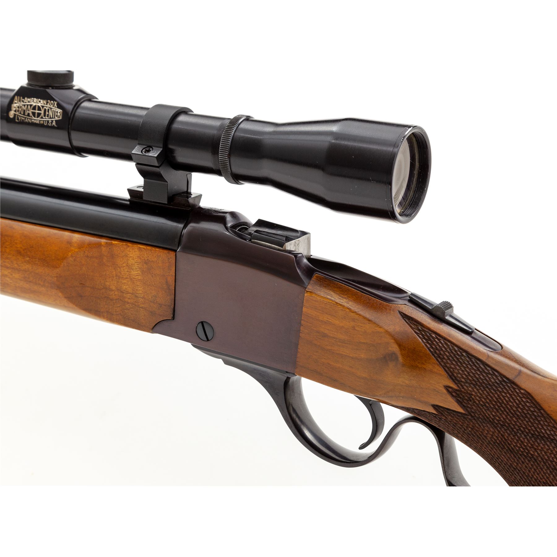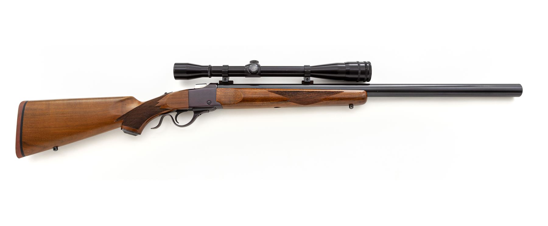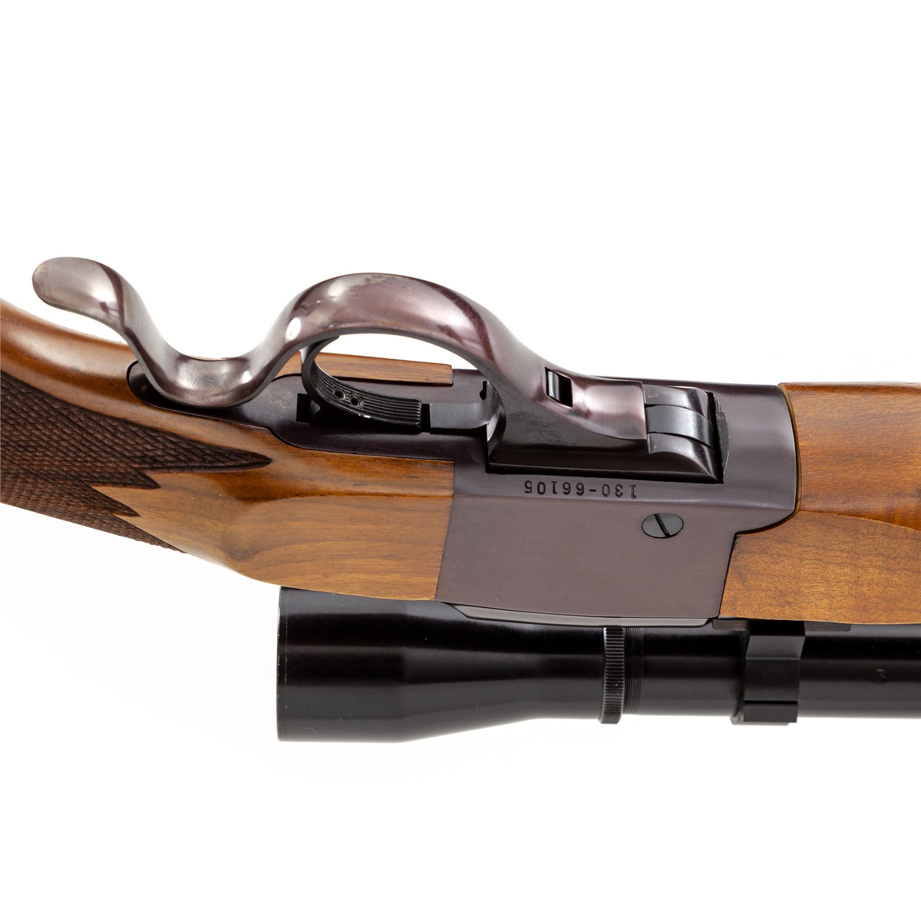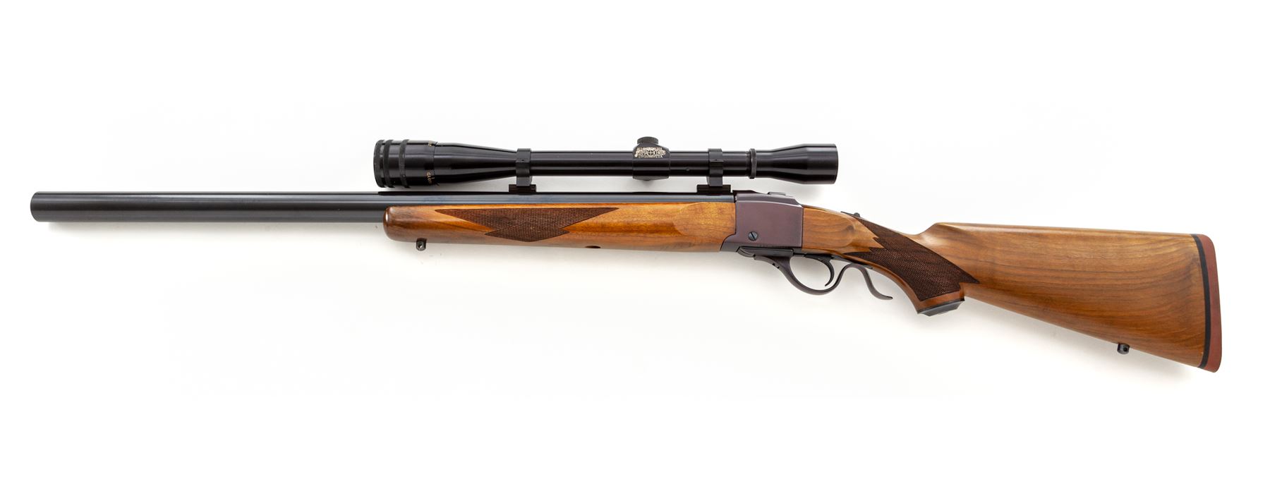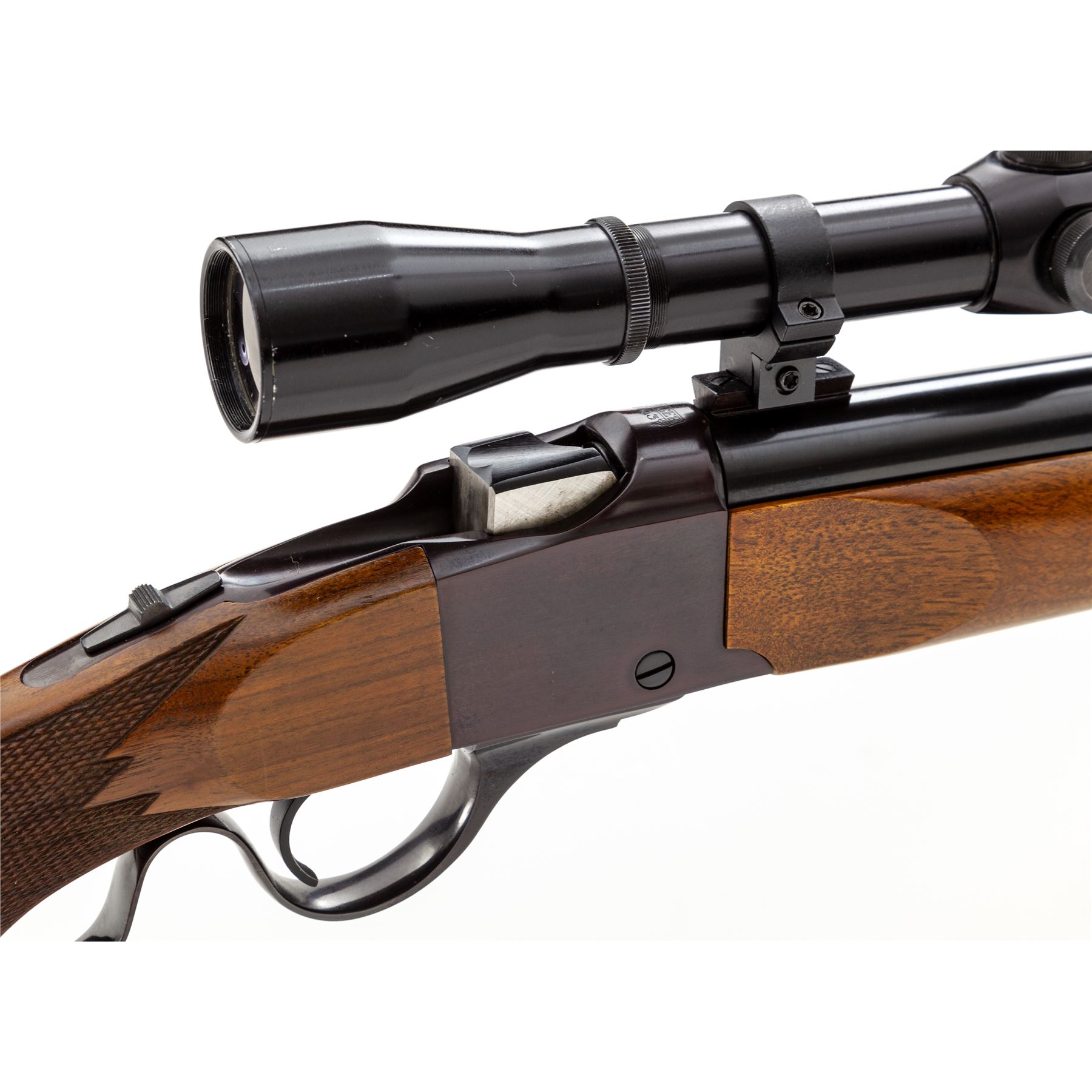 Custom Ruger No. 1 Single Shot Rifle, with Lyman Scope, #130-66105, .25-35 cal., 27'' unmarked extra heavy barrel, blue finish; checkered pistol-grip walnut stock and forend, factory red rubber Ruger pad with black spacer, Ruger grip cap, and sling swivel studs. Topped with a Lyman All-American 20X Perma Center scope; scope with fine crosshair reticle, and gloss black finish. Metal surfaces are excellent, retaining approx. 99% original blue finish, frame with mild even plum colored toning; factory lettering is crisp and clear. Wood rates as near excellent, with a few scattered moderate handling and field marks, most notable around the tip of the forend and toe of buttstock. Grip and forend checkering is sharp. Crisp action, bright bore with excellent rifling. Scope with only a few very minor marks to the exterior; optics are clean and clear. Est.: $800-$1,000. (Modern)