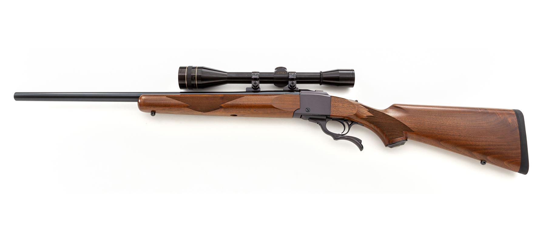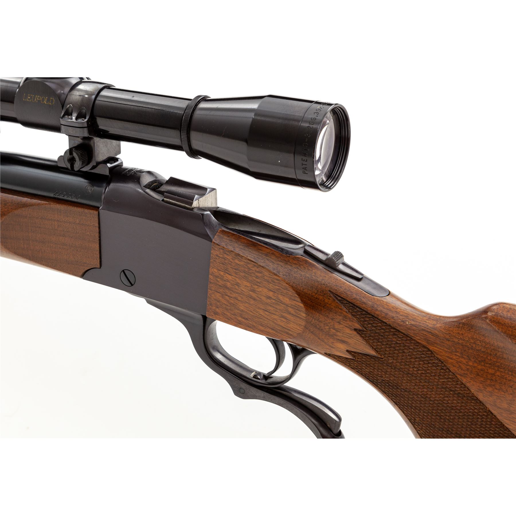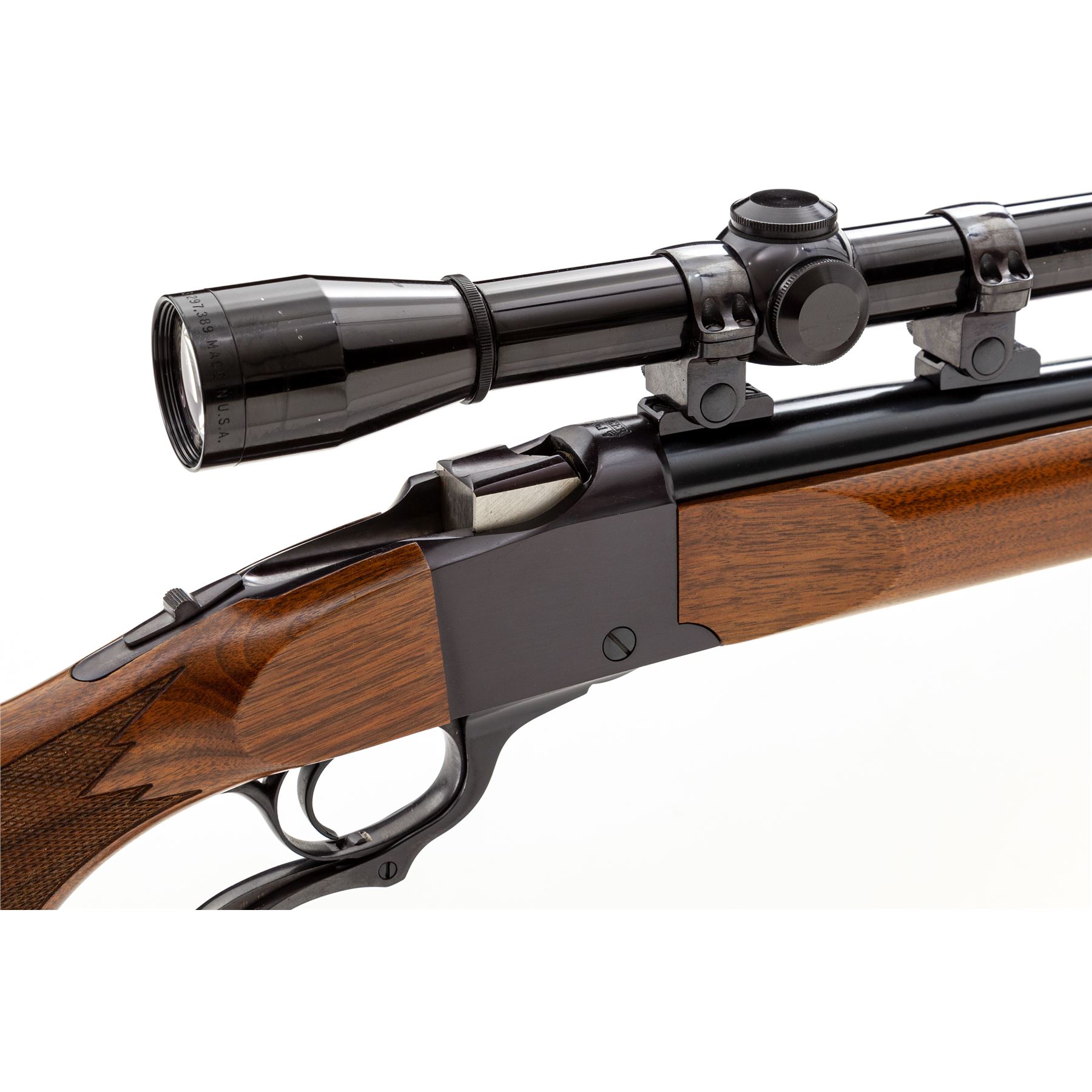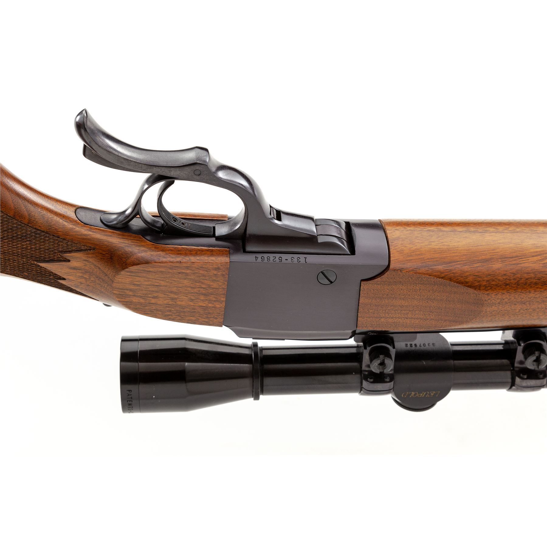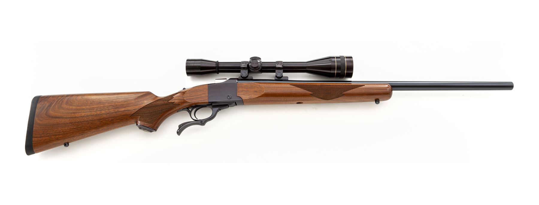 Ruger No. 1-V Varminter Single Shot Rifle, with Leupold Scope, #133-52864, .223 cal., 24'' heavy barrel, blue finish, mfg'd without sights, barrel is factory drilled and tapped for scope bases; checkered pistol-grip walnut stock and forend, factory black rubber Ruger pad with black spacer, Ruger grip cap, and sling swivel studs. Topped with a Leupold 12x40mm scope; scope with a fine duplex reticle, 1'' tube, and gloss black finish. Metal surfaces are excellent, retaining approx. 98%+ original blue finish; frame has toned to a light plum color; factory lettering is crisp and clear. Wood rates as fine, with a few scattered handling and field marks, most notable being around the point and flutes of the comb. Grip and forend checkering is clean and sharp. Crisp action, bright bore with excellent rifling. Scope with light ring marks to the exterior; optics are crystal clear. Est.: $800-$1,000. (Modern)