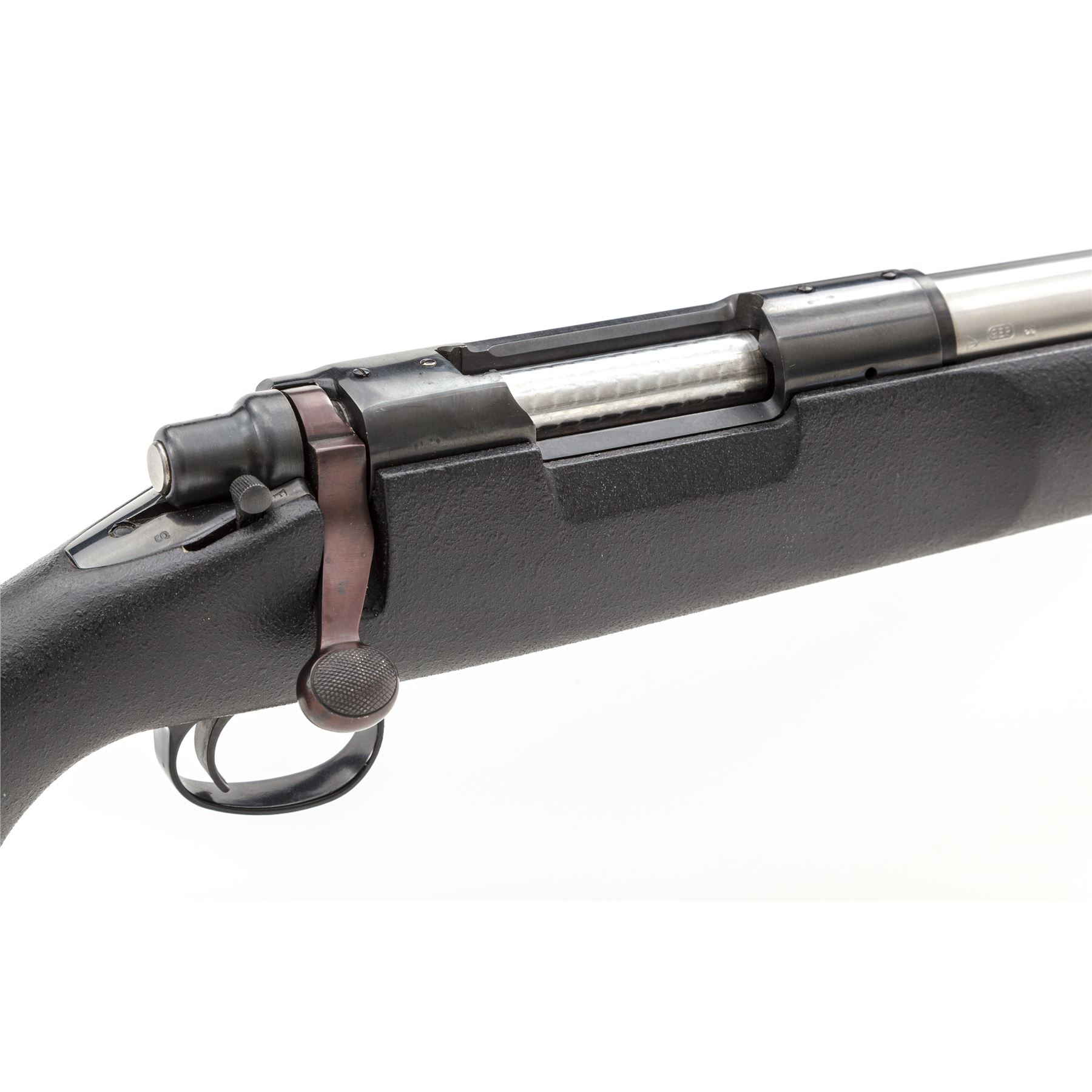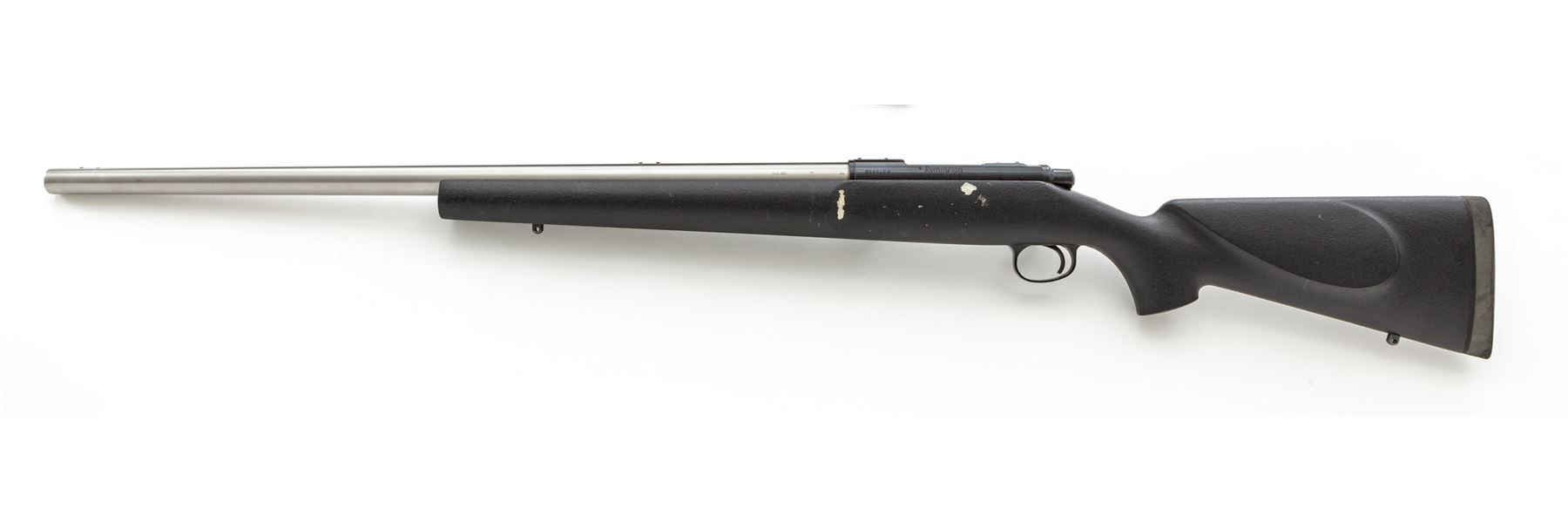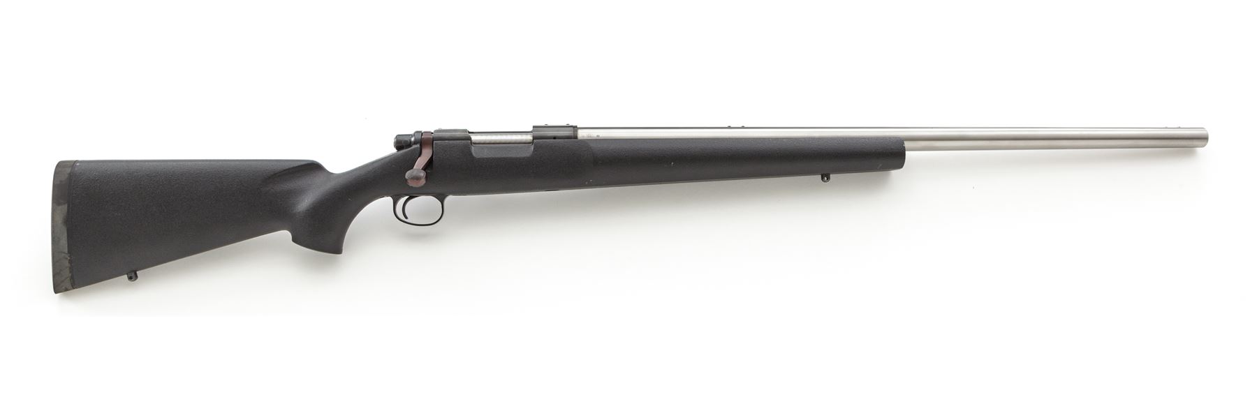 Remington Model 40-X Centerfire Bolt Action Rifle, #058812B, chambered in 6mm Rem. caliber. 27'' heavy stainless barrel is factory drilled and tapped for sights; blued receiver is also factory drilled and tapped. Synthetic black pistol-grip stock with cheekpiece, black rubber Remington recoil pad, and sling swivel studs. Metal is excellent showing just light handling marks. Receiver retains approx. 99% blue finish with a few tiny impressions to the rear top that may be from previous scope base; factory lettering is clear. Left side of stock with a few spots of black finish loss, otherwise in fine condition, with intermittent light marks from handling. Smooth action functions properly; bore is excellent. Rare in this caliber. Est.: $700-$900. (Modern)