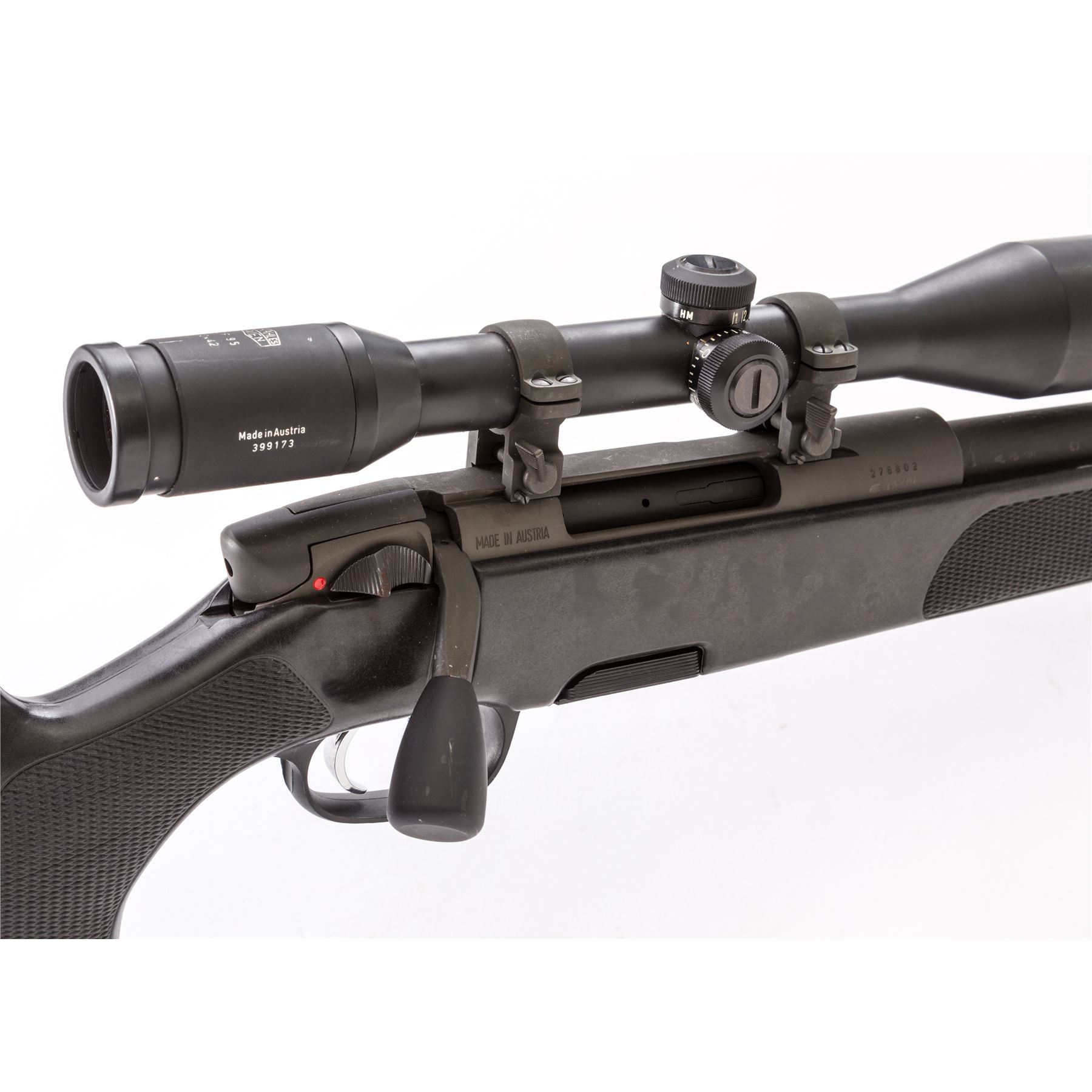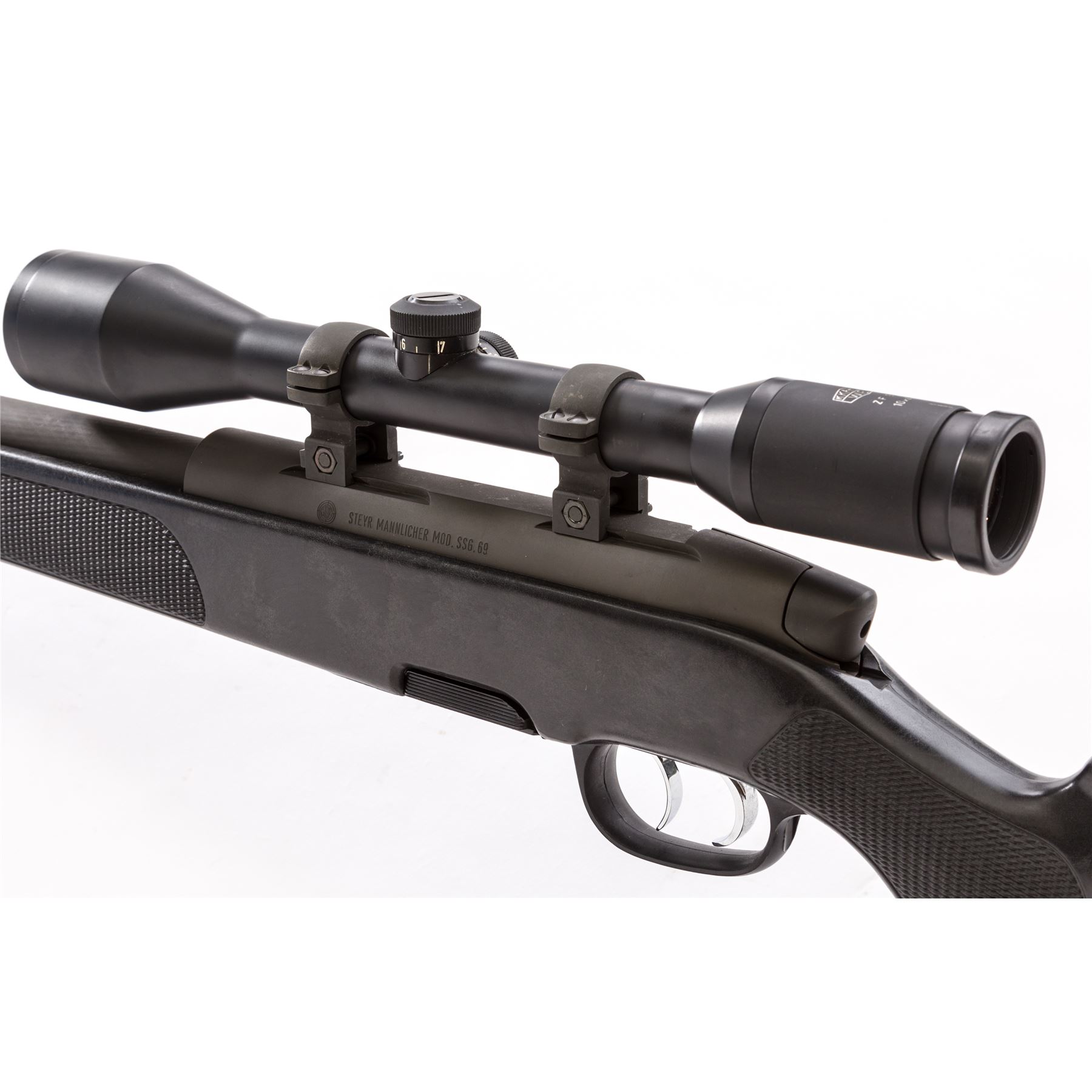Steyr Model SSG.69 Bolt Action Sniper Rifle, #276802, .308 cal., 20'' barrel, phosphate finish, factory checkered black ABS Cycolac synthetic stock, double set triggers, with bipod, three (3) 5-rd. and two (2) 10-rd. factory magazines. Topped with a K. Kahles 10x42 VF95 scope with duplex range dot reticle, on quick-detachable Steyr rings. Condition is excellent showing little use. Stock with very light scuffs. Bottom of stock factory grooved for bi-pod. Good crisp action, bore is mirror bright. Scope optics are clear. Est.: $1,800-$2,400. (Modern)