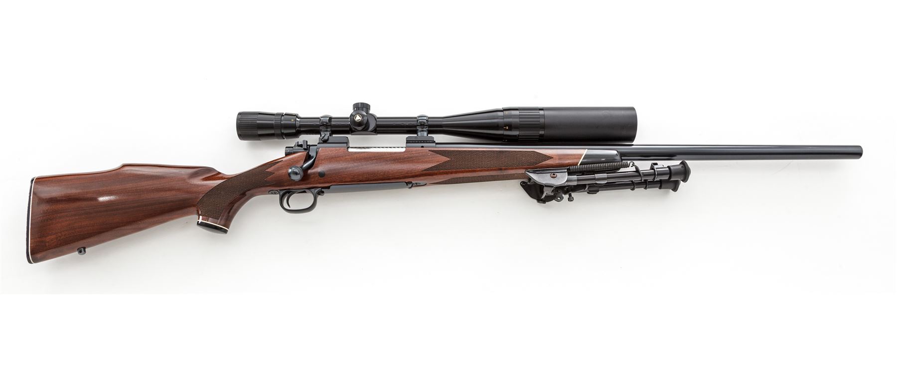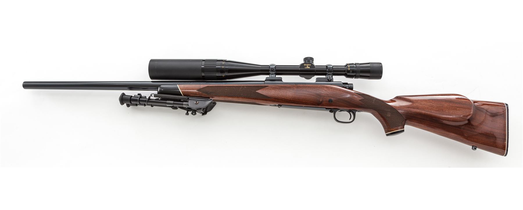 Winchester Model 70 XTR Bolt Action Rifle, with Bausch & Lomb Scope, #G1454588, .222 Rem. cal., 24'' heavy barrel, blue finish, barrel is drilled and tapped for sights, bolt mounted safety; one-piece walnut Monte Carlo cheekpiece stock is checkered at the forend and pistol-grip with a gloss finish, black plastic Winchester buttplate, ebony forend and grip cap, rear swivel stud, Harris ultra-light 1A2 bi-pod. Topped with a Bausch & Lomb 6-24x40mm scope on Redfield mounts; scope with duplex reticle, gloss black finish, 5'' sunshade, and plastic lens covers. Metal appears near new and retains approx. 98%+ original blue, with a few scattered slight handling marks; factory lettering is crisp and clear. Stock rates about fine and retains nearly all of its semi-gloss finish; left side below the receiver with an area of shallow pressure marks that are really only visible when the rifle is held at a 45-degree angle; left side grip checkering with a dime-sized flat spot; otherwise, stock with only minor handling marks. Action is smooth and functions properly; bright, clean bore. Scope is also excellent with light scope ring marks to the exterior; optics are bright and clear. Est.: $700-$900. (Modern)