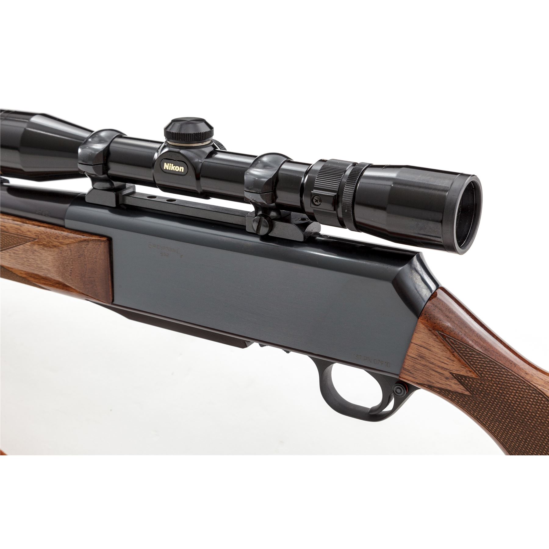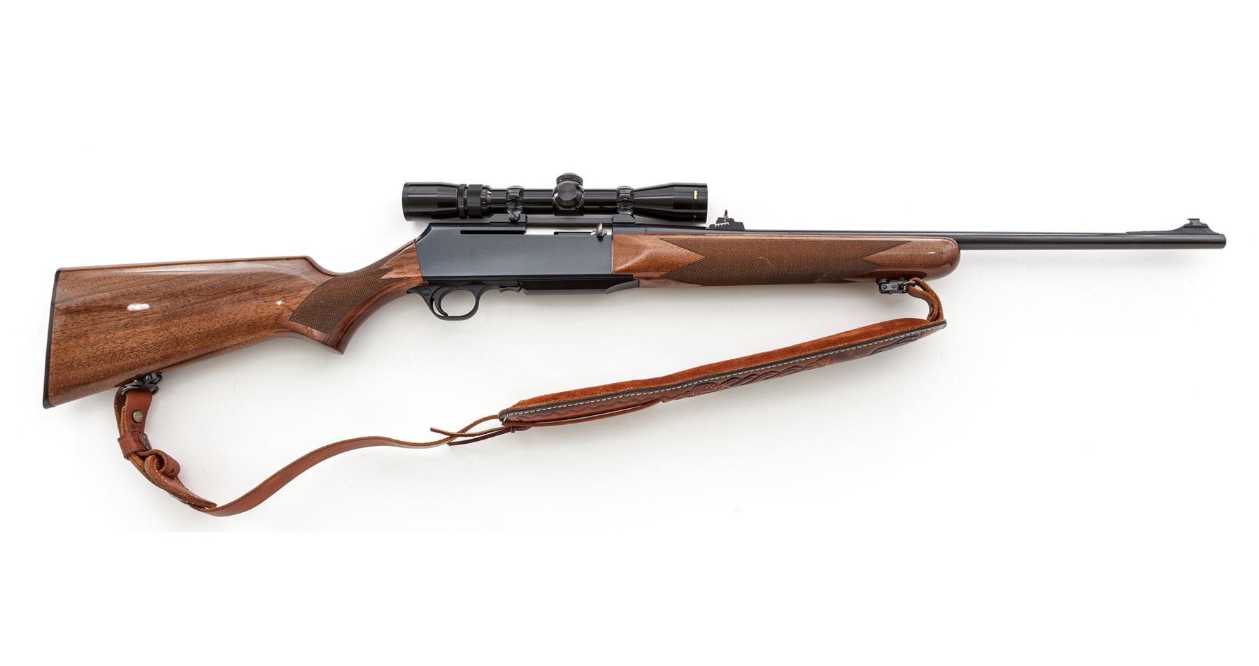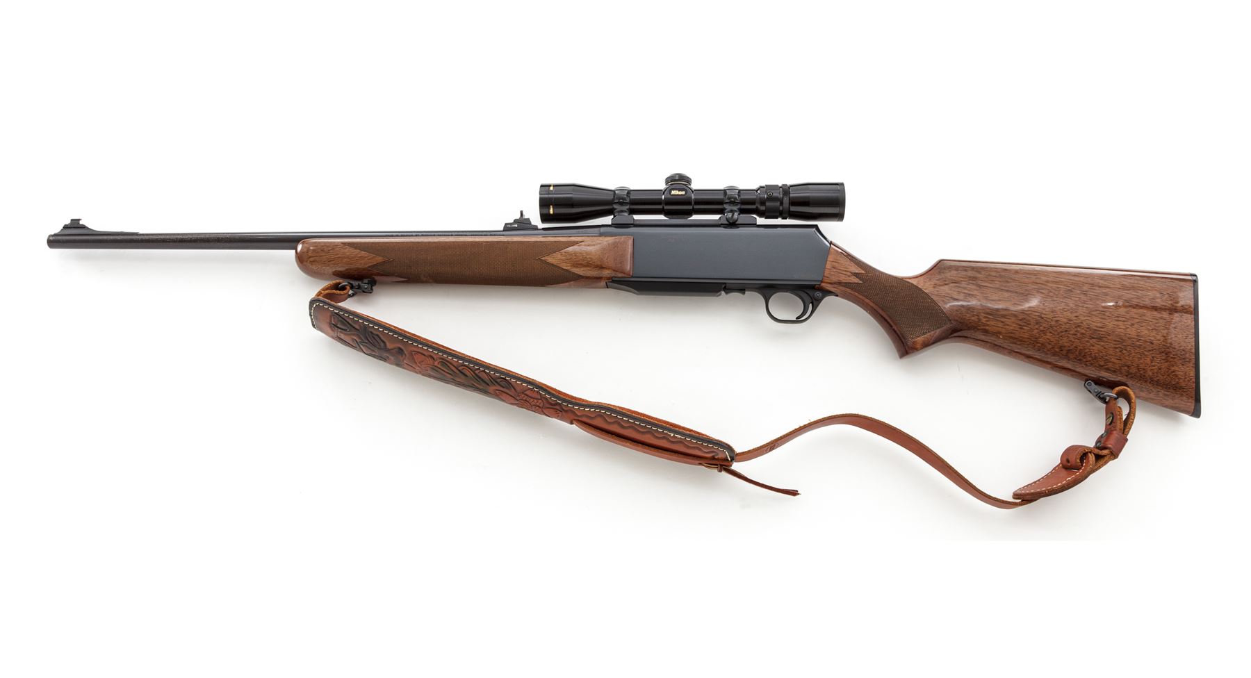 Browning BAR Semi-Automatic Rifle, #137PN07910, .30-06 cal., 22.5'' barrel, blue finish, checkered mahogany stock, with Williams rear and bright bead front sight, and brown padded and tooled leather sling. Topped with Nikon 2-7x32 scope on Redfield rings and mounts. Made in Belgium, assembled in Portugal. Condition is excellent, appearing nearly new. Left side forward portion of barrel with very light markings running approx. 8'' from muzzle back. Stock with several pressure dings in pistol-grip area, one which is thru the finish. Good action, mirror bright bore, clear optics. Est.: $600-$800. (Modern)