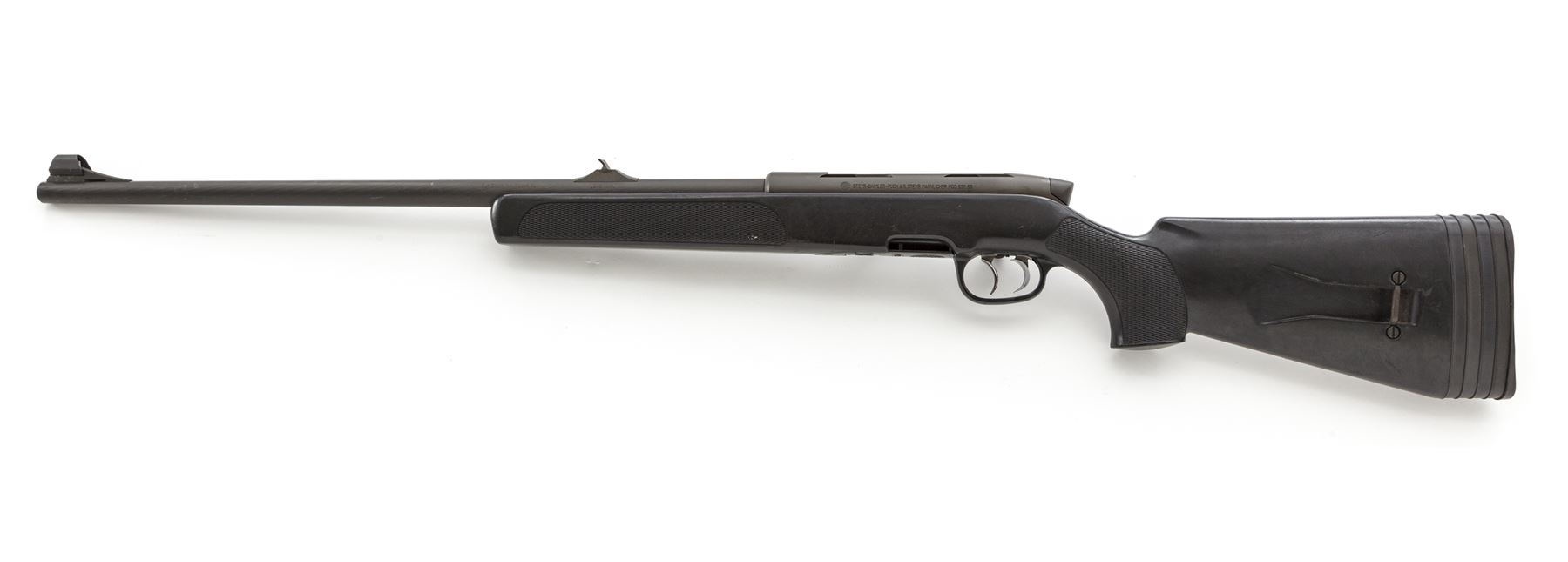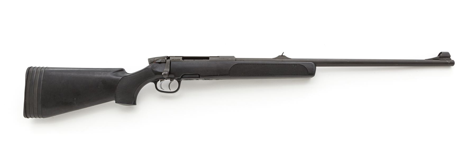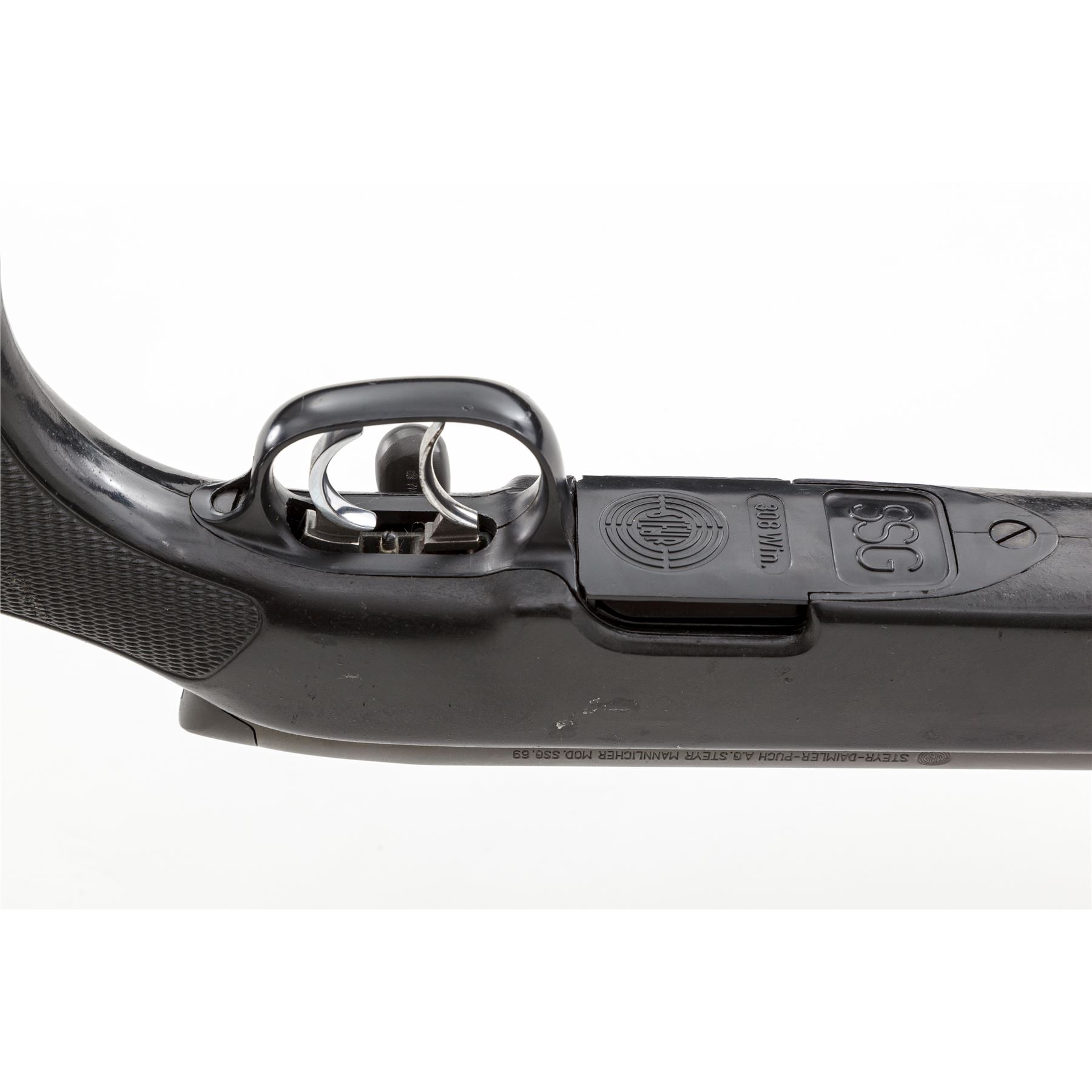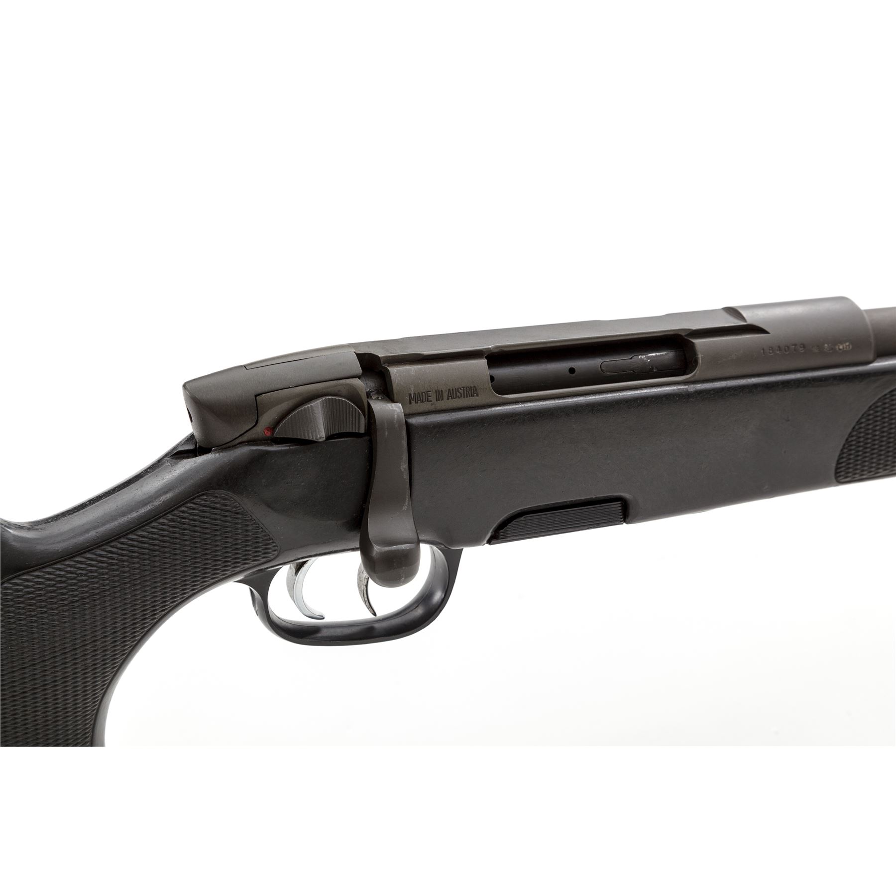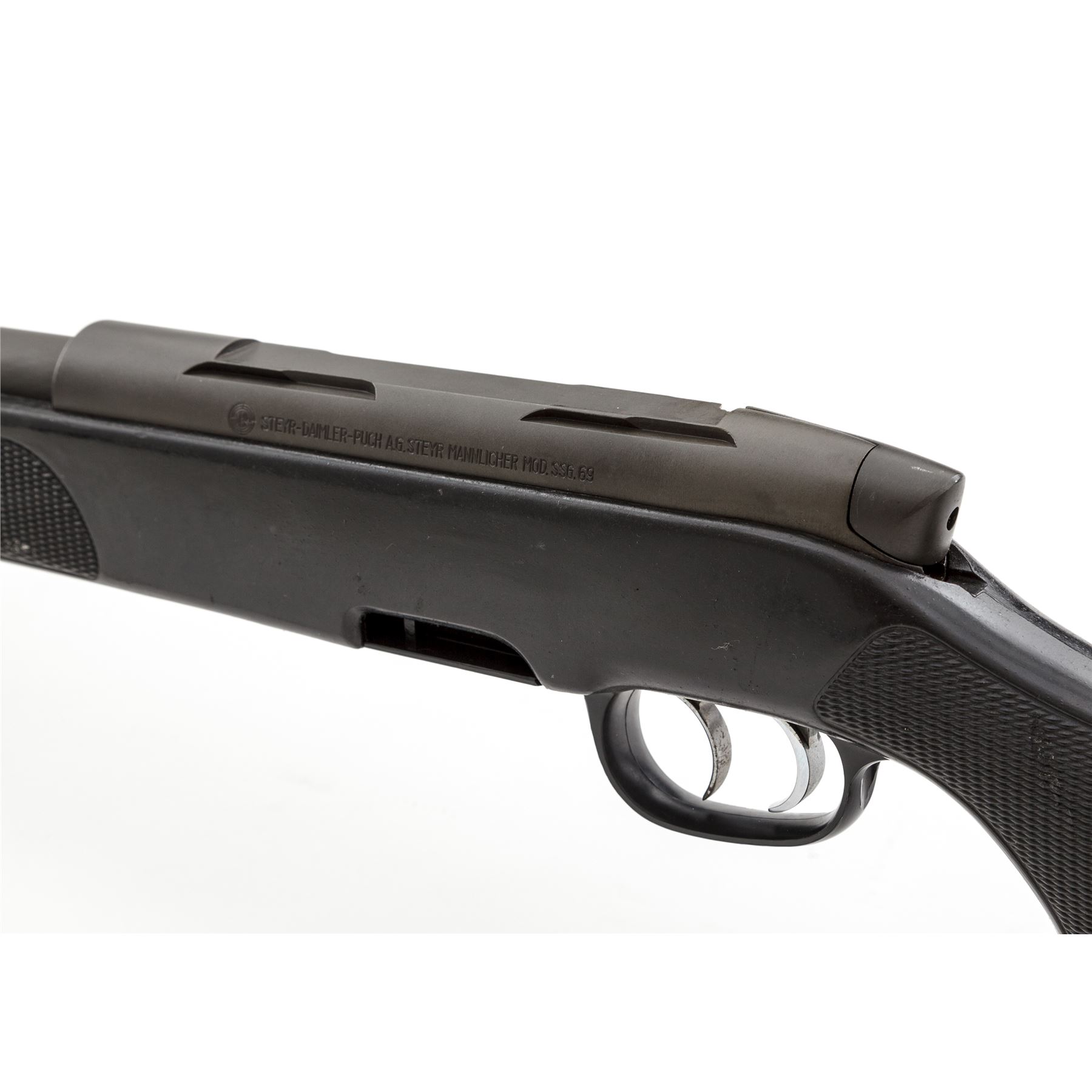 Steyr-Mannlicher Model SSG-69 Bolt Action Rifle, #184079, .308 cal., 25'' tapered barrel; marked on left side ''Gun South, Inc., Trussv. AL.'' Metal with a phosphate finish; black synthetic pistol-grip stock with checkering at both the forend and pistol-grip area, with black rubber Steyr pad. Iron sights include a hooded blade front sight and square notched rear, with factory grooved receiver. Features double set triggers with one factory magazine. Right side of barrel, frame, and bolt are marked with date code ''LTH'' and proofmarks. Made in Austria, February 1986. Condition overall is very good. Barrel with scattered moderate scratches and handling marks, factory lettering is clear and defined. Stock with moderate scuffs and normal range wear, checkering is sharp. Smooth action, set triggers operate as designed, bore is bright with excellent rifling. Est.: $800-$1,200. (Modern)