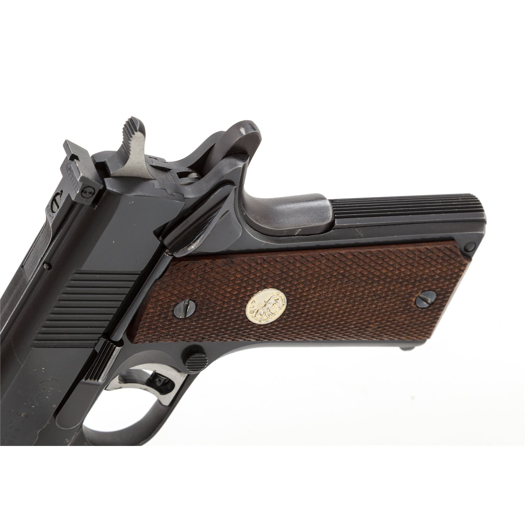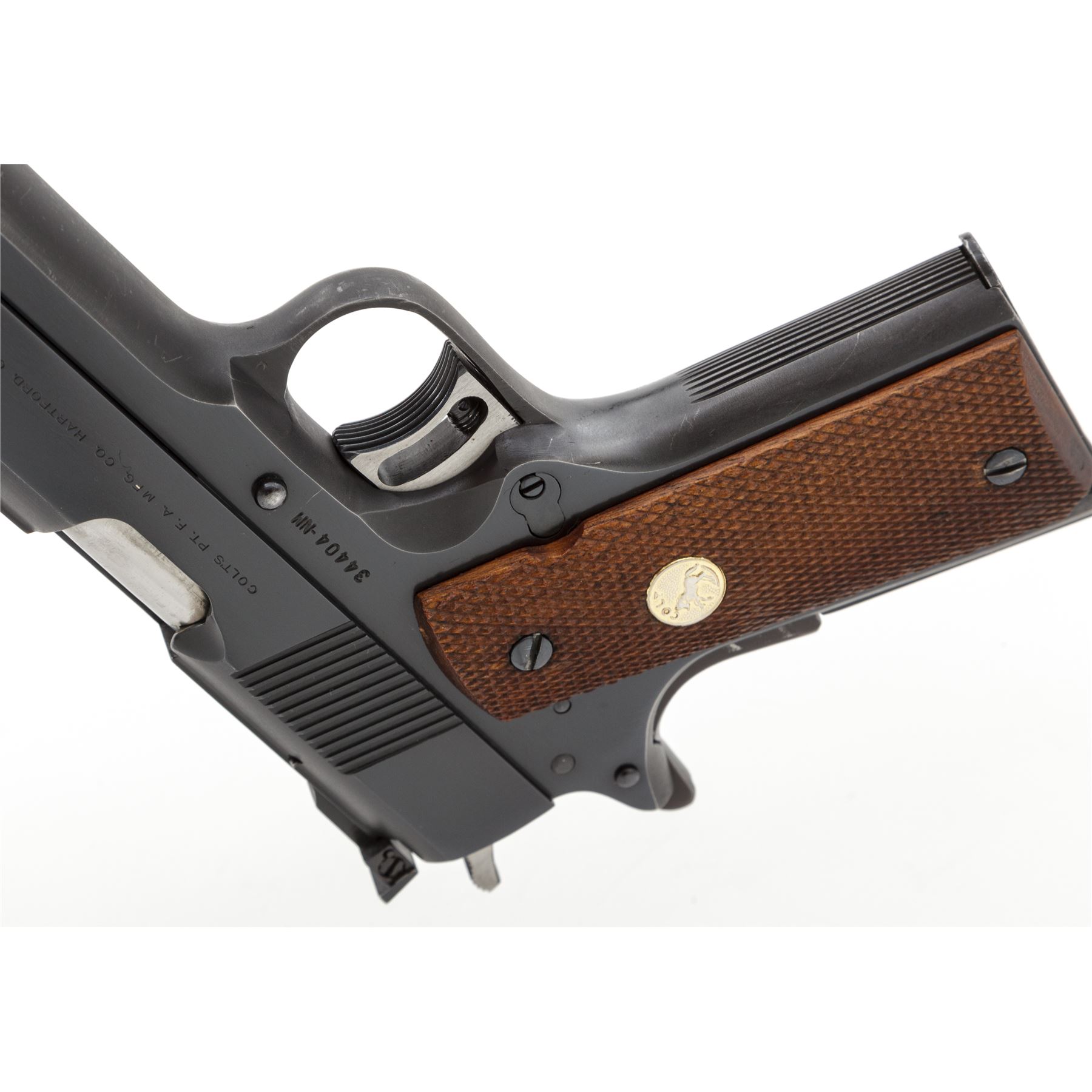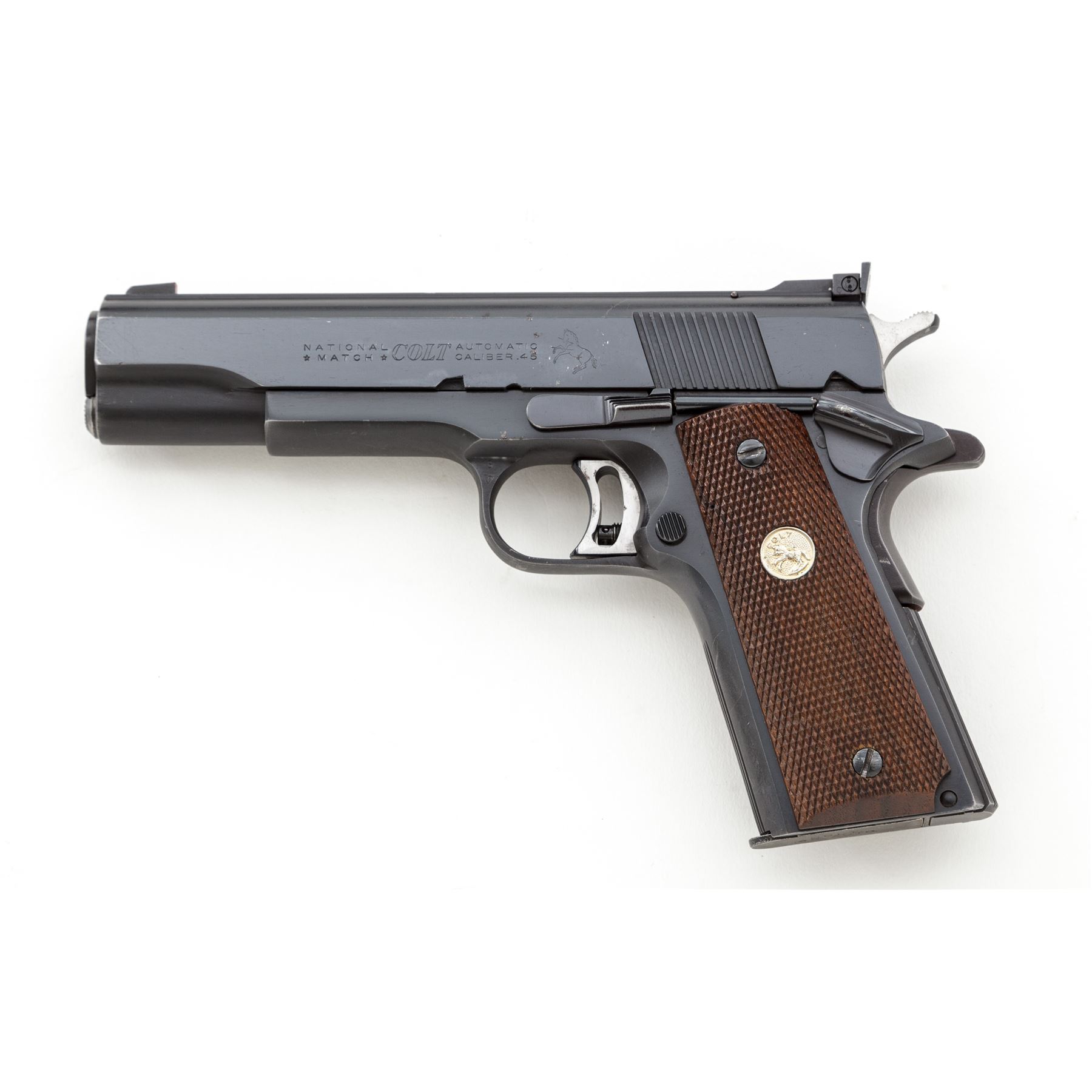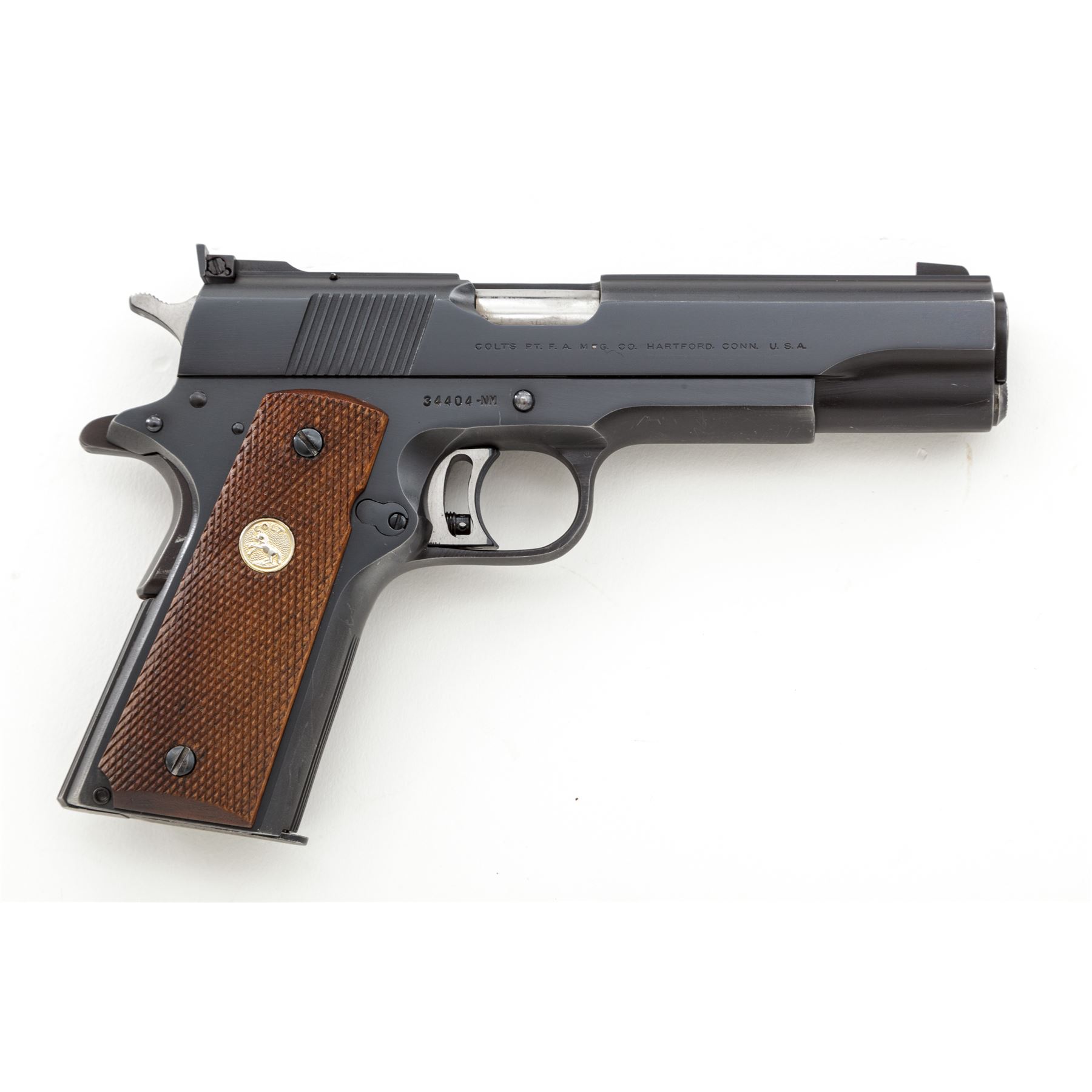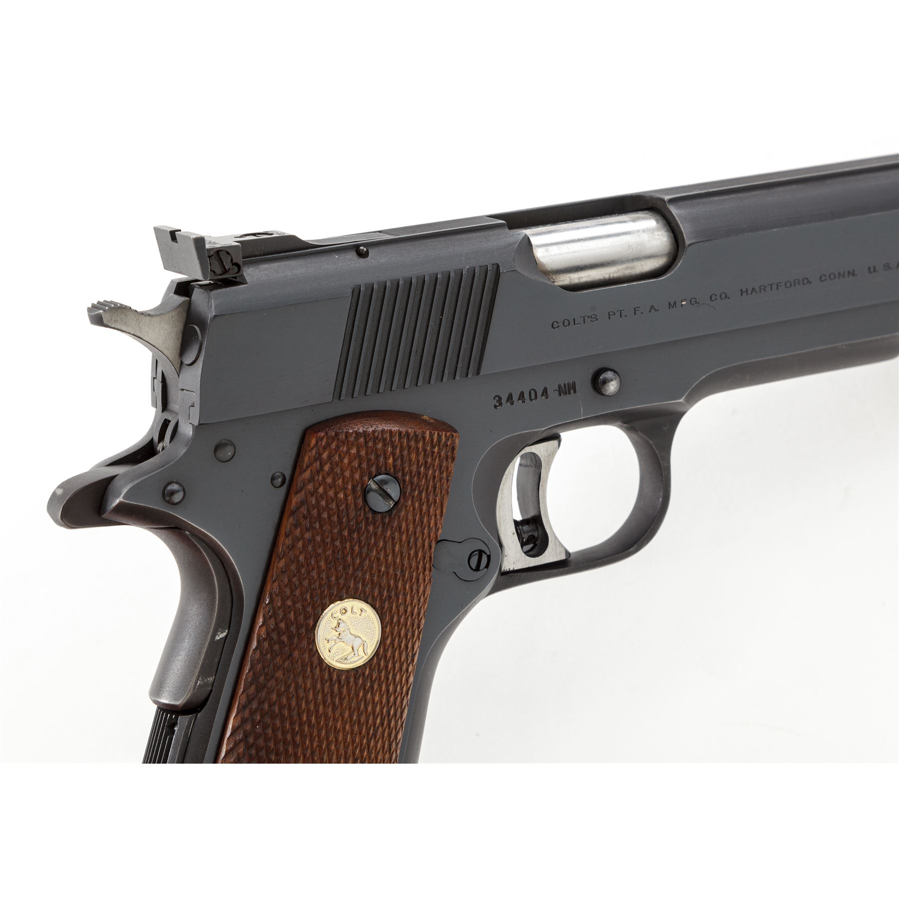 Colt Pre-Series 70 National Match Semi-Automatic Pistol, #34404-NM, .45 ACP cal., 5'' barrel, blue finish, factory checkered walnut grips with gold Colt medallions, Elliason rear sight, and one factory Colt magazine. Mfg'd 1969. Condition is near excellent retaining approx. 96% original factory blue, with small area of flaking to left side of slide. Actioning marks to bright sides of trigger. Grips with minor flattening. Smooth crisp action, bright bore. Est.: $1,200-$1,800. (C&R/PPT)