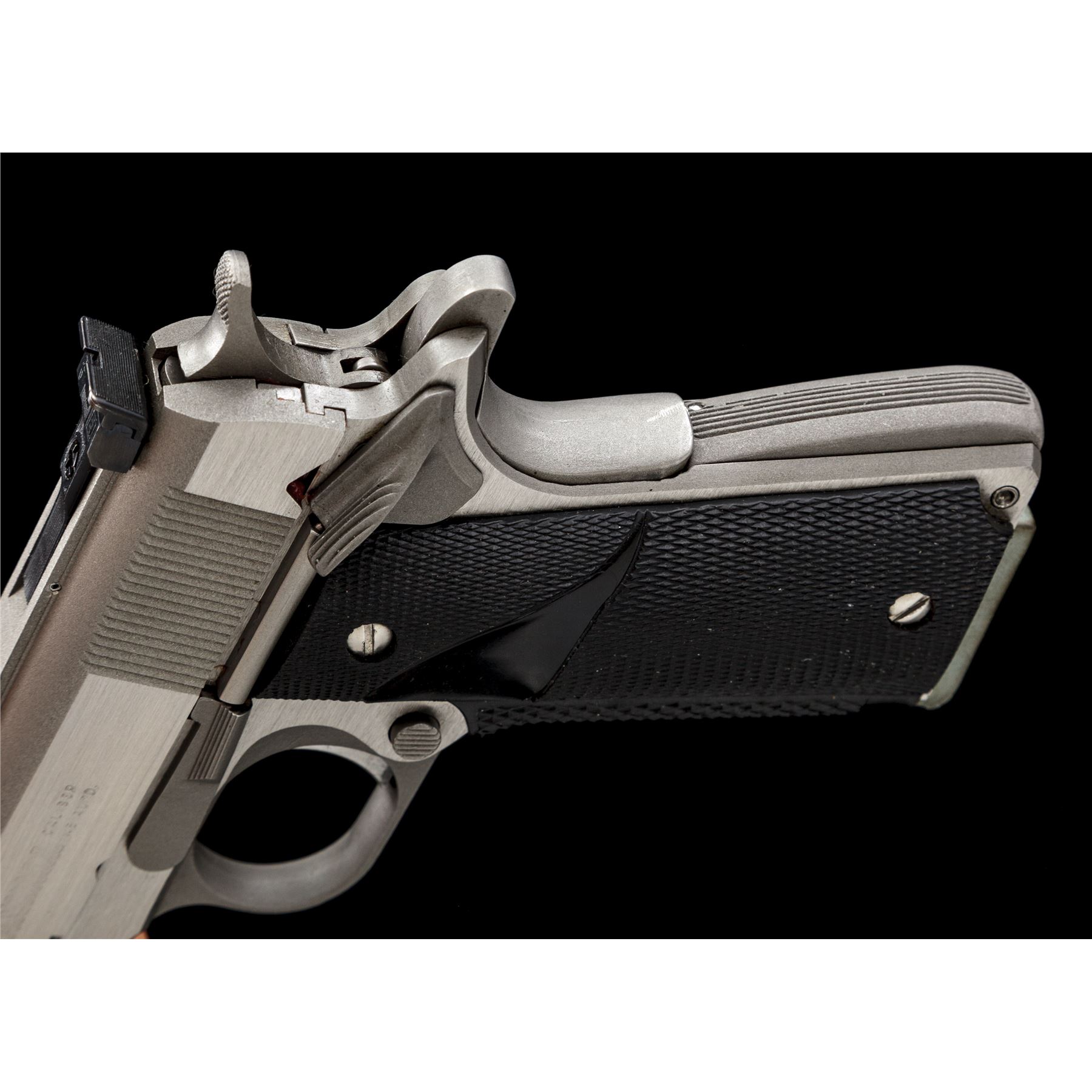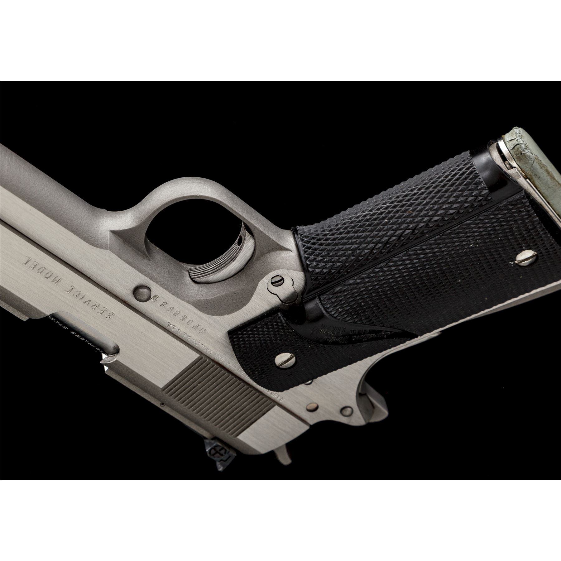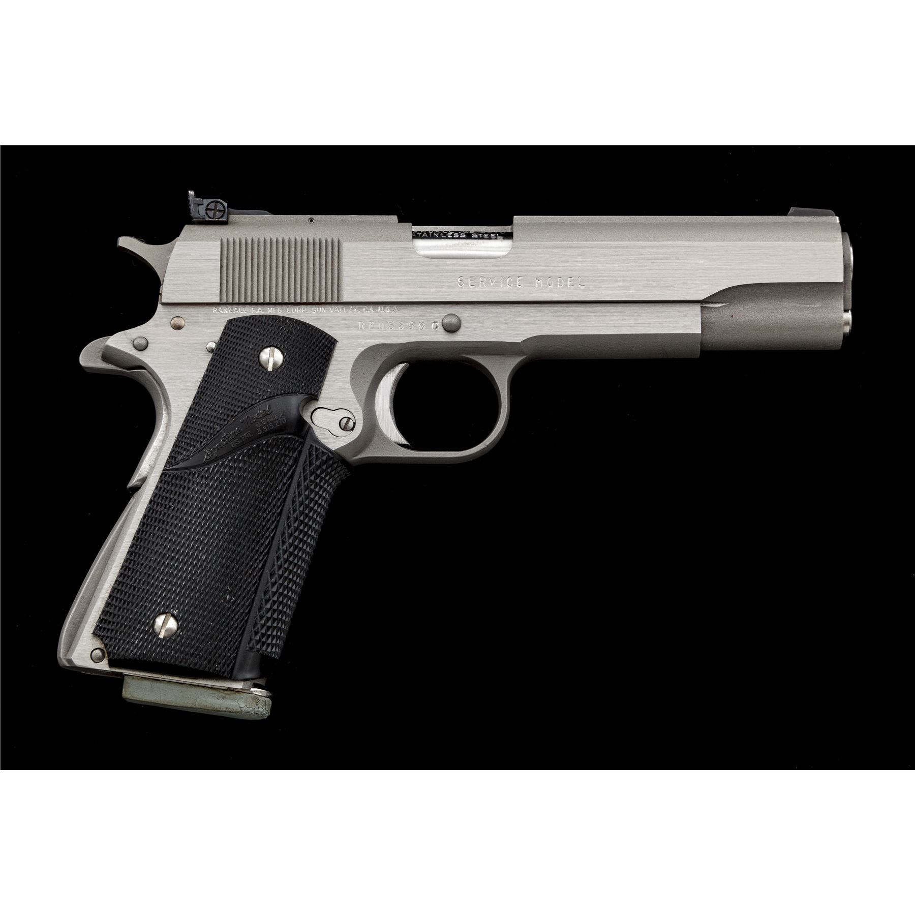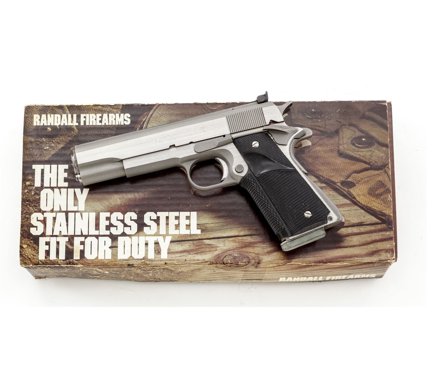 Randall Firearms Service Model Semi-Automatic Pistol, #RF05358C, .45 ACP cal., 5'' stainless barrel, satin stainless frame and slide, checkered black rubber wraparound Pachmayr grips, blade front sight, fully adjustable rear sight, and one stainless magazine with rubber base pad. In the original box that is hand numbered to the gun. Condition is excellent, metal with only a few minor handling marks; most noticeable is a rub mark on the back of the grip safety. Factory lettering with crisp edges. Grips also with only minor handling marks. Magazine base pad is aged with cracking and some flaking around the edges. Smooth action, bright bore with excellent rifling. Overall a very nice lightly used and limited production pistol. Est.: $1,200-$1,800. (Modern/PPT)
