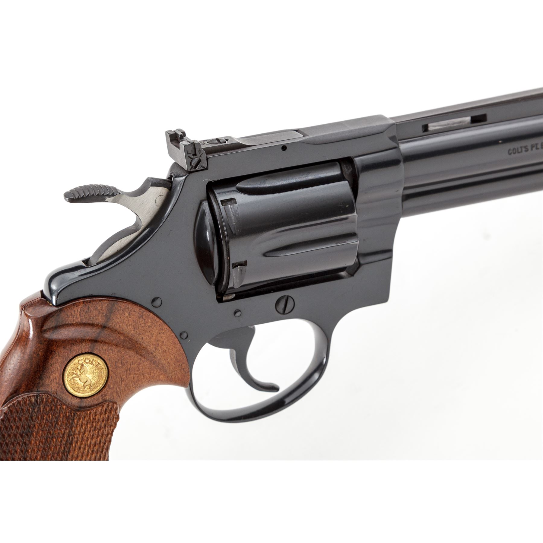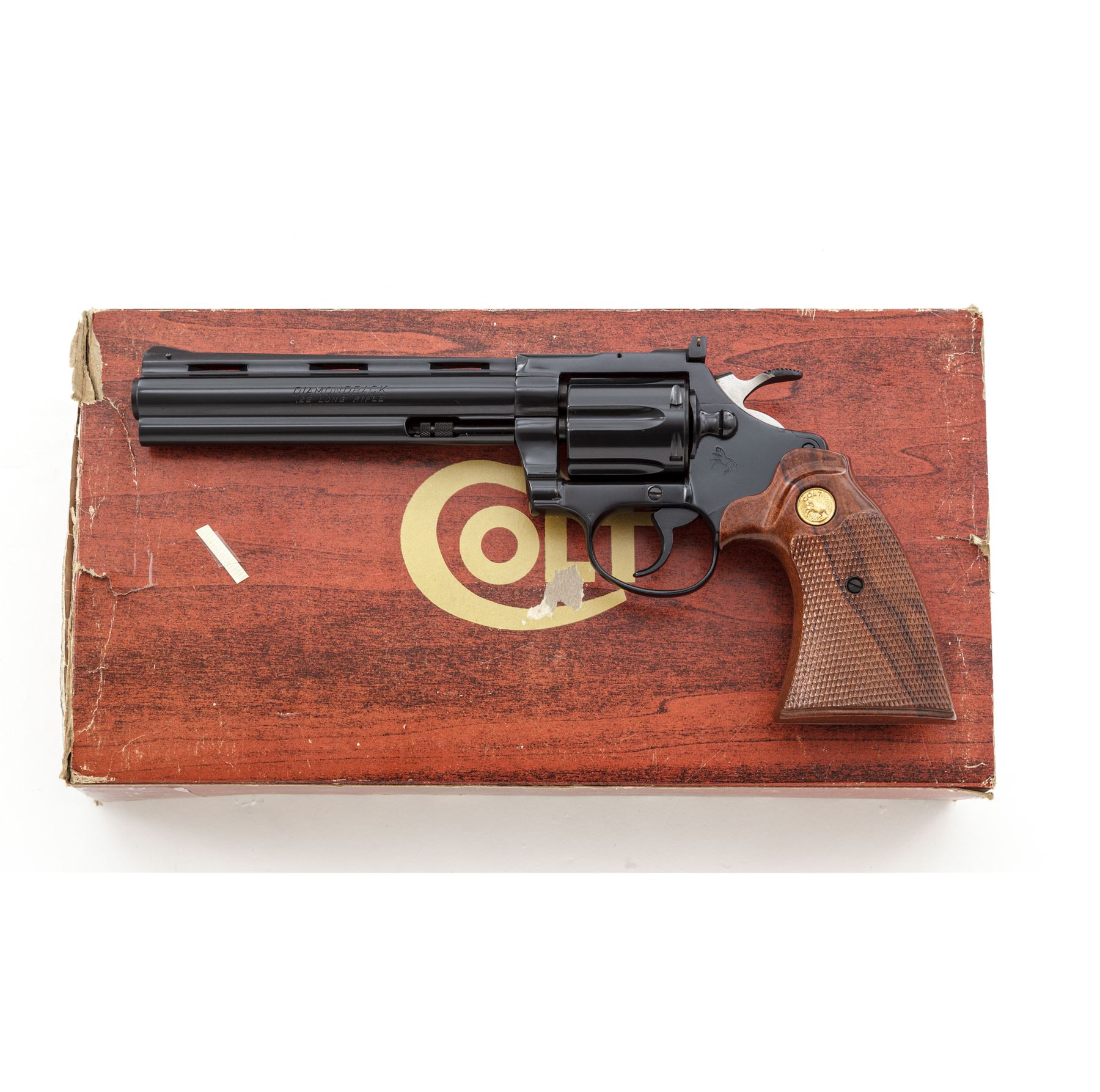 Outstanding .22 Caliber Colt Diamondback Double Action Revolver, #R42420, 6'' vent rib barrel, blue finish, factory checkered walnut grips with gold Colt medallions, ramped front sight, and a fully adjustable square notched rear sight. In the original simulated woodgrain box with matching end label, two-piece styrofoam insert, yellow hang tag, Colt sight adjustment tool, instruction manual, and other misc. factory paperwork. Mfg'd 1978. This revolver is in excellent condition appearing as new and the overall condition would be very hard to improve upon. The cylinder with only an extremely faint index line and approx. 99%+ original finish remains with a few tiny and insignificant handling marks on the right side of the barrel. The grips fit a little loose which is sometimes encountered, their condition is as new. Bore is mirror bright. Box shows storage type wear, blank end flap has detached from the box but is still present, hand numbered end label is legible but has been retaped to the box. Est.: $1,600-$2,200. (Modern) (Not available to Calif. residents.)