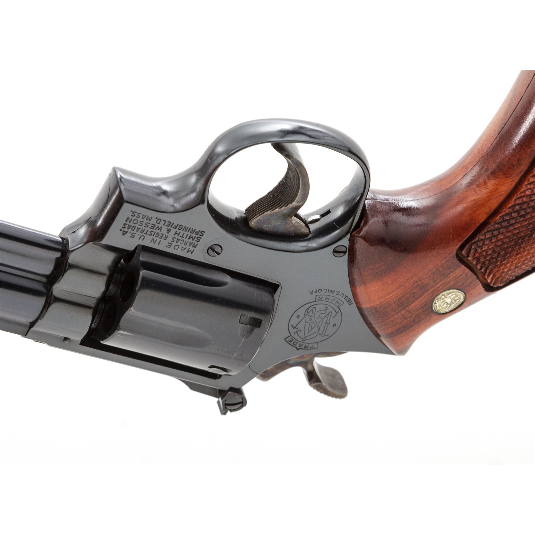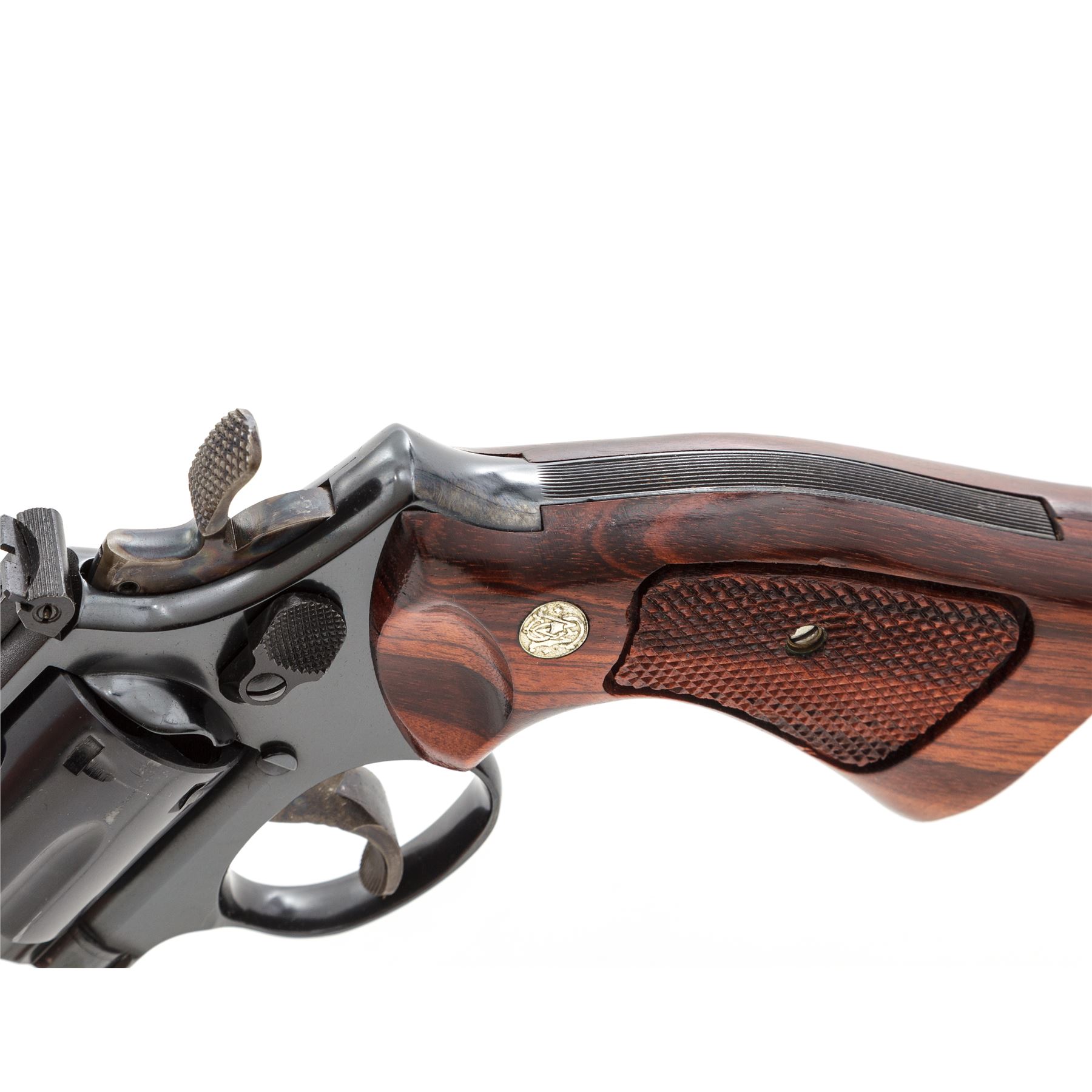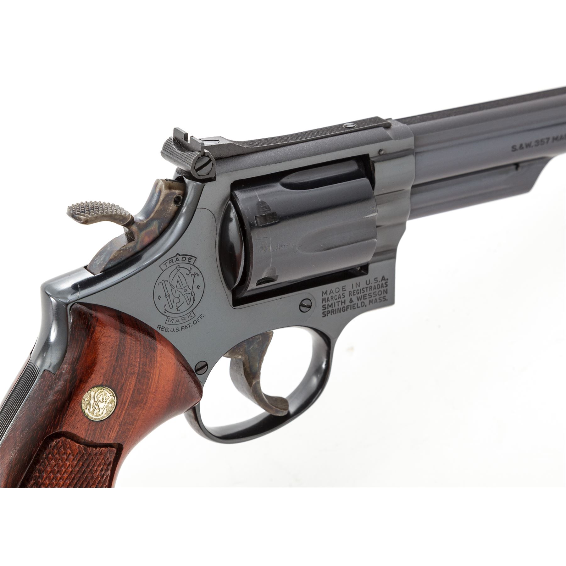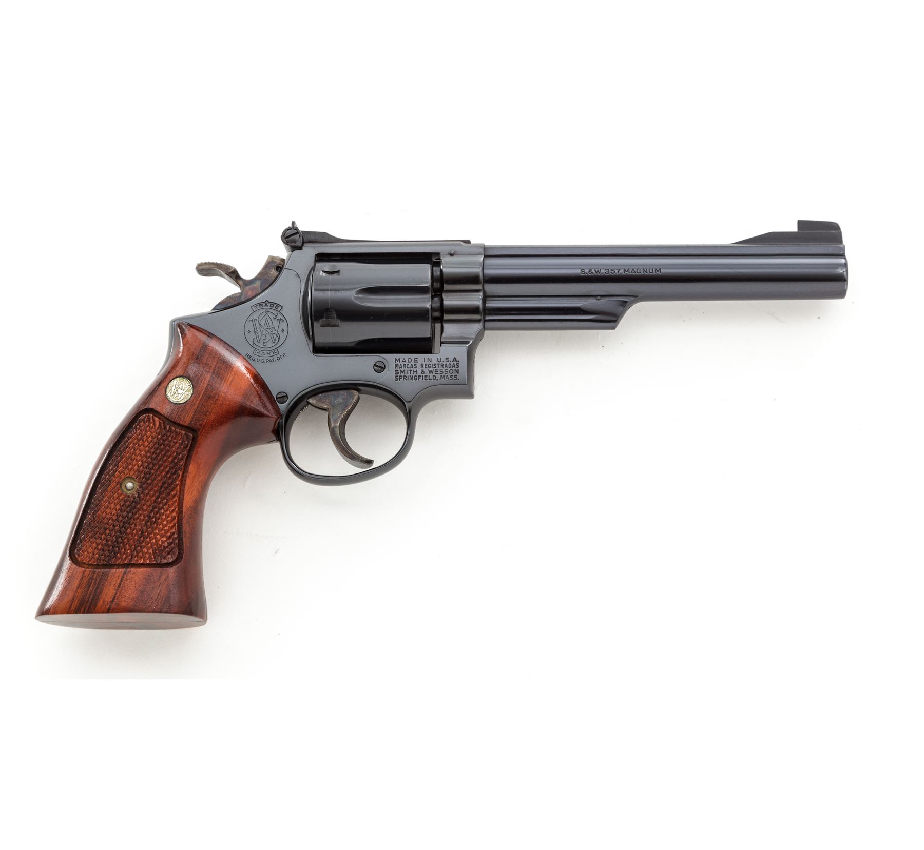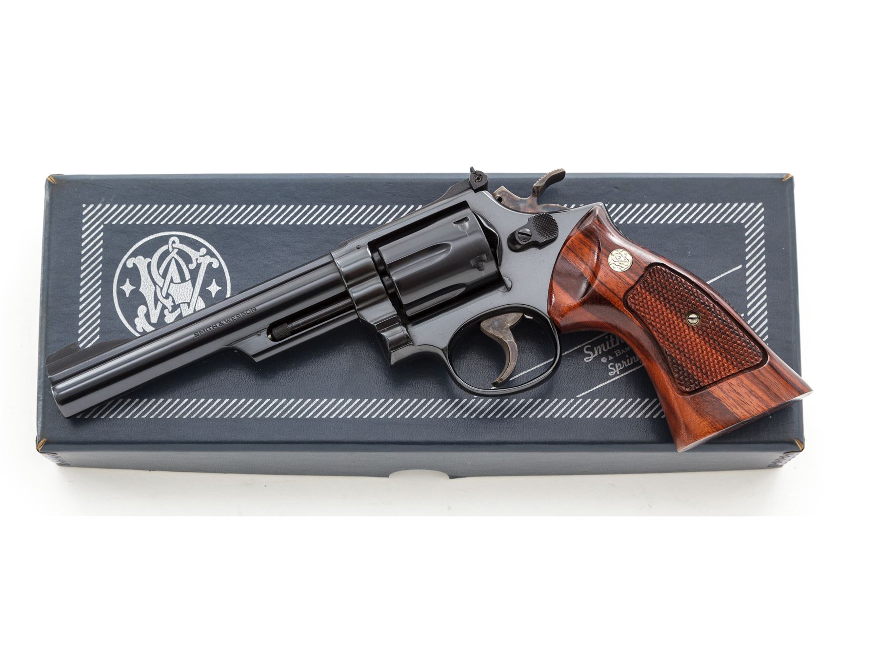Smith & Wesson Model 19-3 .357 Combat Magnum Double Action Revolver, #7K93031, 6'' pinned barrel, blue finish; checkered Goncalo Alves target grips with S&W medallions, Patridge front sight and square-notched micrometer click adjustable rear sight; color case hardened target hammer and target trigger. In two-piece blue ''Bangor Punta'' box with matching end label. Mfg'd 1975. In excellent as new overall condition, retaining approx. 99%+ original blue finish and vibrant case colors, with only a few very minor handling marks. Cylinder appears to have been turned very little, with a faint index line. Grips are like new with sharp checkering. Bore is mirror bright. A very nice collector's grade revolver. Est.: $700-$1,000. (Modern/PPT)