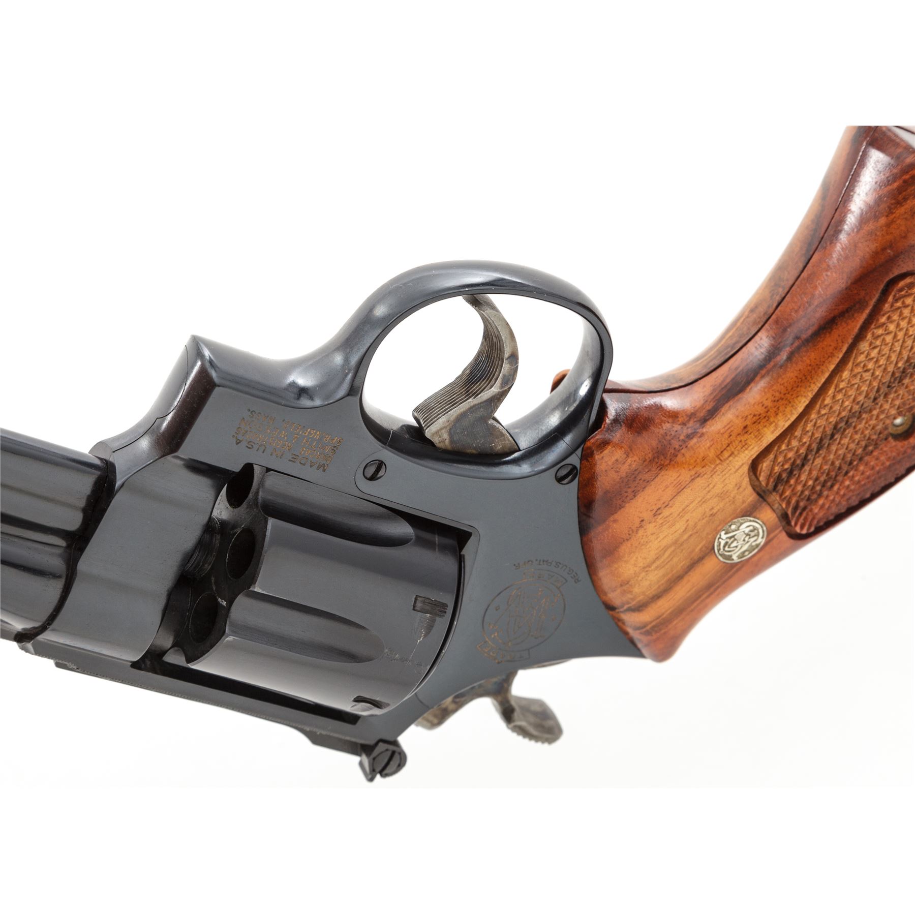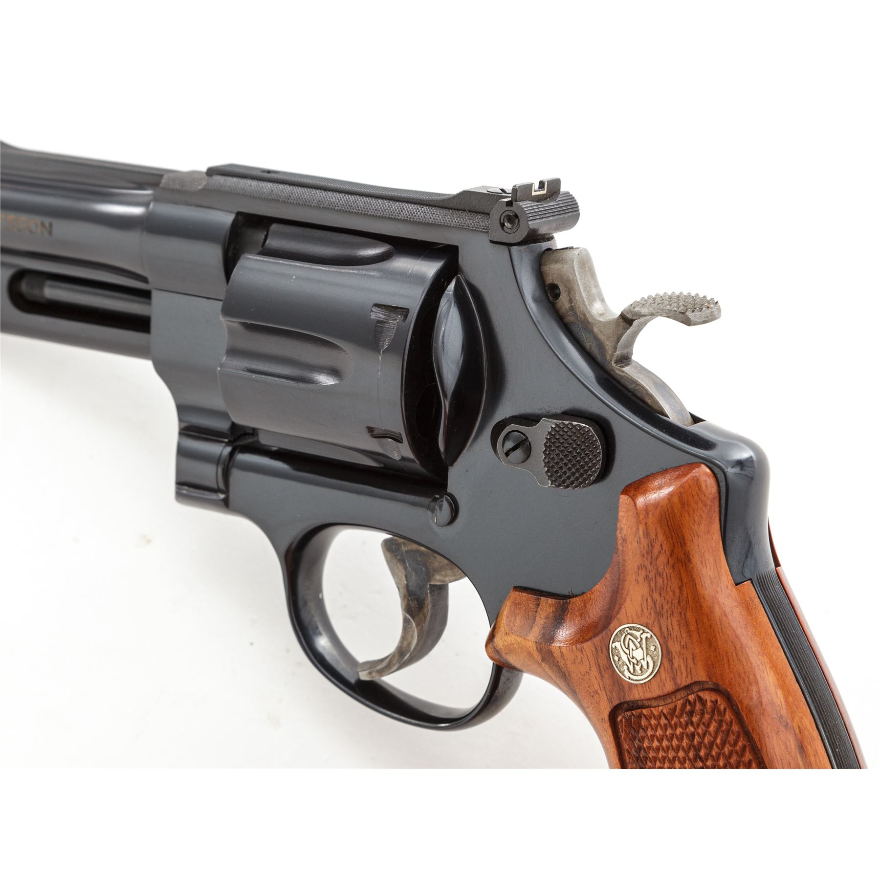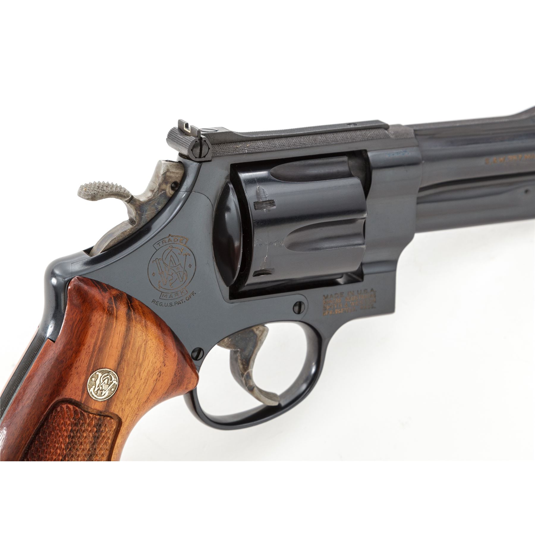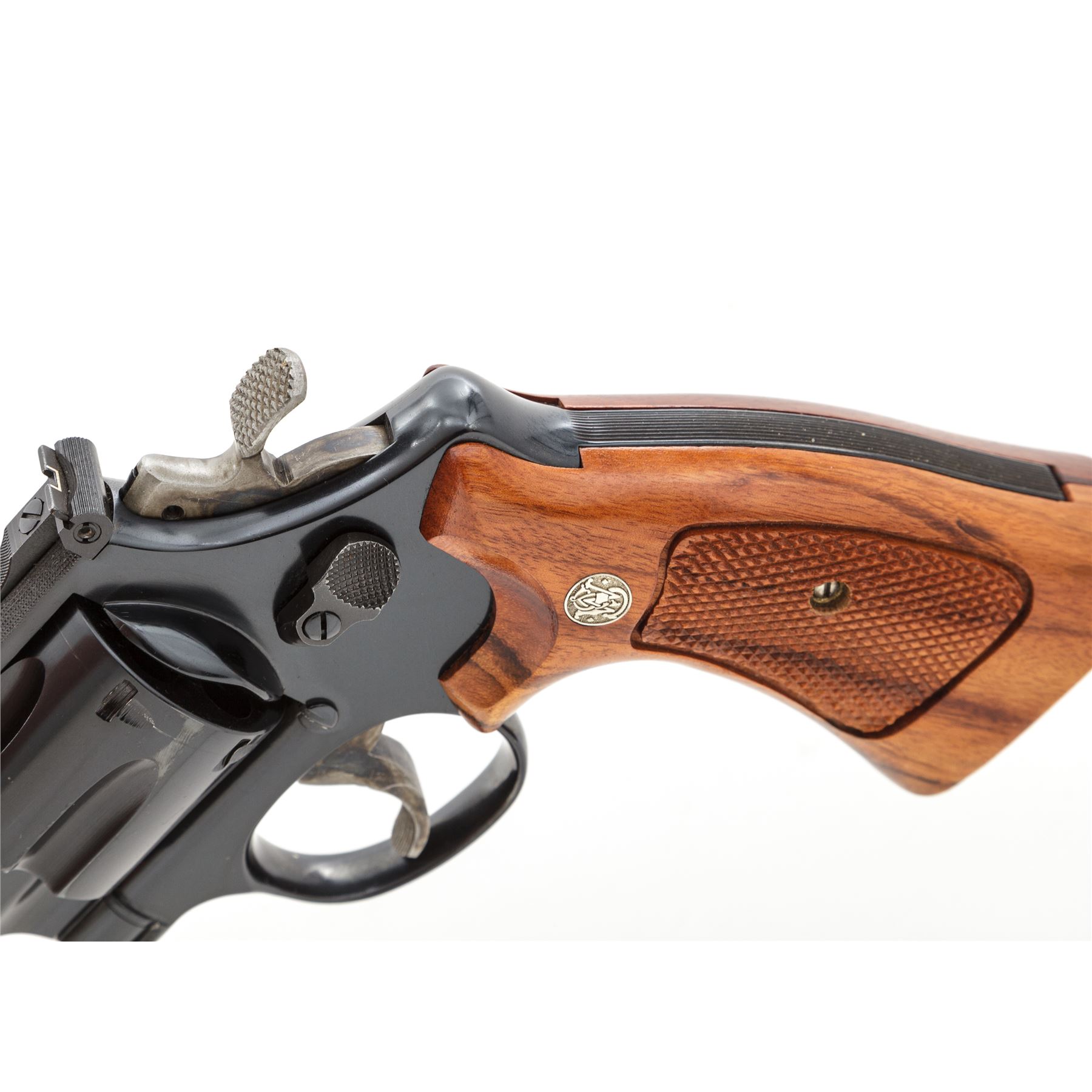 Smith & Wesson Model 27-3 Double Action Revolver, #AVU2355, .357 mag. cal., 4'' barrel, 3-screw frame, blue finish, factory checkered Goncalo Alves target grips with S&W medallions, red ramp front sight and micrometer click adjustable rear sight, color case hardened target hammer and target trigger; top of frame and barrel rib with fine factory checkering. Condition overall is excellent with approx. 98+% original blue; cylinder with only a thin index line. Factory lettering is clear and defined; screw head slots are straight, with no noticeable wear. Hammer and trigger retain most of their vivid case colors. Grips are also excellent with only a few insignificant handling marks, checkering appears as new. Crisp action, excellent mirror bright bore. Est.: $600-$900. (Modern)(Not available to Calif. residents.)