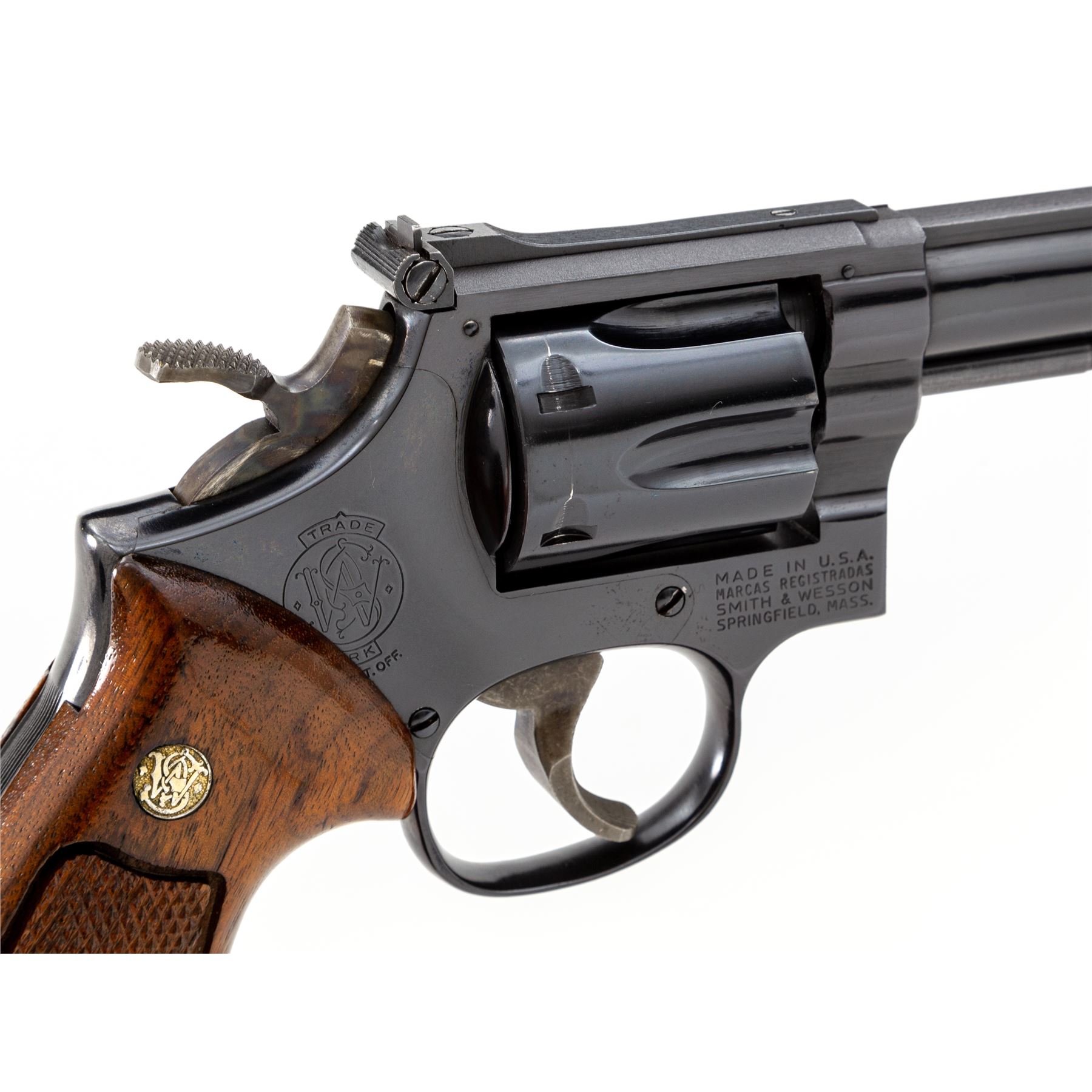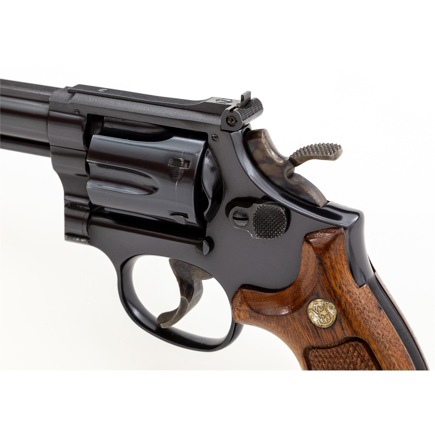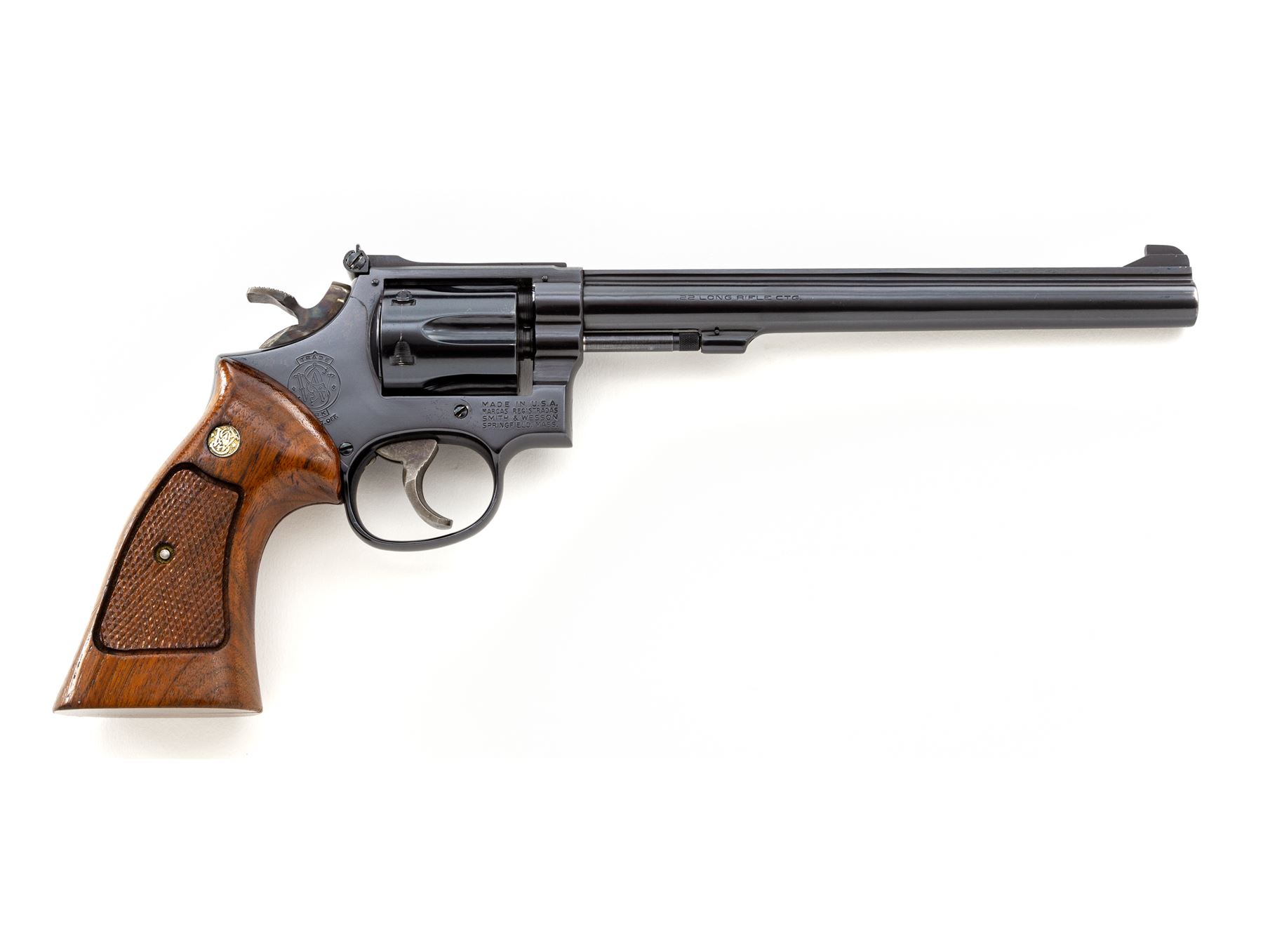 Smith & Wesson K-22 Masterpiece (Model 17-4) Double Action Revolver, #83K2367, .22 LR cal., 8-3/8'' pre-81 pinned barrel, blue finish, factory checkered target grips with S&W medallions, Patridge front and adjustable rear sight, target trigger and target hammer. Condition is excellent retaining approx. 98% factory blue with very light wear to muzzle. Forward most sideplate screw with slightly misshapen slot; rear sight blade is broken but is a very simple fix. (A brand new white outline insert is included.) Grips are crisp with light thinning to varnish, as well as minor oil darkening near escutcheon and medallion. Crisp action, bright bore, and only the thinnest index mark to cylinder. Est.: $750-$1,000. (Modern/PPT)