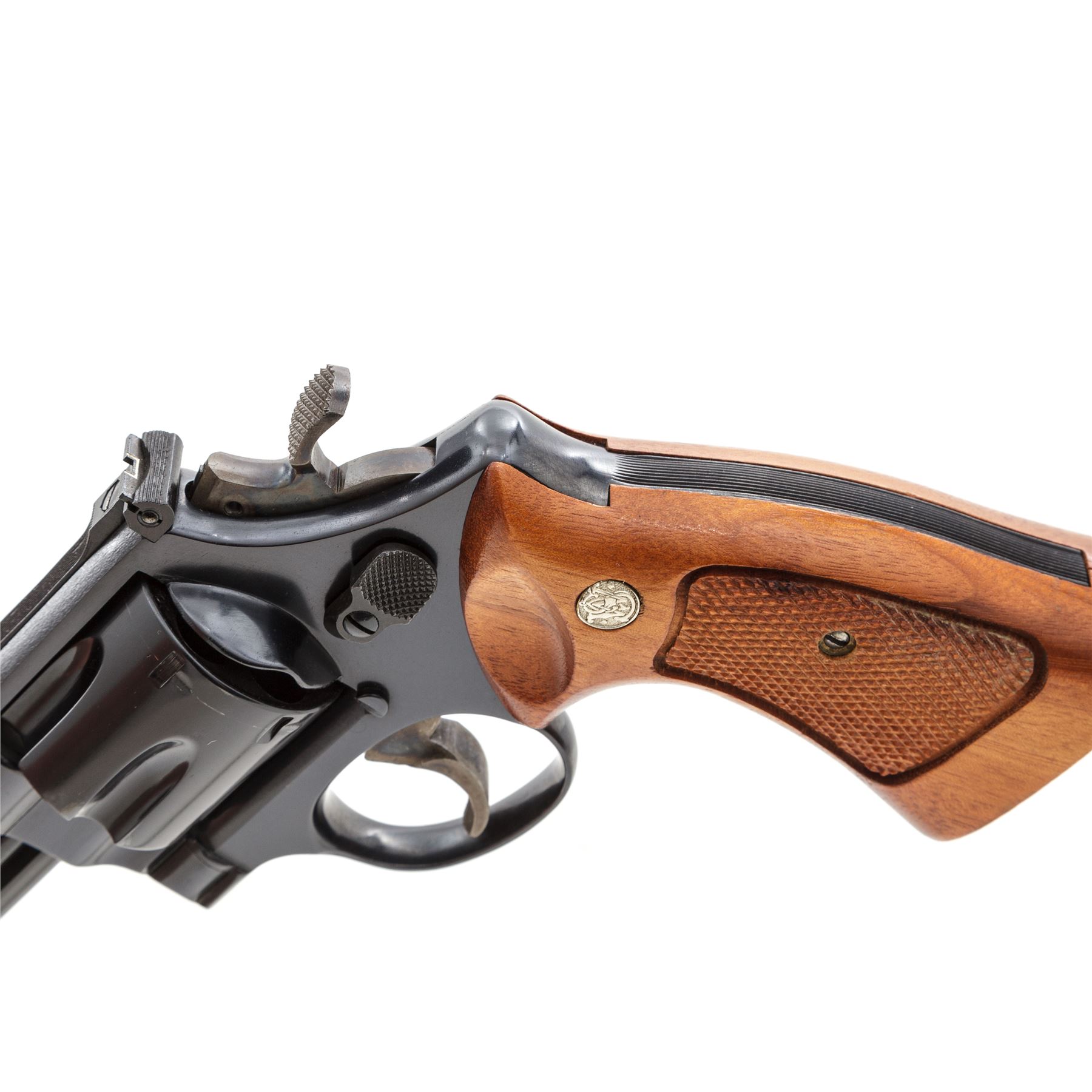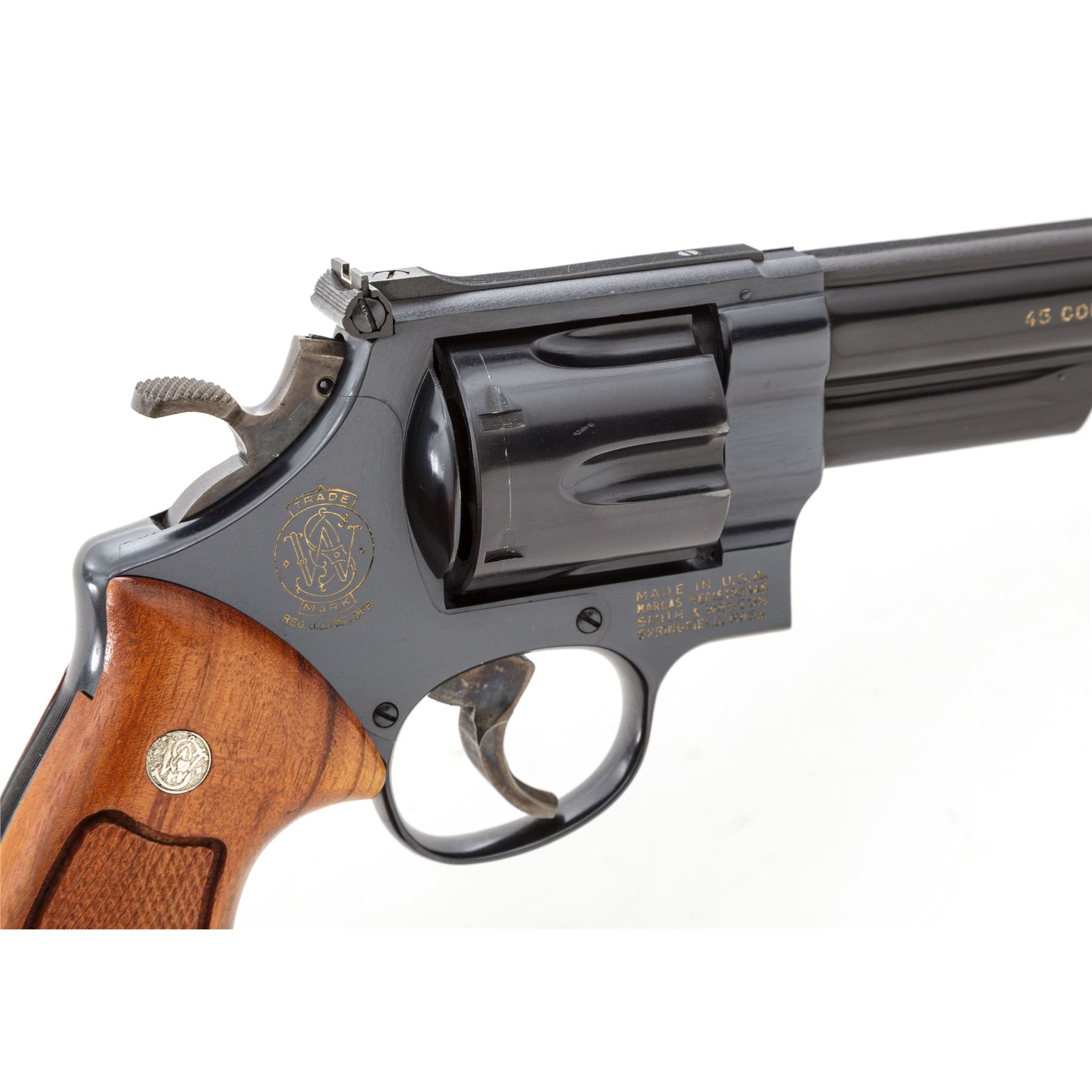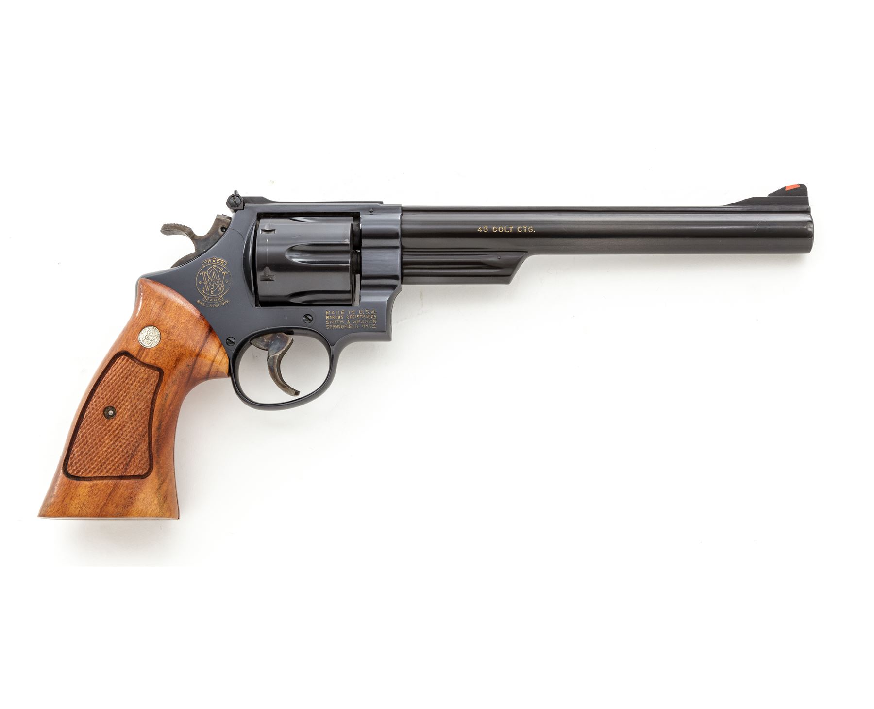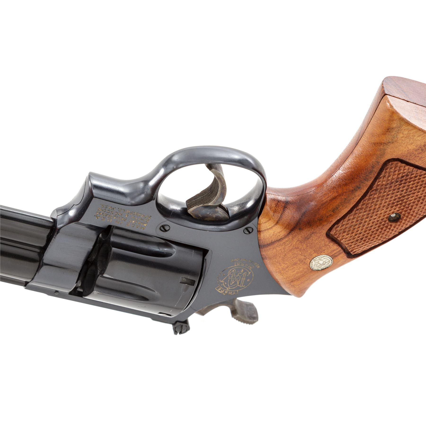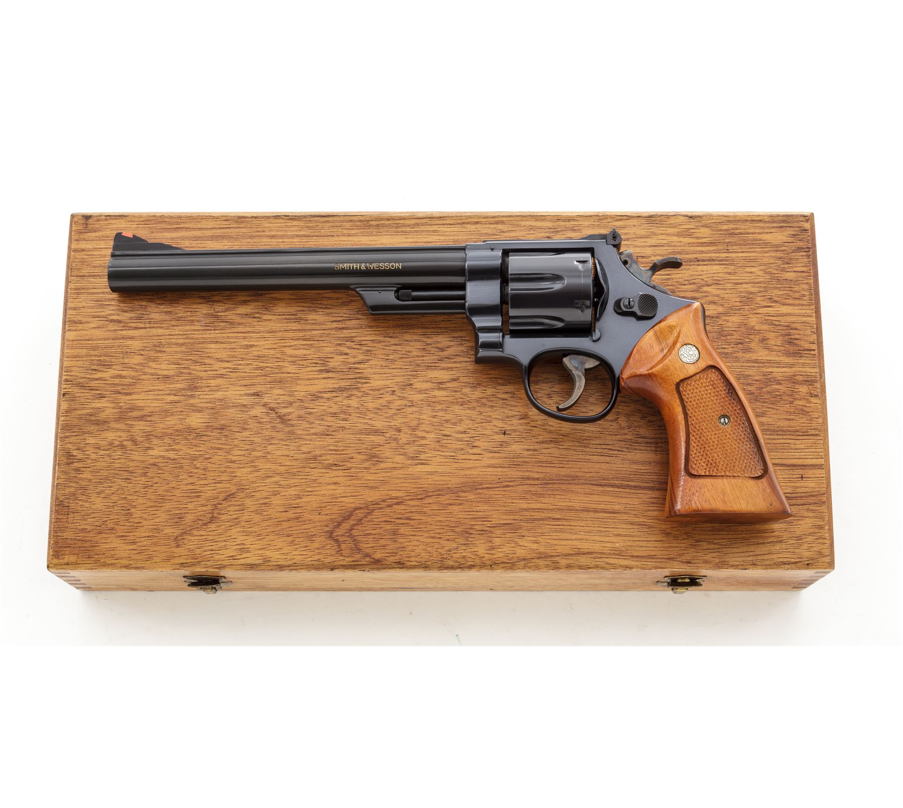 Smith & Wesson Model 25-5 Double Action Revolver, #N823651, .45 LC cal., 8-3/8'' pinned barrel, blue finish, factory checkered Goncalo Alves target grips with S&W medallions, red ramp front sight and white outlined fully adjustable rear sight, with color case hardened target hammer and target trigger. Mfg'd ca. 1980-1983. Included is wood display box with black plastic/gray foam interior, cleaning accessories, and screwdriver. Revolver is in excellent overall condition, retaining approx. 99% original blue finish showing only the slightest handling marks. Cylinder with a light index line and a small impression that has had the finish touched up. Factory marks are clear and defined, screw head slots are straight and unmarred. Grips with only a few minor handling marks; right grip with a little thinning towards the lower back edge; checkering appears as new. Hammer and trigger retain approx. 98%+ deep rich case colors. Crisp action, bright bore with excellent rifling. Typical minor variation in tone and finish of guns assembled during the transition period of S&W ownership. Wood case is very good with moderate shallow impressions and other storage type wear to the exterior, cleaning accessories are lightly used. Est.: $900-$1,200. (Modern/PPT)
