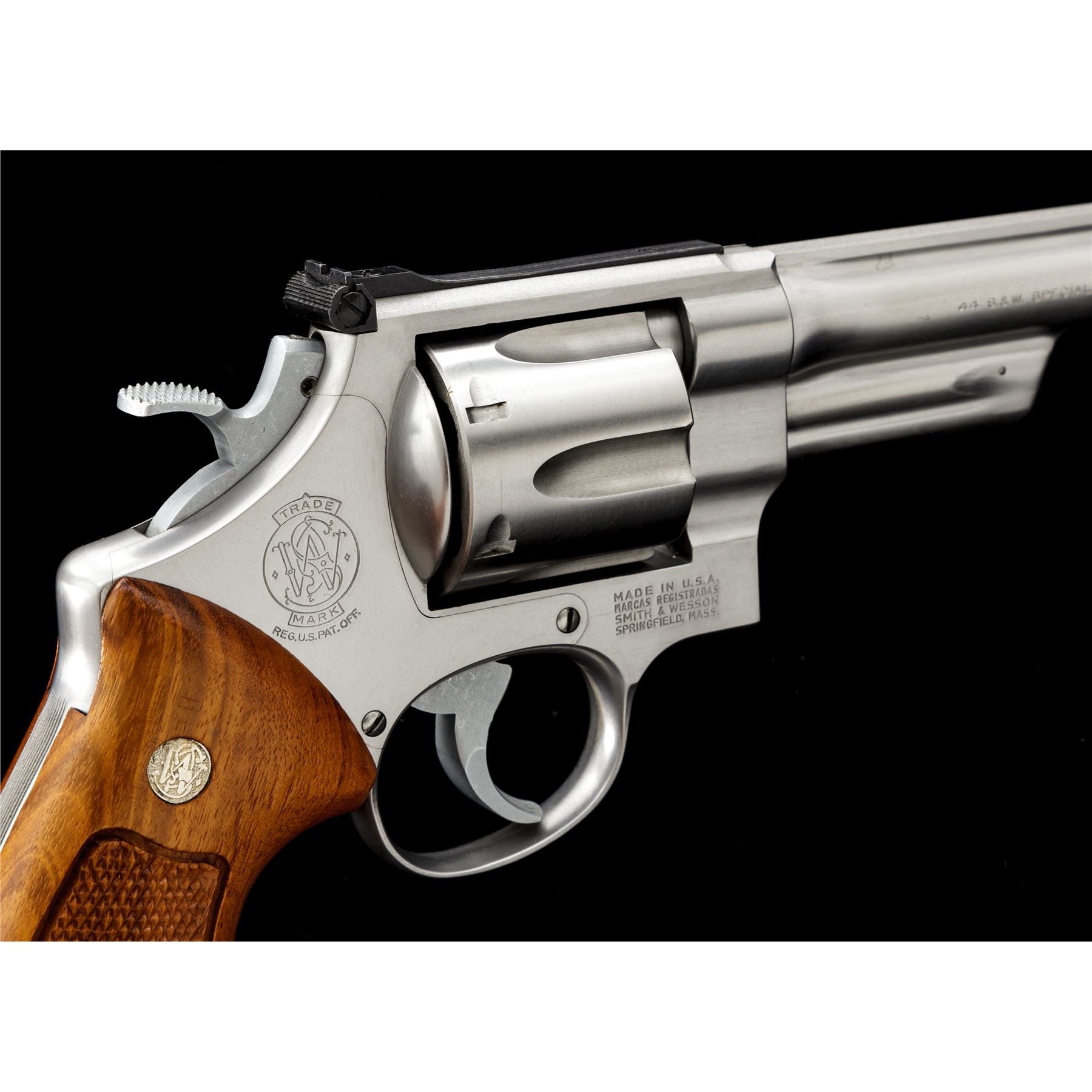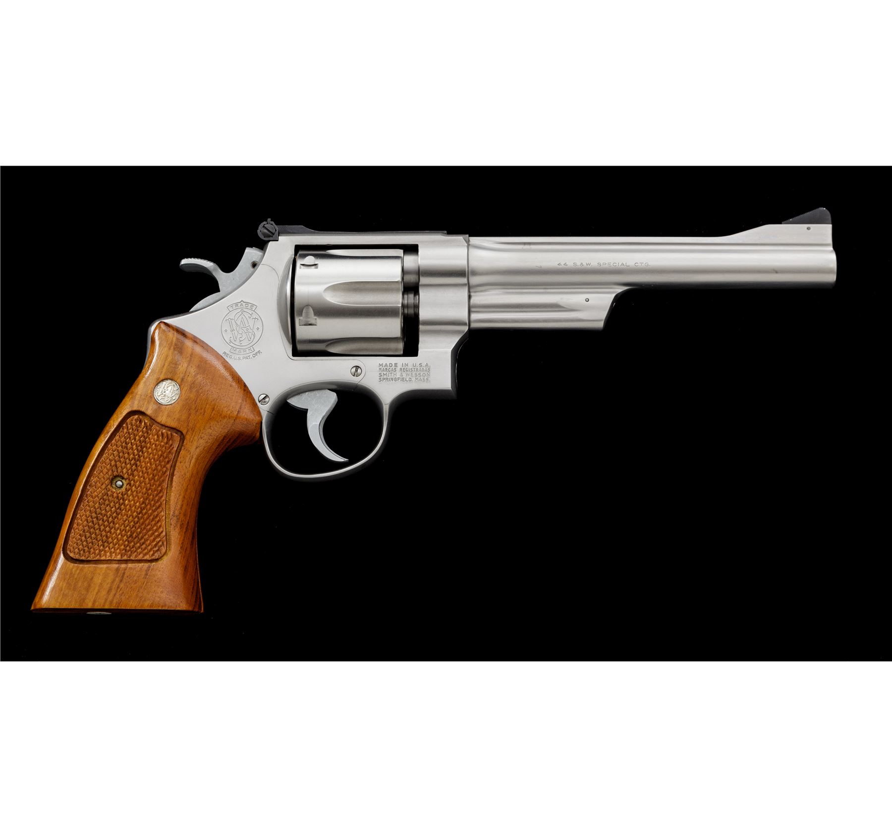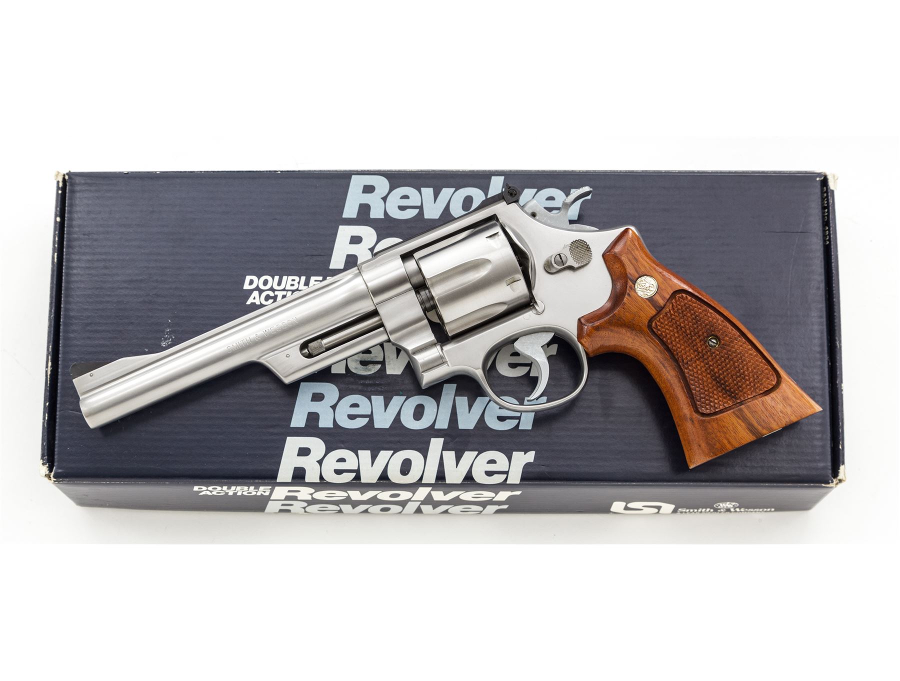 Smith & Wesson Model 624 .44 Target Double Action Revolver, #AHB7183, .44 S&W Spec. cal., 6.5'' barrel, satin stainless finish, checkered Goncalo Alves target grips with S&W medallions, pinned blade front sight and square-notched micrometer click adjustable rear sight; checkered target hammer and serrated trigger. In one-piece S&W box for a Model 624; serial number and barrel length do not match. Included with the box is the S&W packing paper, manual, registration/warranty paperwork, sealed cleaning kit with screwdriver. Revolver is in excellent overall condition, with only a few scattered light handling marks to the metal and light index line on the cylinder. Factory lettering is crisp. Grips are also excellent, checkering is clean and sharp; bottom of left grip with a small round inspection sticker still attached. Cylinder face is clean; bore and chambers are bright, rifling is sharp. Box with very little storage type wear and a clear end label. Est.: $700-$900. (Modern/PPT)