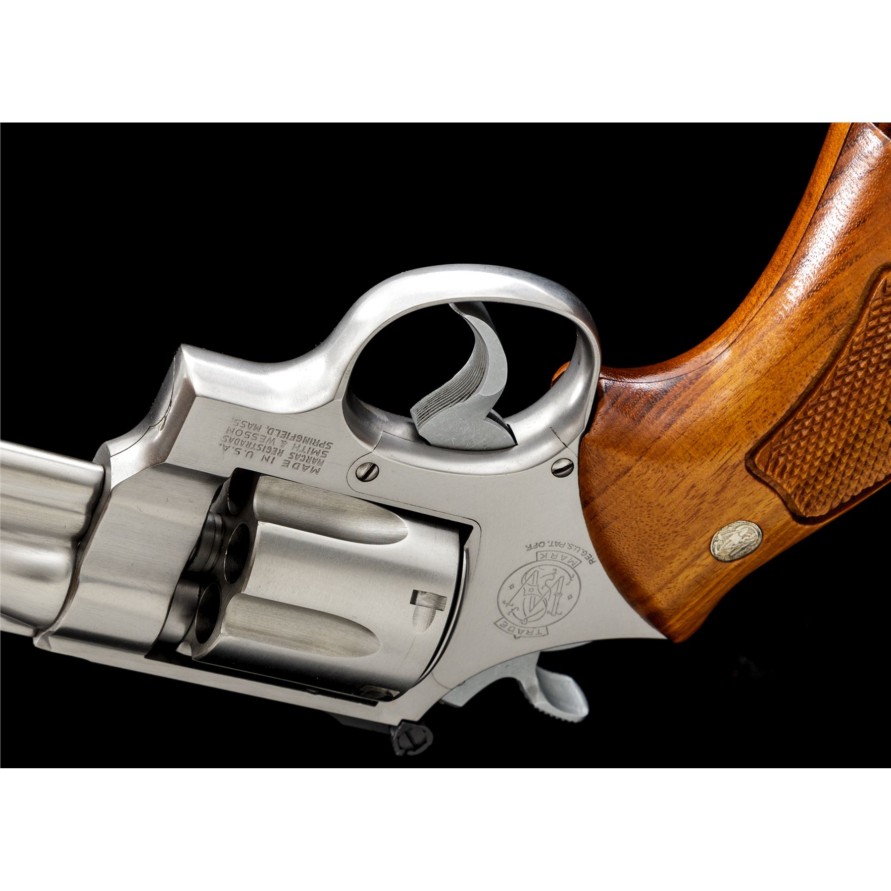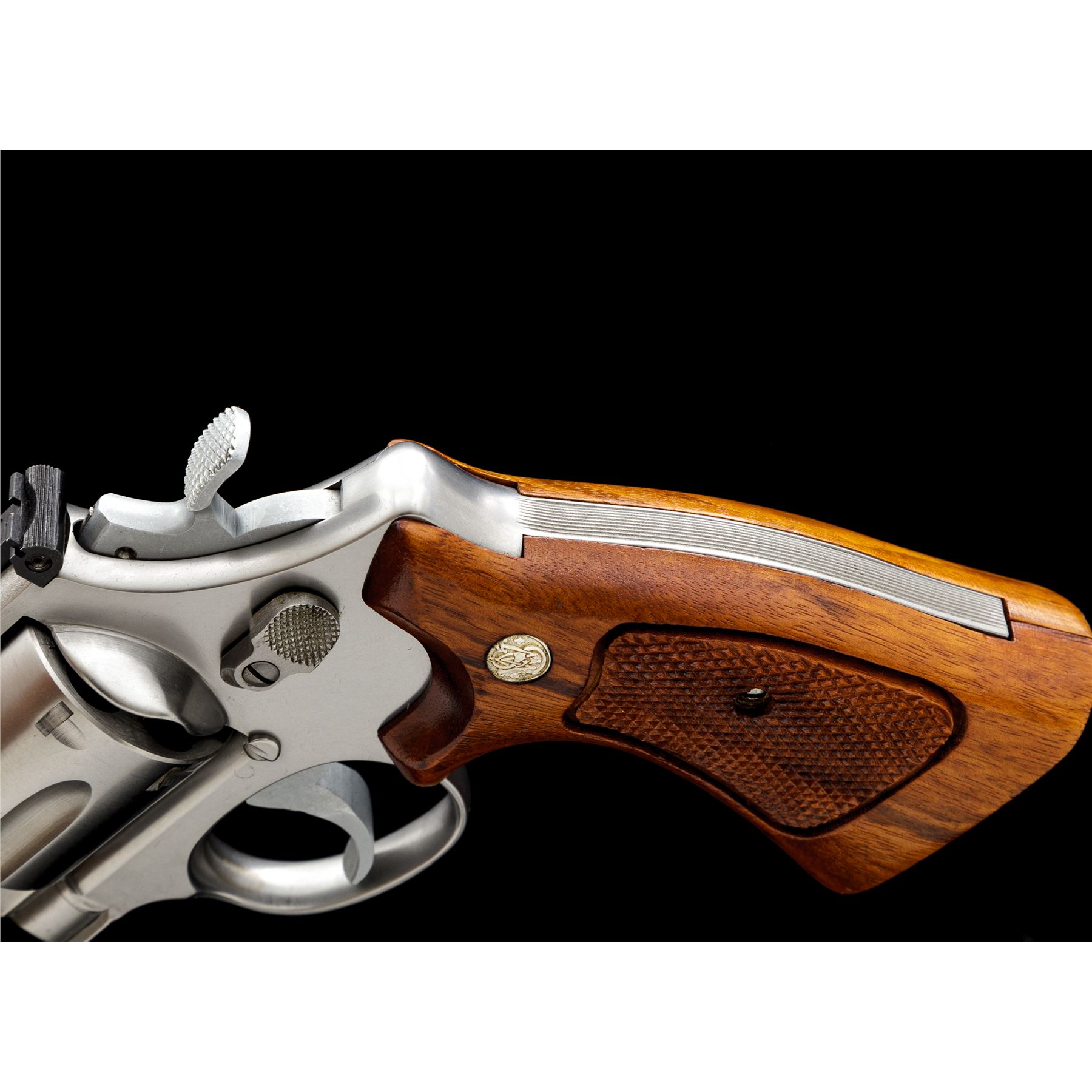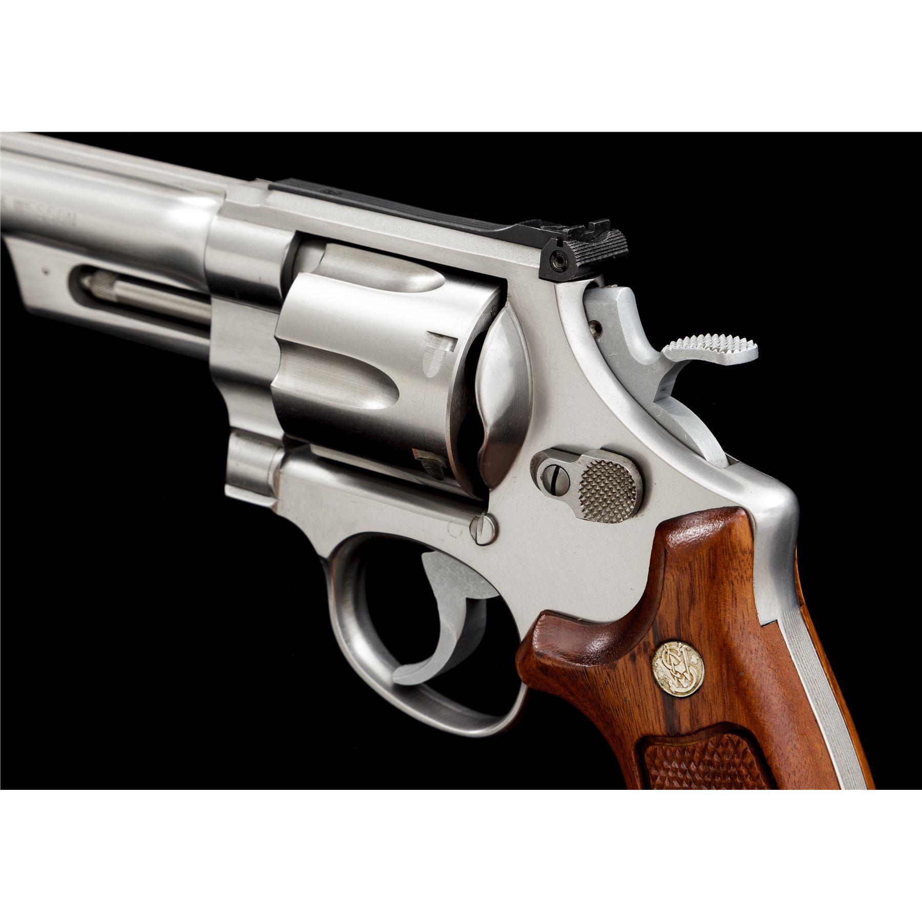 Smith & Wesson Model 624 .44 Target Double Action Revolver, #AHB7183, .44 S&W Spec. cal., 6.5'' barrel, satin stainless finish, checkered Goncalo Alves target grips with S&W medallions, pinned blade front sight and square-notched micrometer click adjustable rear sight; checkered target hammer and serrated trigger. In one-piece S&W box for a Model 624; serial number and barrel length do not match. Included with the box is the S&W packing paper, manual, registration/warranty paperwork, sealed cleaning kit with screwdriver. Revolver is in excellent overall condition, with only a few scattered light handling marks to the metal and light index line on the cylinder. Factory lettering is crisp. Grips are also excellent, checkering is clean and sharp; bottom of left grip with a small round inspection sticker still attached. Cylinder face is clean; bore and chambers are bright, rifling is sharp. Box with very little storage type wear and a clear end label. Est.: $700-$900. (Modern/PPT)