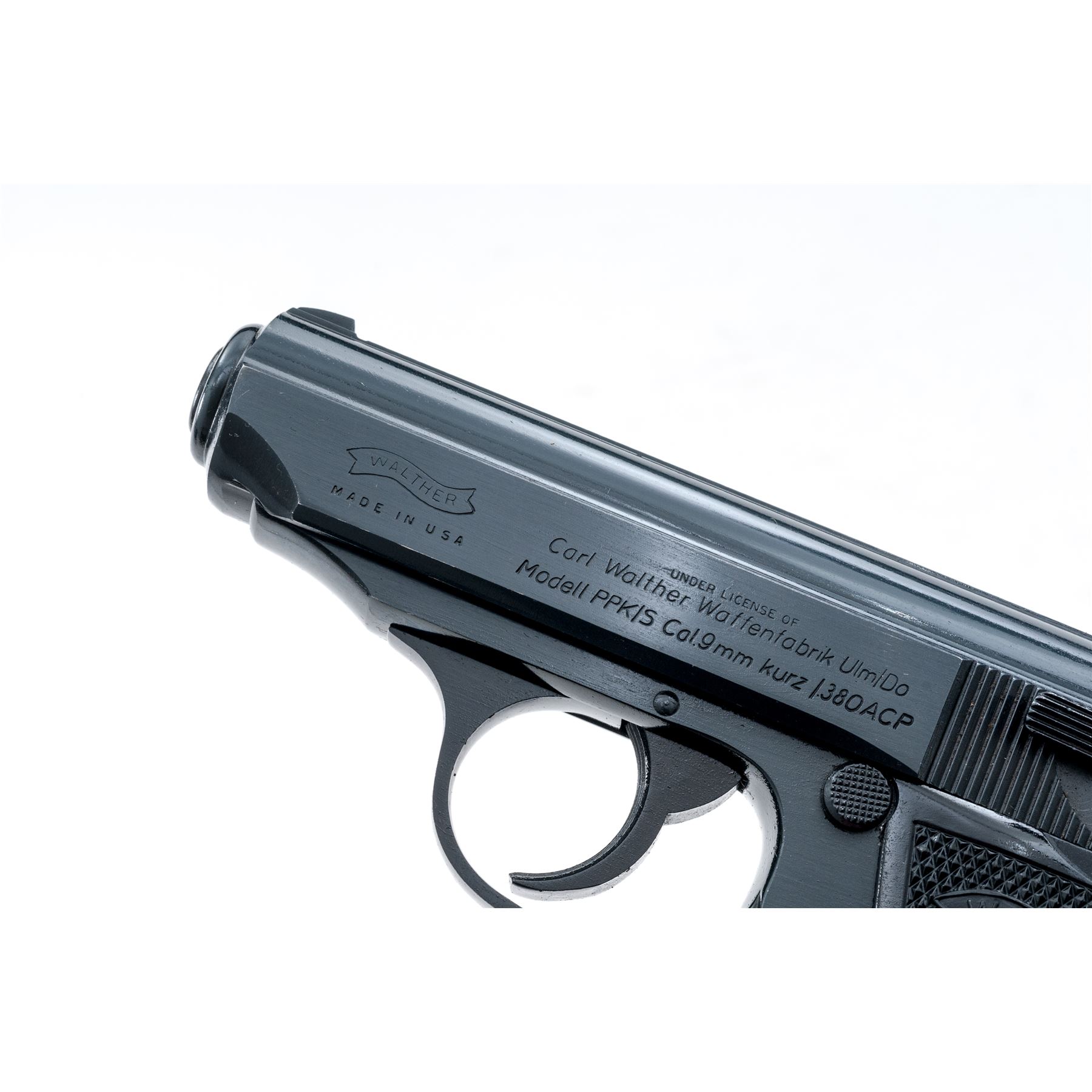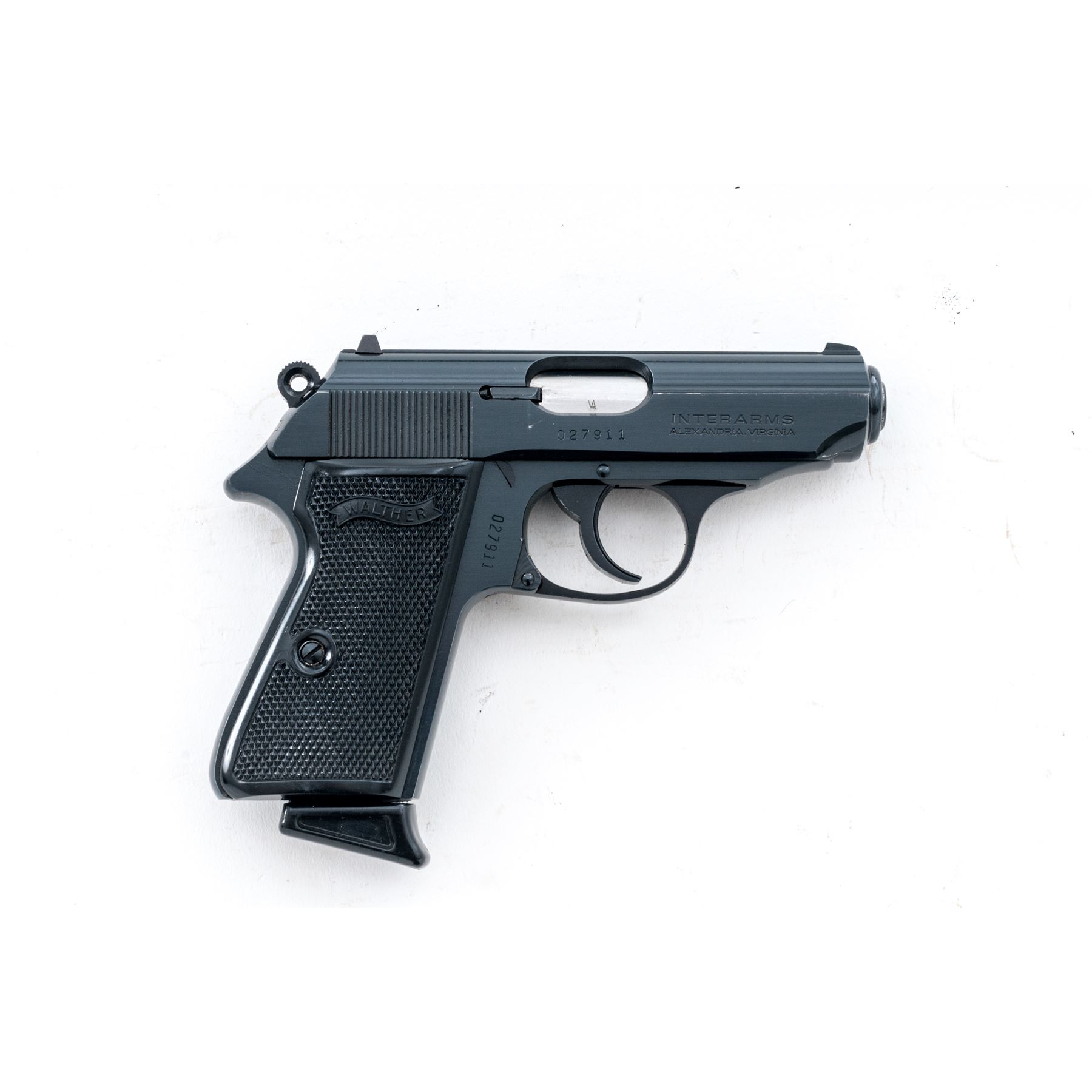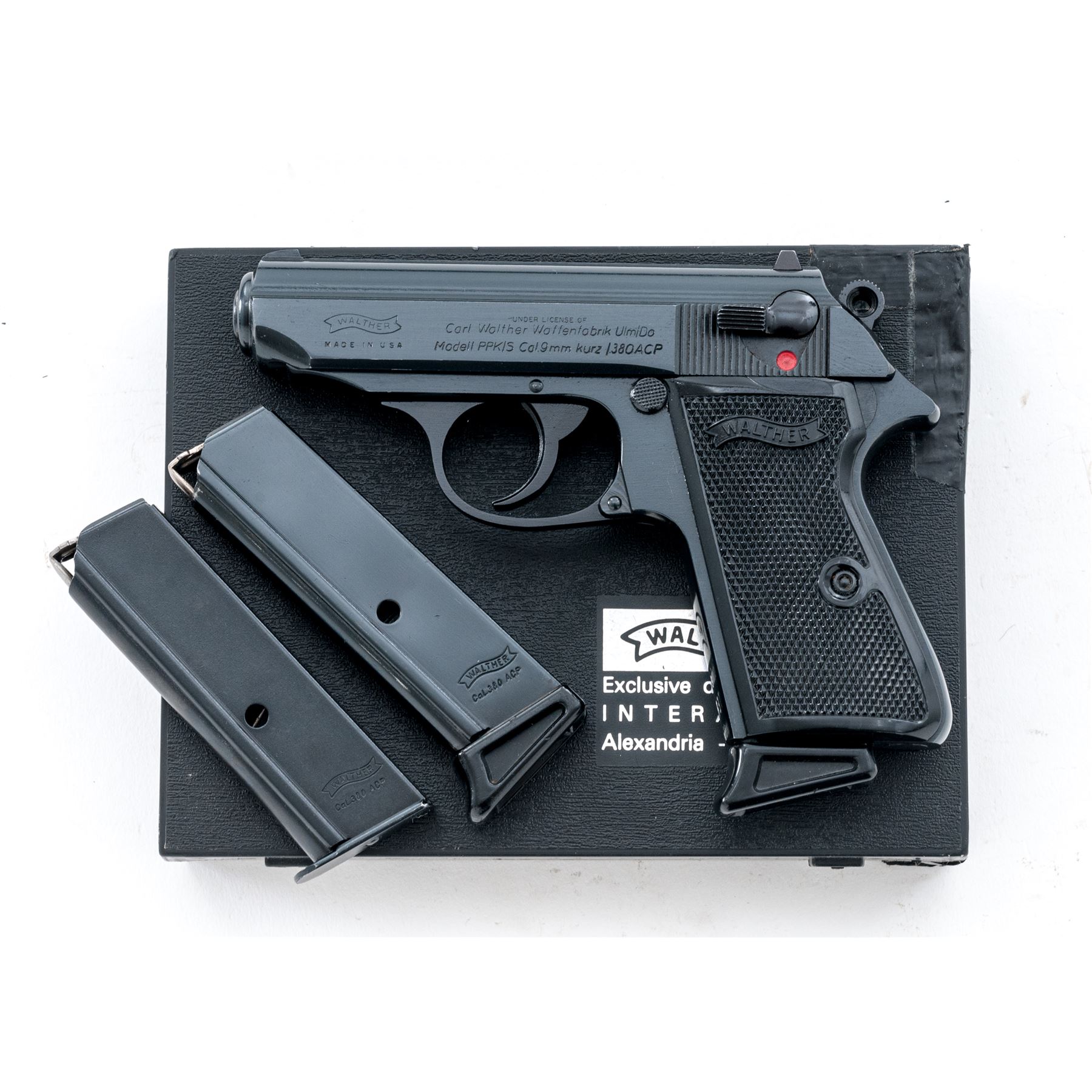 Walther Model PPK/S Semi-Automatic Pistol, #027911, .380 ACP cal., 3.25'' barrel, blue finish, checkered black plastic grips with ''Walther Banner'' logo, standard sights with white highlights, and three (3) Walther magazines, two (2) with black plastic finger extensions. In original black plastic Walther box, with test target that was used but the firearm information was not filled out, owner's manual, and warranty paperwork. Right side of slide is marked ''Interarms/Alexandria, Virginia''. Made in U.S.A. Condition is excellent retaining approx. 98% original blue finish, with some fine micro-scratching, slide with a few spots of mild edgewear. Factory lettering is clear and defined. Grips are also excellent with only a few minor handling marks to the smooth borders. Smooth action, bright bore with excellent rifling. Overall a nice pistol that shows normal signs of only light range use. Box with black duct tape repairs to some of the edges. Est.: $500-$700. (Modern/PPT)
