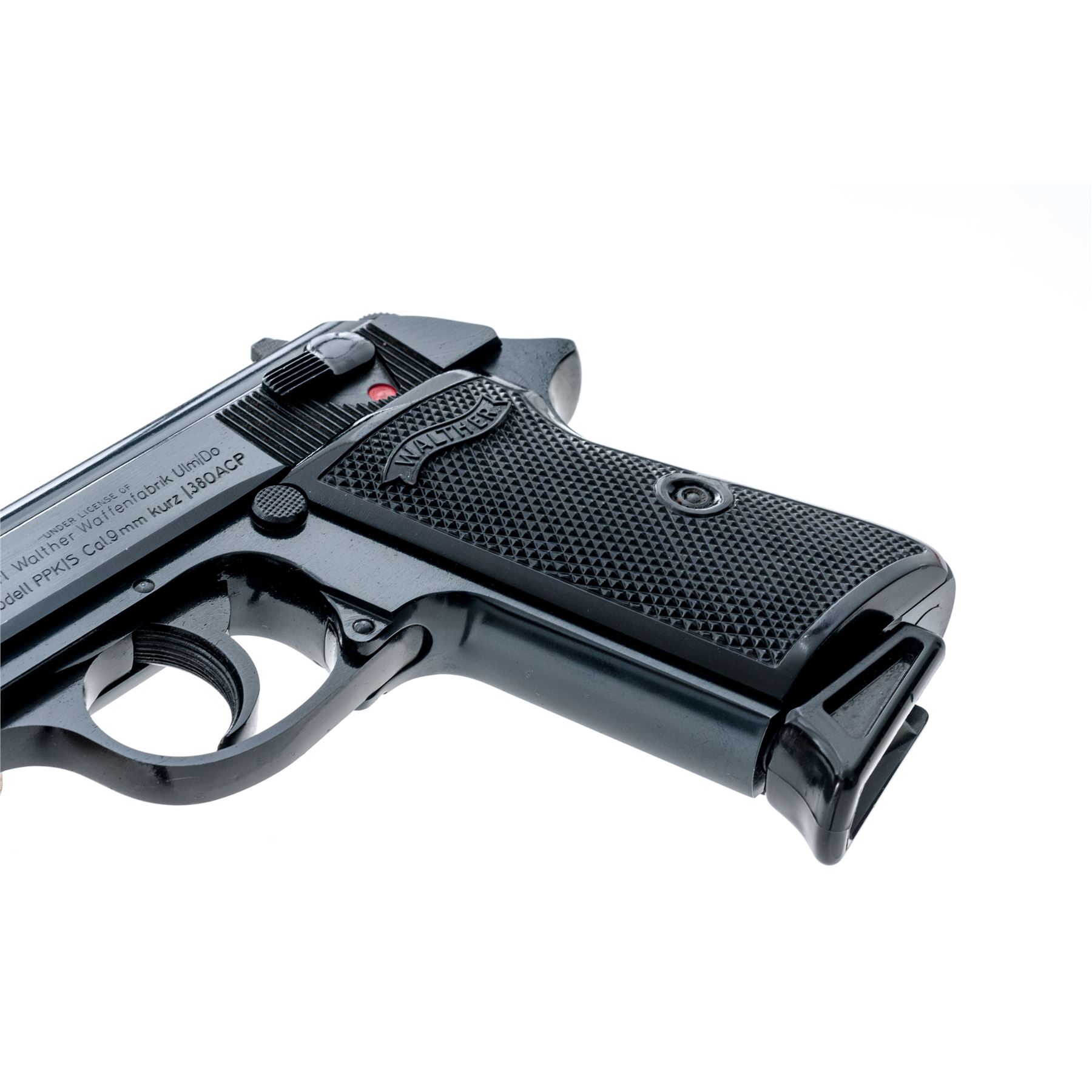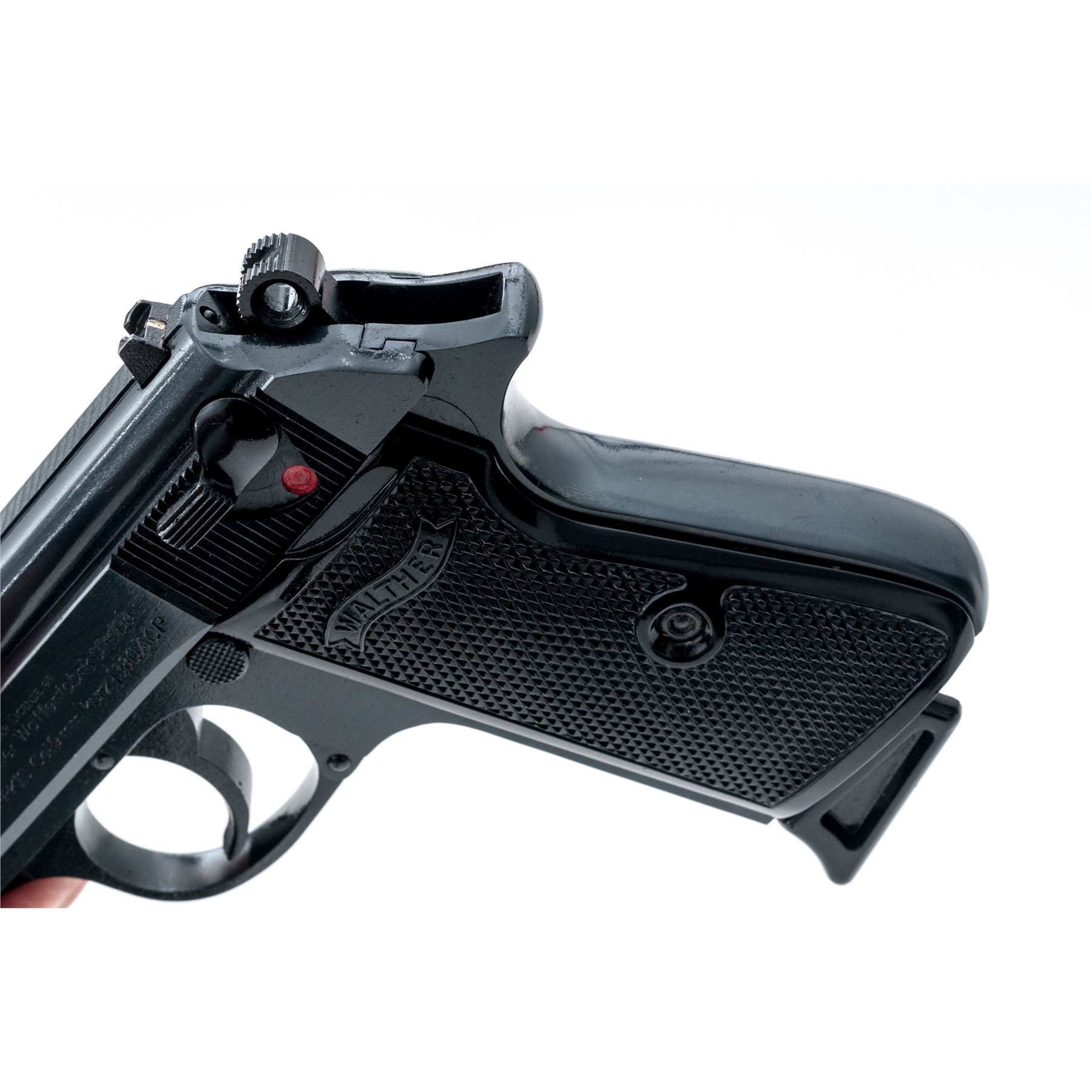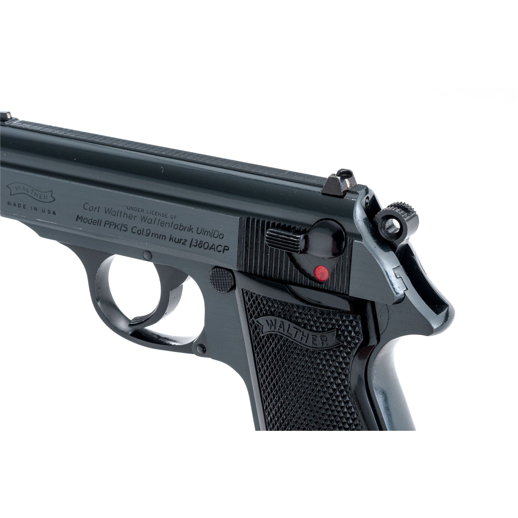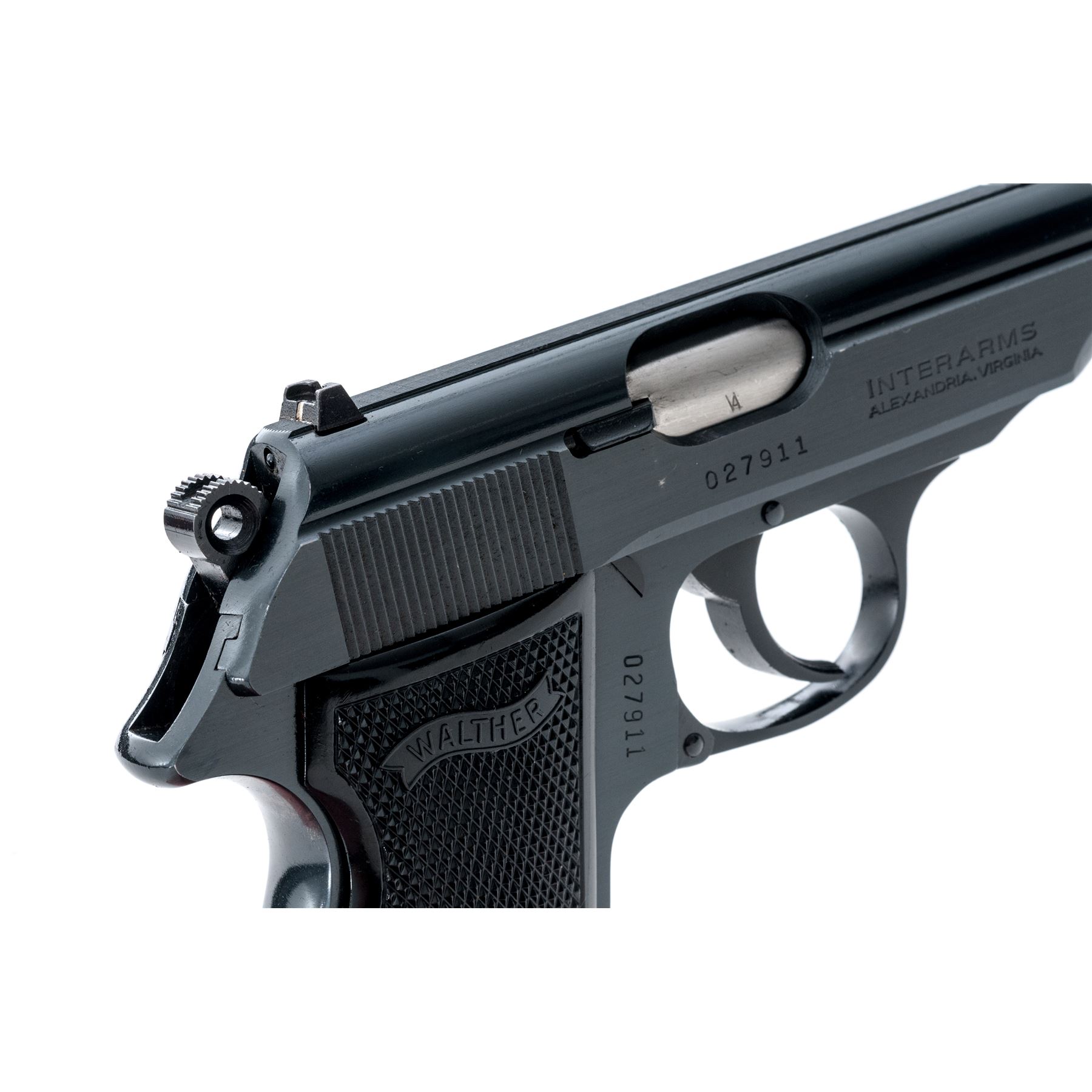 Walther Model PPK/S Semi-Automatic Pistol, #027911, .380 ACP cal., 3.25'' barrel, blue finish, checkered black plastic grips with ''Walther Banner'' logo, standard sights with white highlights, and three (3) Walther magazines, two (2) with black plastic finger extensions. In original black plastic Walther box, with test target that was used but the firearm information was not filled out, owner's manual, and warranty paperwork. Right side of slide is marked ''Interarms/Alexandria, Virginia''. Made in U.S.A. Condition is excellent retaining approx. 98% original blue finish, with some fine micro-scratching, slide with a few spots of mild edgewear. Factory lettering is clear and defined. Grips are also excellent with only a few minor handling marks to the smooth borders. Smooth action, bright bore with excellent rifling. Overall a nice pistol that shows normal signs of only light range use. Box with black duct tape repairs to some of the edges. Est.: $500-$700. (Modern/PPT)
