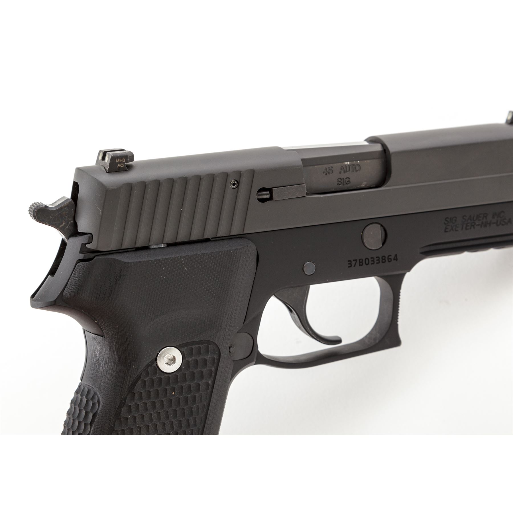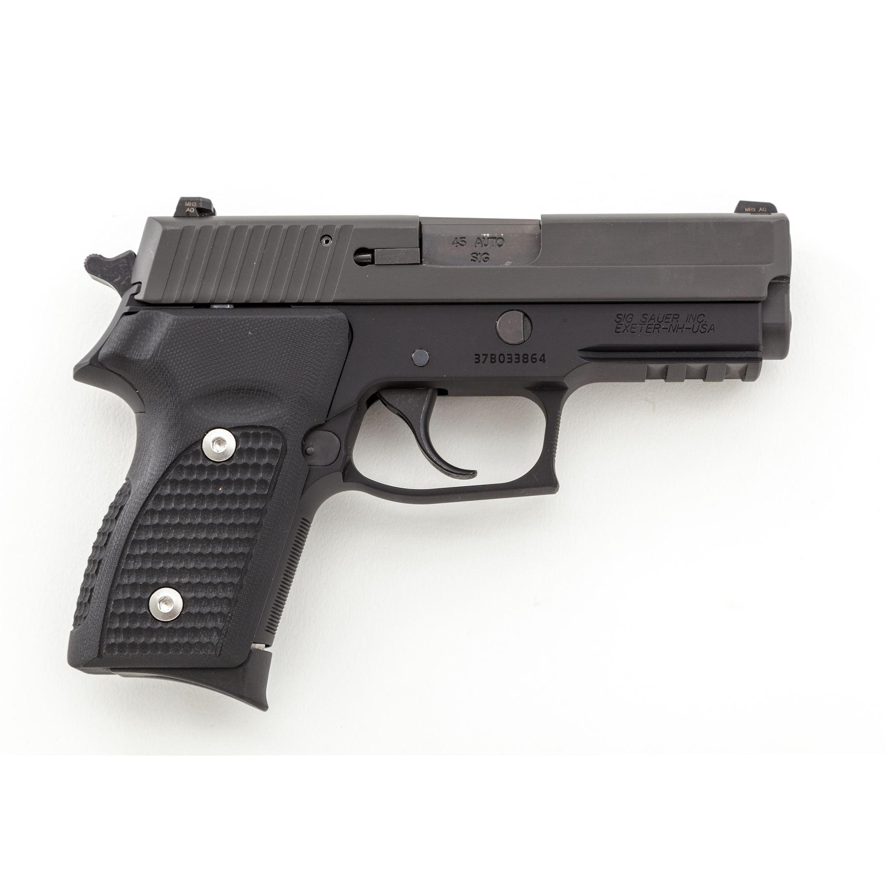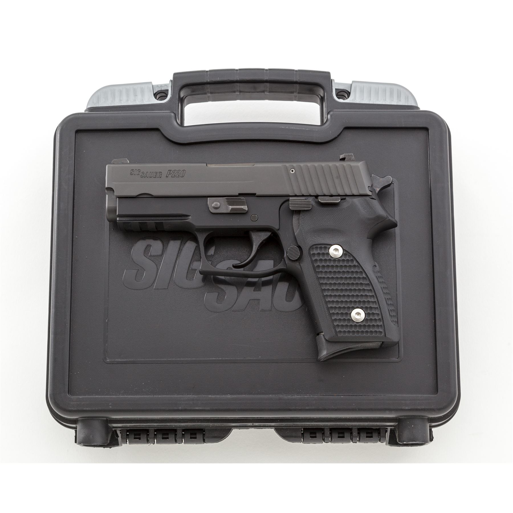 Sig Sauer P220 Compact Semi-Automatic Pistol, #37B033864, .45 ACP cal., double/single action, 3.9'' barrel, matte black slide, black alloy frame, pair of Hogue black G10 American Piranha grips, with 3-dot night sights, lower accessory rail, and two (2) 6-round Sig magazines; both magazines with black plastic finger extensions. In original black plastic Sig Sauer case with matching end label, cable lock, manual, and misc. factory paperwork. Pistol is in excellent like new overall condition. Excellent action and bore; internally showing little evidence of being fired, but not often. Est.: $750-$950. (Modern/PPT)