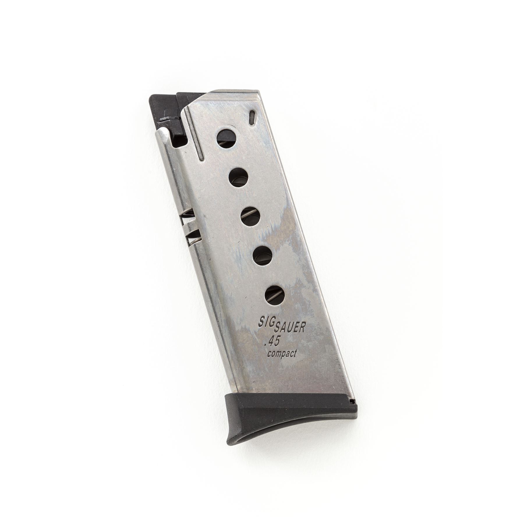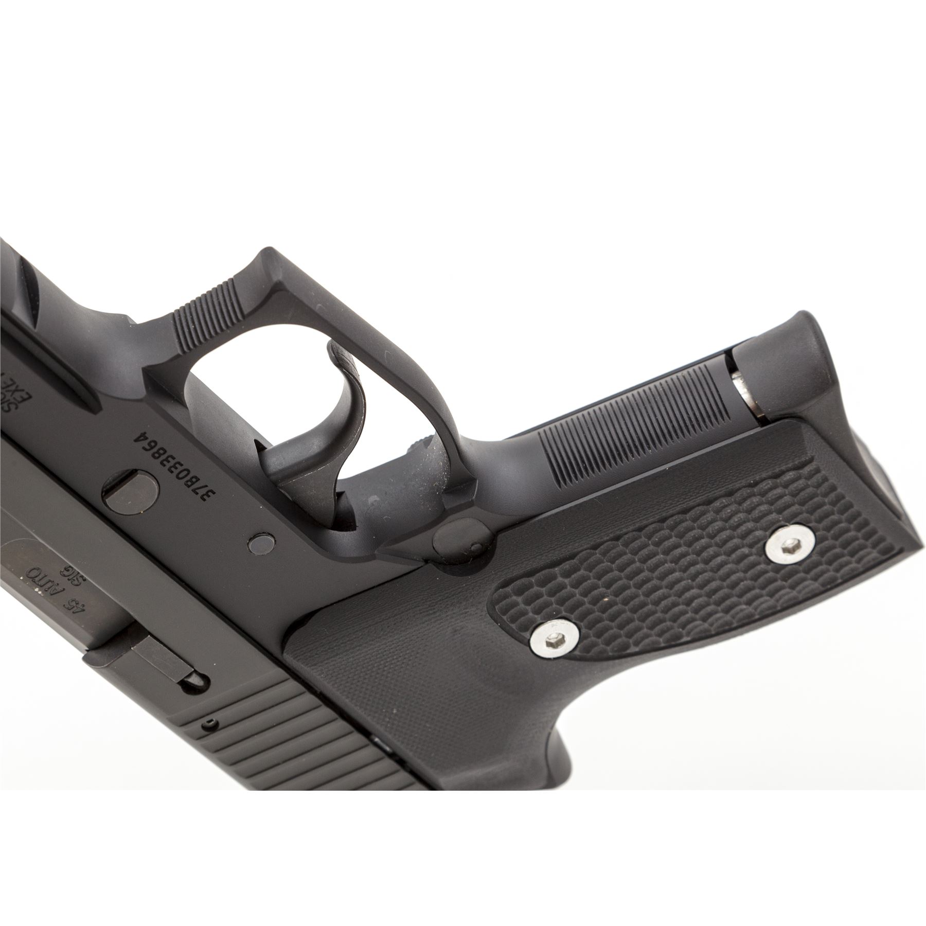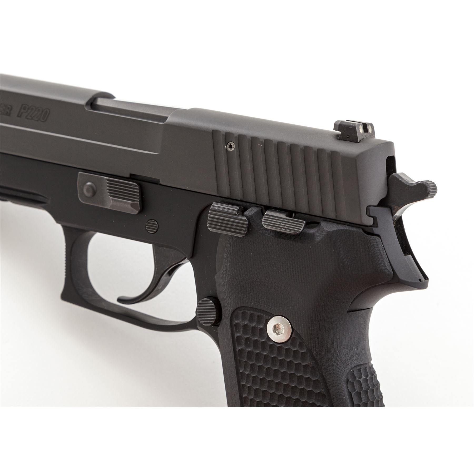 Sig Sauer P220 Compact Semi-Automatic Pistol, #37B033864, .45 ACP cal., double/single action, 3.9'' barrel, matte black slide, black alloy frame, pair of Hogue black G10 American Piranha grips, with 3-dot night sights, lower accessory rail, and two (2) 6-round Sig magazines; both magazines with black plastic finger extensions. In original black plastic Sig Sauer case with matching end label, cable lock, manual, and misc. factory paperwork. Pistol is in excellent like new overall condition. Excellent action and bore; internally showing little evidence of being fired, but not often. Est.: $750-$950. (Modern/PPT)