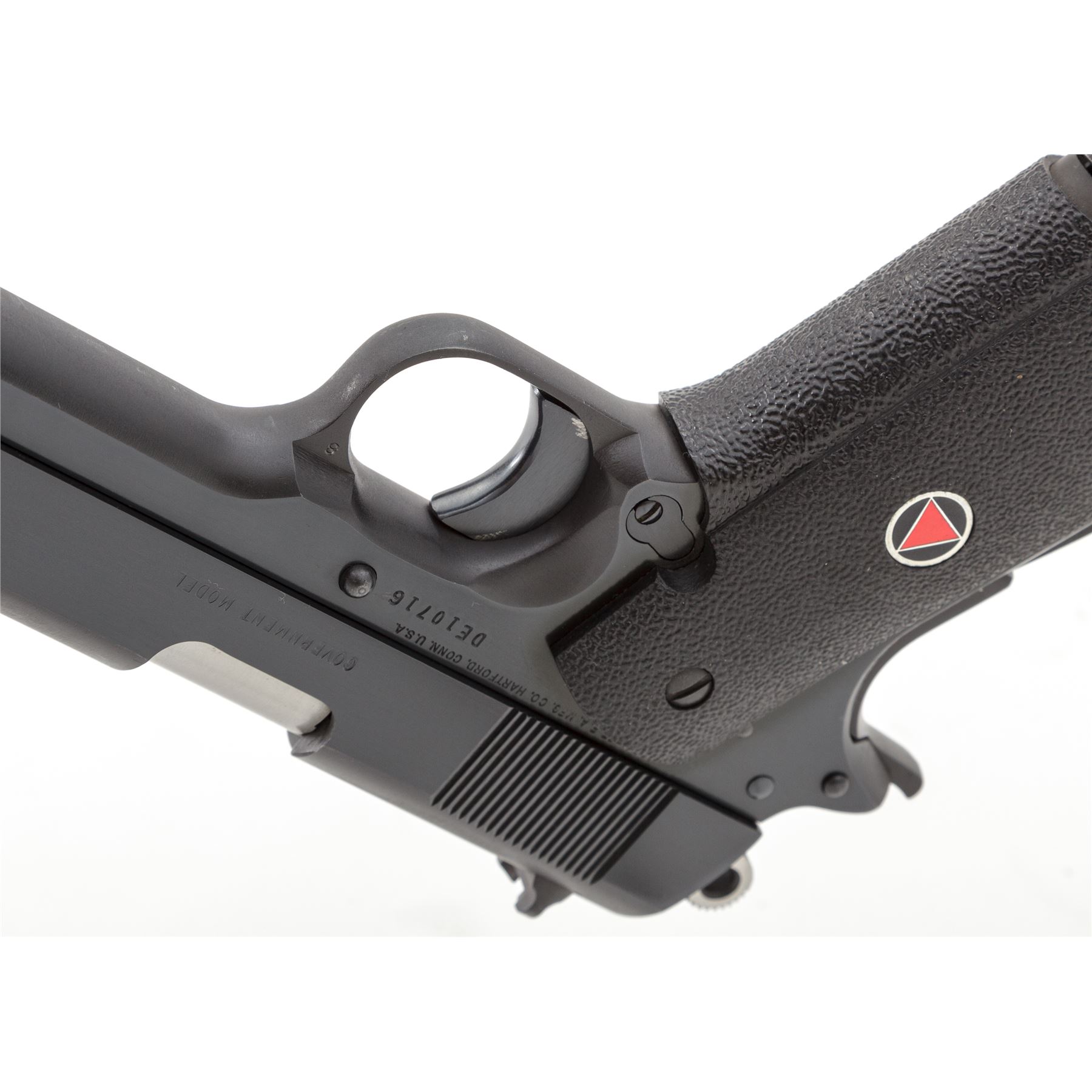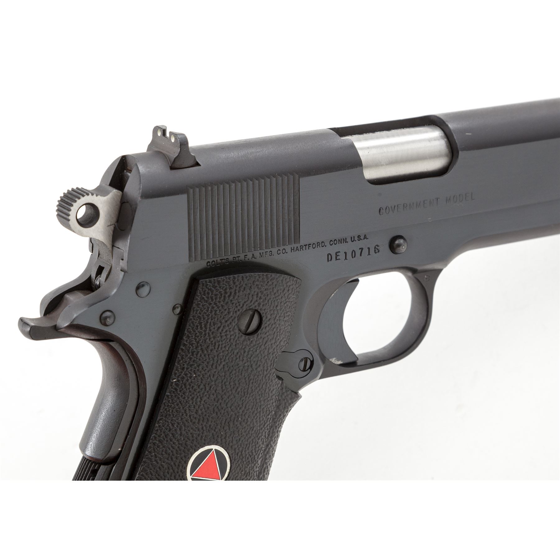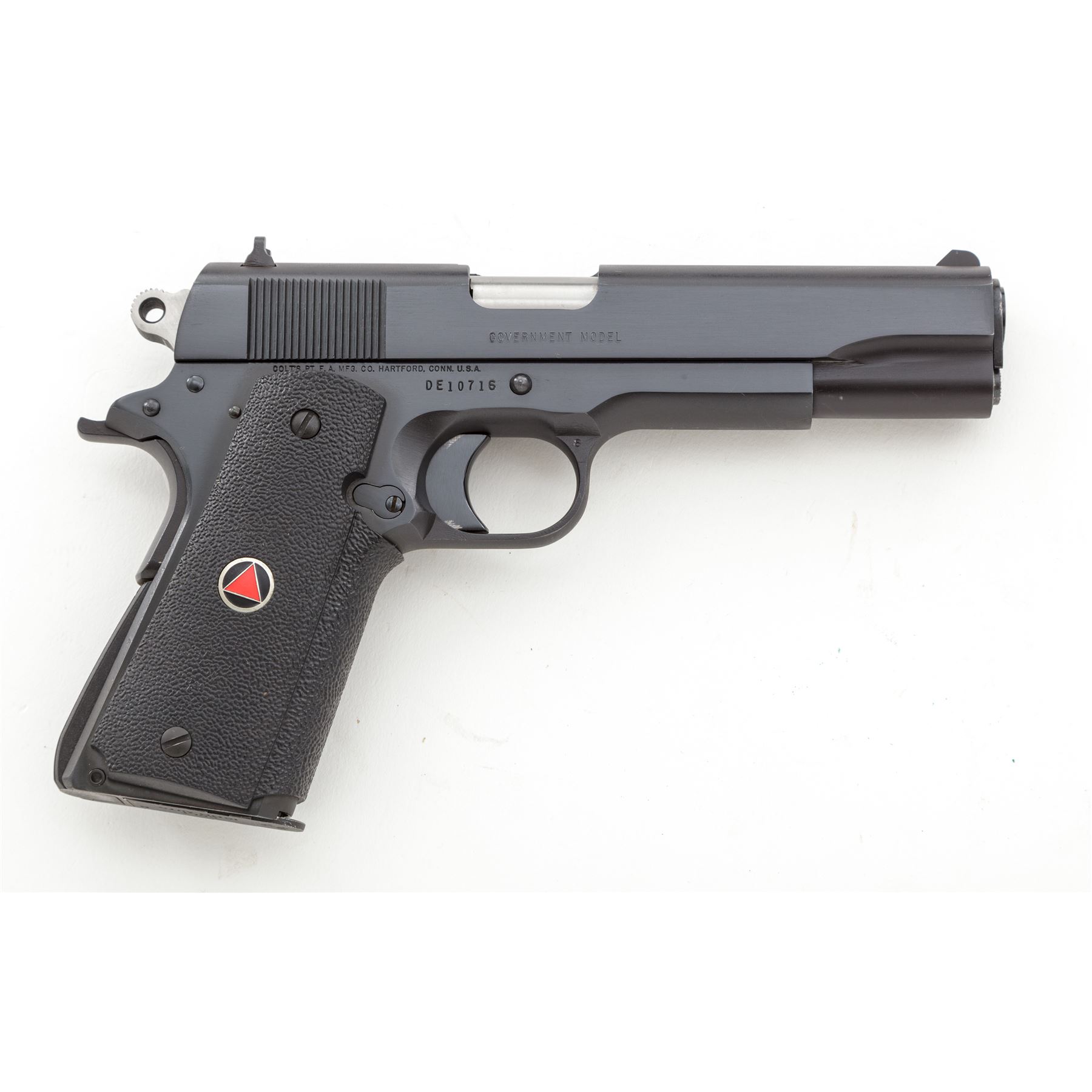 Colt Gov't Model Delta Elite Semi-Automatic Pistol, #DE10716, 10mm cal., 5'' barrel, blue finish, factory black rubber wraparound grips, white three-dot sights, bright hammer, with one original blued Colt magazine and another stainless Colt magazine with ''Delta Elite'' triangle on floorplate. In original box with matching end label, two-piece Styrofoam insert, owner's manual, orange hang tag, and misc. factory paperwork. Mfg'd 1987. Condition is excellent, appearing near new and retaining approx. 98+% original blue; right front portion of frame with faint scratch that starts to become visible when held at a 45-degree angle, right side of trigger with a little operational wear along the inside edge near frame. Factory lettering is clear and defined. Grips also appear as new. Excellent smooth action, bright bore. Est.: $900-$1,200. (Modern/PPT)