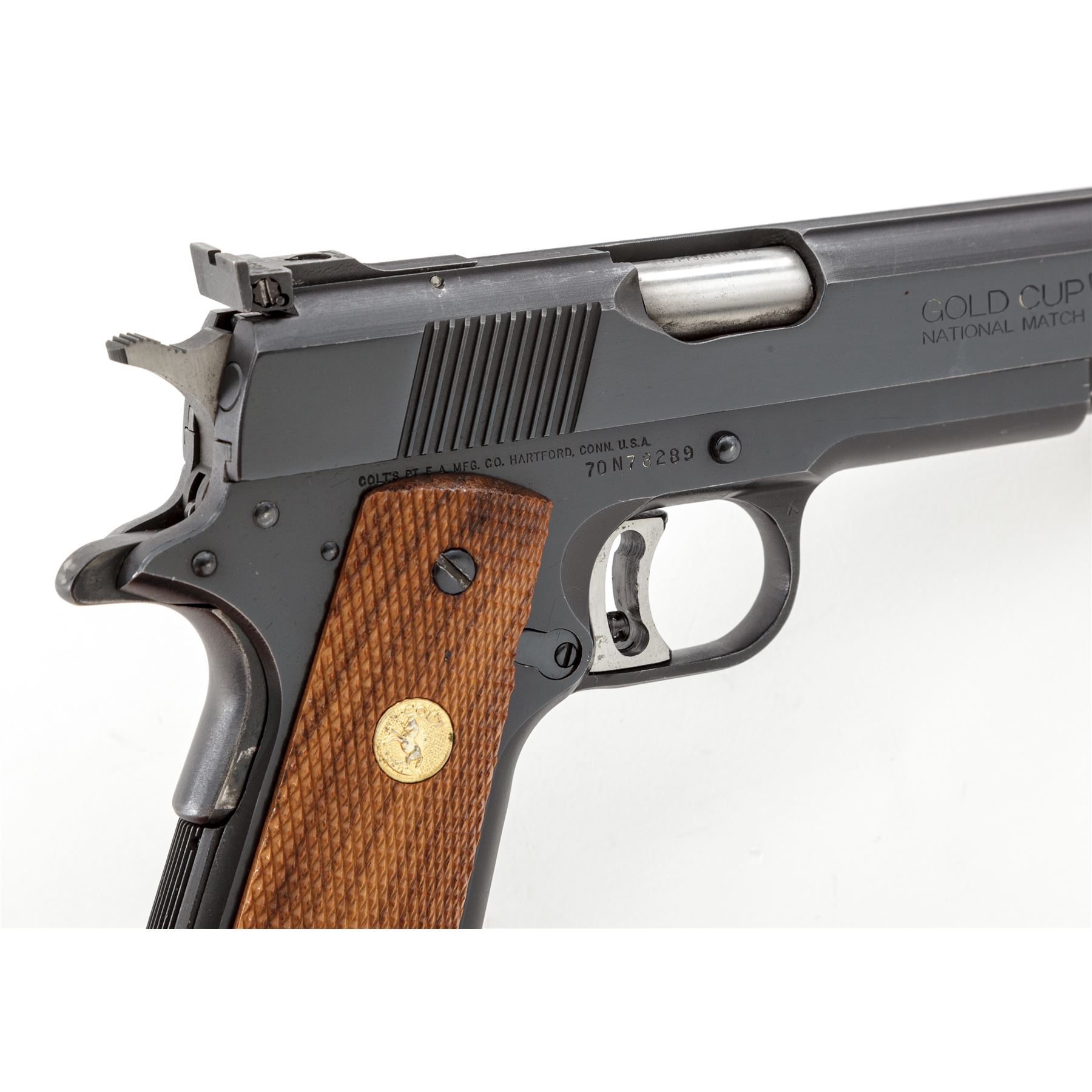 Colt MK IV Series 70 Gold Cup National Match Semi-Automatic Pistol, #70N78289, .45 ACP cal., 5'' barrel, blue finish, factory checkered walnut grips with gold medallions, and one correct Colt magazine, with Elliason rear sight. Mfg'd ca. 1980. Condition is excellent retaining approx. 96% factory blue with thinning at forward most portion of slide. Pistol with added recoil spring guide and small amount of paint to front sight. Crisp grips, smooth crisp action, and bright bore. Est.: $800-$1,200. (Modern/PPT)