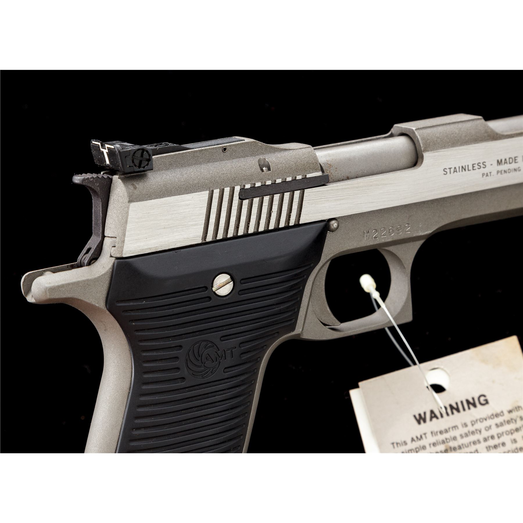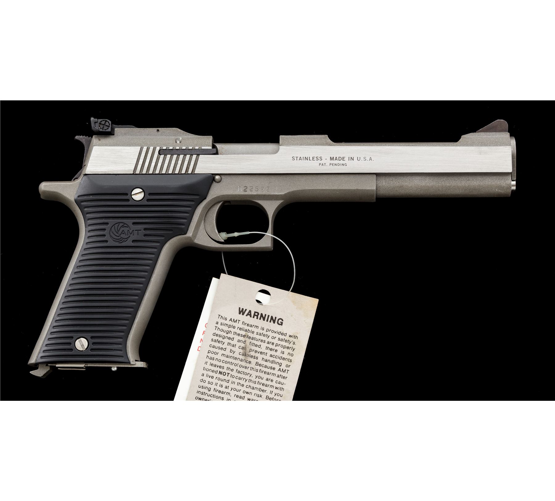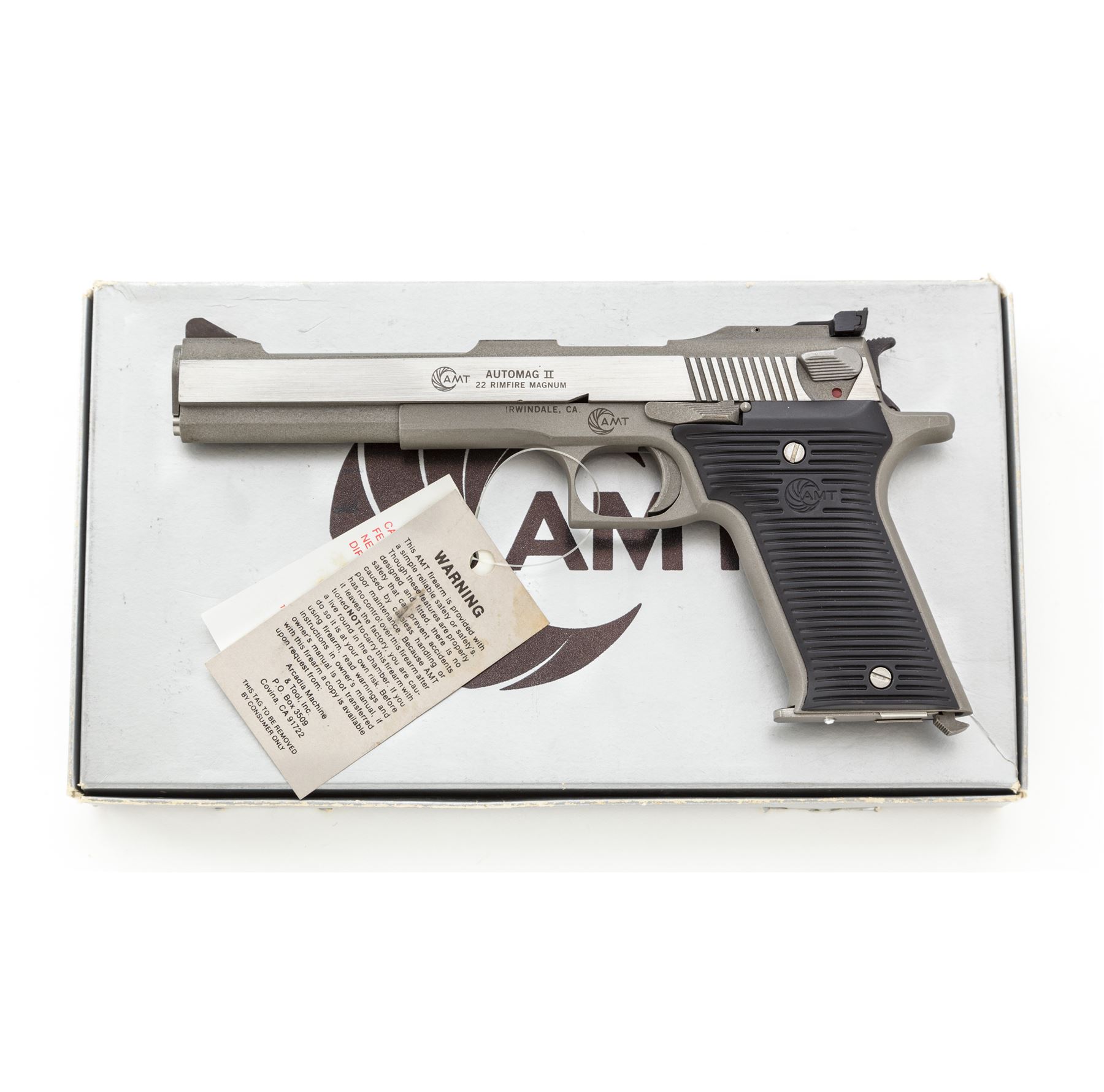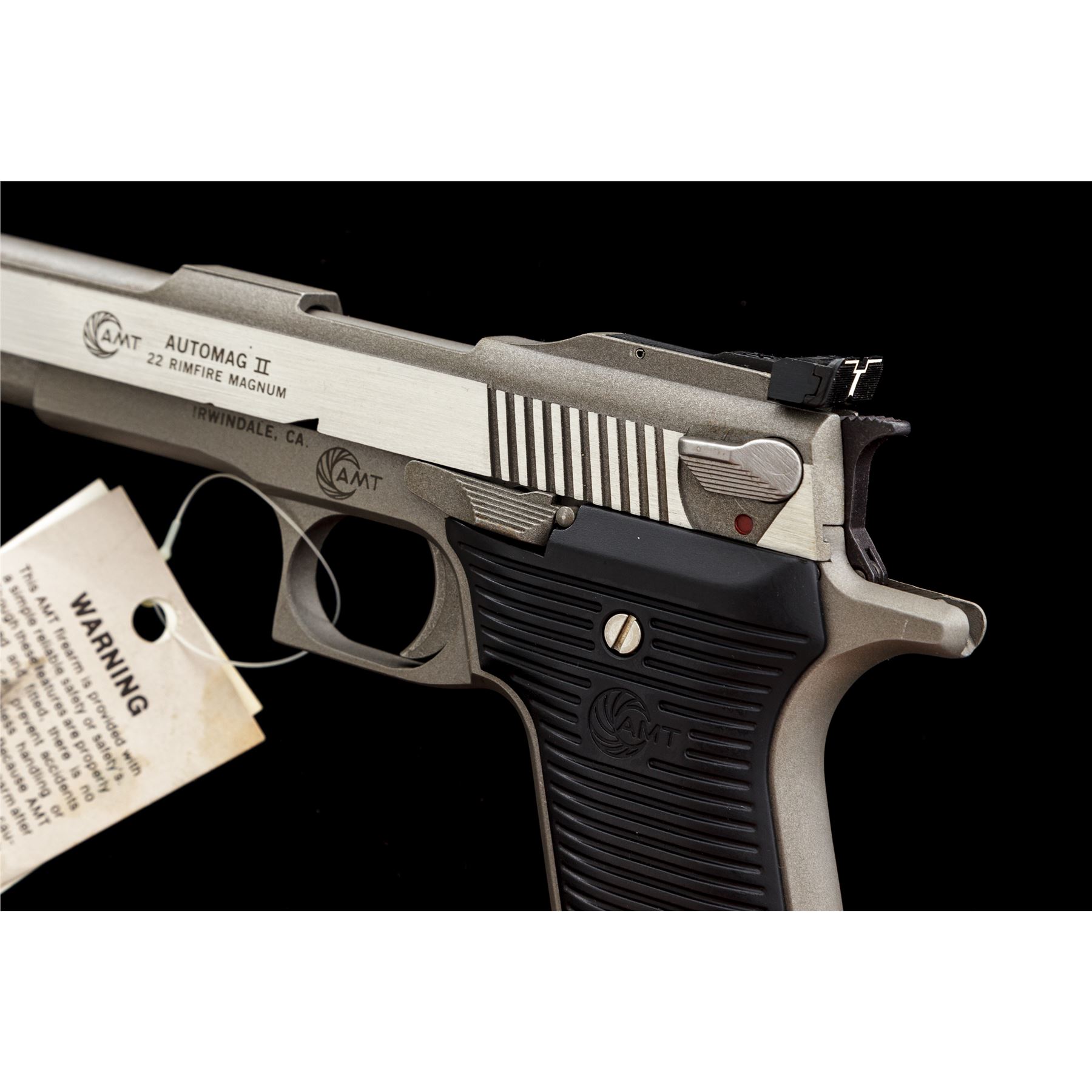 AMT Automag II Semi-Automatic Pistol, #M22692, .22 WMR cal., 6'' barrel, combination matte and satin stainless steel, factory black plastic grips, ramped front sight with red insert and white outline fully adjustable Millett rear sight, with one magazine. In original AMT box for a .45 caliber pistol with the correct Automag II owner's manual. Pistol with the original hang tags attached to the triggerguard. Condition is excellent, appearing as new with only a few slight marks from handling. Smooth action, bright bore with excellent rifling. The breech face has just a little powder residue on the surface and is one of the only indications that this pistol has ever been fired. Box is split at one of the corners and otherwise shows normal light storage type wear; a portion of the manual has turned yellow. Est.: $600-$800. (Modern/PPT)