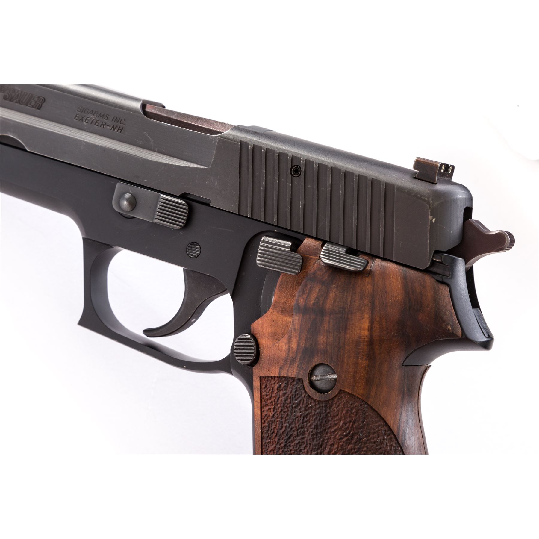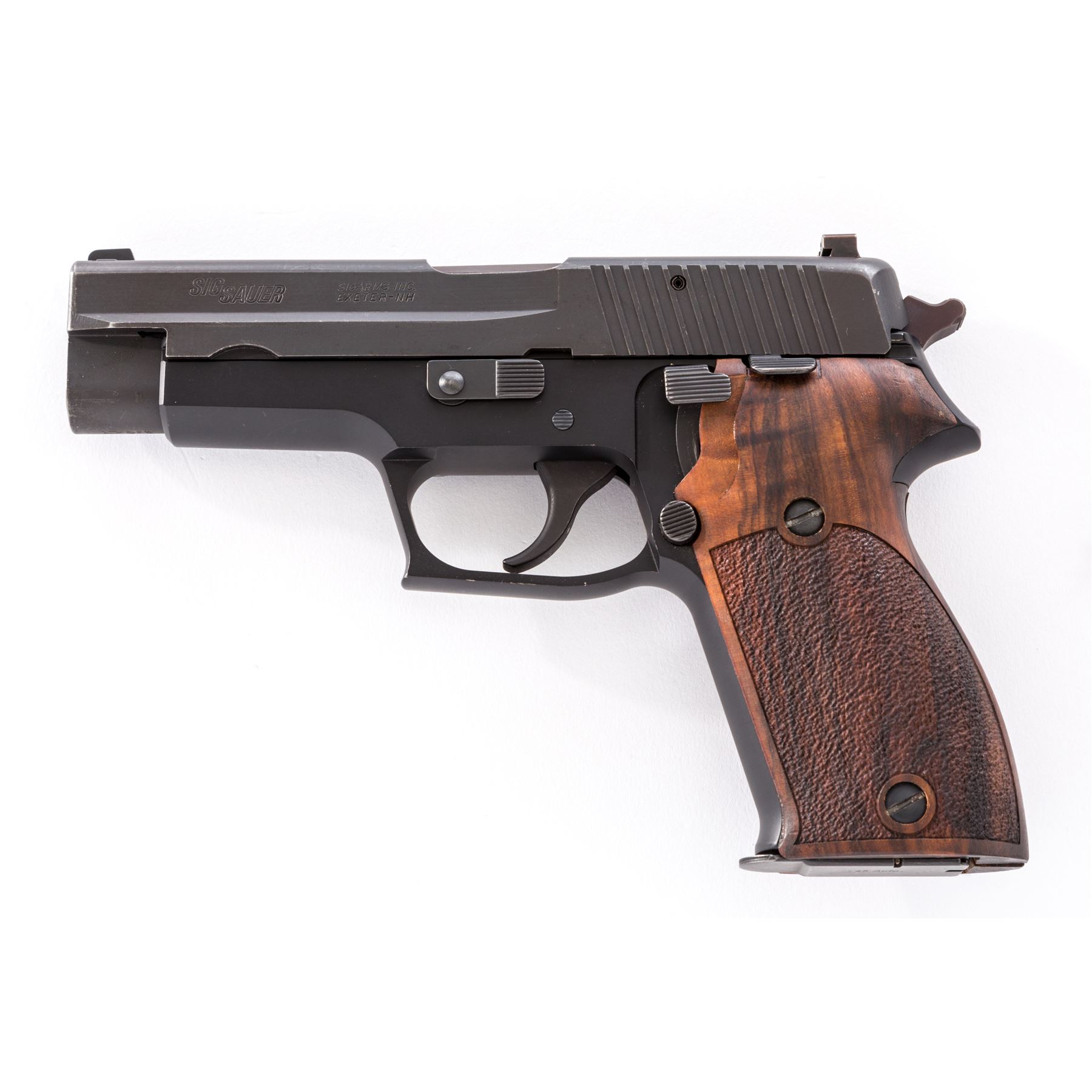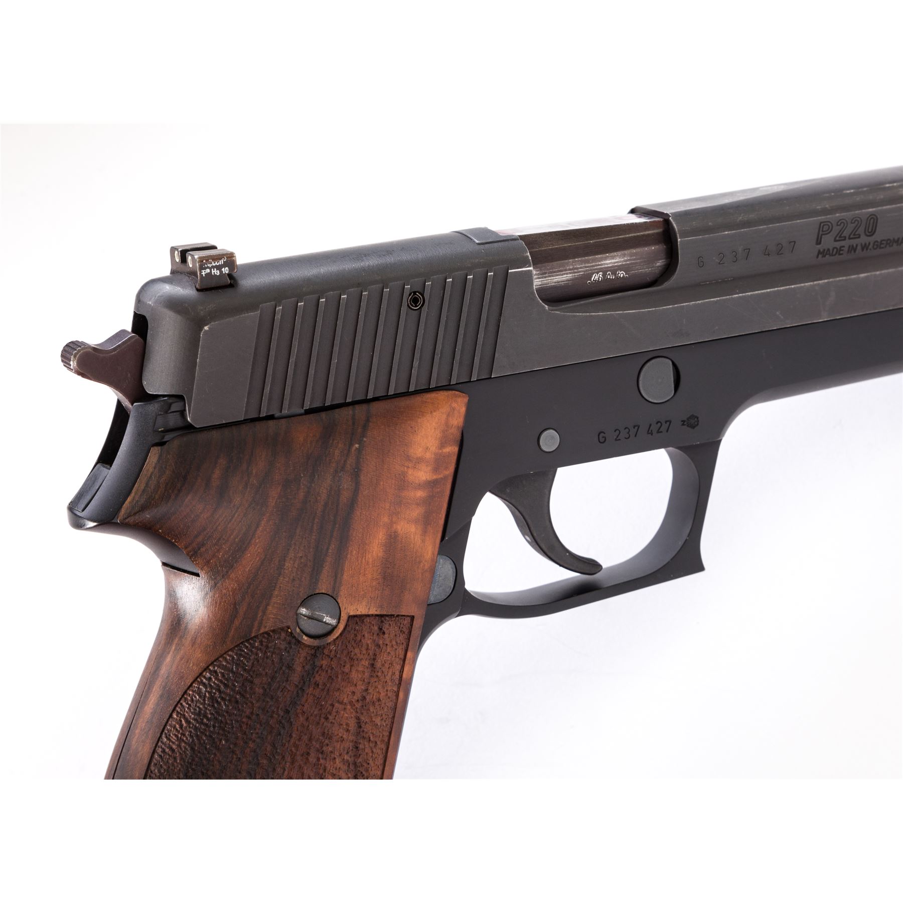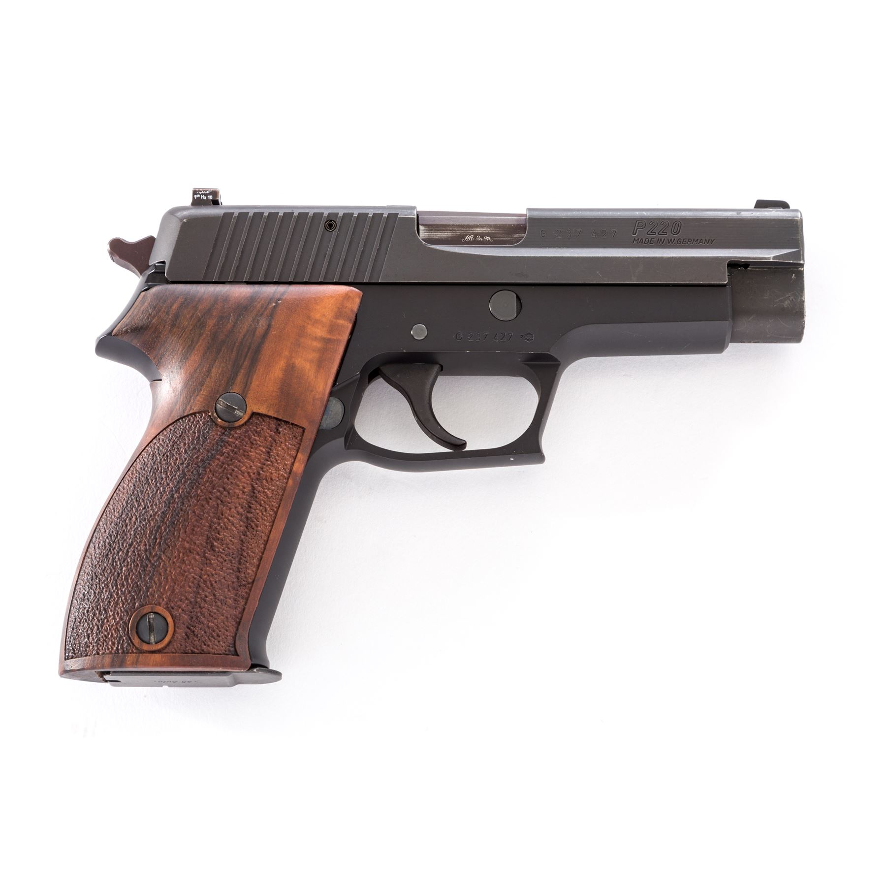Sig Sauer P220 Semi-Automatic Pistol, #G237427, .45 ACP cal., 4.5'' barrel, matte finish, stippled walnut European grips, with one factory magazine and Trijicon sights. Condition is excellent with just light range use as minor thinning to slide. Action is good, bore is fine. Est.: $500-$650. (Modern/PPT)