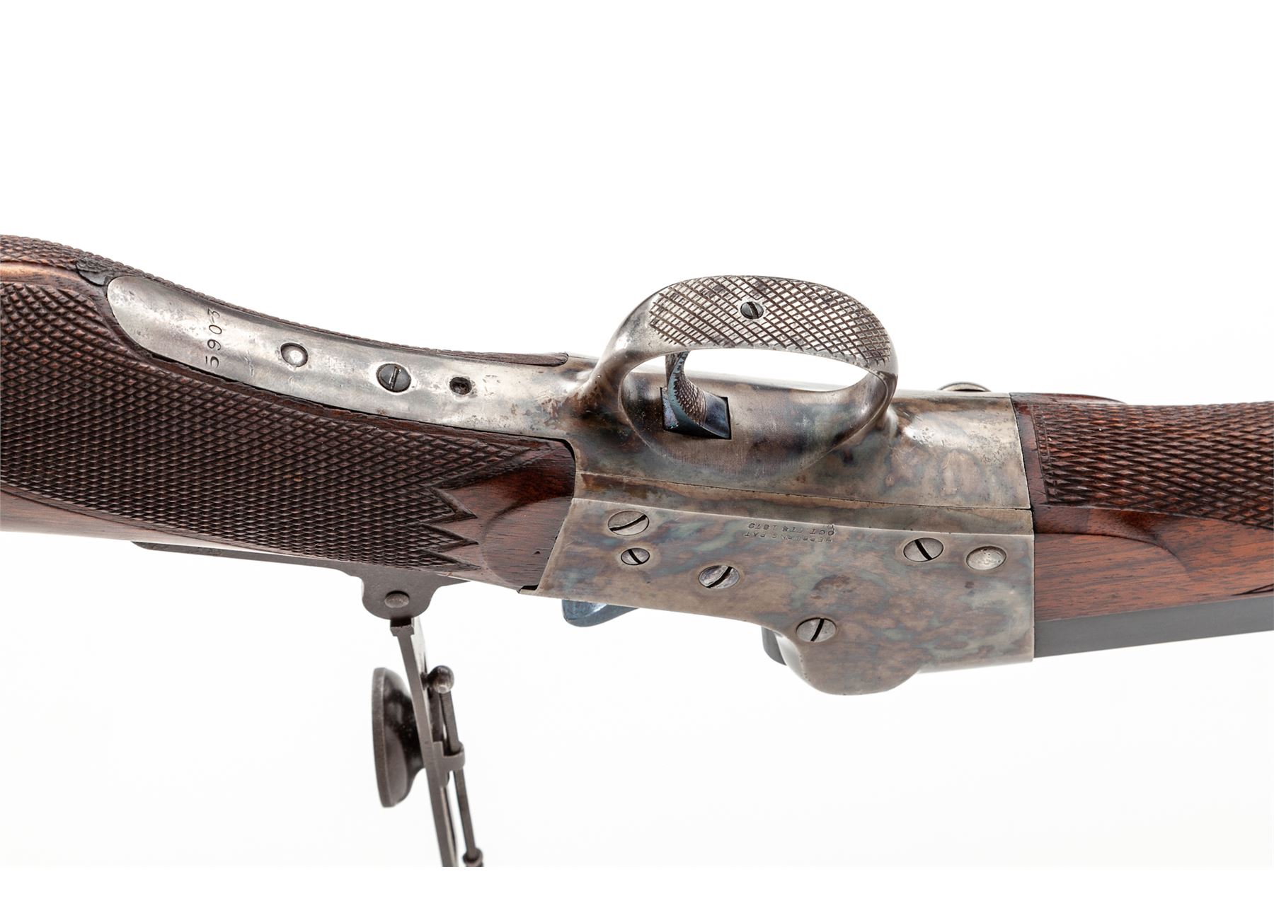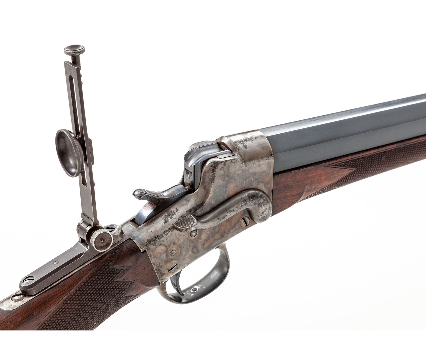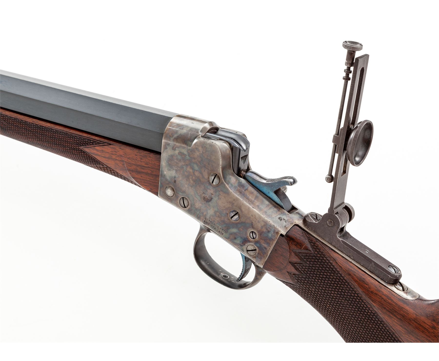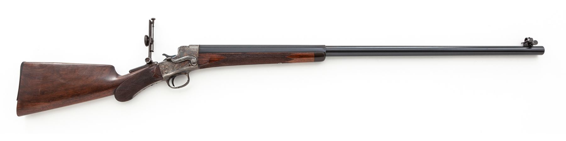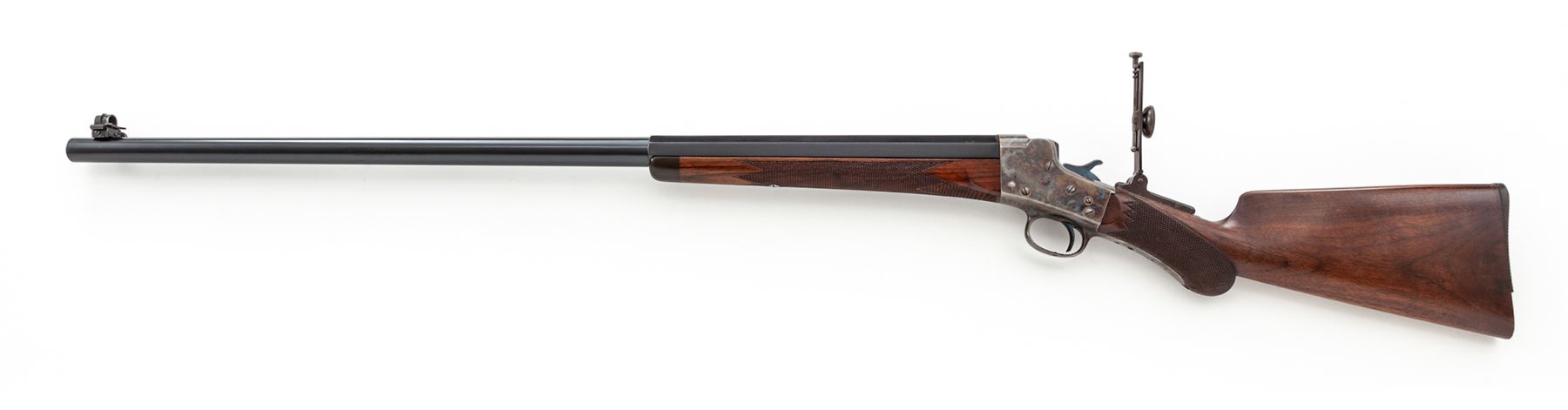 Remington-Hepburn No. 3 Rifle, #8063, .45-90 cal., 32'' half-round half-octagonal blue barrel, case hardened frame restored by Turnbull, fancy checkered walnut stock with round pistol grip, modern mfg'd long-range tang sight, as well as a modern spirit level globe front sight. Condition is excellent as restored and updated. Metal surfaces retain almost all of their professionally accomplished blue and case colors. New made barrel exhibits an excellent mirror bright bore. Action is crisp, trigger pull is nice. Est.: $2,000-$3,000. (C&R)