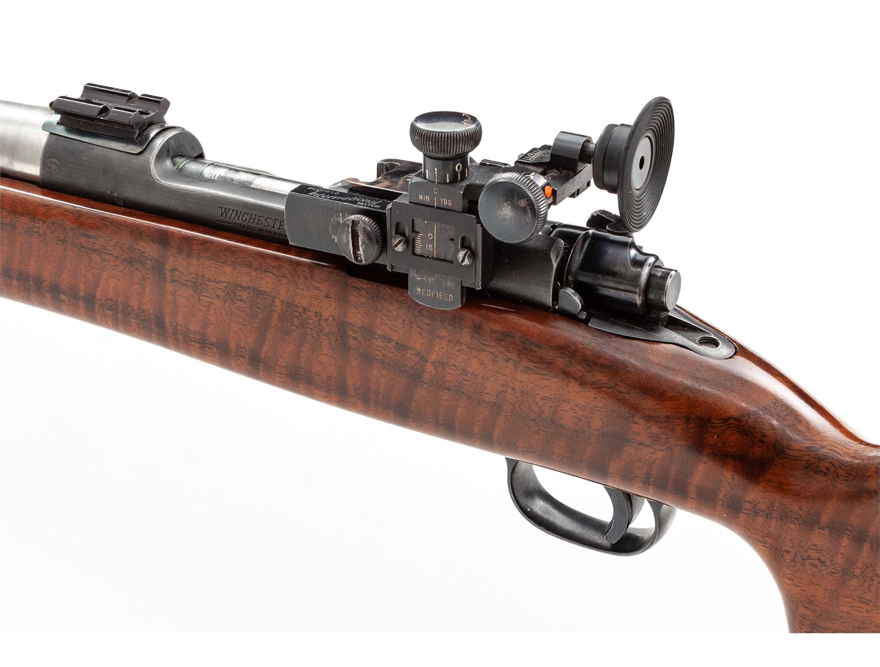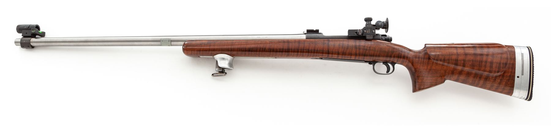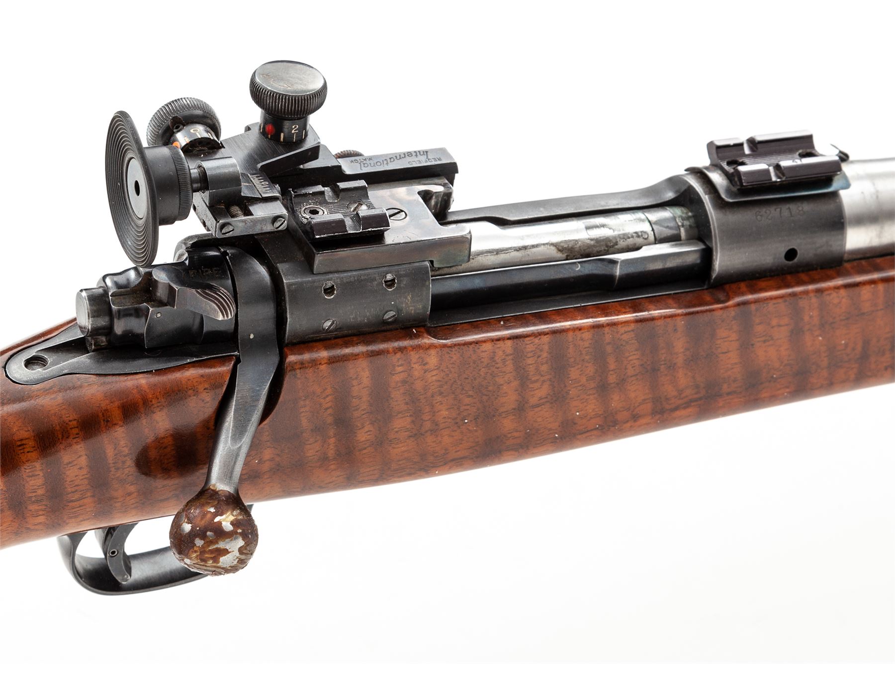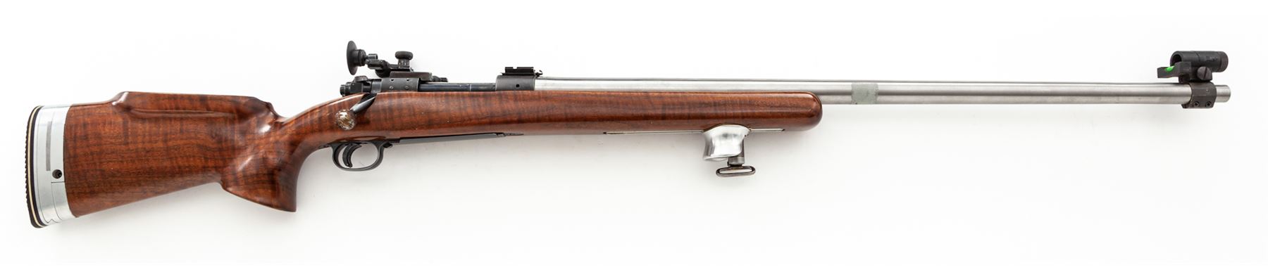 Custom Winchester Model 70 Bolt Action Target Rifle, #62718, .308 cal., 29'' medium-weight stainless steel target free-floating barrel with 1/12 twist, glass-bedded stock to blue frame, walnut target cheekpiece stock with adjustable aluminum buttplate and handstop; Redfield Int'l Match rear sight and modern spirit level globe front sight. Top of receiver has been fitted with a case hardened stripper clip guide, as well as a two-piece Weaver mount. Follower, ramp and bolt are polished. Condition is excellent as modified, with some tape residue to barrel; bolt handle has been dipped in silicone and is beginning to flake (easily removed or redone). Four neatly plugged holes to right side of frame from previous target sights; triggershoe has been added. Stock shows just the lightest marks from range use. One-stage trigger is light and crisp. Finely grooved bore is mirror bright. Est.: $800-$1,200. (Modern)