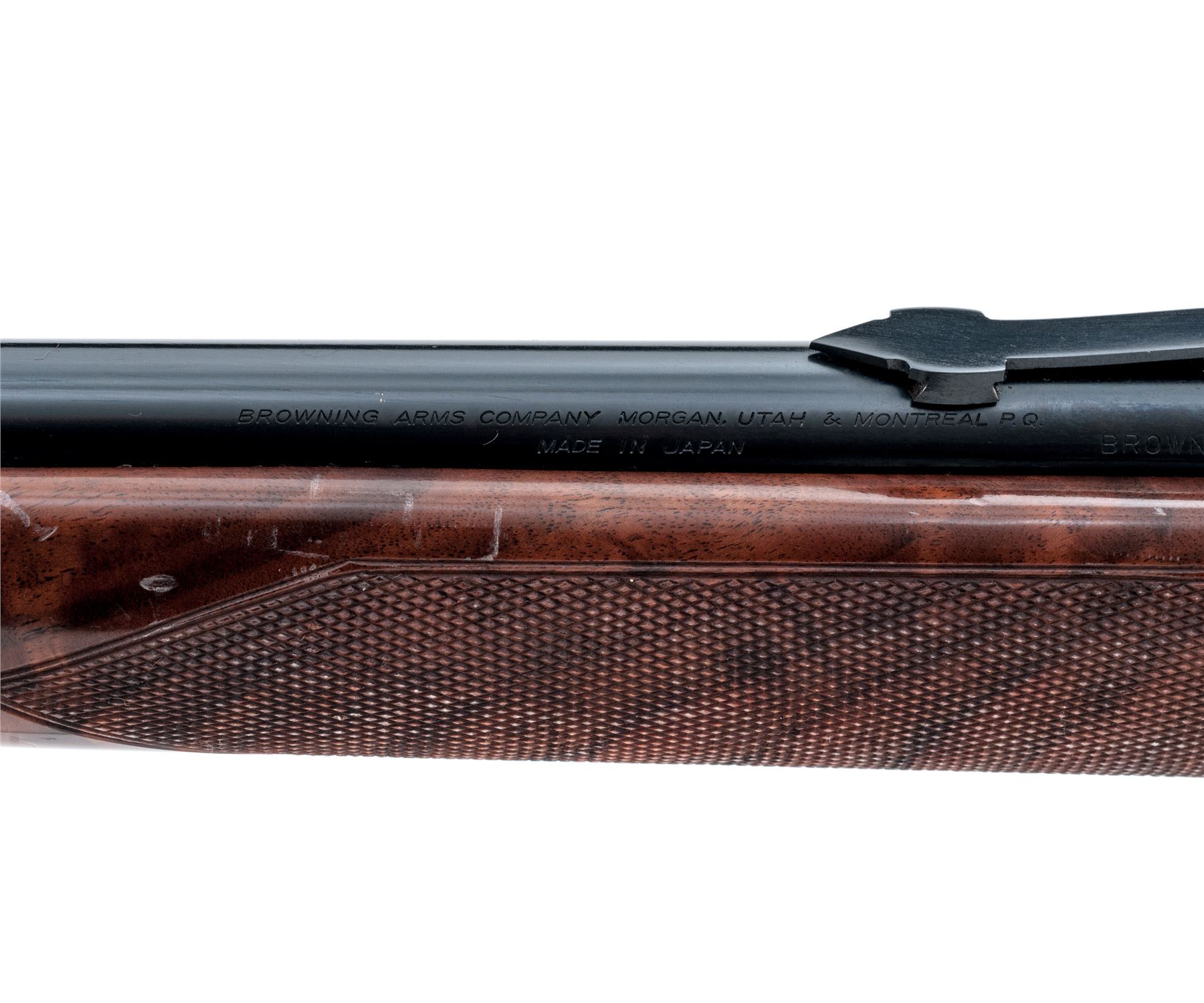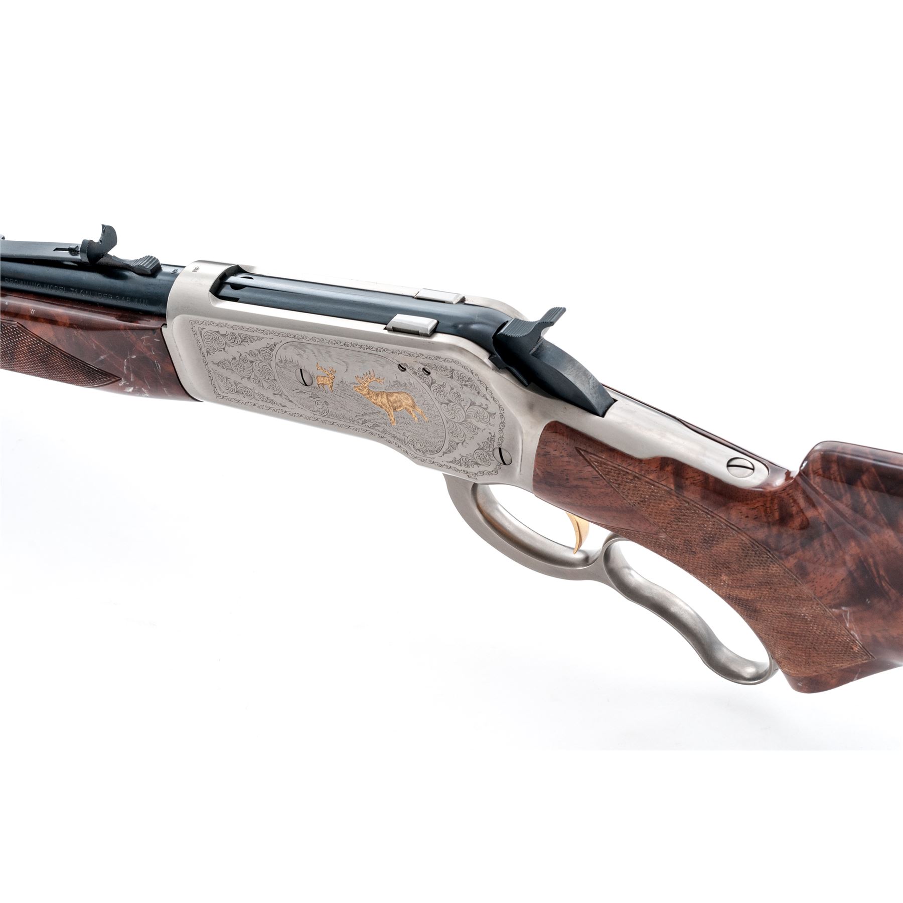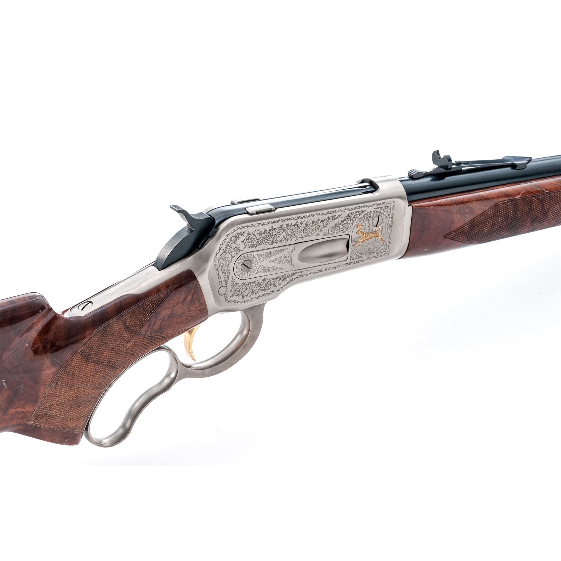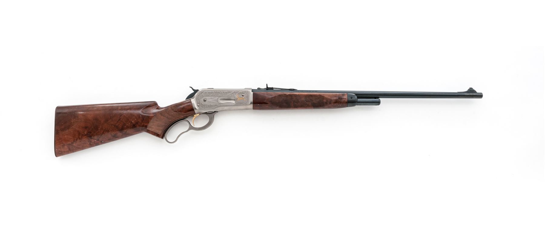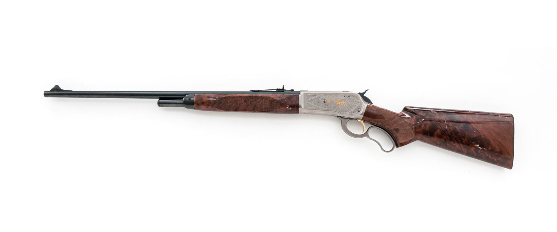 Limited Edition Engraved Browning Model 71 High Grade Lever Action Rifle, #02248PR6R7, .348 Win. cal., 24'' round blued steel barrel, satin coin-finished receiver with scroll and game scene engraving, right side is highlighted with a gold buck, left side with two gold elk; engraving is signed ''T. Naka''. Gloss-finished pistol-grip walnut stock and forend; wrist and forend are finely checkered with a checkered steel buttplate. Front sight blade with brass bead is dovetailed to a fixed base, semi-buckhorn rear sight, gold-plated trigger. Approx. 98% original blue finish remains, Barrel is in very good+ condition overall, with scattered light scratches resulting in finish loss. Receiver is excellent, all of the engraving and factory lettering is clean and clear. Wood shows evidence of poor storage with general impressions and scratches, which vary in depth and size; some of the storage wear has left white paint on the surface as well as flaking to the original finish. Action is stiff upon closing and is otherwise crisp, bright bore with excellent rifling. Est.: $700-$900. (Modern)